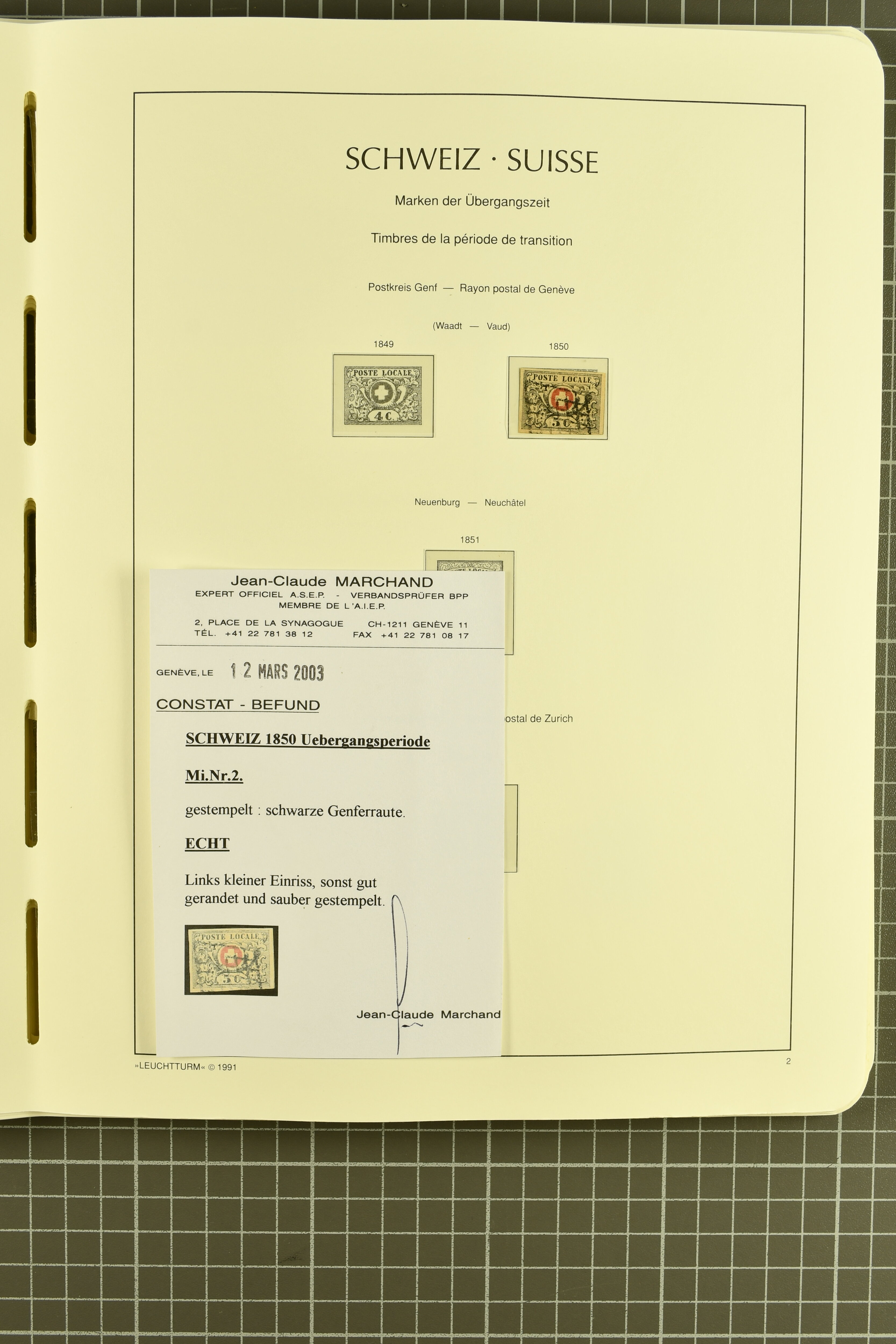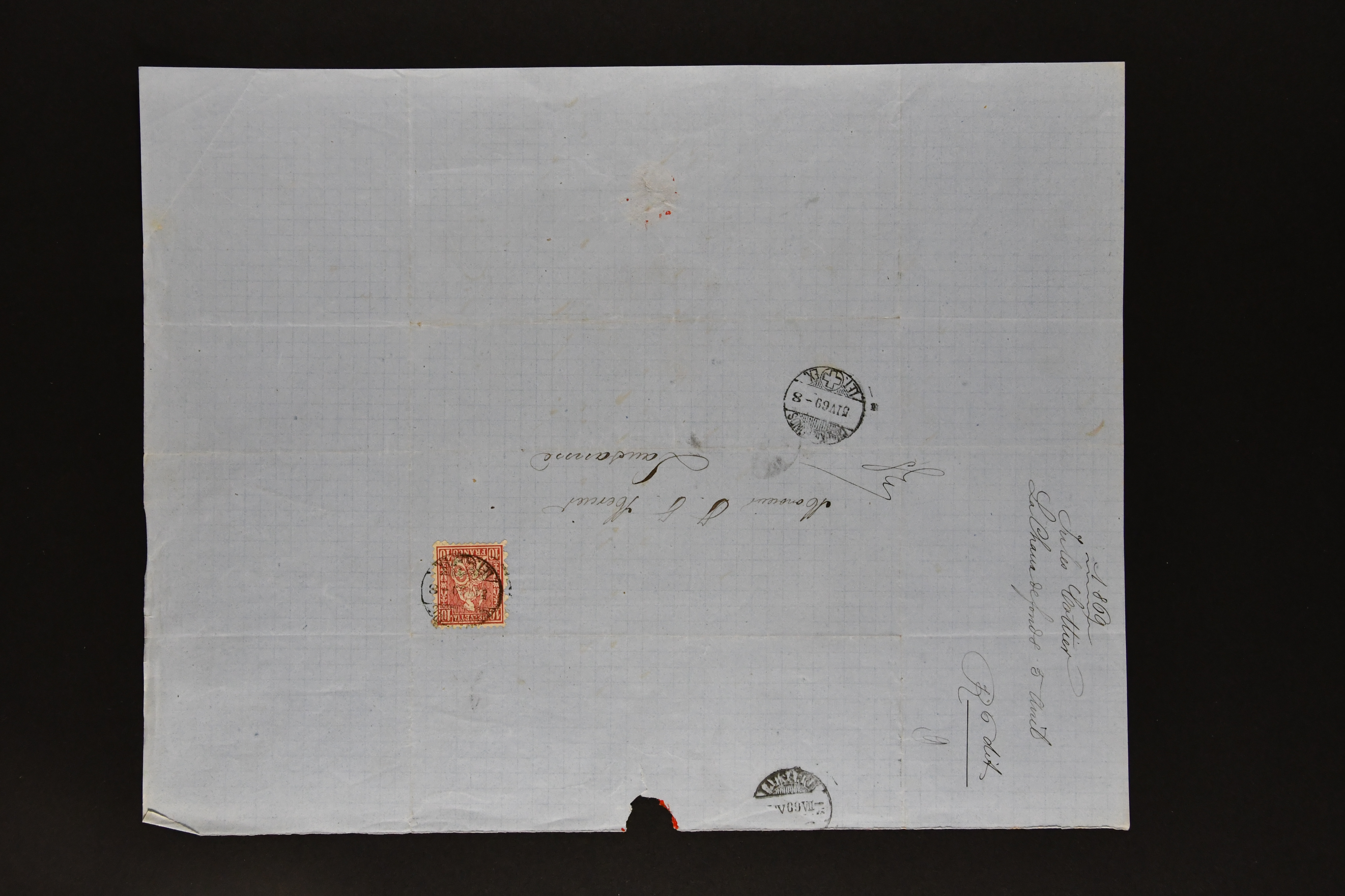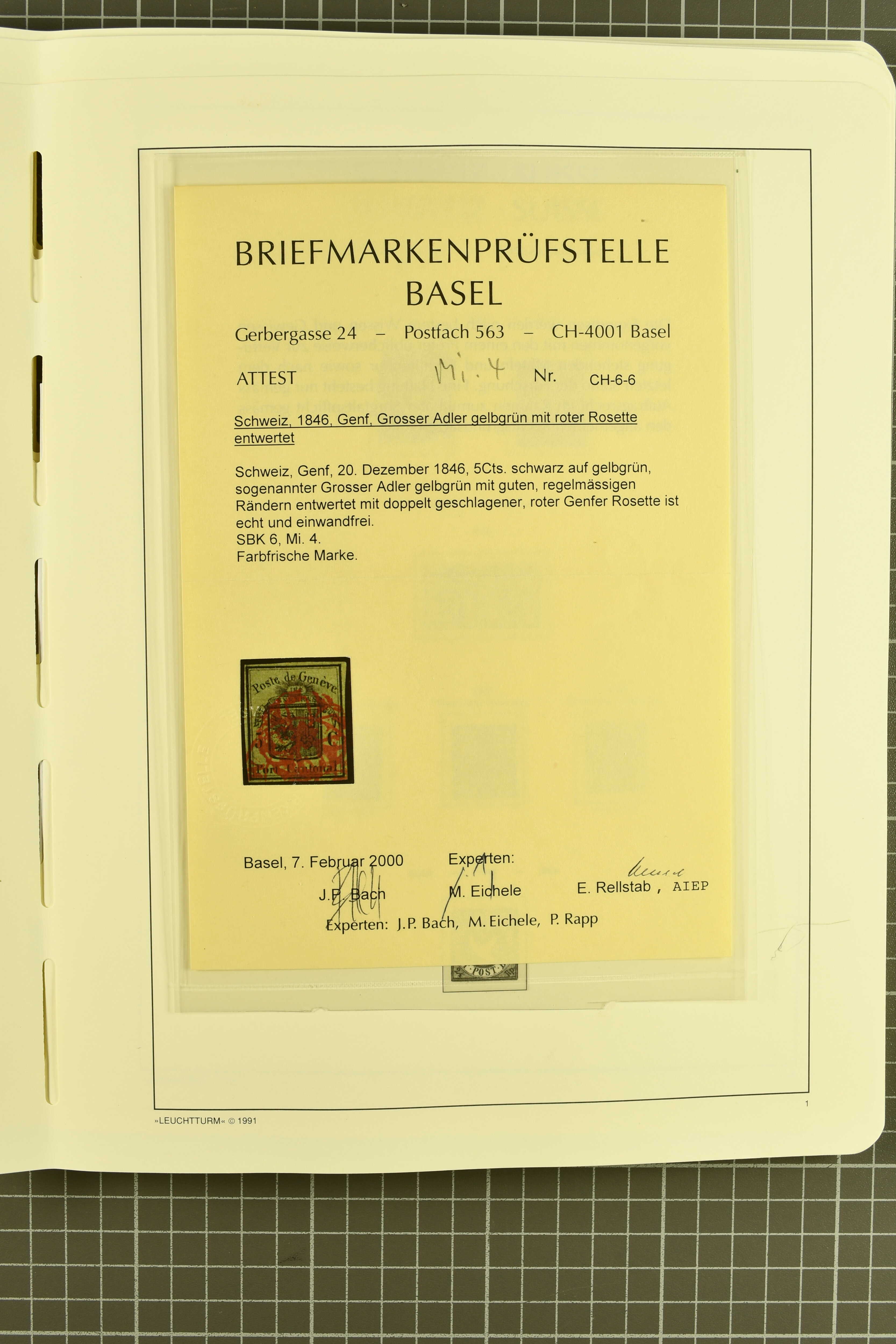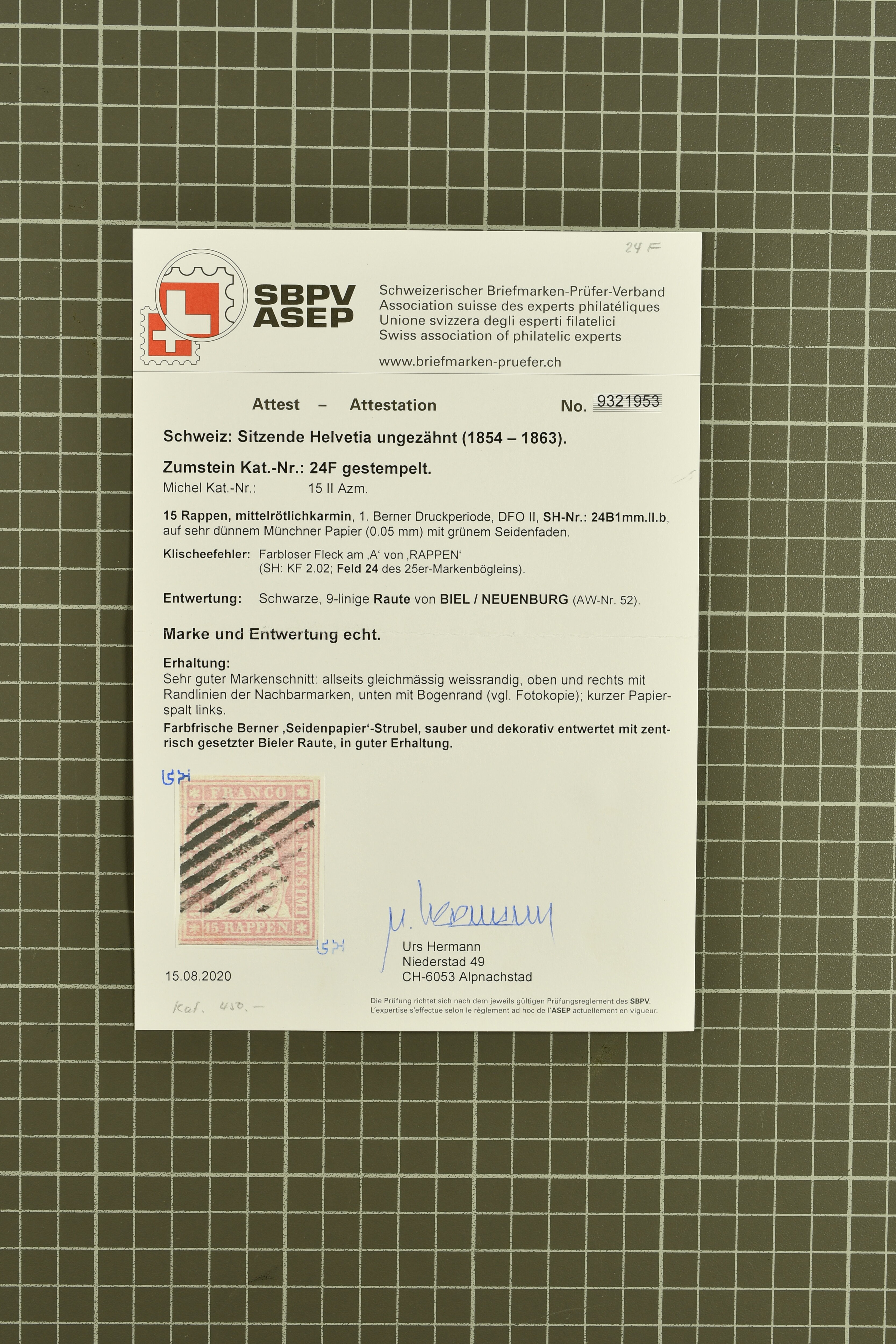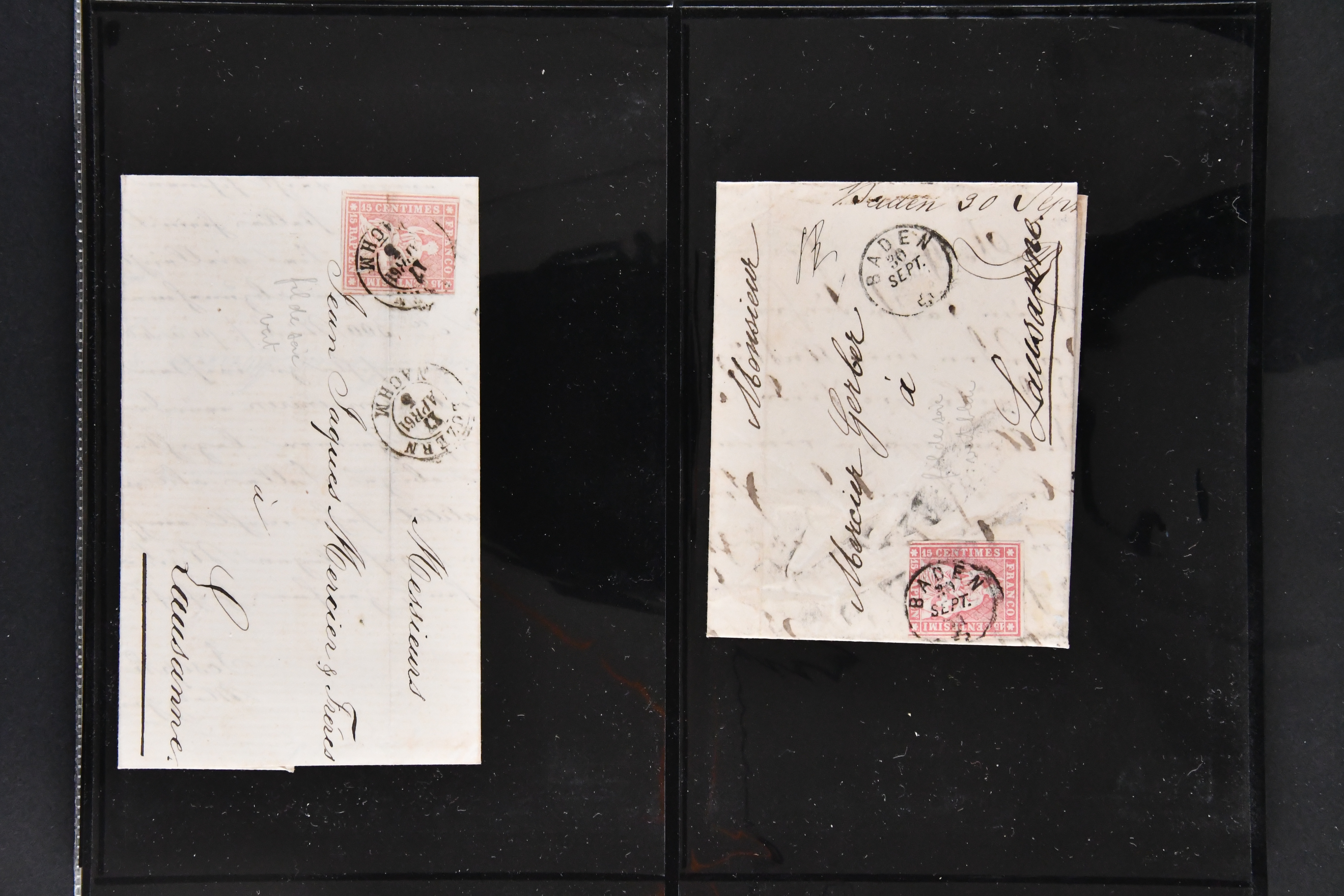 9879 cover image1850/62: Lot acht bessere Altschweiz-Frankaturen. Dabei Ortspost mit Kreuzeinfassung entw. mit schwarzer Aargauer Raute (AW 29/30) auf dekorativem Drucksachen-Streifband von Zofingen nach Niederbipp (BE), Rayon I Type 21 entw. mit schwarzem Stabstp. "BURGDORF" auf Faltbrief im 1. Briefkreis nach Langnau i.E., Rayon I hellblau (3) mit Unbekanntem Stein, Type 10 r/u mit grossem Teil der rechten Nebenmarke, klar und übergehend entw. mit blauer eidg. Raute mit nebenges. Zierlinienstempel "REINACH 5. P.K. 21 SEPT. 52" auf ungenügend frankiertem Faltbrieflein im 3. Briefkreis, nachtaxiert mit "10" Rp. in roter Tinte oder Stein B2: Typen 23+34 l/u im waagr. Paar, Rayon III, Centimes, Type 7 auf Faltbrief von Zürich nach Locarno, gr. Wertziffrer, Type 1 mit grossem Teil der linken Nebenmarke auf Faltbrieflein von Avenches nach Lausanne sowie Strubel 15 Rp. rotkarmin (SBK 24A) auf Faltbrief von Vevey nach Genf. Vereinzelt kleinere Mängel, meist aber in guter Erhaltung. Zwei Befunde, sechs Atteste. SBK=CHF 17'150 (Image 1) (Image 2) (Image 3) (Image 4) (Image 5) (Image 6) (Image 7) (Image 8)