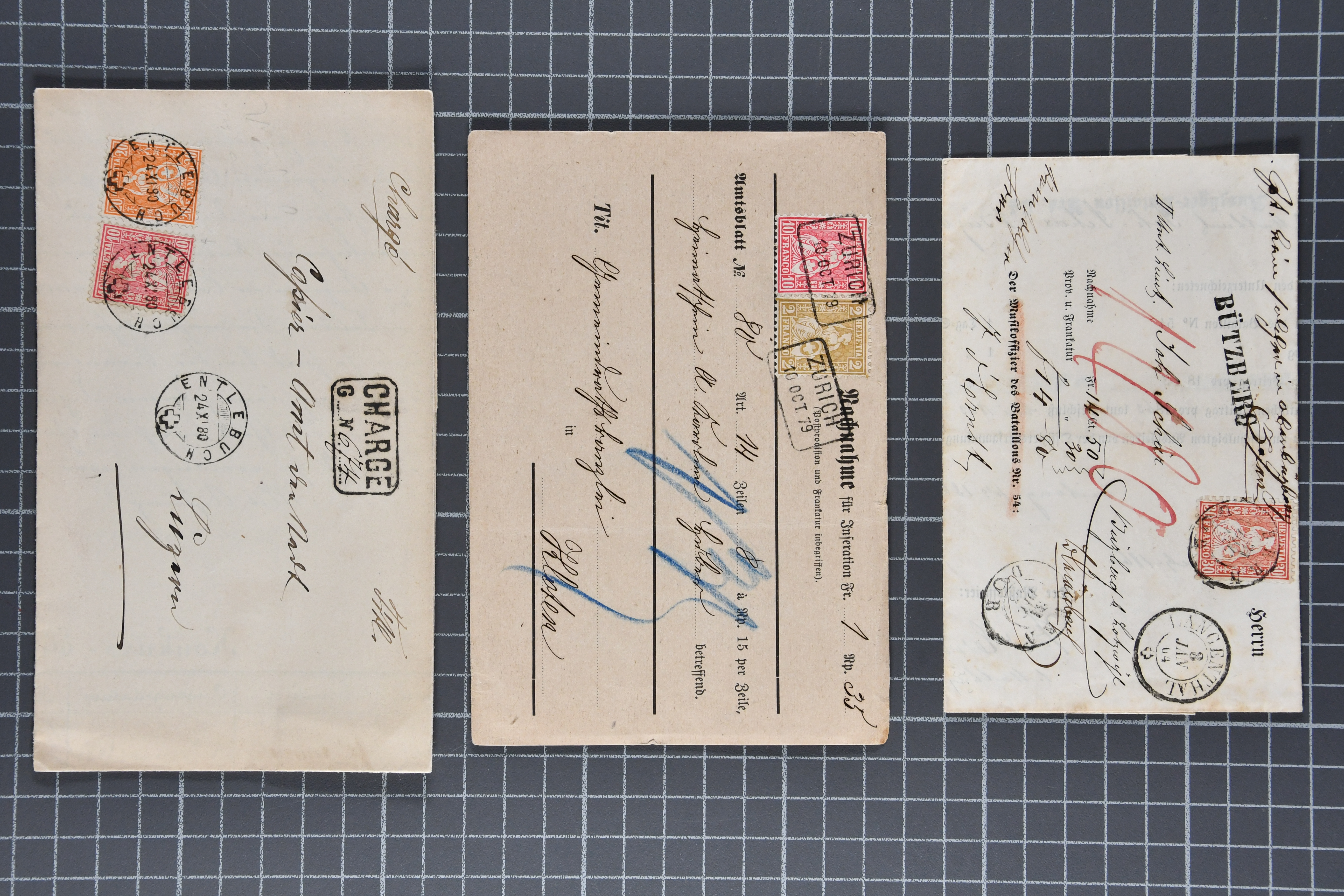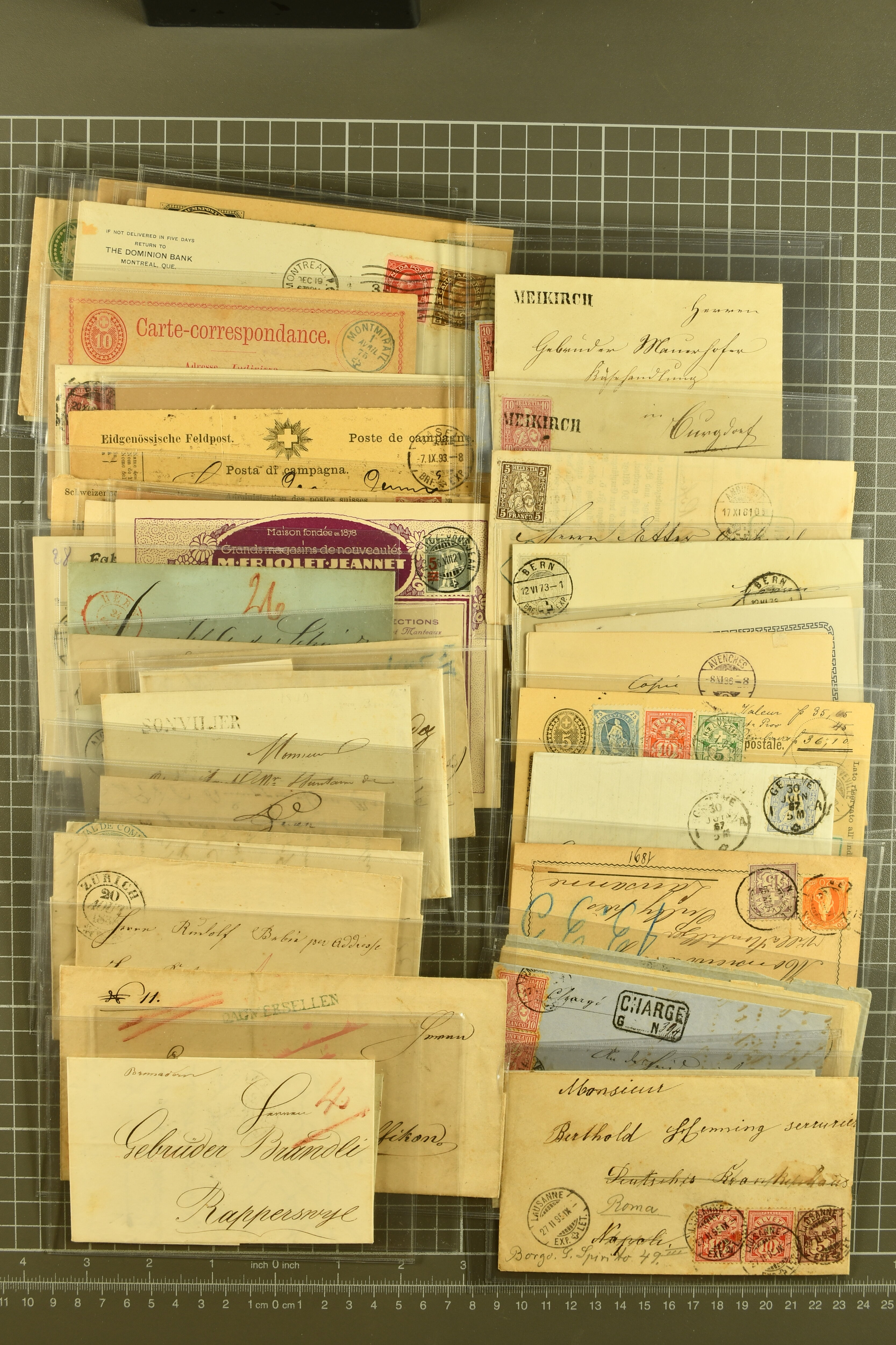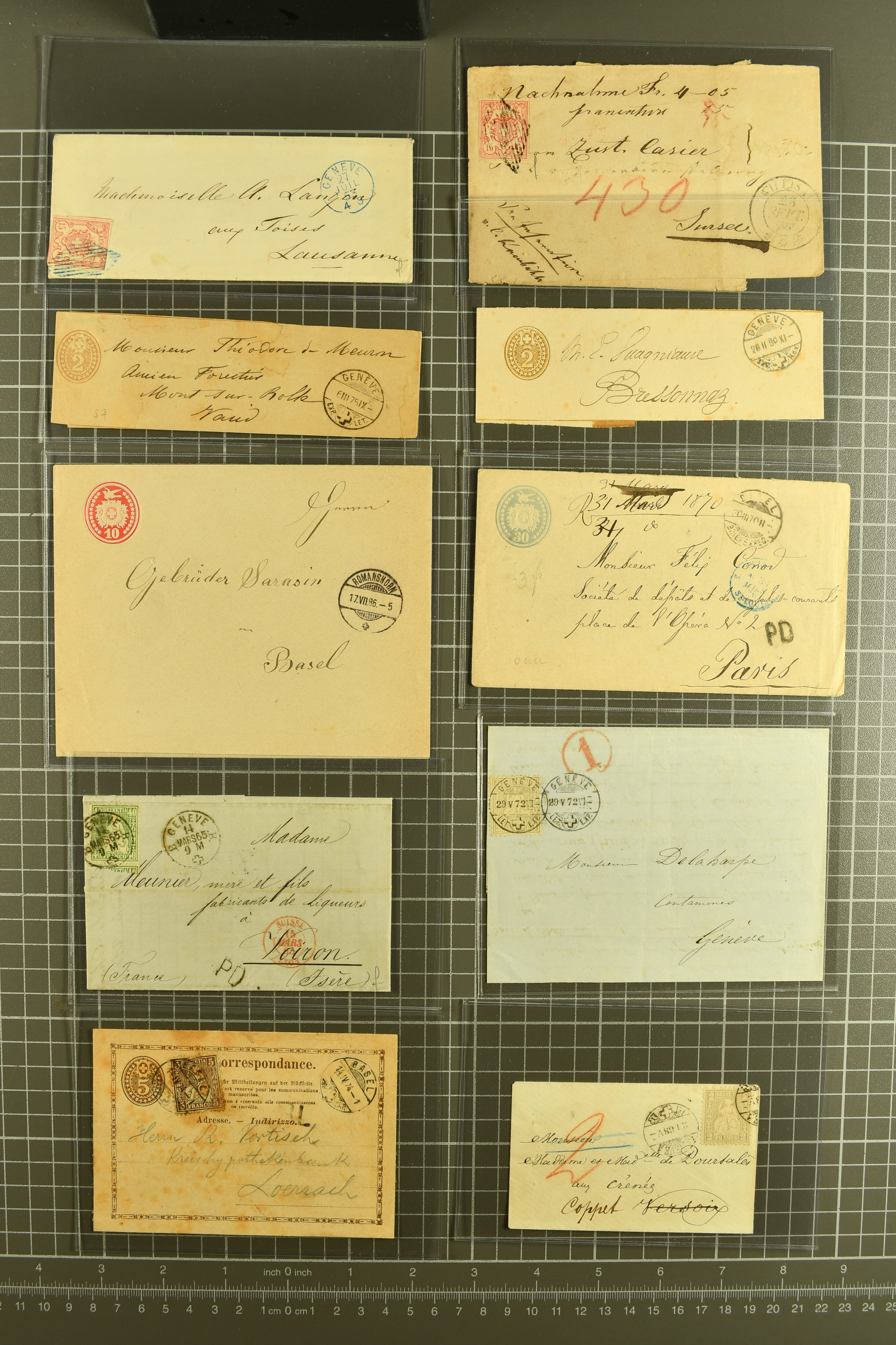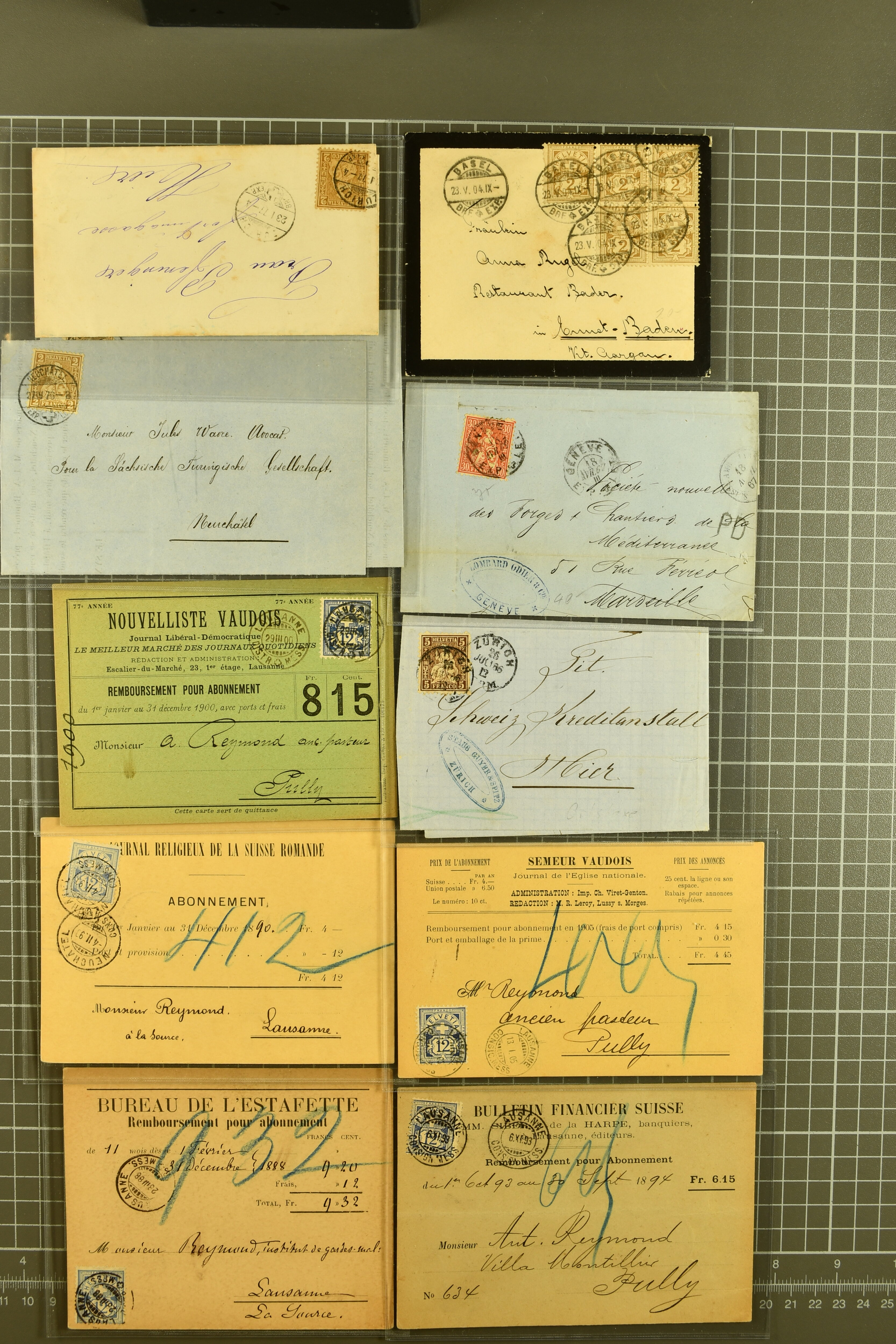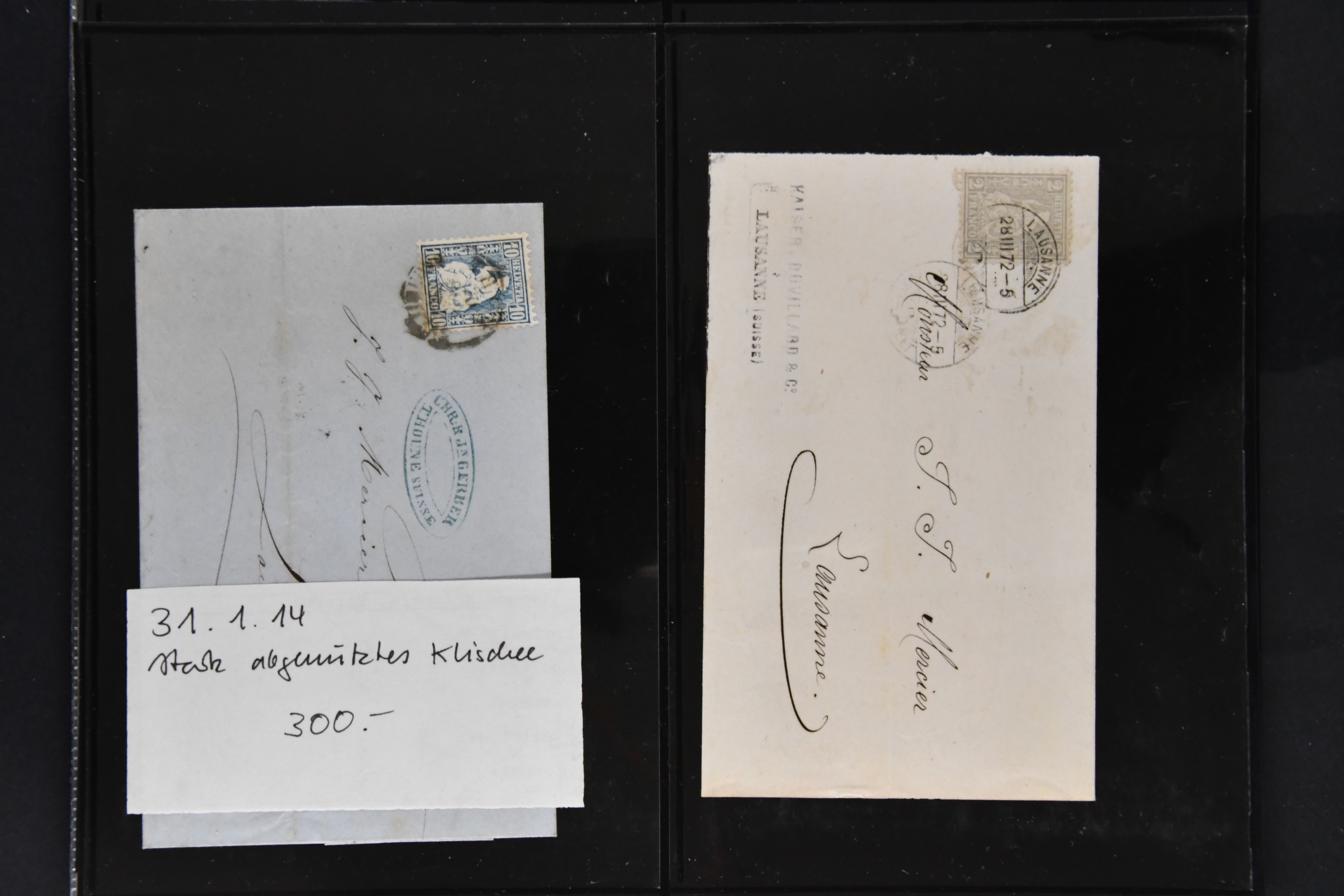 9864 cover image1851/1904: Lot 60 Briefe mit generell einfachen Inlands-Frankaturen in durchschnittlicher Erhaltung, dabei 3 Briefe mit Rayon II und III, 15 Strubelbriefe, 40 Briefe mit Frankaturen der Sitzenden, dabei 13 Drucksachen mit 2 Rp. grau / oliv, Besonderheiten wie abgenutztes Klischee, drei doppelgewichtige Briefe aus Lausanne & Genf, bei einem fälschlicherweise ein PD abgeschlagen, zwei korrespondierende Gepäckanhänger für das gleiche Gepäck zu 13 kg mit Einzelfrankatur Stehende 1 Fr. von Lausanne nach Vulpera und retour im Sommer 1904, weiterhin Tüblibrief (Image 1) (Image 2) (Image 3) (Image 4) (Image 5) (Image 6) (Image 7) (Image 8) (Image 9) (Image 10) (Image 11) (Image 12) (Image 13) (Image 14) (Image 15) (Image 16) (Image 17) (Image 18) (Image 19) (Image 20) (Image 21) (Image 22) (Image 23) (Image 24) (Image 25) (Image 26) (Image 27) (Image 28) (Image 29) (Image 30) (Image 31) (Image 32) (Image 33) (Image 34) (Image 35) (Image 36) (Image 37) (Image 38) (Image 39) (Image 40) (Image 41) (Image 42) (Image 43) (Image 44) (Image 45) (Image 46) (Image 47) (Image 48) (Image 49) (Image 50)
