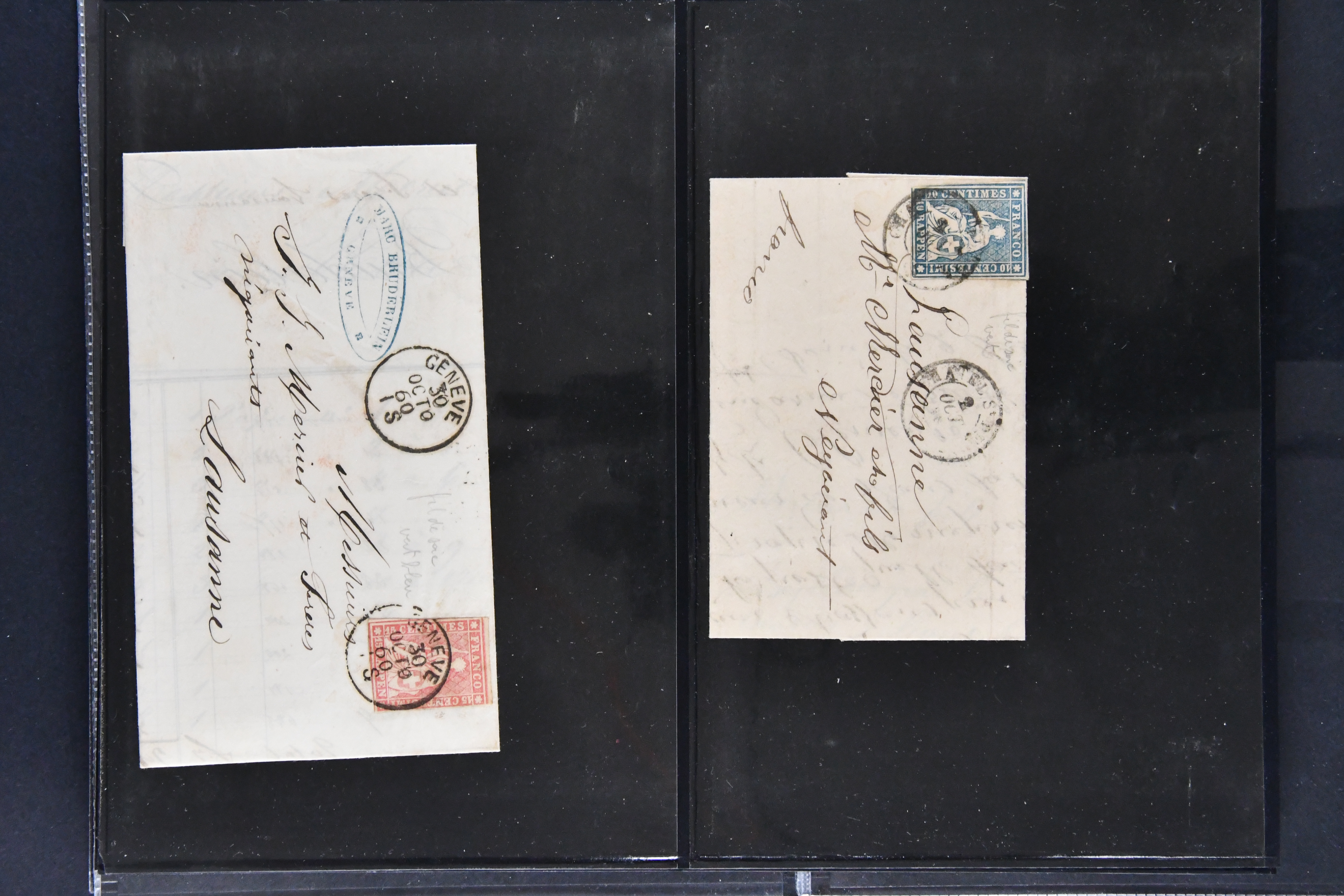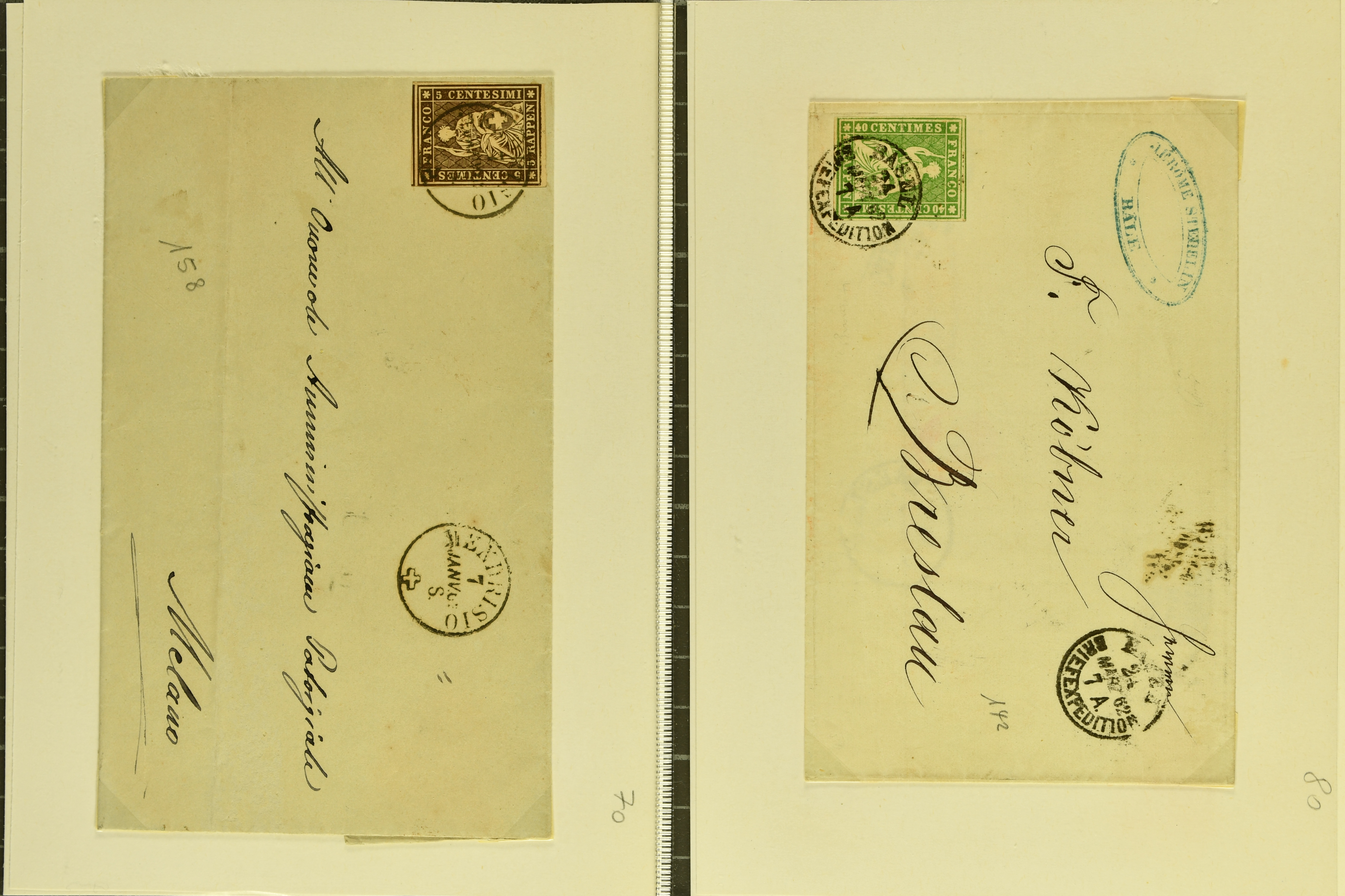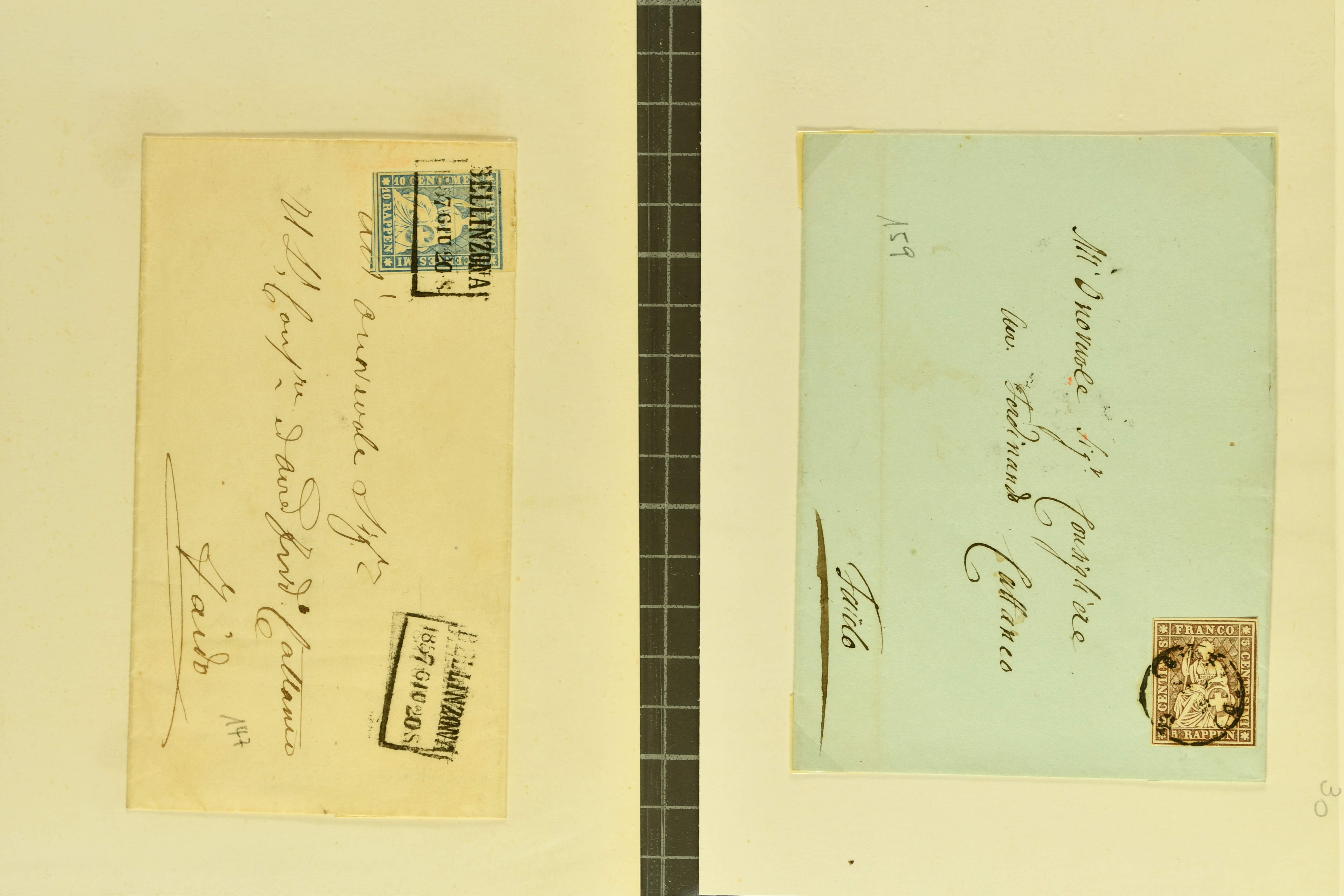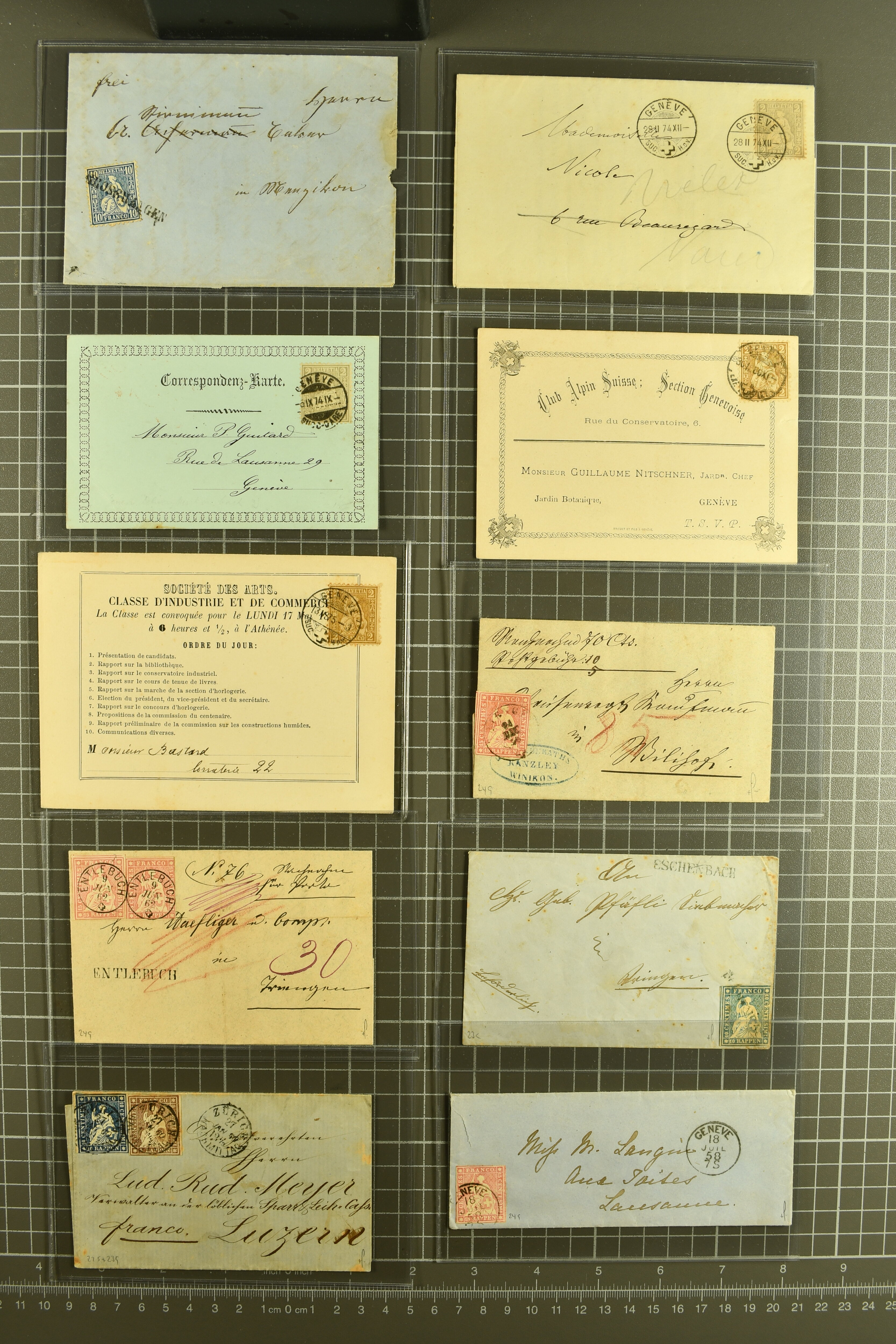 9874 cover image1752/1900: Lot 22 Briefe verschiedener Gebiete und Epochen. Dabei vier Vorphila-Briefe inkl. seltenem Stabstp. "GENEVE" mit verkehrtem N und Spuren der Einfassung (Wi. 57/8, Schäfer 158/10, CHF 500-750) als Ersatzverwendung während der Reparatur des regulären Stempels auf Portobrief nach Grenoble (1760), neun Strubelbriefe inkl. 10 Rp. preussischblau (SBK 23A) im senkr. Paar mit Bogenrand links auf Brief von Brusio nach Soglio, 10 Rp. grauultramarin (SBK 23B), klar und übergehend entw. mit Kastenstp. "BELLINZONA 1857 GIU. 20 S" in schwarz auf Faltbrief nach Faido und 40 Rp. oliv (SBK 26G) nach Breslau, Schlesien (heutiges Polen). Ausserdem klassische Briefe von Bayern (2), Belgien mit 10 c. blau auf unterfrankiertem Brief von Liège sowie Spanien mit zwei 6 Cuartos schwarz (Mi. 1), zus. klar entw. mit schwarzem 'Spinnen'-Stp. auf Brief nach Madrid. Meist gute Erhaltung; ein Attest Moser (1963) (Image 1) (Image 2) (Image 3) (Image 4) (Image 5) (Image 6) (Image 7) (Image 8) (Image 9) (Image 10) (Image 11) (Image 12)