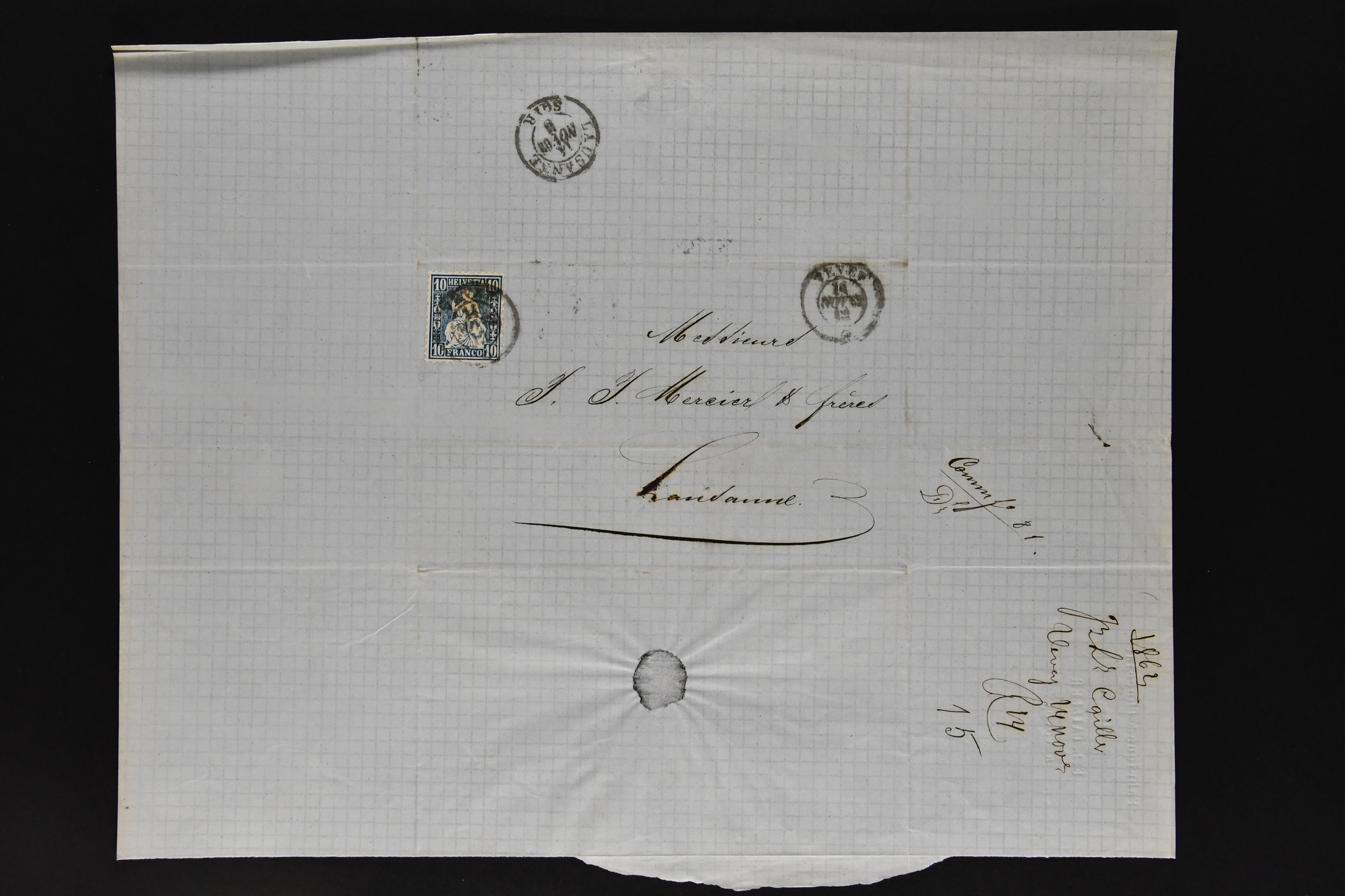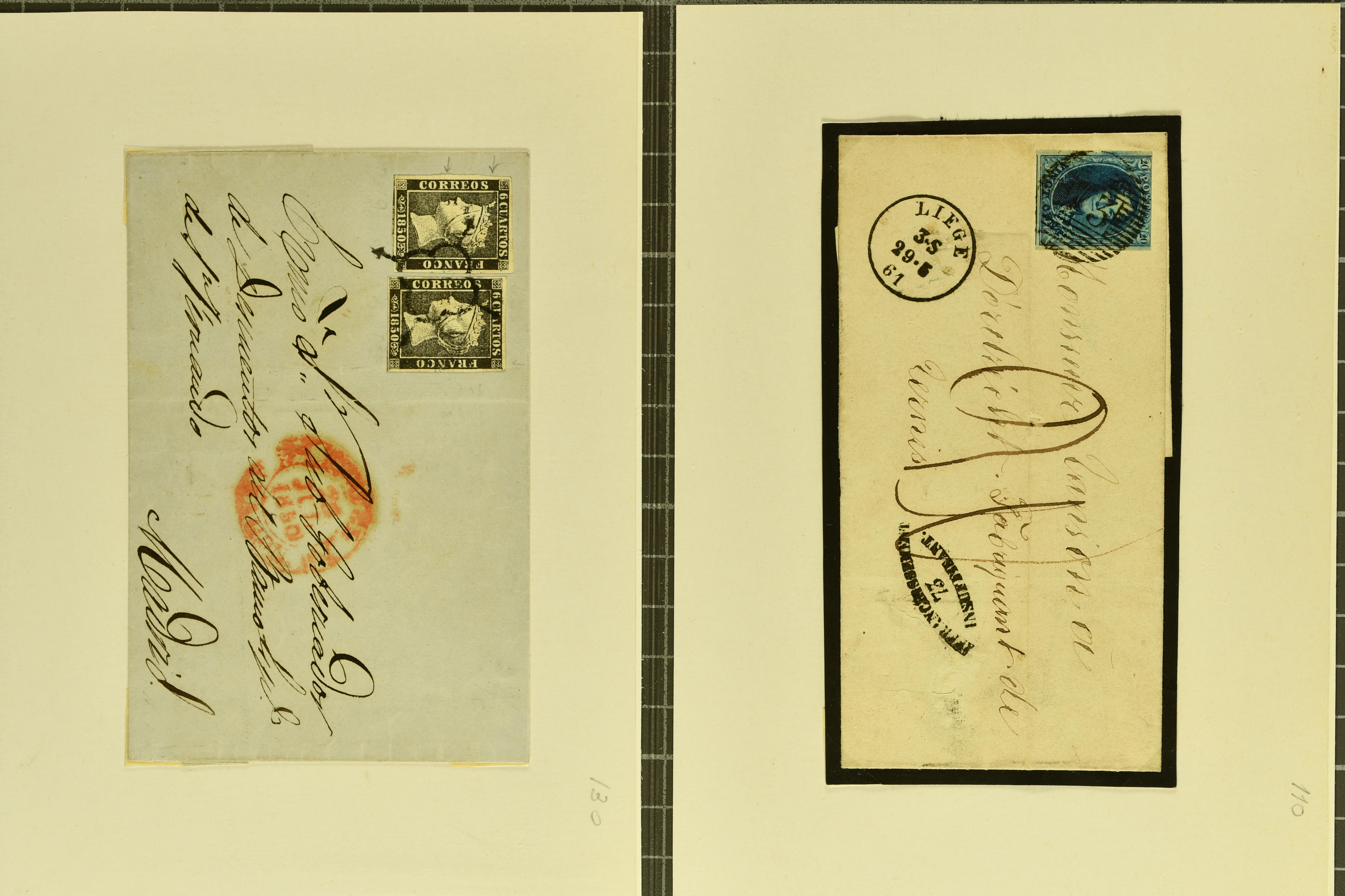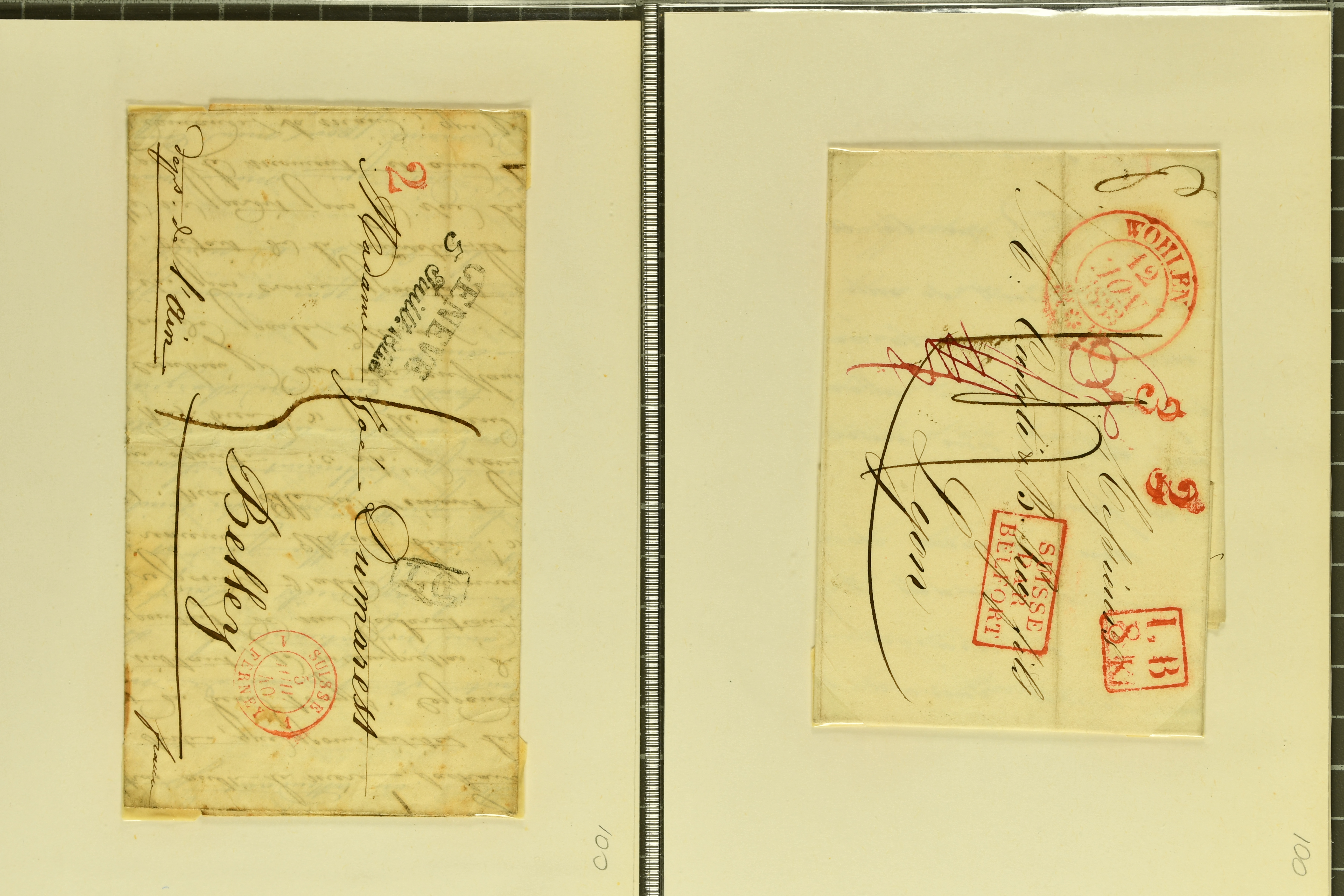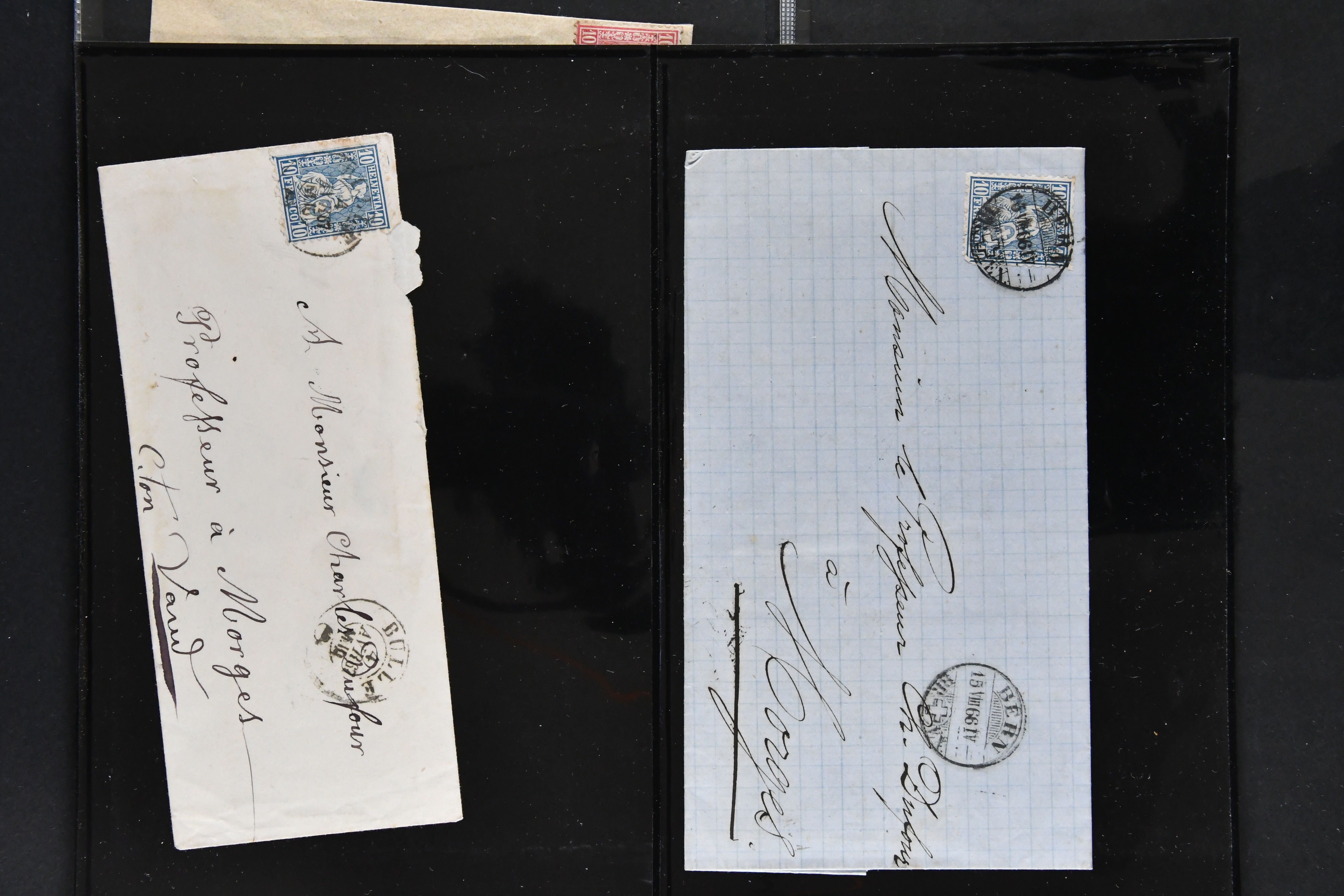 9874 cover image1752/1900: Lot 22 Briefe verschiedener Gebiete und Epochen. Dabei vier Vorphila-Briefe inkl. seltenem Stabstp. "GENEVE" mit verkehrtem N und Spuren der Einfassung (Wi. 57/8, Schäfer 158/10, CHF 500-750) als Ersatzverwendung während der Reparatur des regulären Stempels auf Portobrief nach Grenoble (1760), neun Strubelbriefe inkl. 10 Rp. preussischblau (SBK 23A) im senkr. Paar mit Bogenrand links auf Brief von Brusio nach Soglio, 10 Rp. grauultramarin (SBK 23B), klar und übergehend entw. mit Kastenstp. "BELLINZONA 1857 GIU. 20 S" in schwarz auf Faltbrief nach Faido und 40 Rp. oliv (SBK 26G) nach Breslau, Schlesien (heutiges Polen). Ausserdem klassische Briefe von Bayern (2), Belgien mit 10 c. blau auf unterfrankiertem Brief von Liège sowie Spanien mit zwei 6 Cuartos schwarz (Mi. 1), zus. klar entw. mit schwarzem 'Spinnen'-Stp. auf Brief nach Madrid. Meist gute Erhaltung; ein Attest Moser (1963) (Image 1) (Image 2) (Image 3) (Image 4) (Image 5) (Image 6) (Image 7) (Image 8) (Image 9) (Image 10) (Image 11) (Image 12)