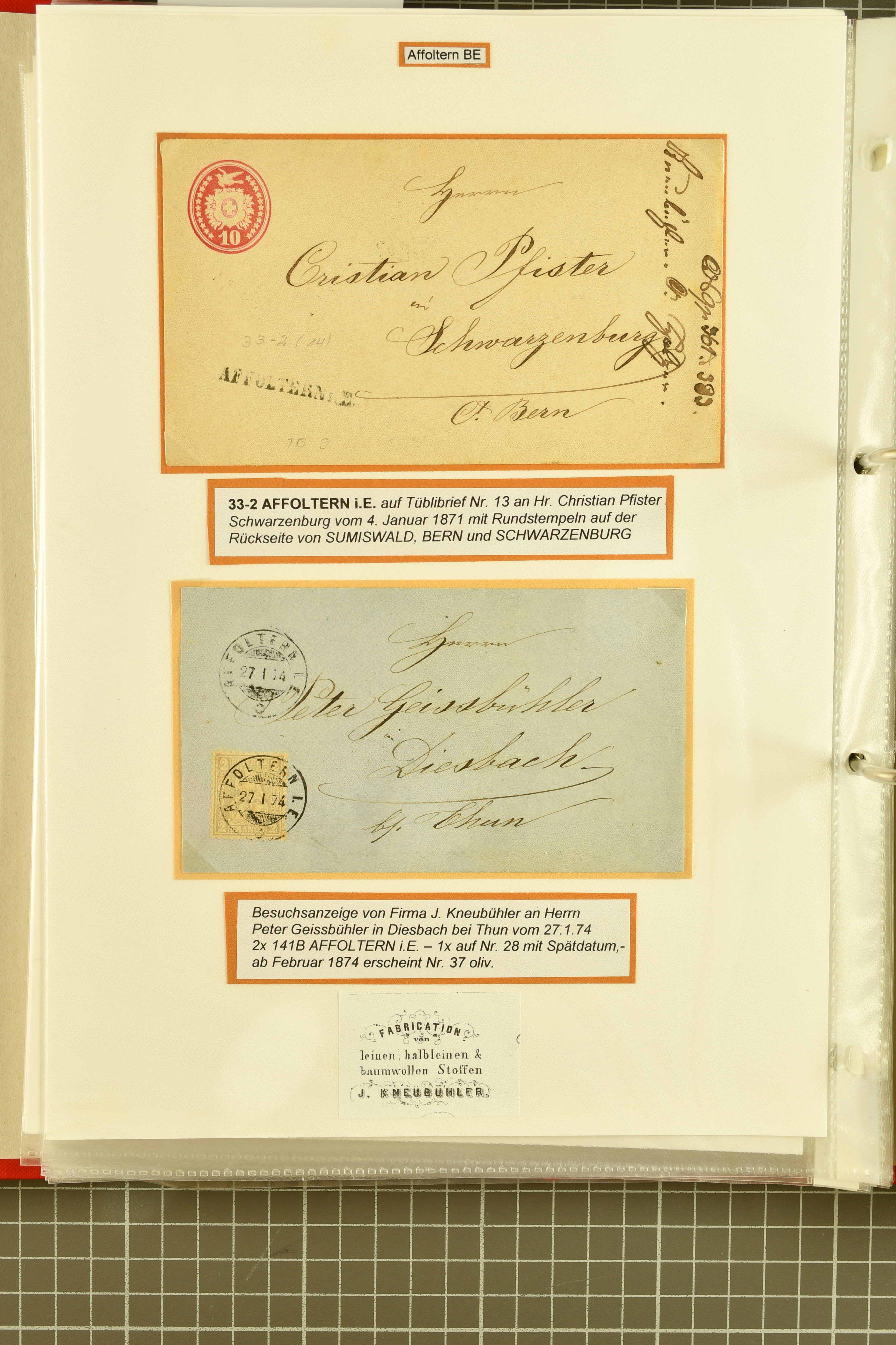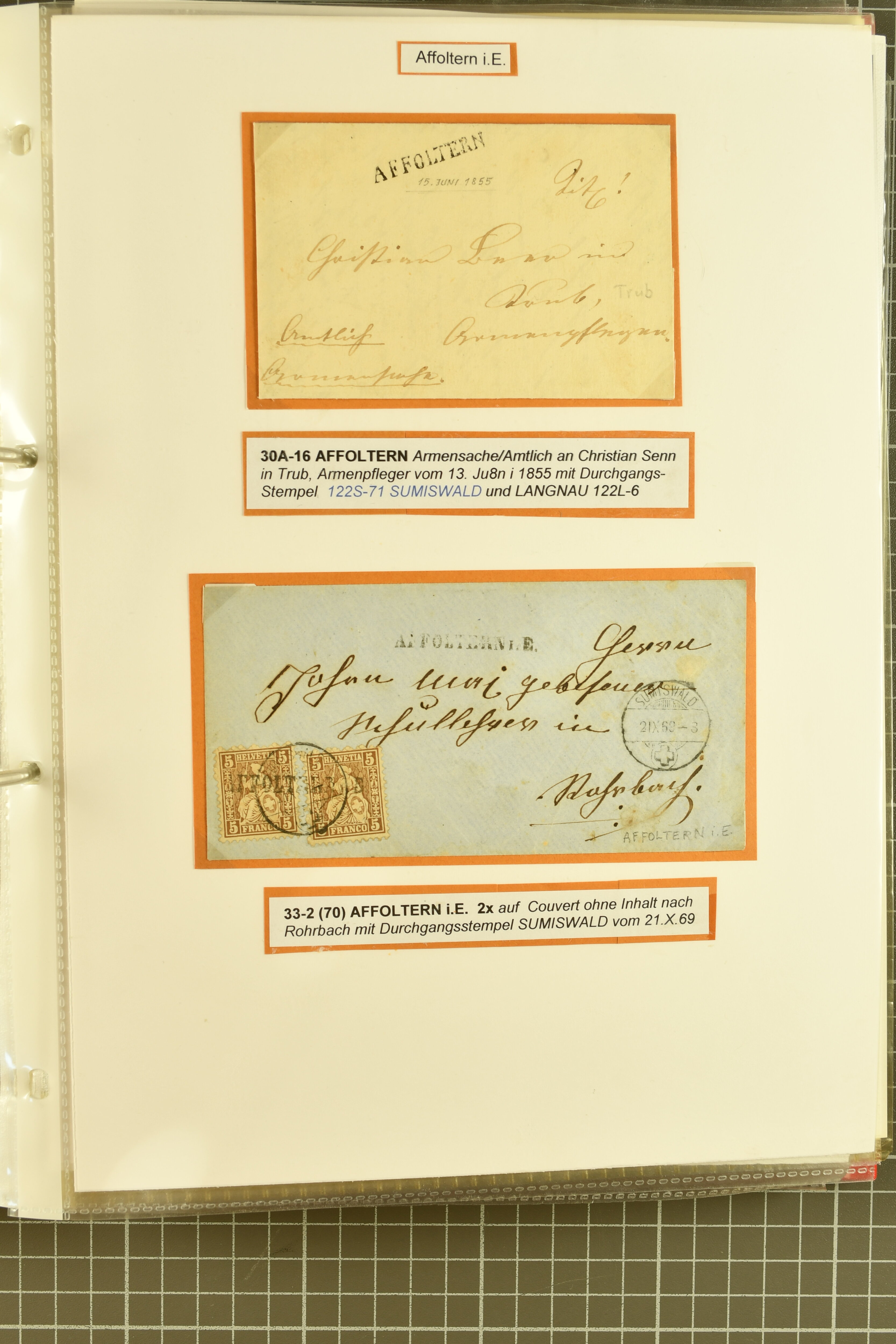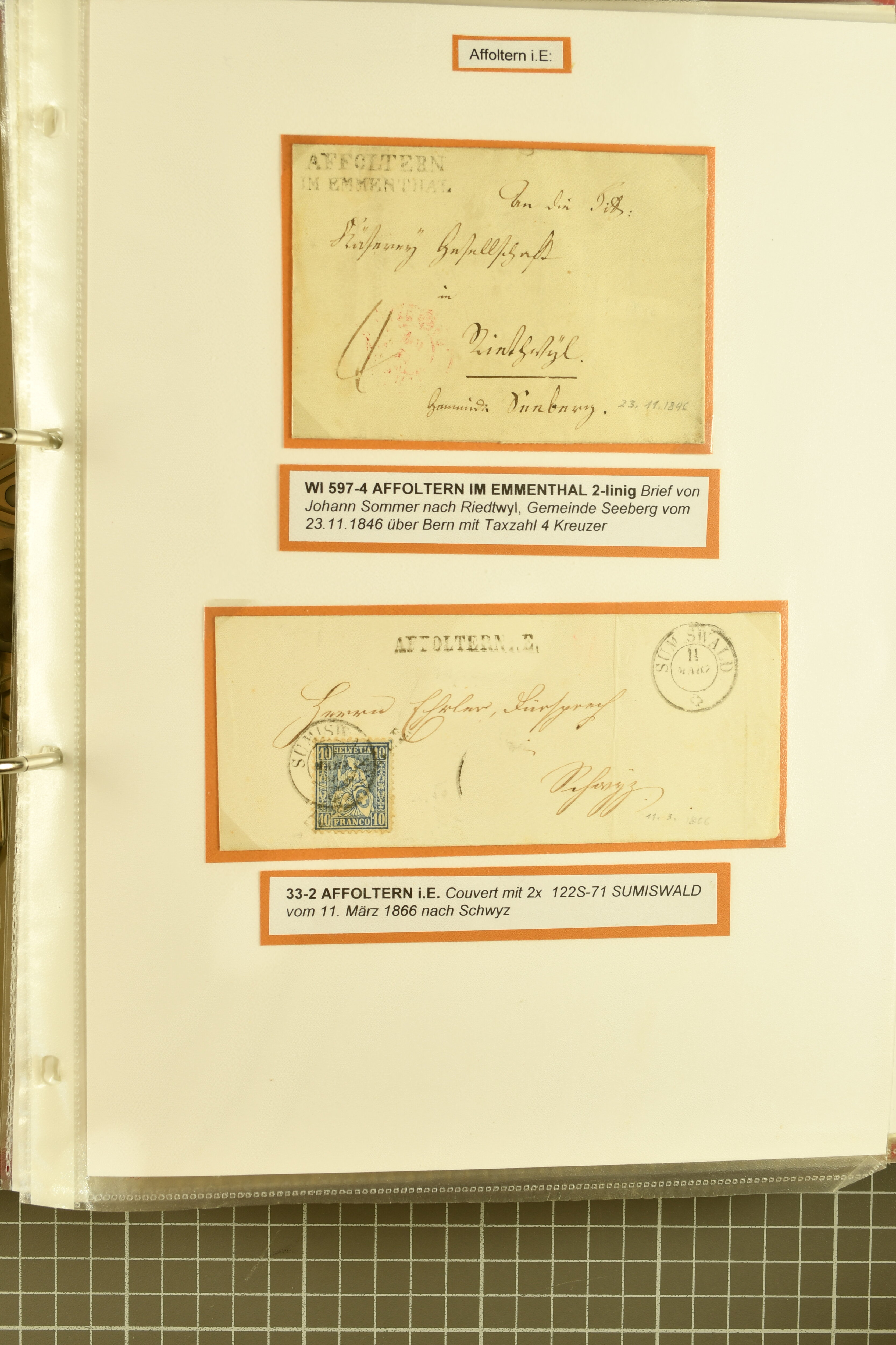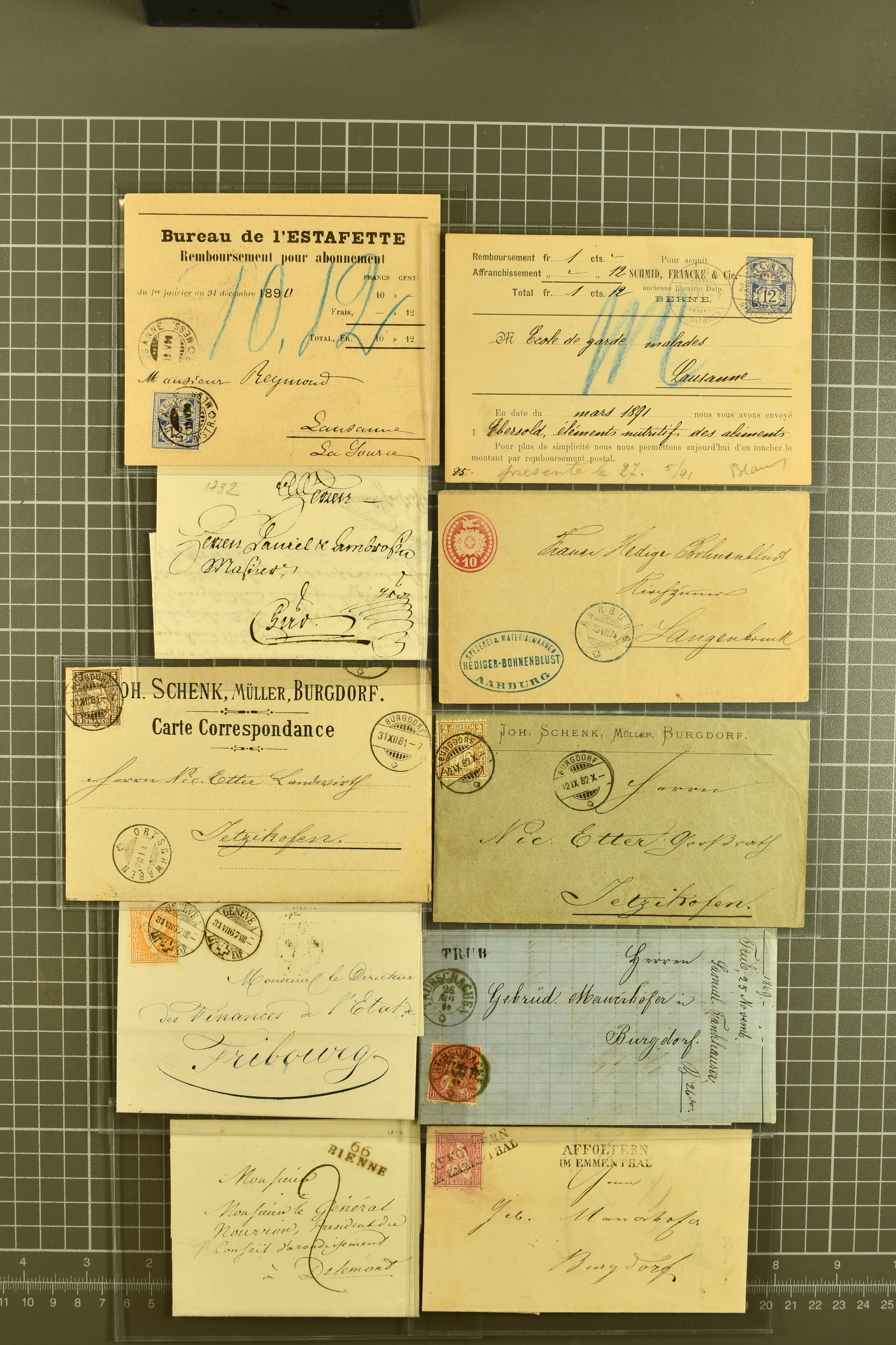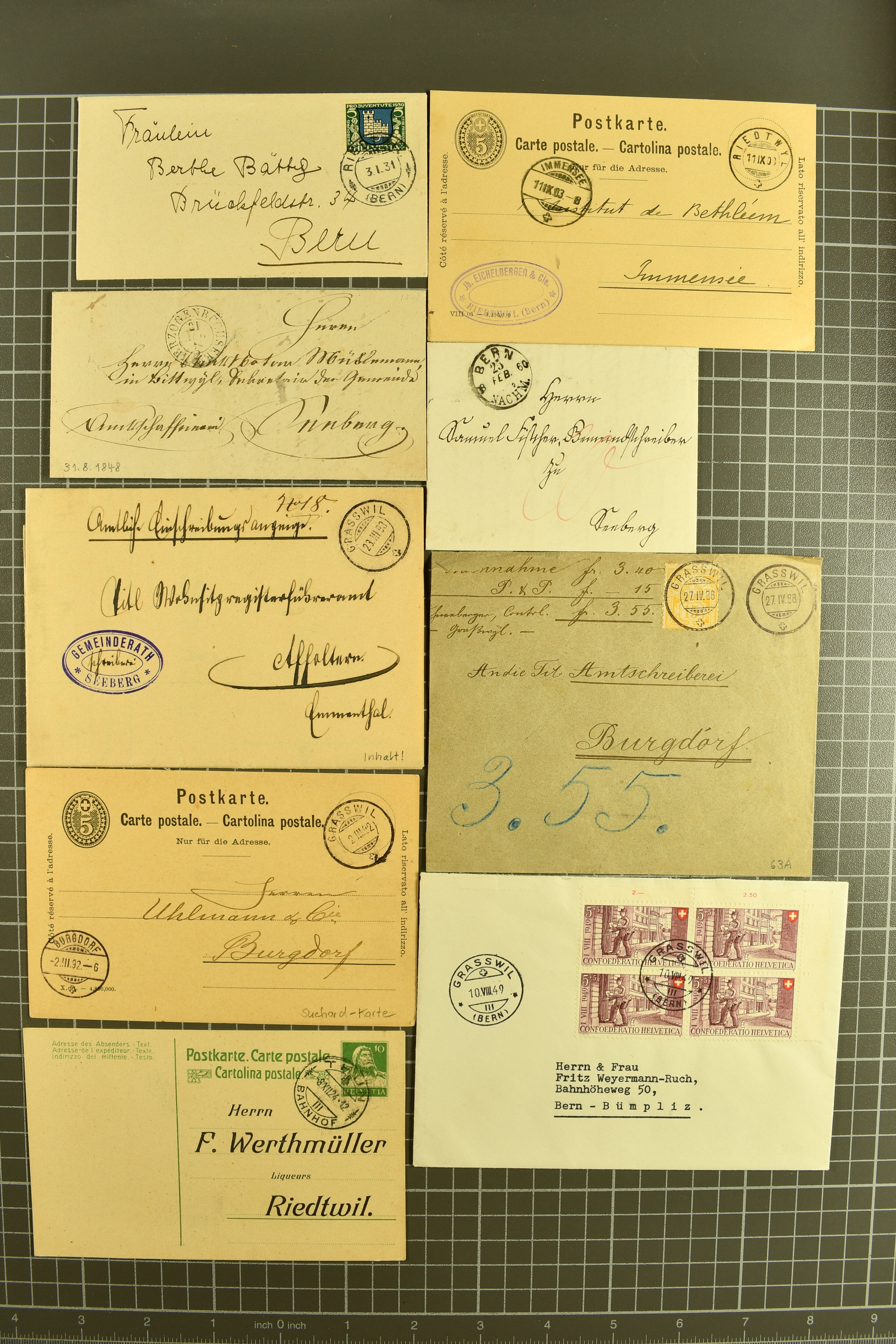 9862 image1834/1906ca.: Partie von Belegen aus Berner Ortschaften, aufgezogen auf Blättern, dabei ein Rayon-Brief von Lützelflüh, ferner ein Vorphilabrief und ein Brief ohne Marke. Je ein Vorphila- oder Brief ohne Marke aus Eriswil (2), Zäzwil (2) und Wichtrach (1); aus Dürrenroth ein Beleg mit 10 Rp. Sitzende Helvetia sowie zwei Briefe ohne Marke, beide mit Zwergstempel. Aus Sumiswald zwei Vorphilabriefe; aus Affoltern i. E. insgesamt 10 Belege, Vorphila und Markenbriefe, darunter auch ein Tüblibrief. Münsingen mit acht Marken und vier Belegen vertreten. Landiswil mit Stempel "LANDYSWYL" 10 Rp. Sitzende Helvetia rot einmal lose und einmal auf Brief. Aus "LUZELFLÜH" ein Vorphilabrief, aus Schlosswil drei Belege, Rubigen drei Belege, Oberthal fünf Belege, Arni bei Biglen mit Ganzsachenpostkarte sowie zwei lose 10 Rp. Sitzende Helvetia rot. Aus Trachselwald zehn Belege, darunter acht Vorphila/BoM (einer mit Zwergstempel) und zwei Ganzsachenpostkarten. Walterswil mit zwei Belegen, Waltringen mit einer Marke Stehende Helvetia 30 Rp. und einem Vorphilabrief, Walkringen mit zwei Vorphilabriefen, Zollbrück mit vier Belegen. Ergänzt durch 21 weitere Belege, teils von den genannten Ortschaften, sowie drei lose Werte. Mit dabei u. a. Zwergstempel von "GRÜNENMATT" (2) sowie "KIESEN" im Kästchen, beide auf Ganzsachenpostkarten (Image 1) (Image 2) (Image 3) (Image 4) (Image 5) (Image 6) (Image 7) (Image 8) (Image 9) (Image 10) (Image 11) (Image 12) (Image 13) (Image 14) (Image 15) (Image 16) (Image 17) (Image 18) (Image 19) (Image 20) (Image 21) (Image 22) (Image 23) (Image 24) (Image 25) (Image 26) (Image 27) (Image 28) (Image 29) (Image 30) (Image 31) (Image 32) (Image 33) (Image 34) (Image 35) (Image 36) (Image 37) (Image 38) (Image 39) (Image 40) (Image 41) (Image 42) (Image 43) (Image 44) (Image 45) (Image 46) (Image 47) (Image 48)