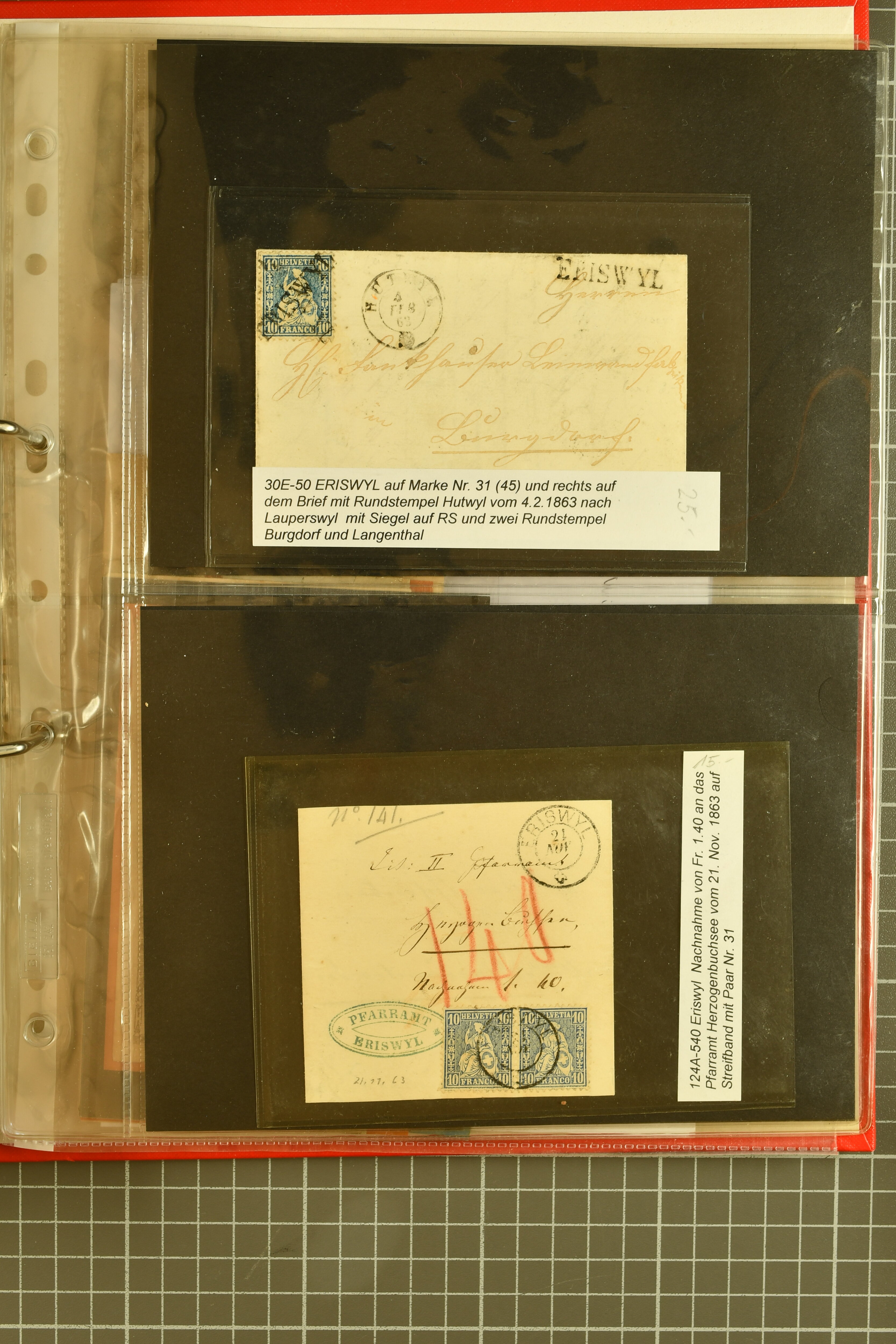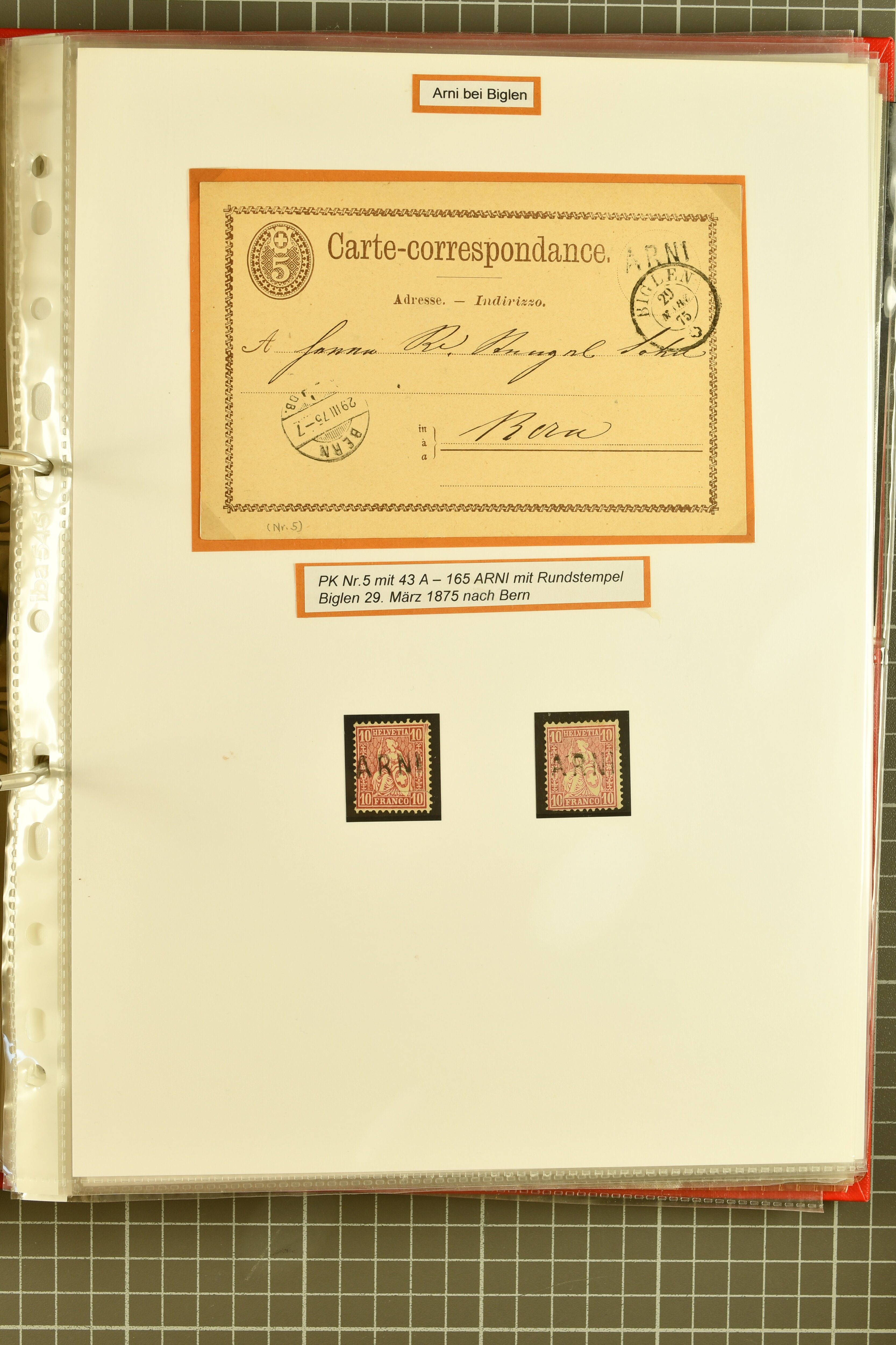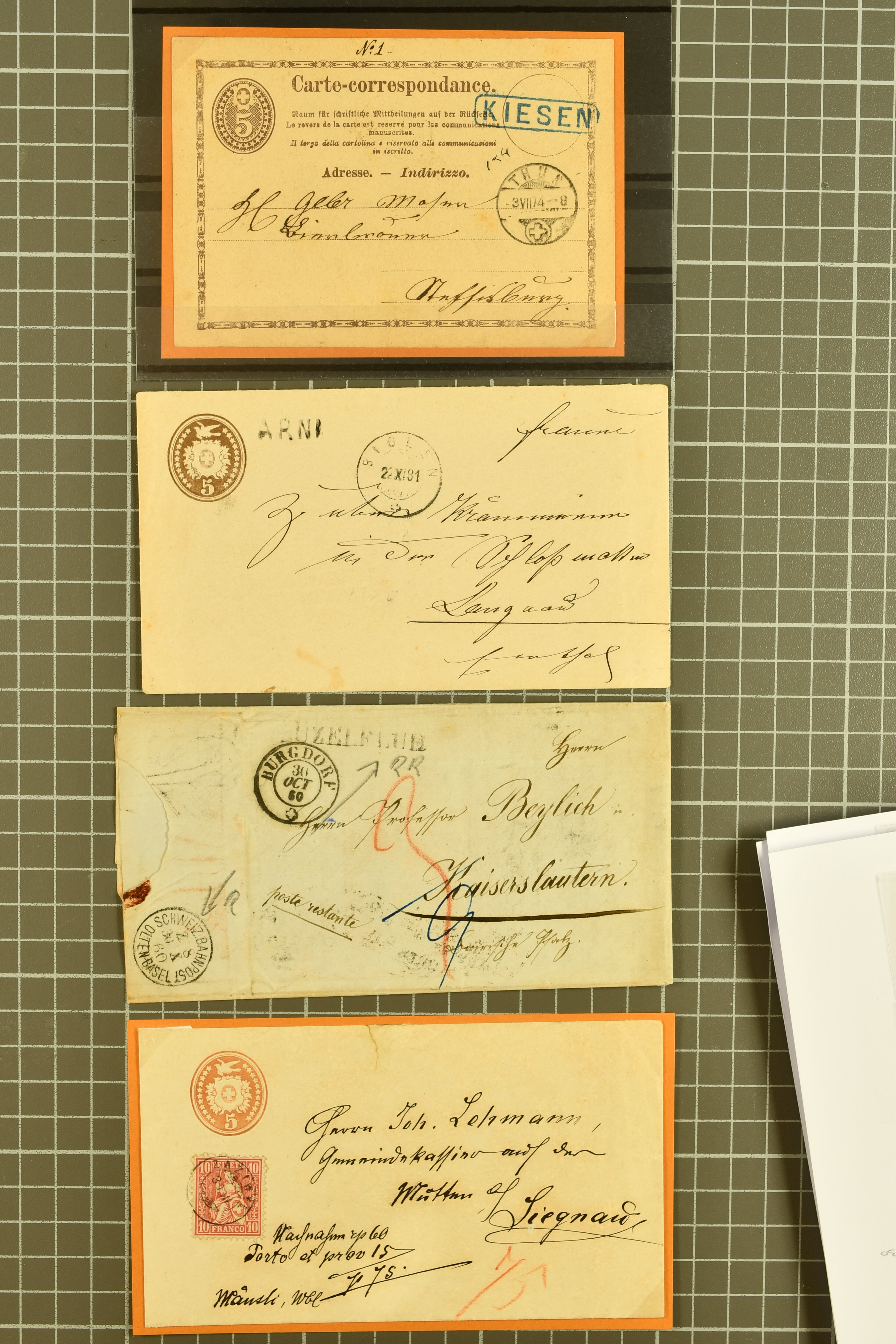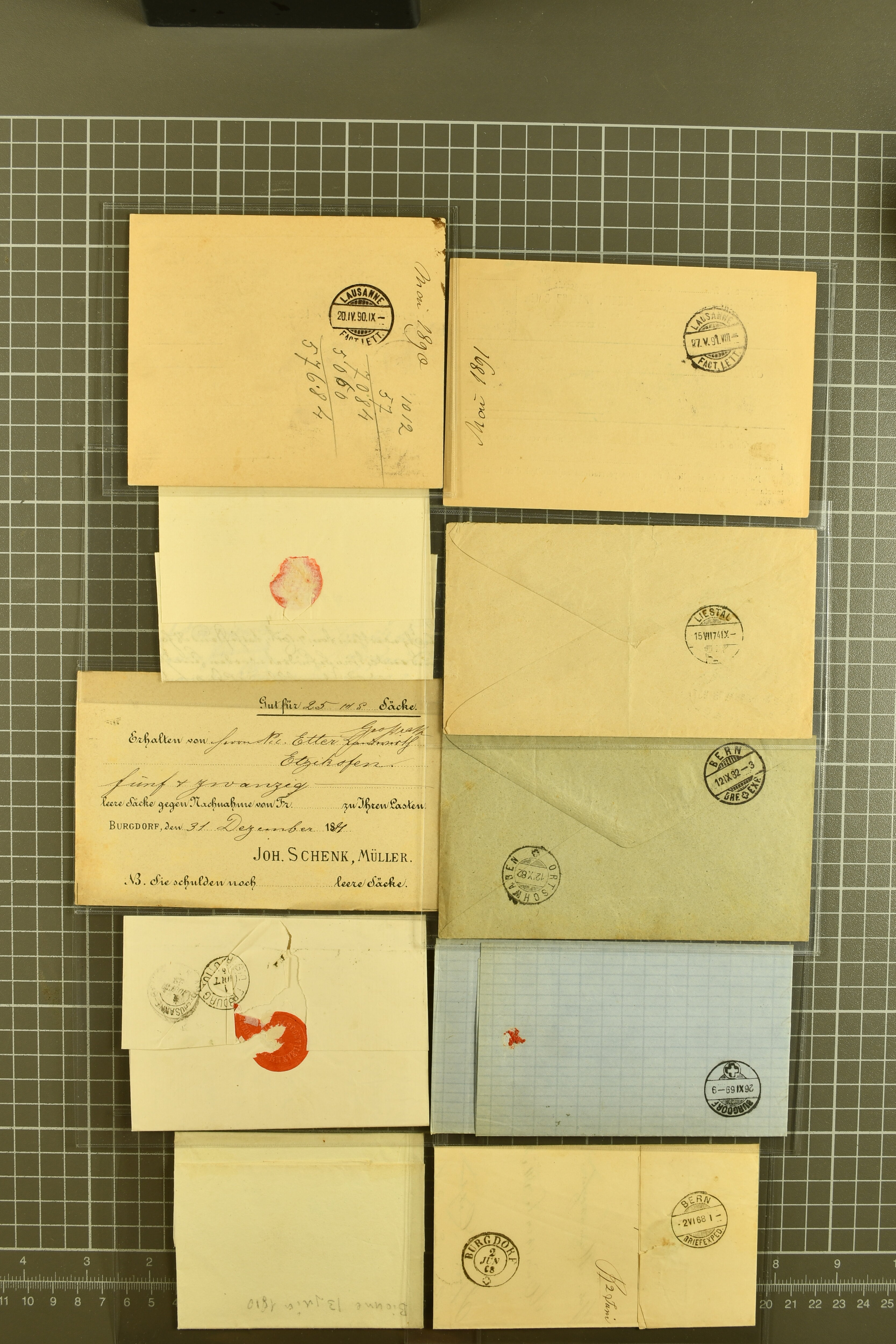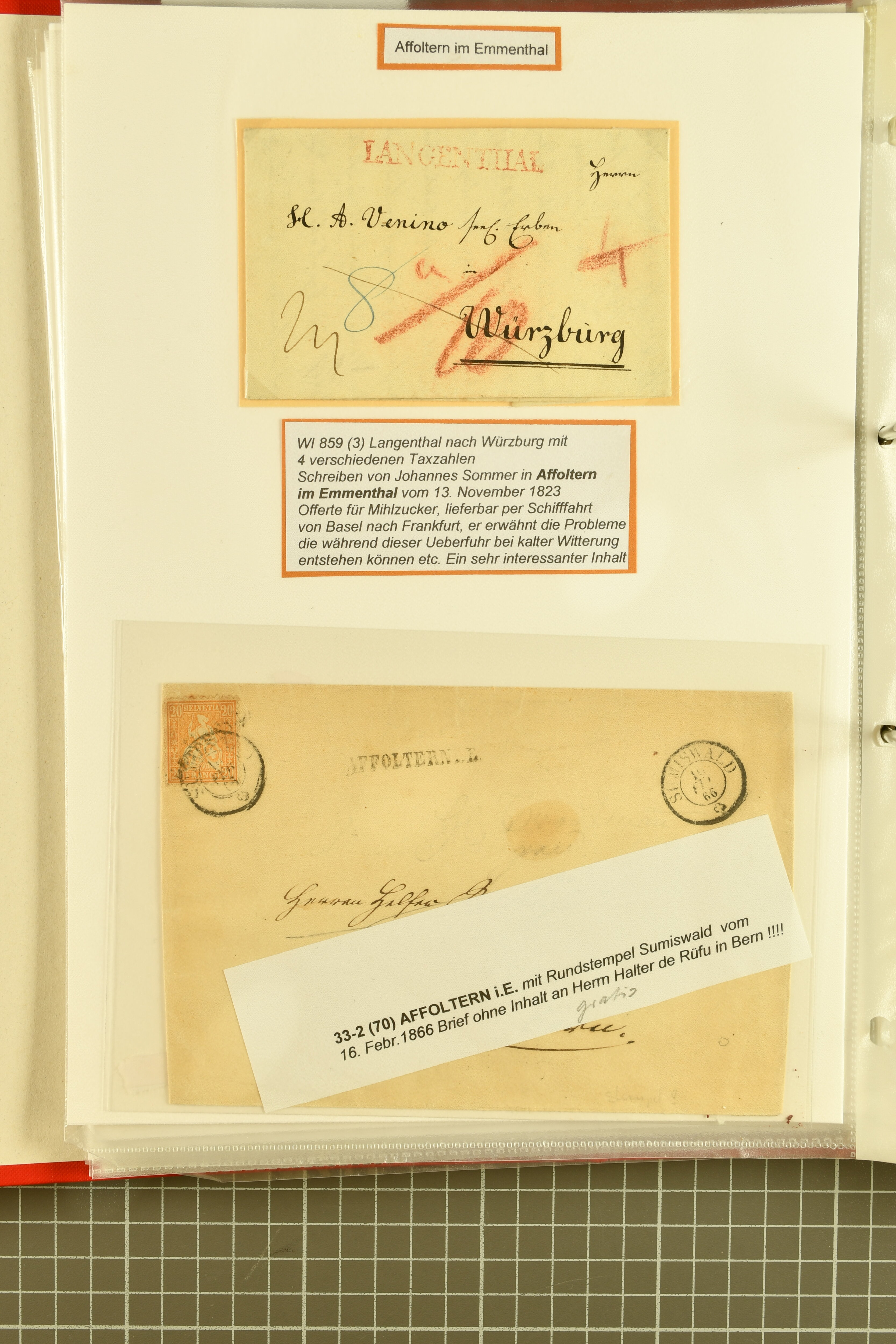 9862 image1834/1906ca.: Partie von Belegen aus Berner Ortschaften, aufgezogen auf Blättern, dabei ein Rayon-Brief von Lützelflüh, ferner ein Vorphilabrief und ein Brief ohne Marke. Je ein Vorphila- oder Brief ohne Marke aus Eriswil (2), Zäzwil (2) und Wichtrach (1); aus Dürrenroth ein Beleg mit 10 Rp. Sitzende Helvetia sowie zwei Briefe ohne Marke, beide mit Zwergstempel. Aus Sumiswald zwei Vorphilabriefe; aus Affoltern i. E. insgesamt 10 Belege, Vorphila und Markenbriefe, darunter auch ein Tüblibrief. Münsingen mit acht Marken und vier Belegen vertreten. Landiswil mit Stempel "LANDYSWYL" 10 Rp. Sitzende Helvetia rot einmal lose und einmal auf Brief. Aus "LUZELFLÜH" ein Vorphilabrief, aus Schlosswil drei Belege, Rubigen drei Belege, Oberthal fünf Belege, Arni bei Biglen mit Ganzsachenpostkarte sowie zwei lose 10 Rp. Sitzende Helvetia rot. Aus Trachselwald zehn Belege, darunter acht Vorphila/BoM (einer mit Zwergstempel) und zwei Ganzsachenpostkarten. Walterswil mit zwei Belegen, Waltringen mit einer Marke Stehende Helvetia 30 Rp. und einem Vorphilabrief, Walkringen mit zwei Vorphilabriefen, Zollbrück mit vier Belegen. Ergänzt durch 21 weitere Belege, teils von den genannten Ortschaften, sowie drei lose Werte. Mit dabei u. a. Zwergstempel von "GRÜNENMATT" (2) sowie "KIESEN" im Kästchen, beide auf Ganzsachenpostkarten (Image 1) (Image 2) (Image 3) (Image 4) (Image 5) (Image 6) (Image 7) (Image 8) (Image 9) (Image 10) (Image 11) (Image 12) (Image 13) (Image 14) (Image 15) (Image 16) (Image 17) (Image 18) (Image 19) (Image 20) (Image 21) (Image 22) (Image 23) (Image 24) (Image 25) (Image 26) (Image 27) (Image 28) (Image 29) (Image 30) (Image 31) (Image 32) (Image 33) (Image 34) (Image 35) (Image 36) (Image 37) (Image 38) (Image 39) (Image 40) (Image 41) (Image 42) (Image 43) (Image 44) (Image 45) (Image 46) (Image 47) (Image 48)