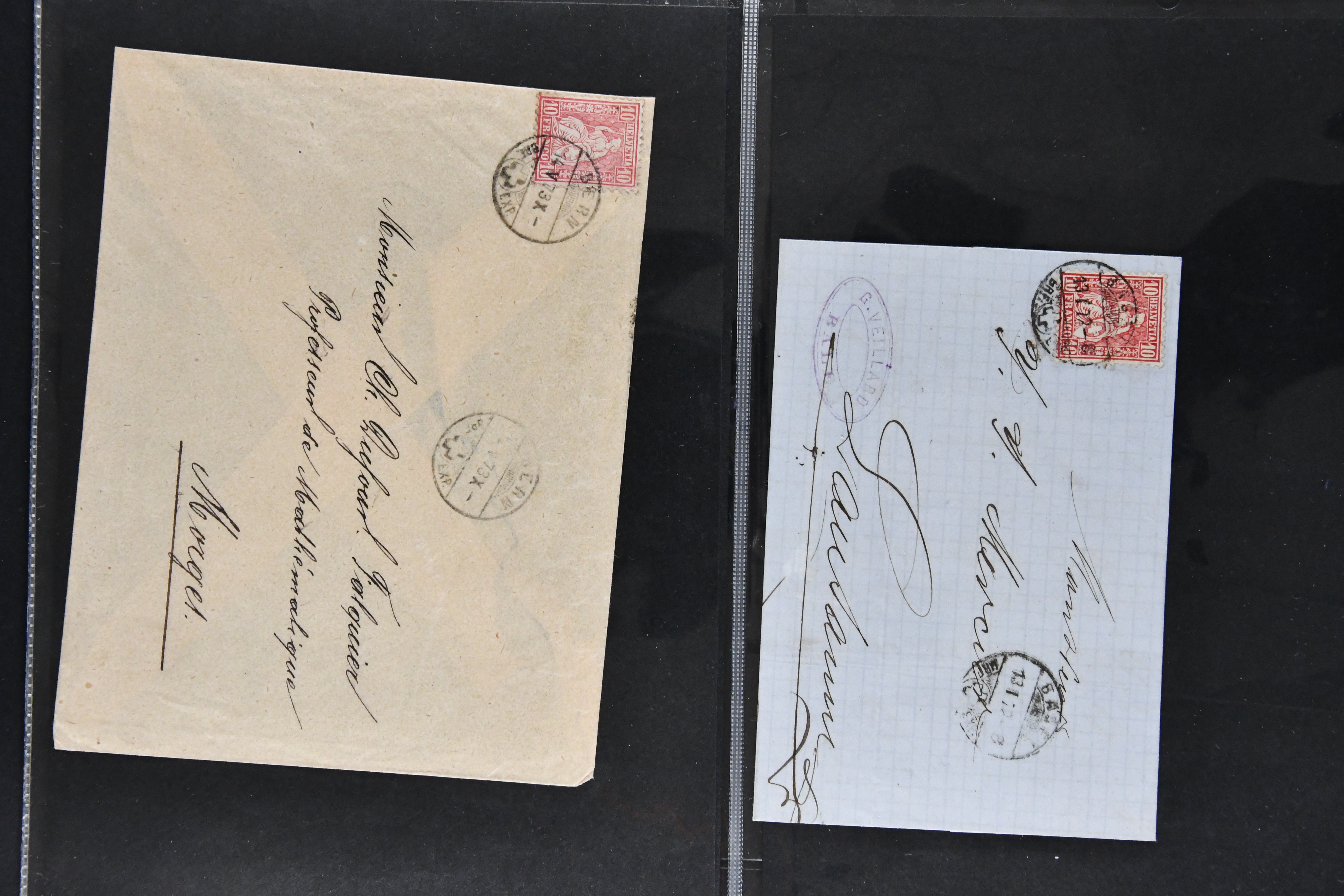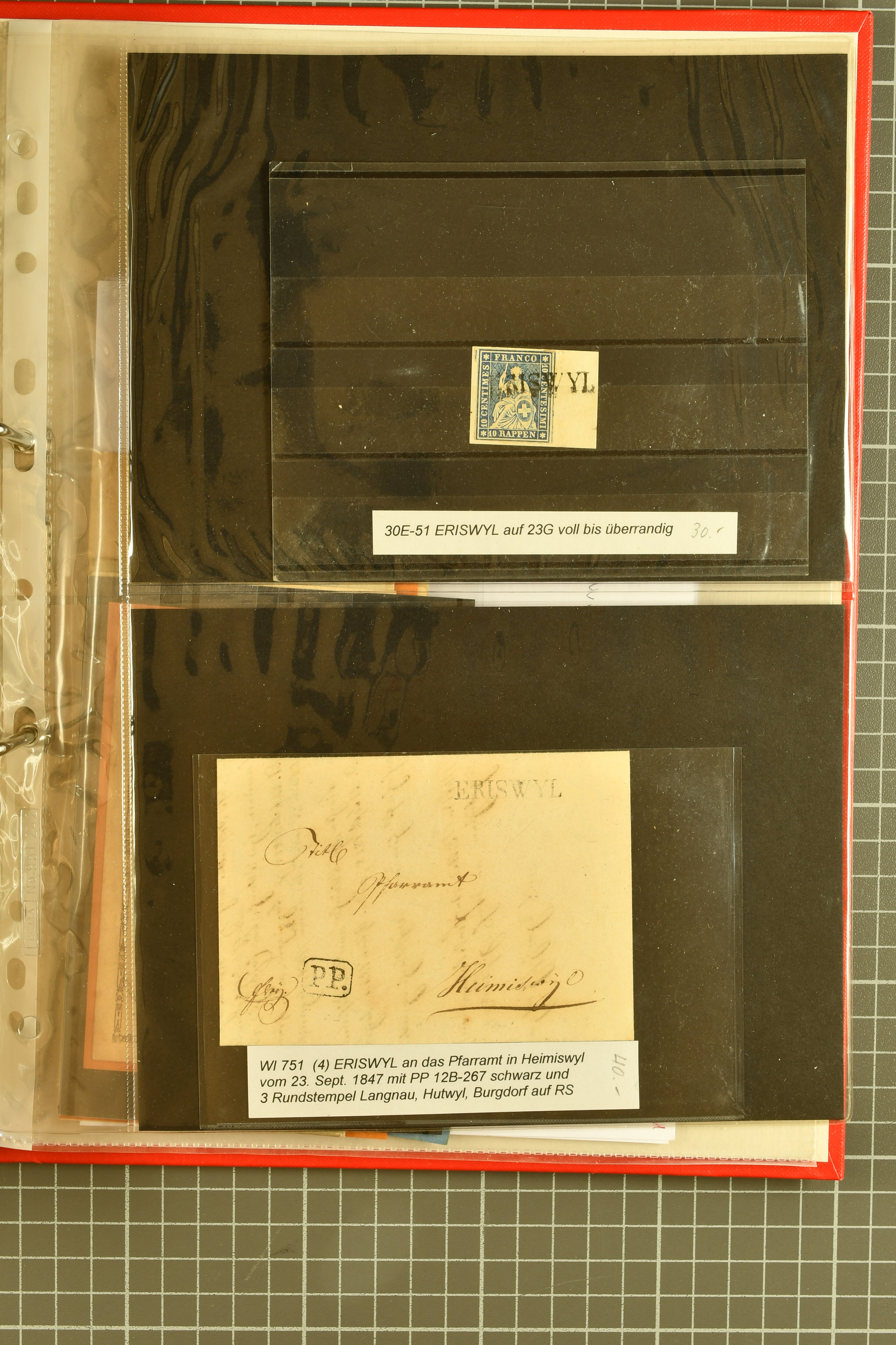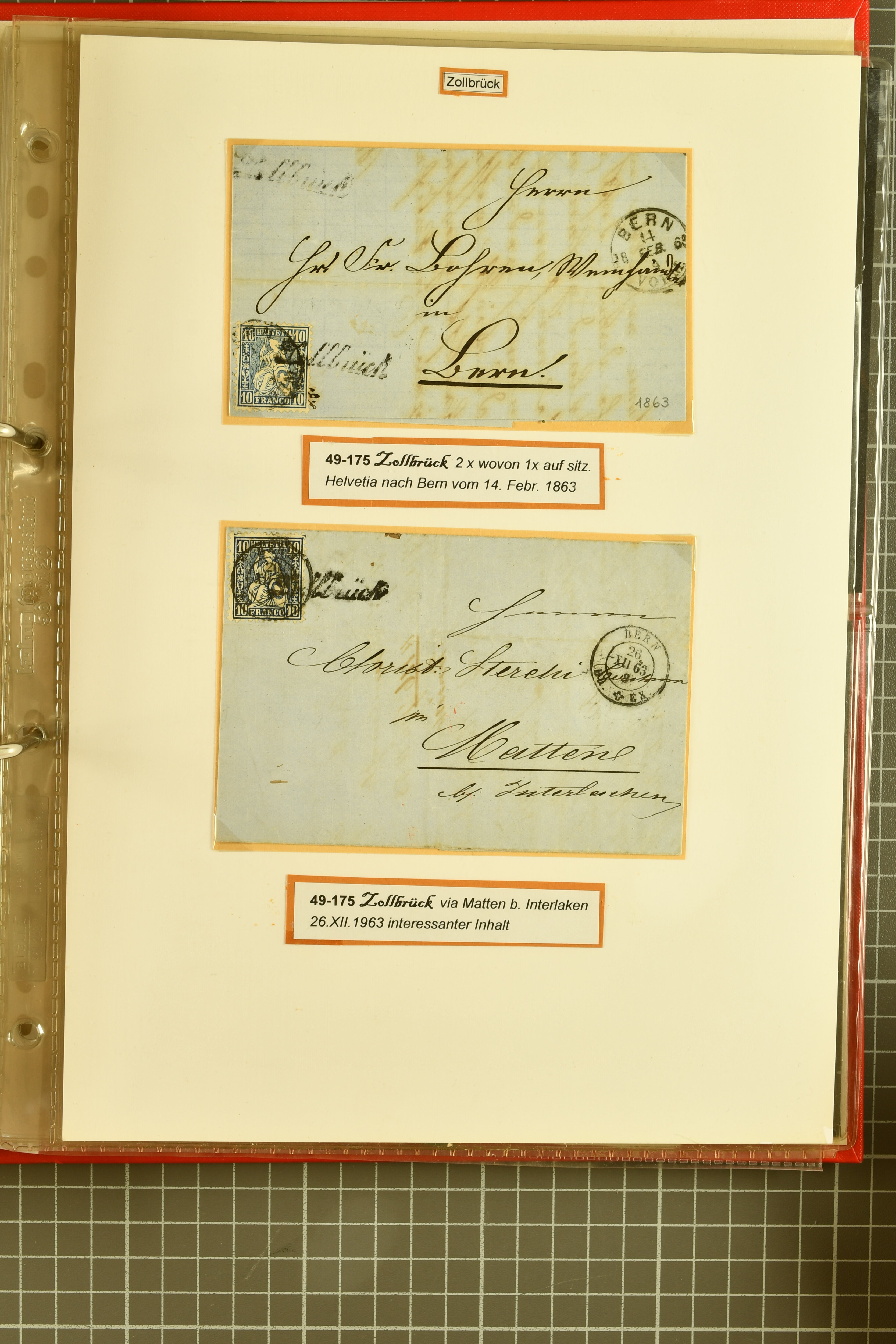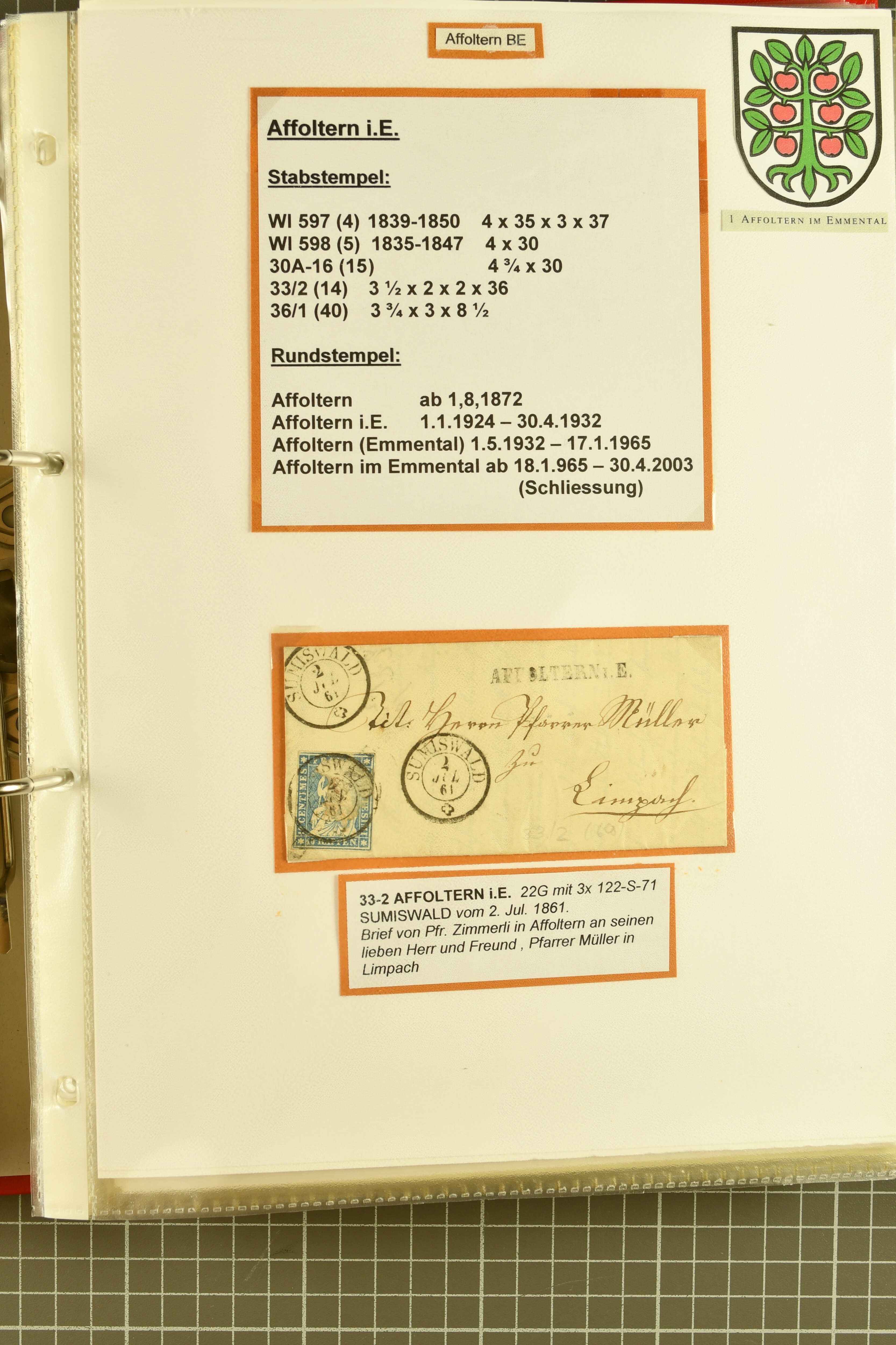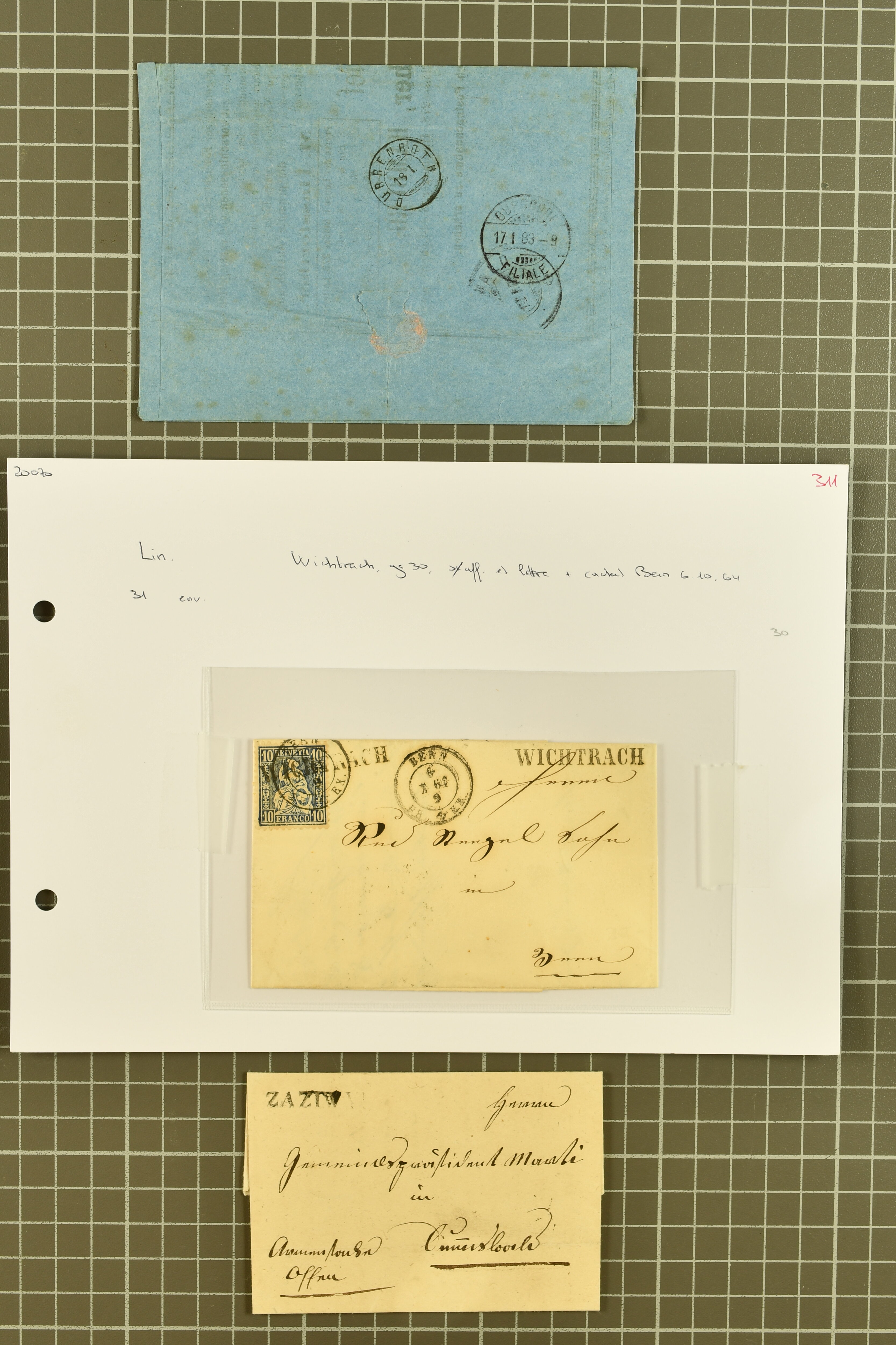 9862 image1834/1906ca.: Partie von Belegen aus Berner Ortschaften, aufgezogen auf Blättern, dabei ein Rayon-Brief von Lützelflüh, ferner ein Vorphilabrief und ein Brief ohne Marke. Je ein Vorphila- oder Brief ohne Marke aus Eriswil (2), Zäzwil (2) und Wichtrach (1); aus Dürrenroth ein Beleg mit 10 Rp. Sitzende Helvetia sowie zwei Briefe ohne Marke, beide mit Zwergstempel. Aus Sumiswald zwei Vorphilabriefe; aus Affoltern i. E. insgesamt 10 Belege, Vorphila und Markenbriefe, darunter auch ein Tüblibrief. Münsingen mit acht Marken und vier Belegen vertreten. Landiswil mit Stempel "LANDYSWYL" 10 Rp. Sitzende Helvetia rot einmal lose und einmal auf Brief. Aus "LUZELFLÜH" ein Vorphilabrief, aus Schlosswil drei Belege, Rubigen drei Belege, Oberthal fünf Belege, Arni bei Biglen mit Ganzsachenpostkarte sowie zwei lose 10 Rp. Sitzende Helvetia rot. Aus Trachselwald zehn Belege, darunter acht Vorphila/BoM (einer mit Zwergstempel) und zwei Ganzsachenpostkarten. Walterswil mit zwei Belegen, Waltringen mit einer Marke Stehende Helvetia 30 Rp. und einem Vorphilabrief, Walkringen mit zwei Vorphilabriefen, Zollbrück mit vier Belegen. Ergänzt durch 21 weitere Belege, teils von den genannten Ortschaften, sowie drei lose Werte. Mit dabei u. a. Zwergstempel von "GRÜNENMATT" (2) sowie "KIESEN" im Kästchen, beide auf Ganzsachenpostkarten (Image 1) (Image 2) (Image 3) (Image 4) (Image 5) (Image 6) (Image 7) (Image 8) (Image 9) (Image 10) (Image 11) (Image 12) (Image 13) (Image 14) (Image 15) (Image 16) (Image 17) (Image 18) (Image 19) (Image 20) (Image 21) (Image 22) (Image 23) (Image 24) (Image 25) (Image 26) (Image 27) (Image 28) (Image 29) (Image 30) (Image 31) (Image 32) (Image 33) (Image 34) (Image 35) (Image 36) (Image 37) (Image 38) (Image 39) (Image 40) (Image 41) (Image 42) (Image 43) (Image 44) (Image 45) (Image 46) (Image 47) (Image 48)