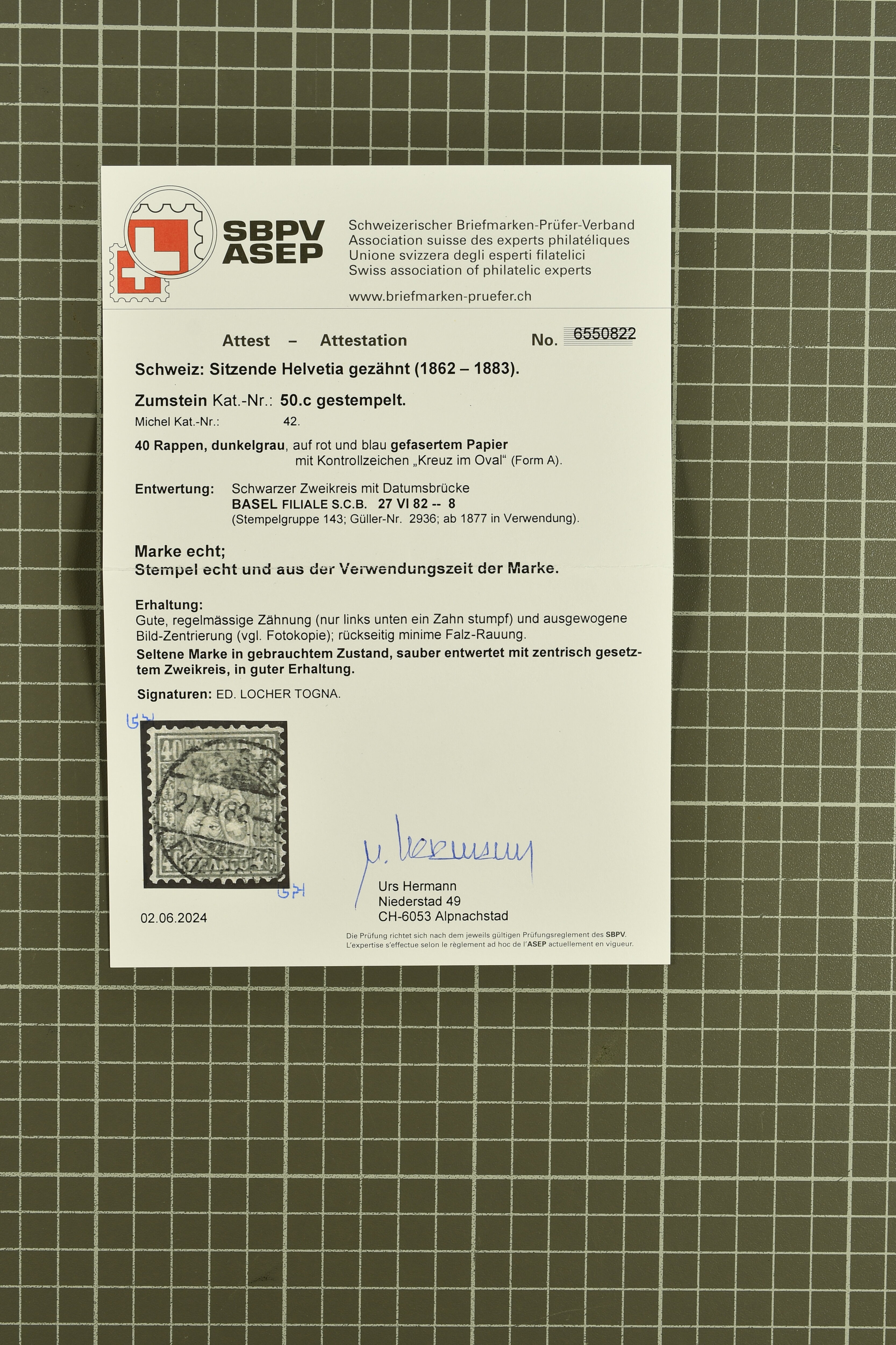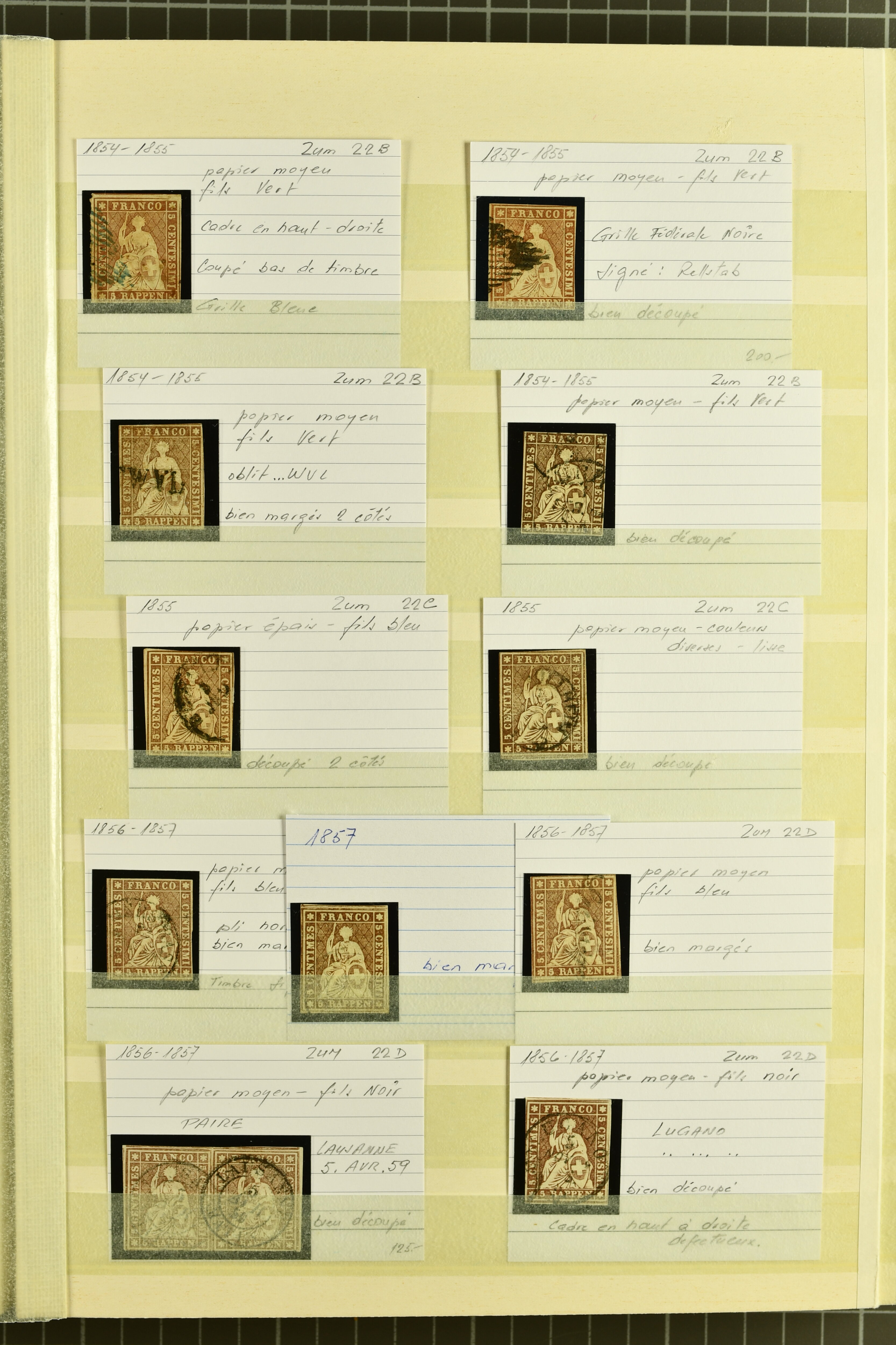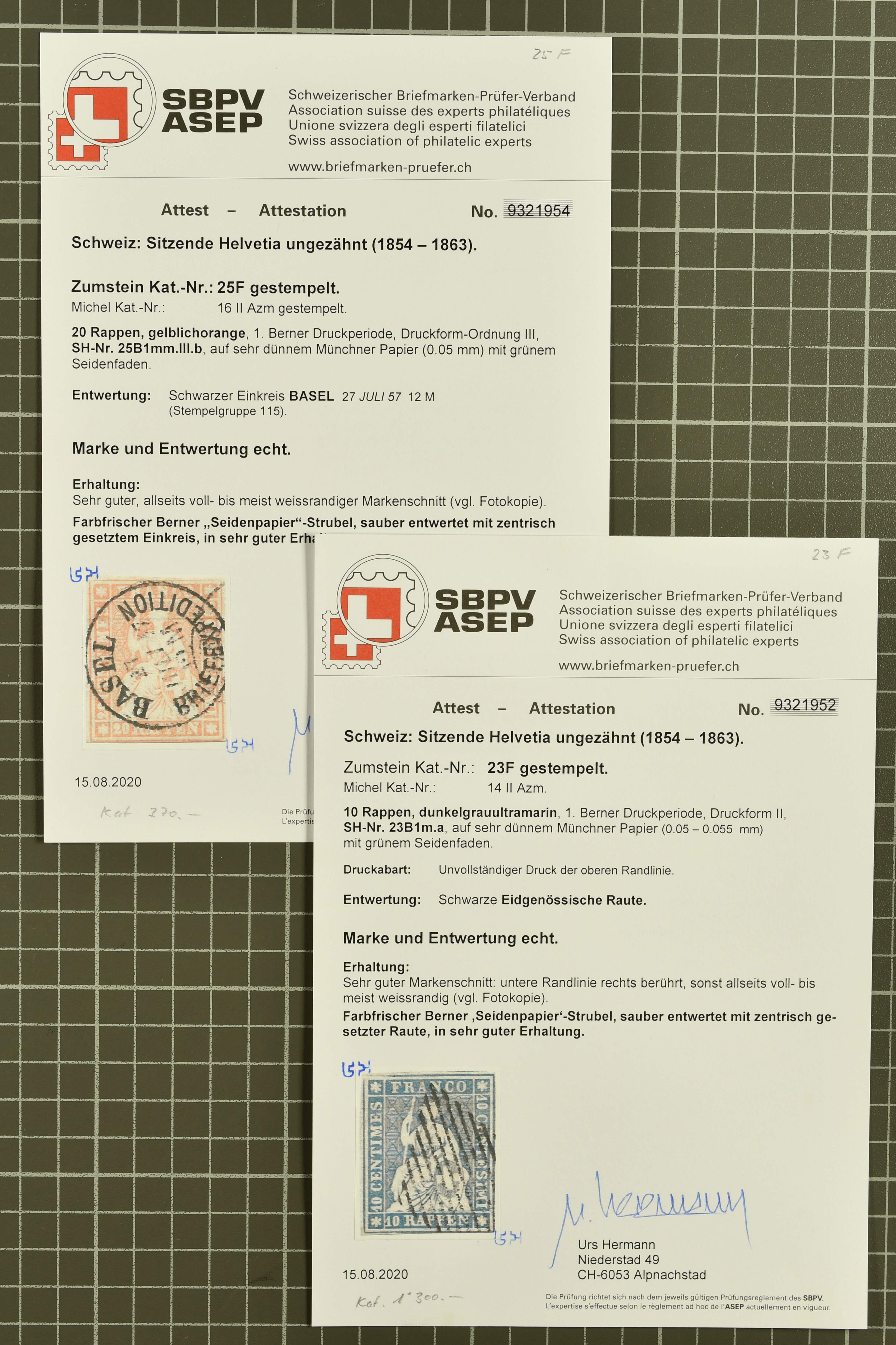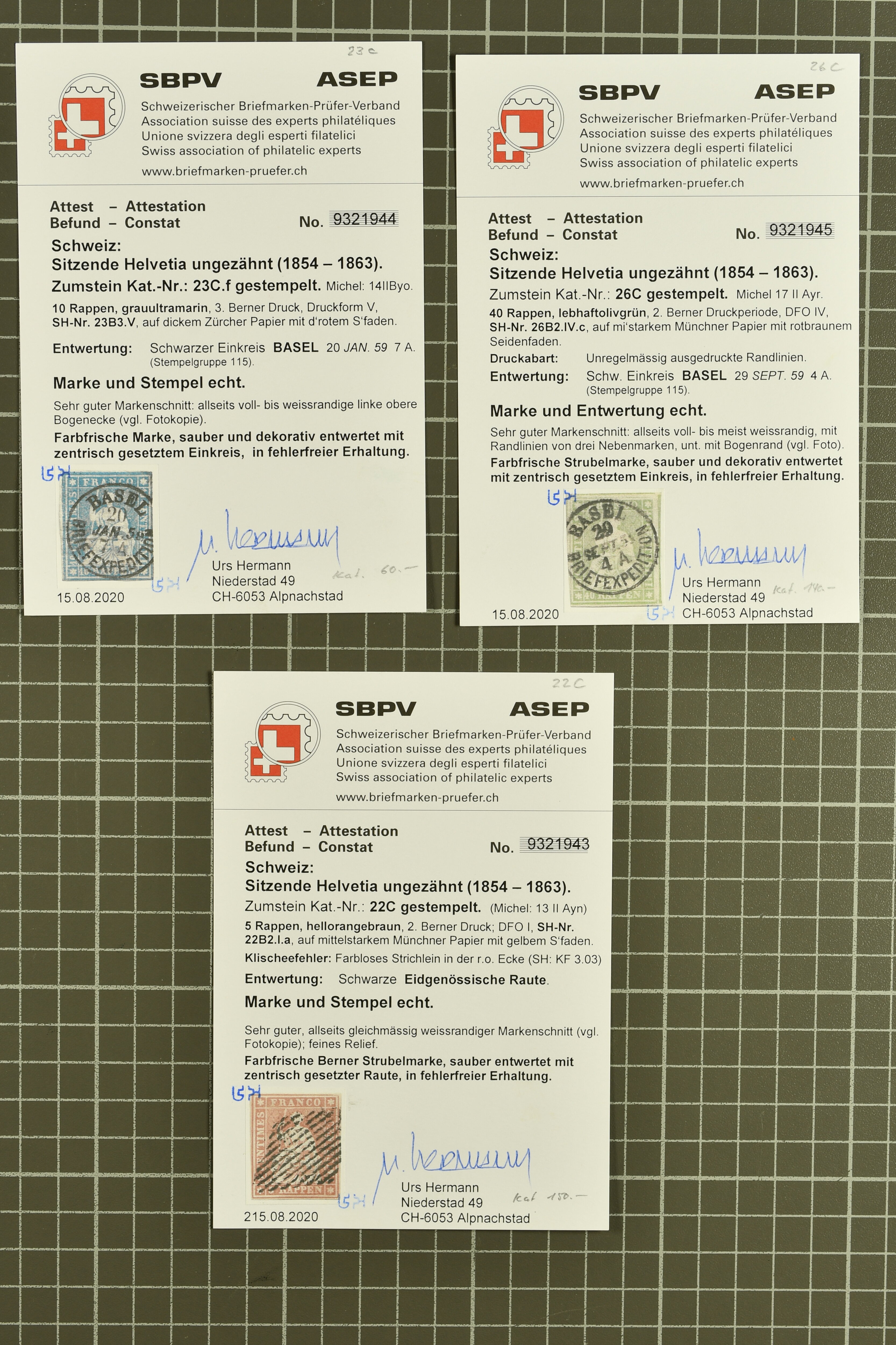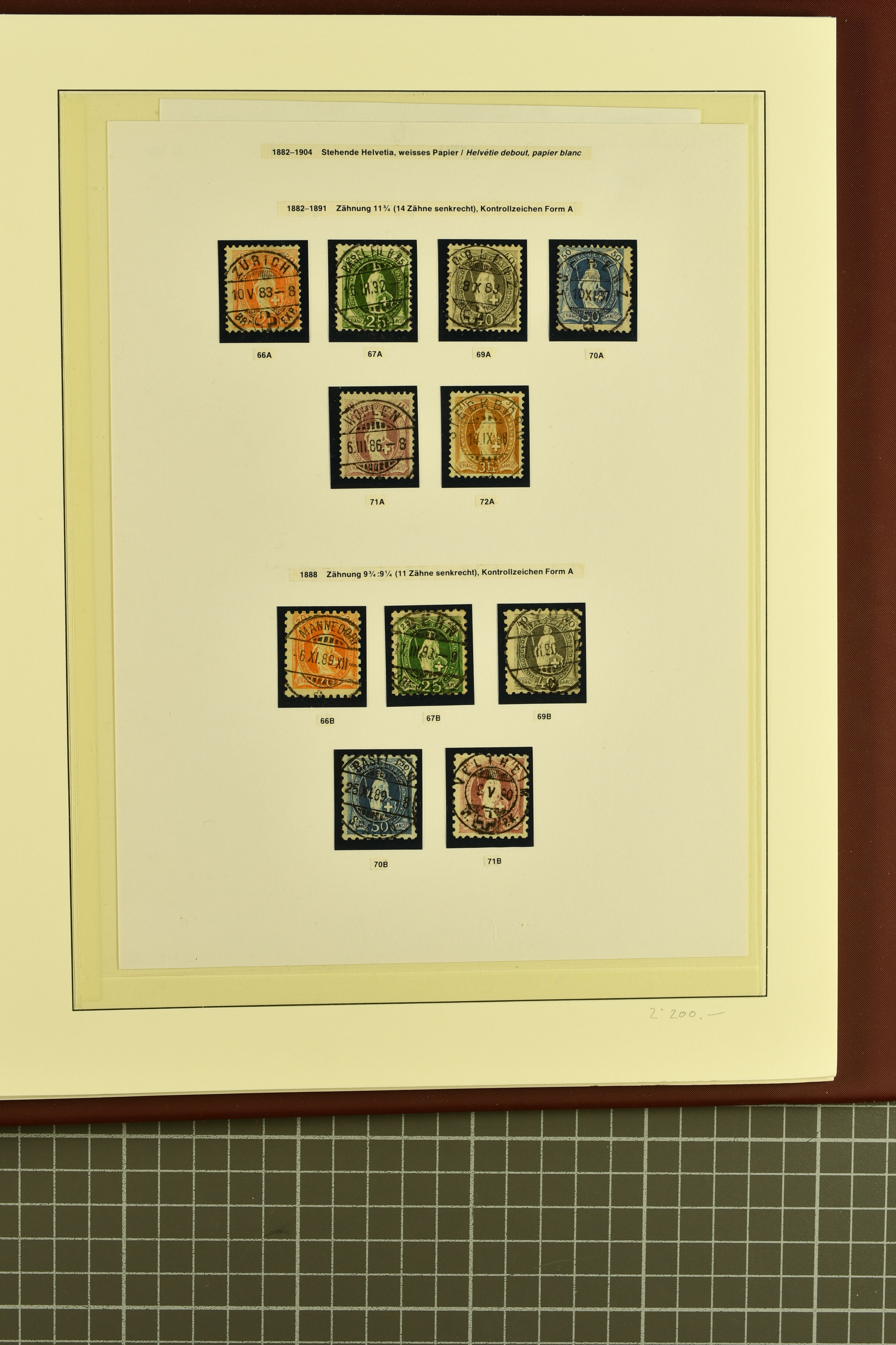 9852 image1850/1906: Umfangreiche Sammlung hunderter meist gestempelter Marken der Ausgaben Rayon I bis UPU 1900, sauber in zwei grossen Einsteckbüchern. Dabei Rayon I (3), Rayon II (14) und Rayon I hellblau (7) inkl. vereinzelten selteneren Drucksteinen und schönen Entwertungen, Rayon III kl. Wertziffer, Centimes und gr. Wertziffer (7), Strubel (130) mit besseren wie 5 Rp. braunorange (SBK 22Aa), 1 Fr. grau (SBK 27C/D, 2) oder 2 Rp. grau (SBK 21G), Sitzende Helvetia (210) mit allen Wertstufen mehrfach vorhanden inkl. einigen besseren Nuancen wie 1 Fr. goldbronze mit rötlichem Unterdruck (SBK 36a) oder 2 Rp. hellrotbraun (SBK 37a, 2) und einigen Werten bis 25 Rp. auf Faserpapier, Ziffermuster inkl. 5 Rp. hellbraunlila (SBK 54, 3), 10 Rp. hellrosa (SBK 55) und 15 Rp. gelb (SBK 57) auf weissem Papier, Stehende Helvetia (350) inkl. 50 Rp. blau (SBK 70B) und 1 Fr. lila (SBK 71B, 3) in der "groben" Zähnung 9¾:9¼, 3 Fr. hellbraun gez. 11½:11 auf Papier mit Wz. (SBK 92A, 3) oder 30 Rp. orangebraun gez. 11½:11 auf Papier mit Wz. (SBK 96B) sowie 40 Rp. grau (SBK 69E) schön diagonal entw. mit Stabstp. "LAUPEN" und UPU 1900 (50) inkl. 5 Rp. grün (SBK 77B) mit starkem rücks. Abklatsch. Meist gute Erhaltung; teils signiert, fünf Befunde, ein Attest. SBK=CHF 32'000 (n. Ang. d. Einl.) (Image 1) (Image 2) (Image 3) (Image 4) (Image 5) (Image 6) (Image 7) (Image 8) (Image 9) (Image 10) (Image 11) (Image 12) (Image 13) (Image 14) (Image 15) (Image 16) (Image 17) (Image 18) (Image 19) (Image 20) (Image 21) (Image 22) (Image 23) (Image 24) (Image 25) (Image 26) (Image 27) (Image 28) (Image 29) (Image 30) (Image 31) (Image 32) (Image 33) (Image 34) (Image 35) (Image 36) (Image 37) (Image 38) (Image 39) (Image 40) (Image 41) (Image 42) (Image 43) (Image 44) (Image 45) (Image 46) (Image 47) (Image 48) (Image 49) (Image 50)