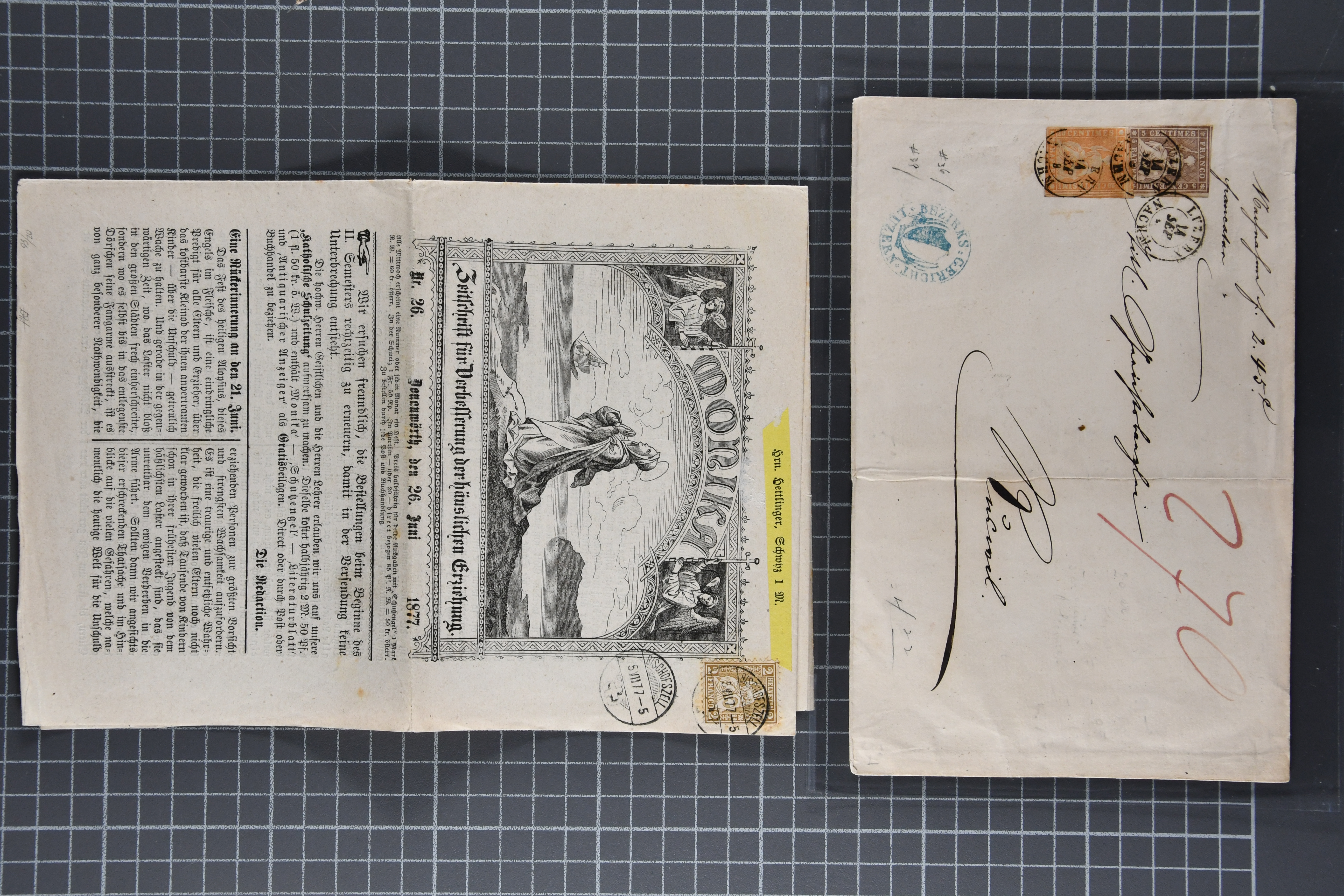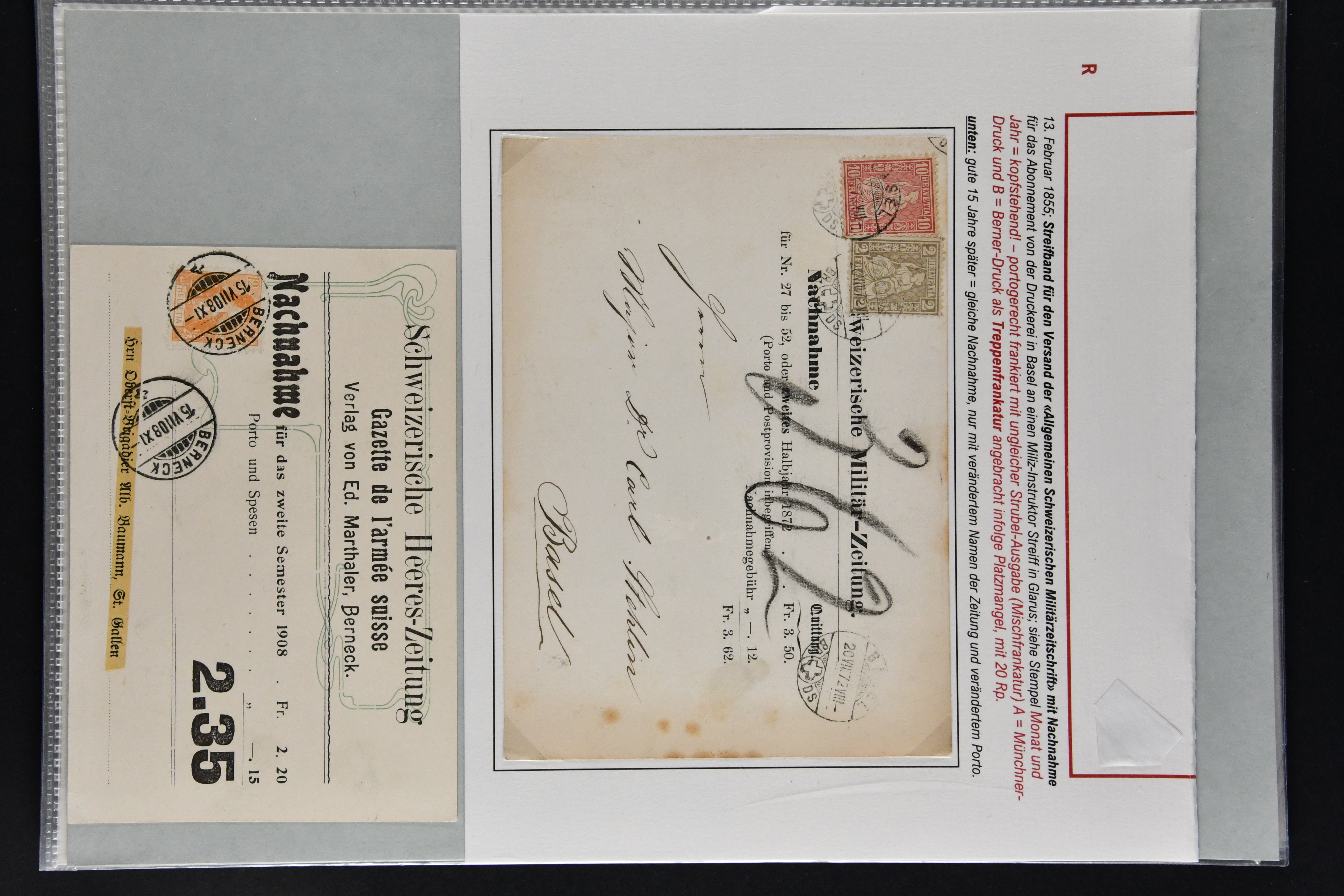 9854 cover image1858/80: Interessantes Los fünf Belege, dabei 1858 Nachnahme LUZERN nach Ruswil mit Strubel 5 Rp. braun & 20 Rp. orange, 1864 Nachnahme BÜTZBERG über LANGENTHAL nach BERN mit Sitzender 30 Rp. rot, 1877 Zeitschrift 'Monika' für die Verbesserung der häuslichen Erziehung mit klerikalen Darstellungen, frankiert mit 2 Rp. oliv von BISCHOFSZELL nach Schwyz, 1879 Nachnahme-Karte mit 2 Rp. oliv & 10 Rp. rot entw. mit Bahnpoststp. von ZÜRICH nach Kloten, sowie 1880 Einschreiben mit 10 Rp. rot & 20 Rp. orange von ENTLEBUCH nach Luzern. Ein interessantes Los mit kleinen Fehlern (Image 1) (Image 2)