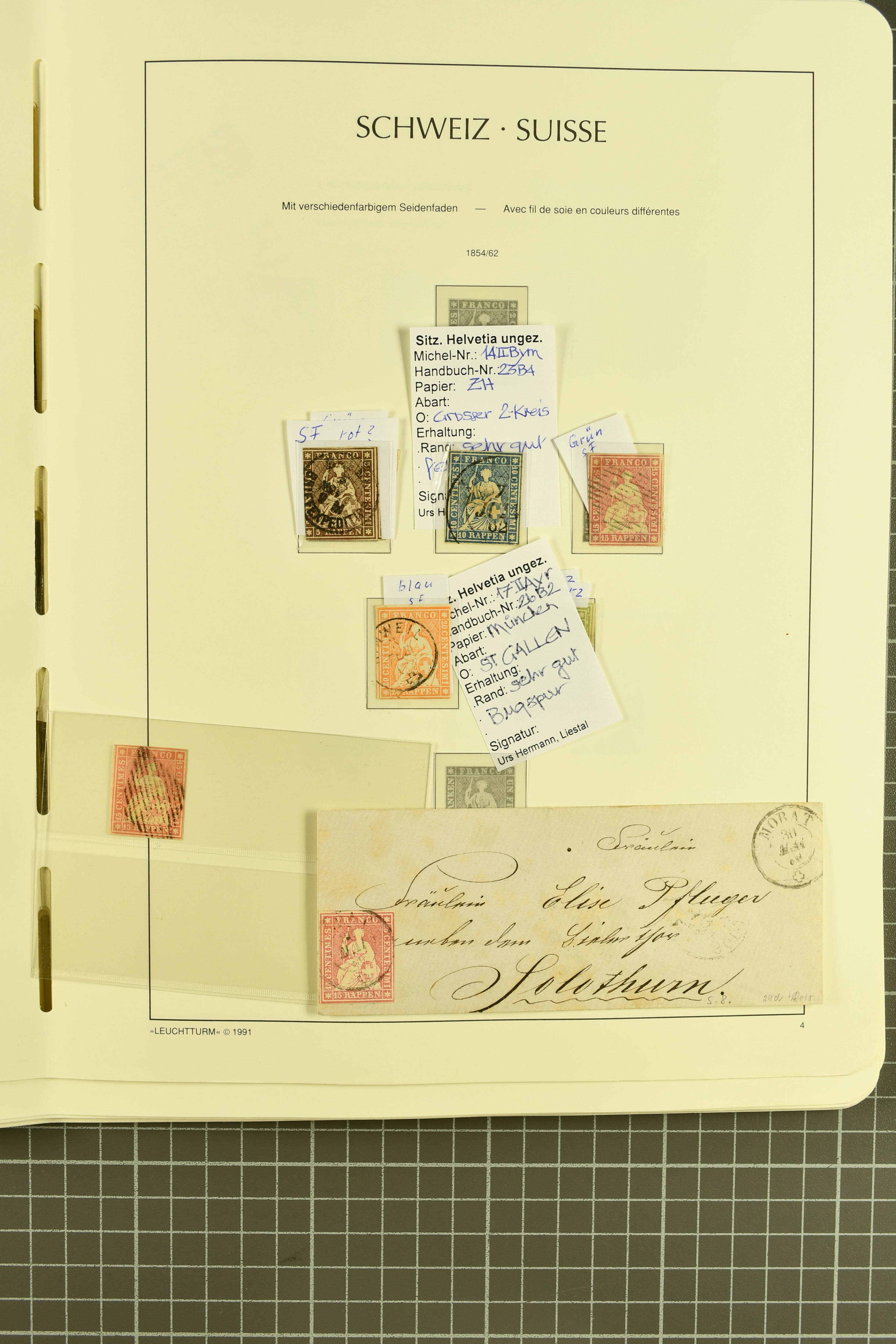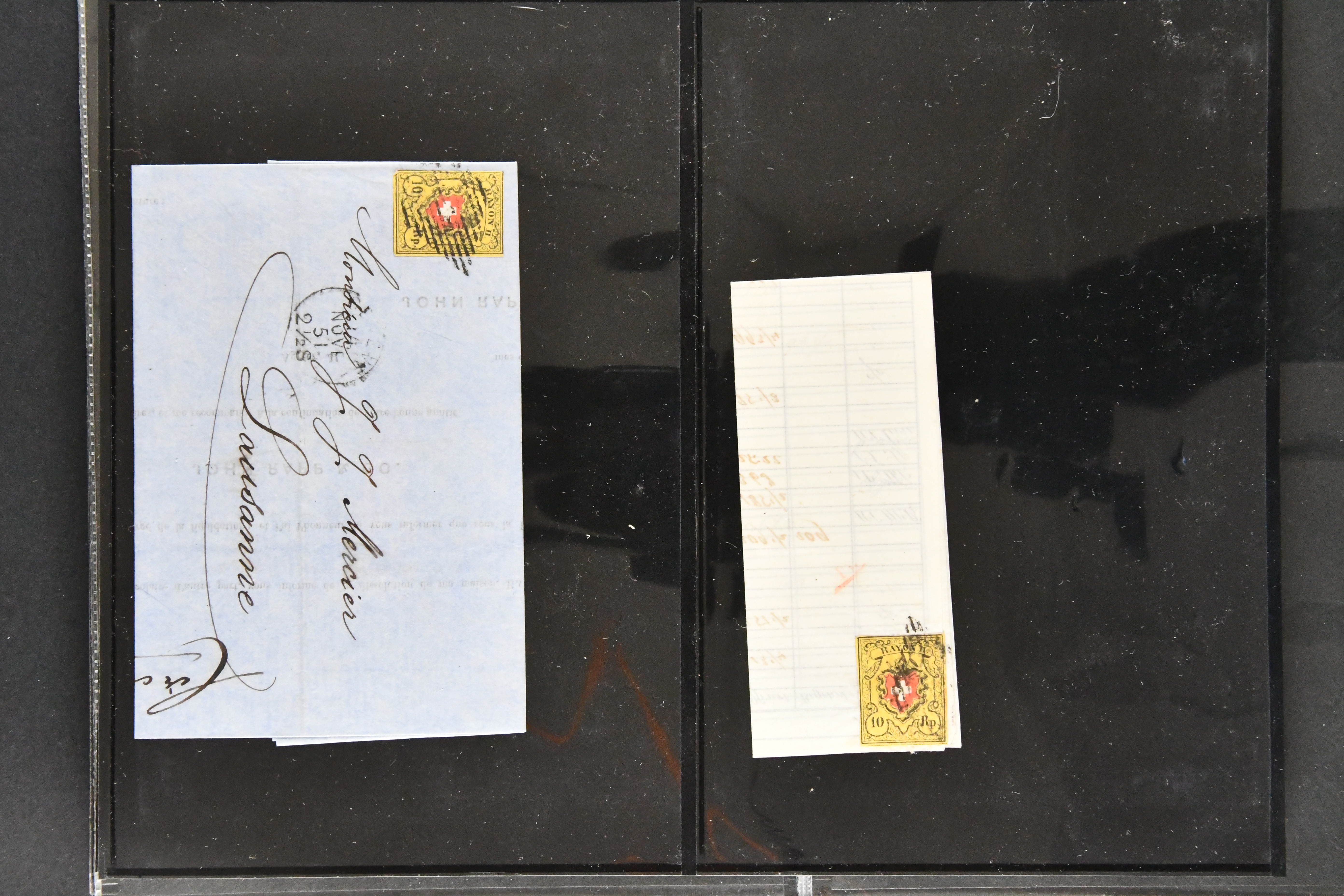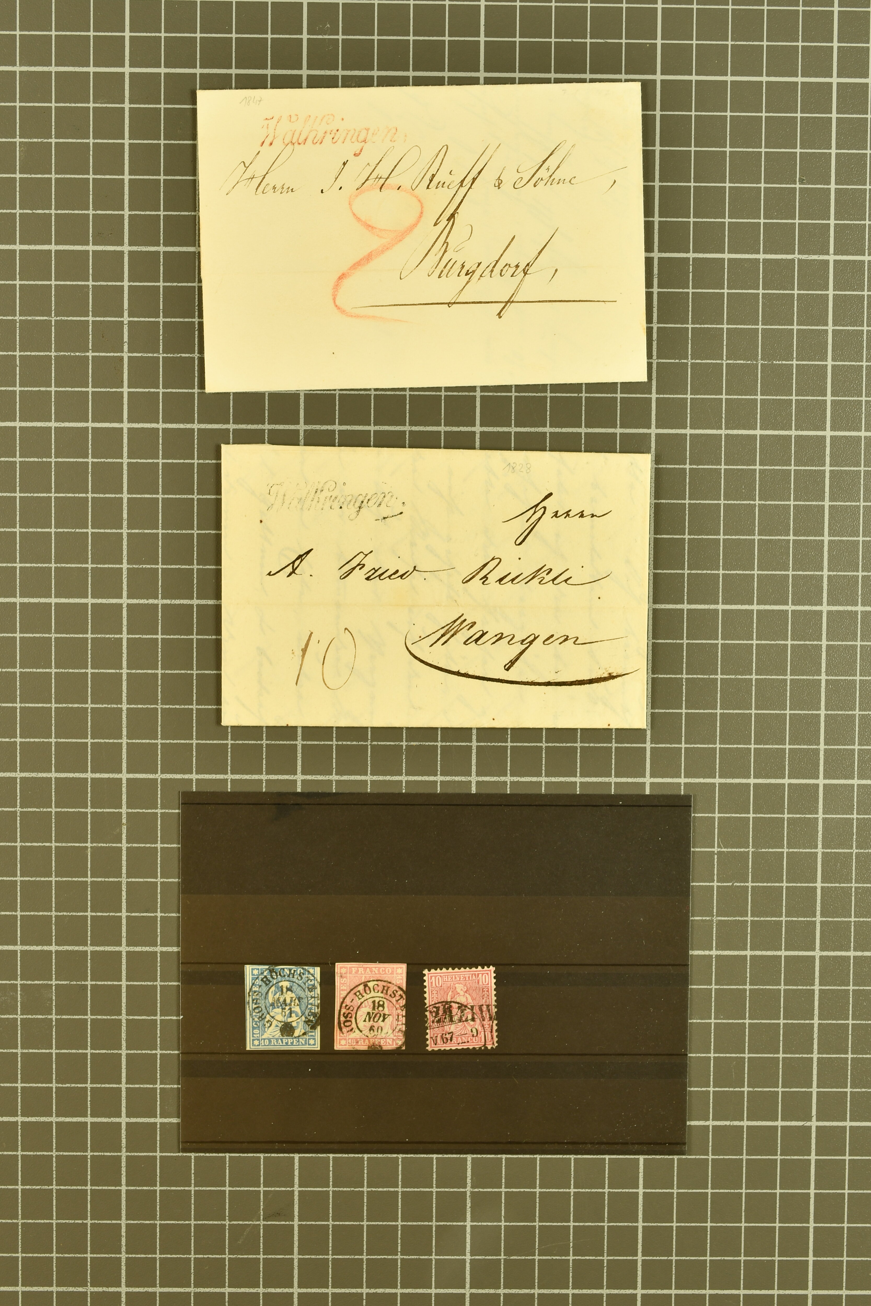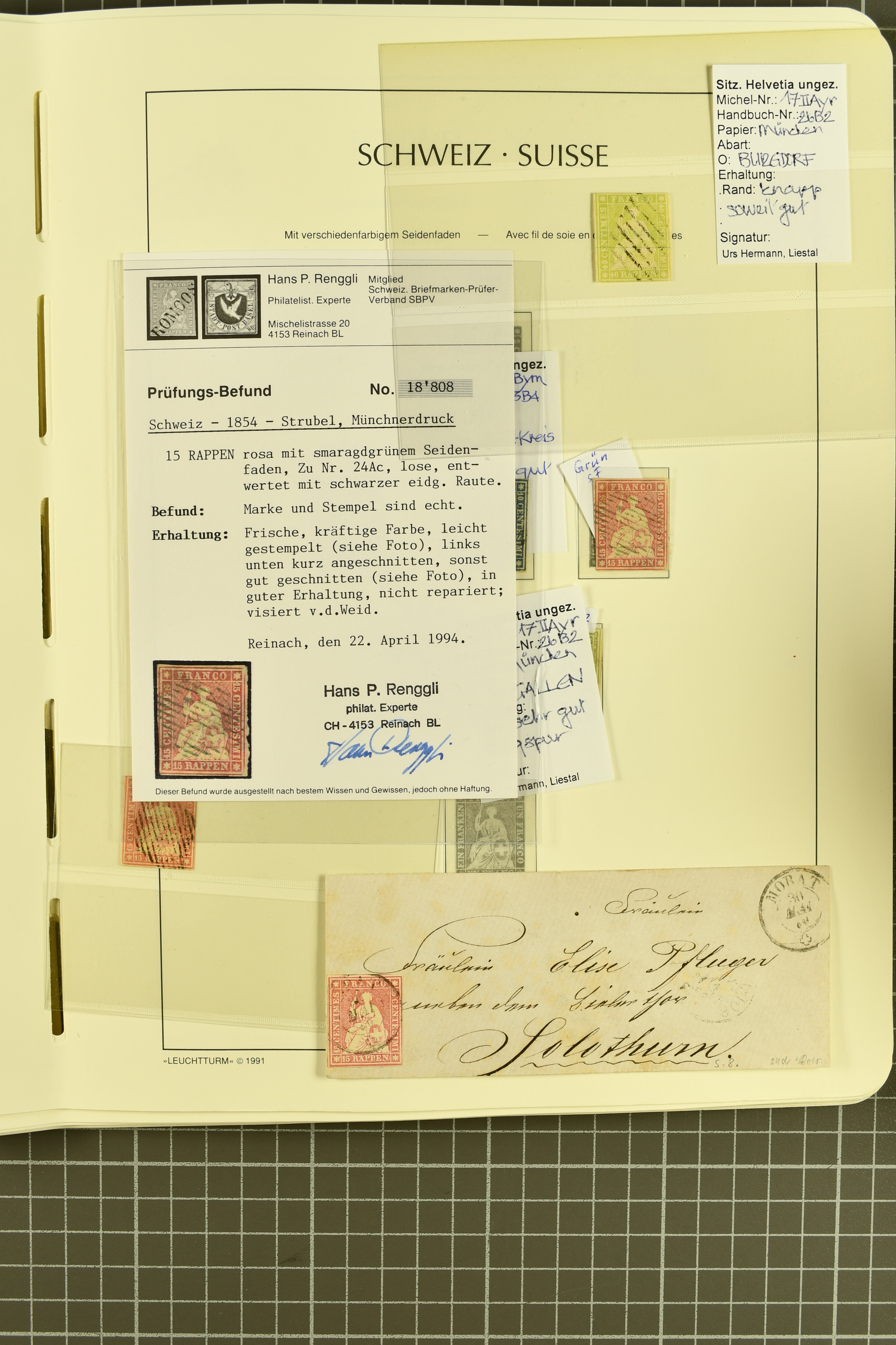 9860 image1843/1887: Attraktives Restlot ab Vorphila - 3 Briefe von "RHEINECK" je mit Zweikreis-Datumstempel, 1x 1843 nach Montmirail und 1851 n. Rorschach, 1853 n. 'Rapperswyl'. Brief von "THAL" via Rheineck und Sevelen. Balkenstempel "Zollbrück" auf Vorphila und auf Markenbrief mit 2x 5 Rp. Sitzende Helvetia. "Waltrigen" auf Brief ohne Marken 1858 n. und 2 Briefe mit Sitz. Helvetia "Waltringen" als Nebenstempel. Kleiner Brief mit 20 Rp. Sitz. Helvetia von "ARNI" nach Blankenburg. Zwei "ORDRE DE MARCHE" je mit Stempel intituliert 'FÈTE NATIONALE 1 Mars' 1x 1887 und 1x offenbar unverwendet, da nicht fertig ausgefüllt. Dazu 2 Steckkarten mit losen Durheimausgaben (9) und Strubel-Marken (16) darunter 15 Rp. Rayon III mit attraktivem Tinten-Gitter, mit Eckbüglein l.o., hierfür Attest Hermann (Image 1) (Image 2) (Image 3)