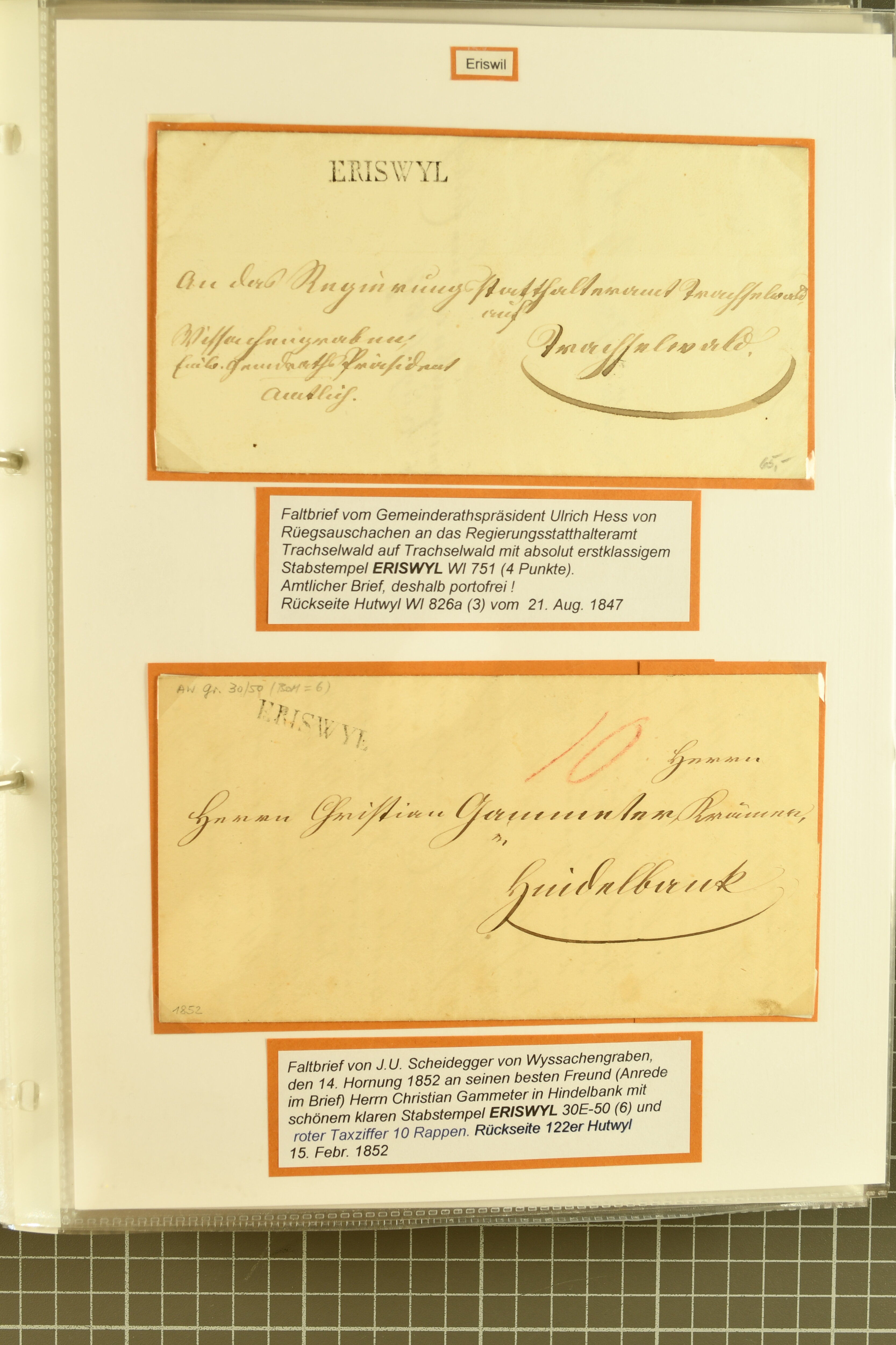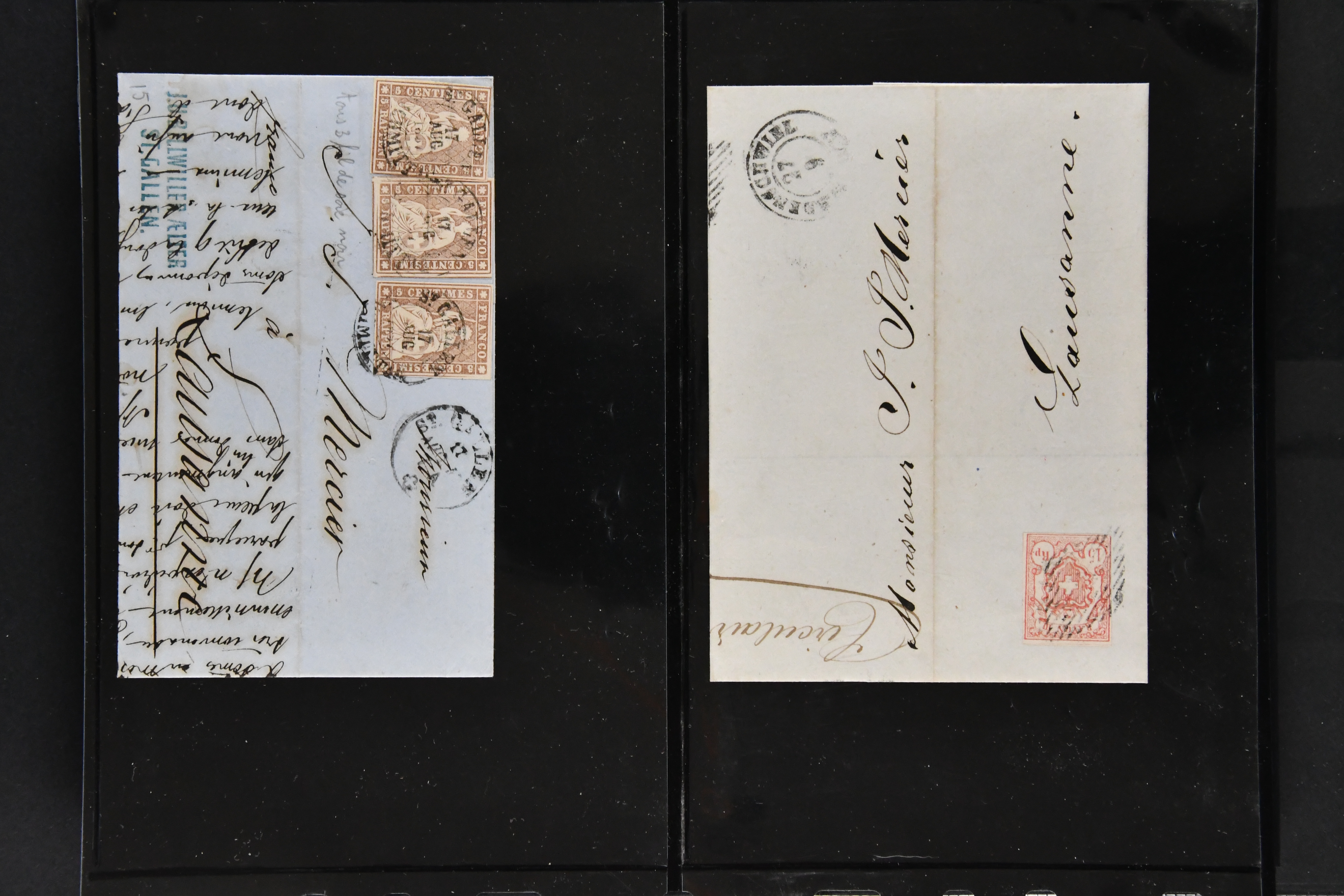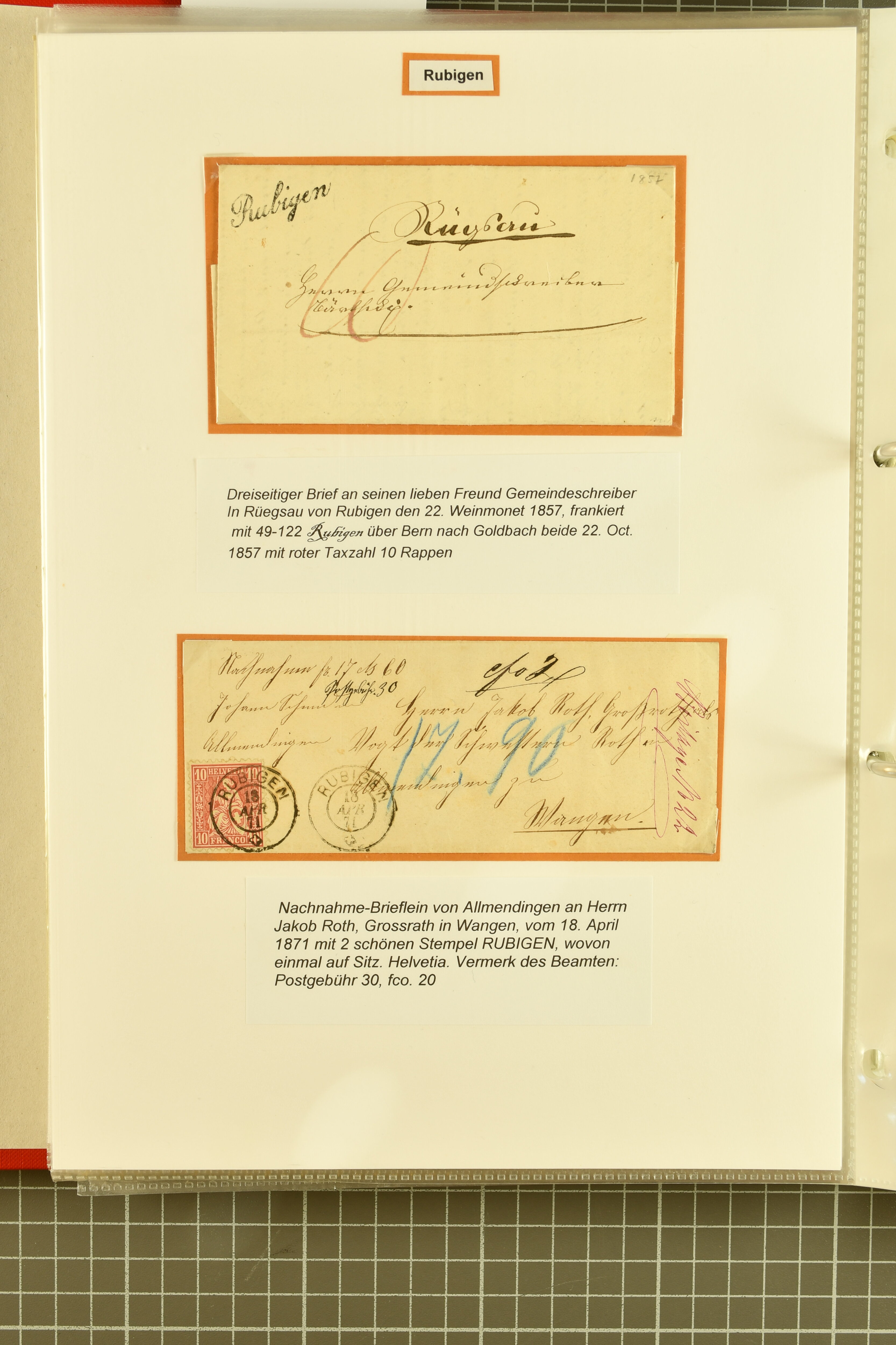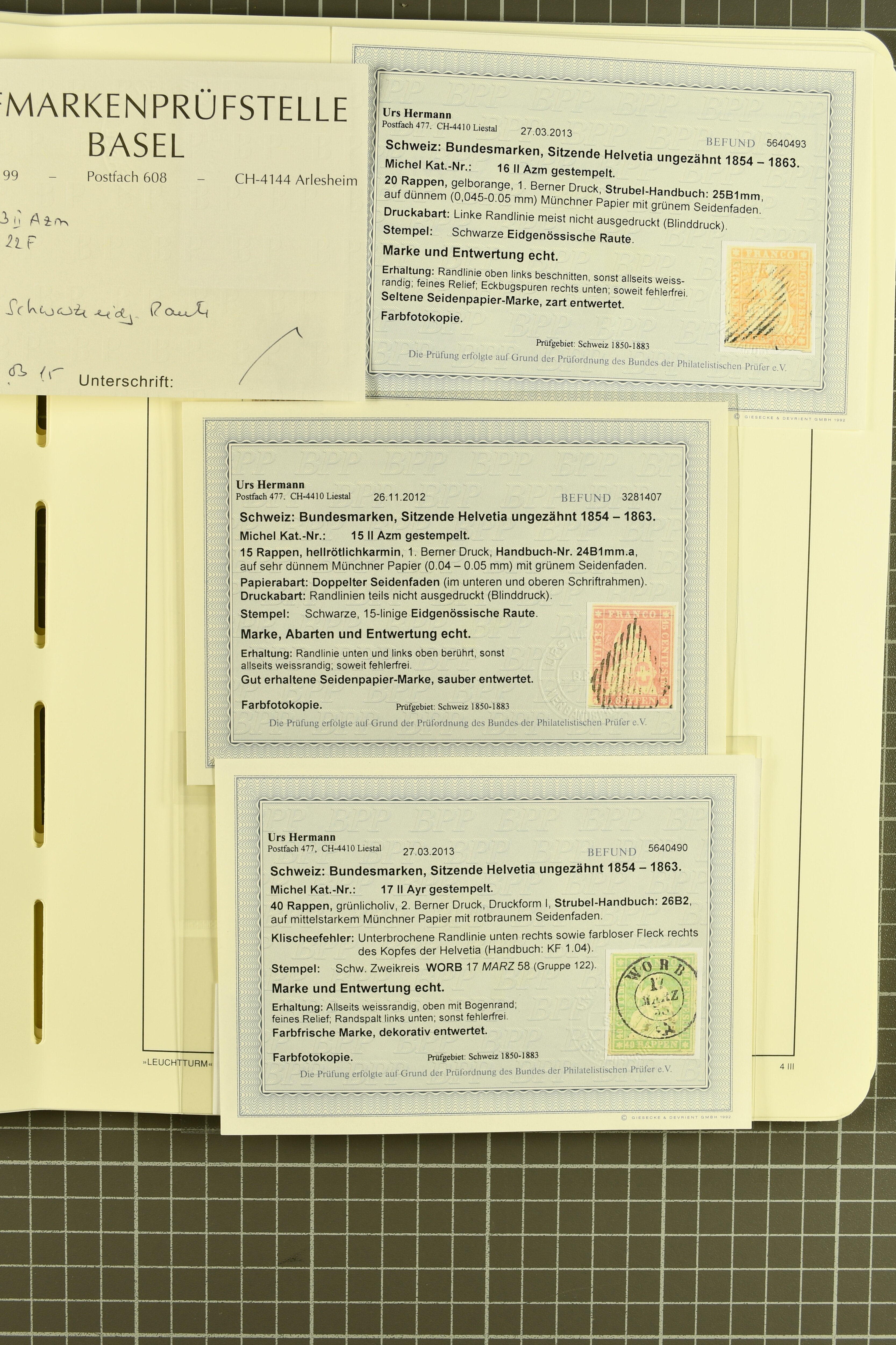 9860 image1843/1887: Attraktives Restlot ab Vorphila - 3 Briefe von "RHEINECK" je mit Zweikreis-Datumstempel, 1x 1843 nach Montmirail und 1851 n. Rorschach, 1853 n. 'Rapperswyl'. Brief von "THAL" via Rheineck und Sevelen. Balkenstempel "Zollbrück" auf Vorphila und auf Markenbrief mit 2x 5 Rp. Sitzende Helvetia. "Waltrigen" auf Brief ohne Marken 1858 n. und 2 Briefe mit Sitz. Helvetia "Waltringen" als Nebenstempel. Kleiner Brief mit 20 Rp. Sitz. Helvetia von "ARNI" nach Blankenburg. Zwei "ORDRE DE MARCHE" je mit Stempel intituliert 'FÈTE NATIONALE 1 Mars' 1x 1887 und 1x offenbar unverwendet, da nicht fertig ausgefüllt. Dazu 2 Steckkarten mit losen Durheimausgaben (9) und Strubel-Marken (16) darunter 15 Rp. Rayon III mit attraktivem Tinten-Gitter, mit Eckbüglein l.o., hierfür Attest Hermann (Image 1) (Image 2) (Image 3)