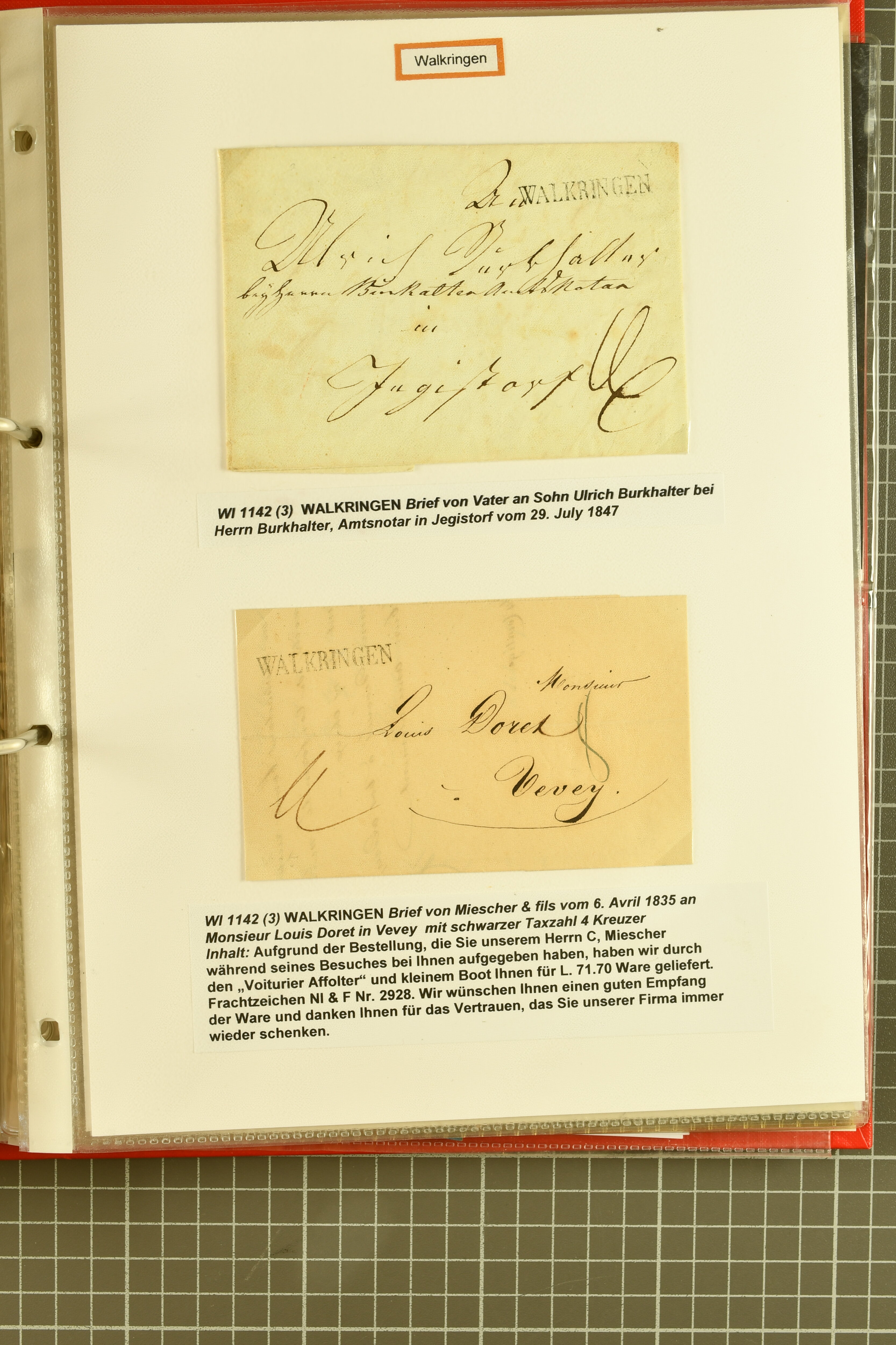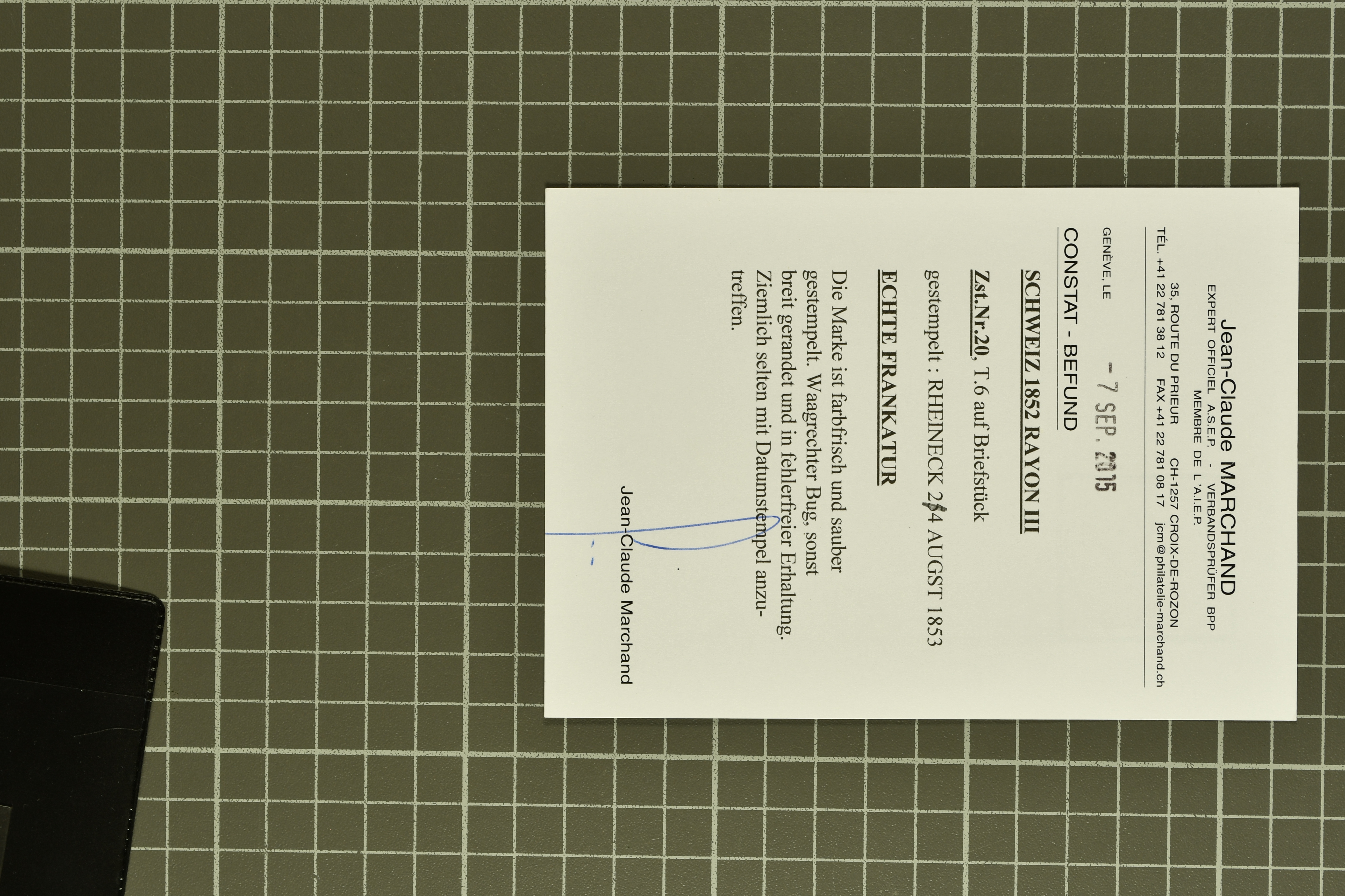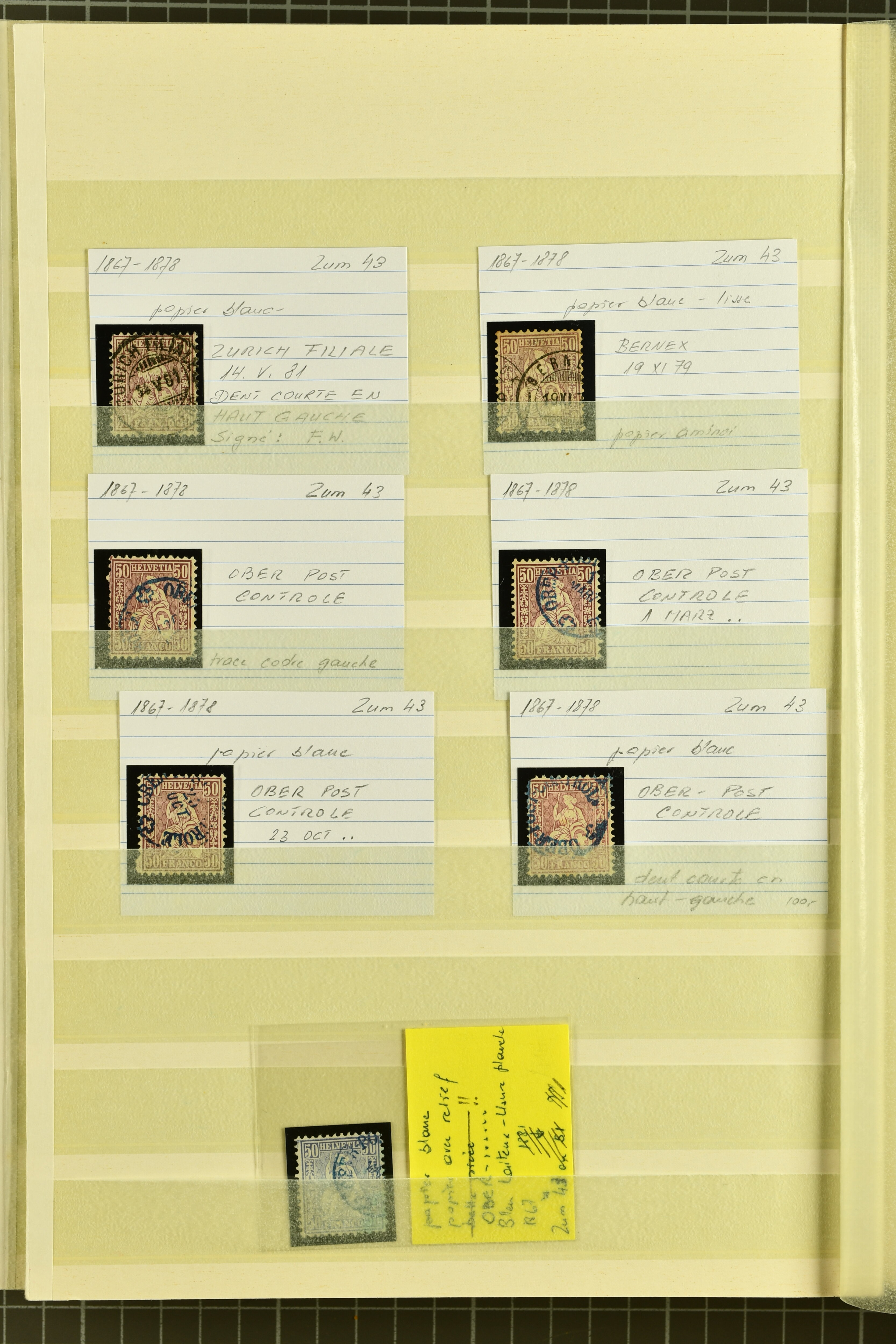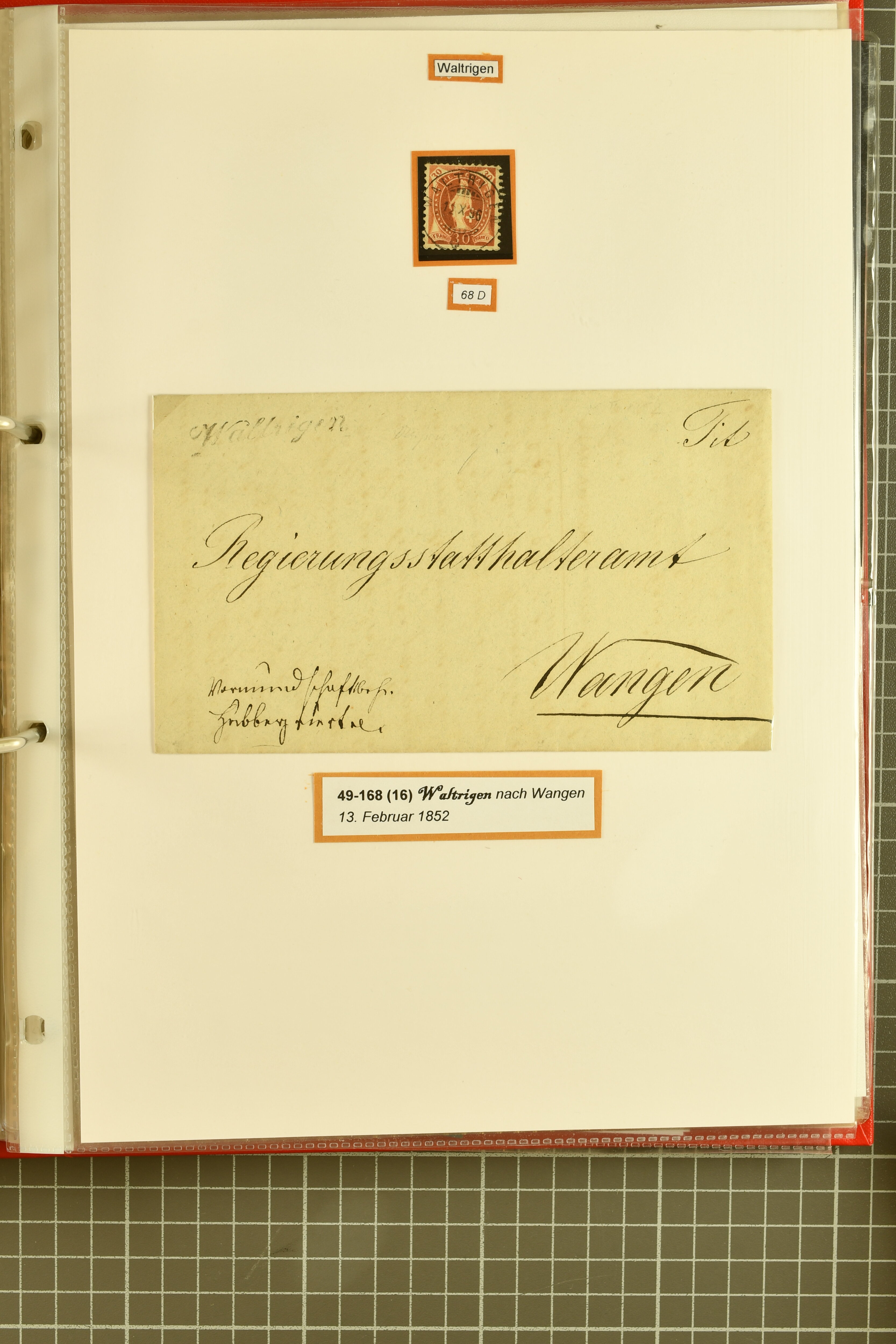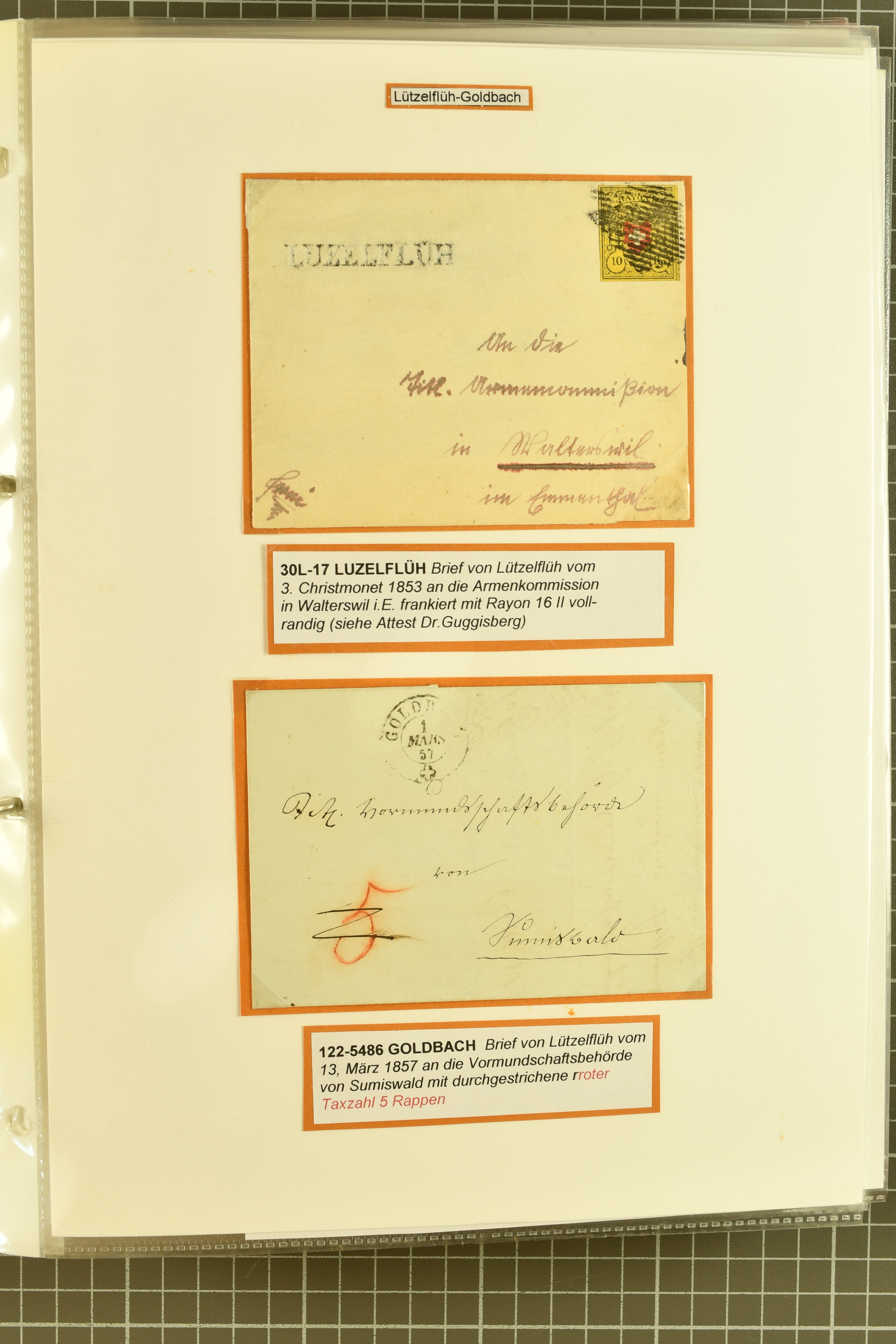 9860 image1843/1887: Attraktives Restlot ab Vorphila - 3 Briefe von "RHEINECK" je mit Zweikreis-Datumstempel, 1x 1843 nach Montmirail und 1851 n. Rorschach, 1853 n. 'Rapperswyl'. Brief von "THAL" via Rheineck und Sevelen. Balkenstempel "Zollbrück" auf Vorphila und auf Markenbrief mit 2x 5 Rp. Sitzende Helvetia. "Waltrigen" auf Brief ohne Marken 1858 n. und 2 Briefe mit Sitz. Helvetia "Waltringen" als Nebenstempel. Kleiner Brief mit 20 Rp. Sitz. Helvetia von "ARNI" nach Blankenburg. Zwei "ORDRE DE MARCHE" je mit Stempel intituliert 'FÈTE NATIONALE 1 Mars' 1x 1887 und 1x offenbar unverwendet, da nicht fertig ausgefüllt. Dazu 2 Steckkarten mit losen Durheimausgaben (9) und Strubel-Marken (16) darunter 15 Rp. Rayon III mit attraktivem Tinten-Gitter, mit Eckbüglein l.o., hierfür Attest Hermann (Image 1) (Image 2) (Image 3)