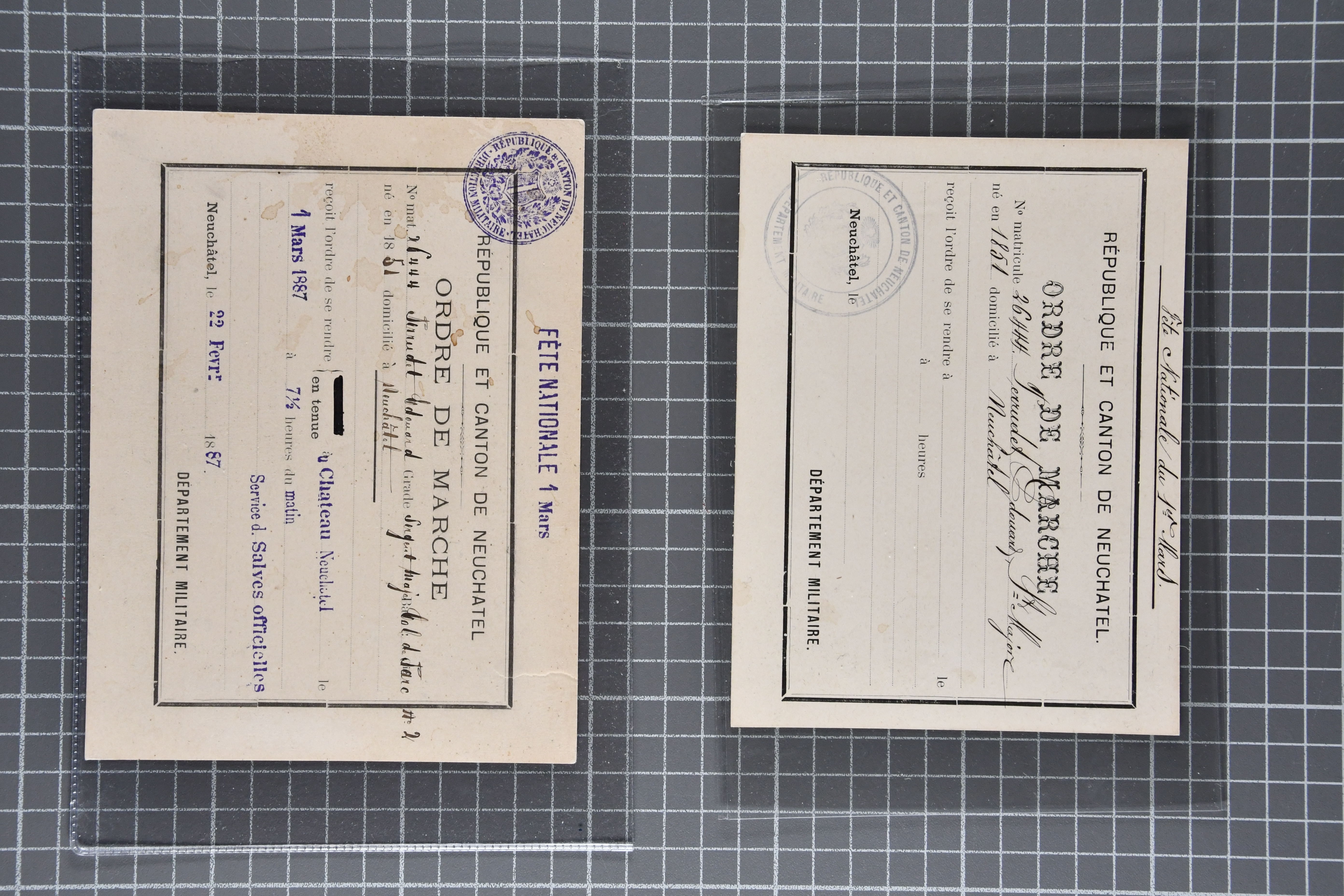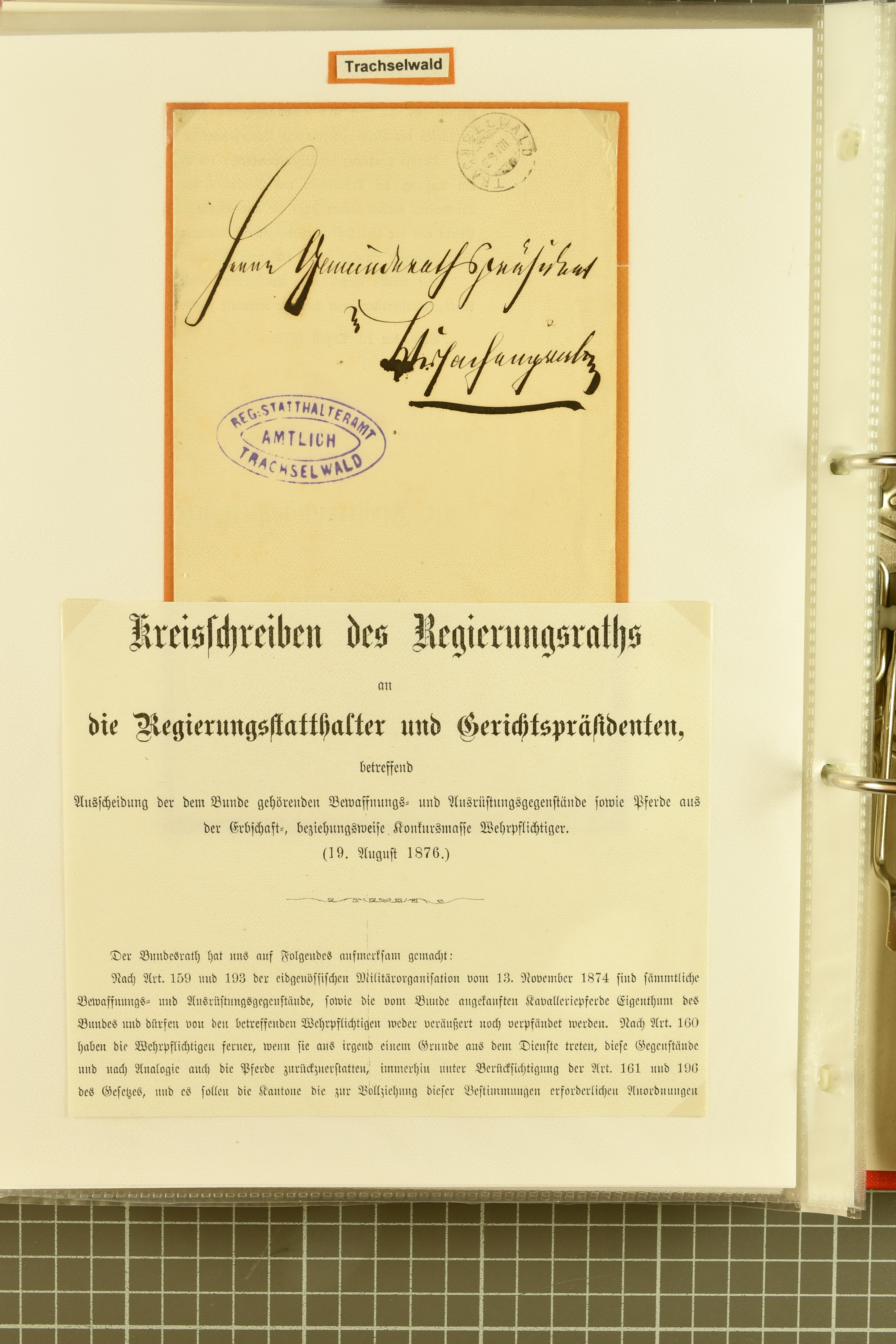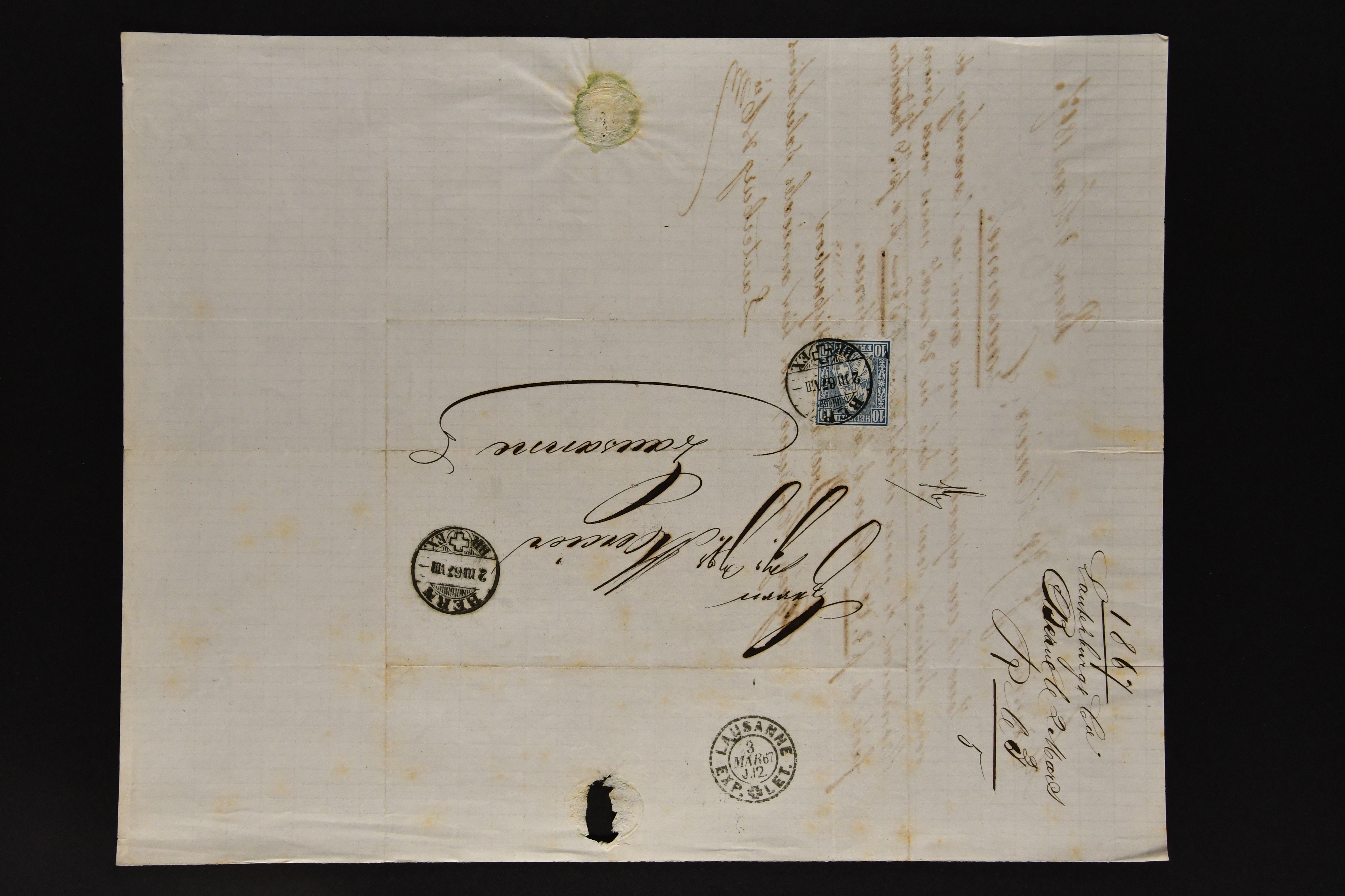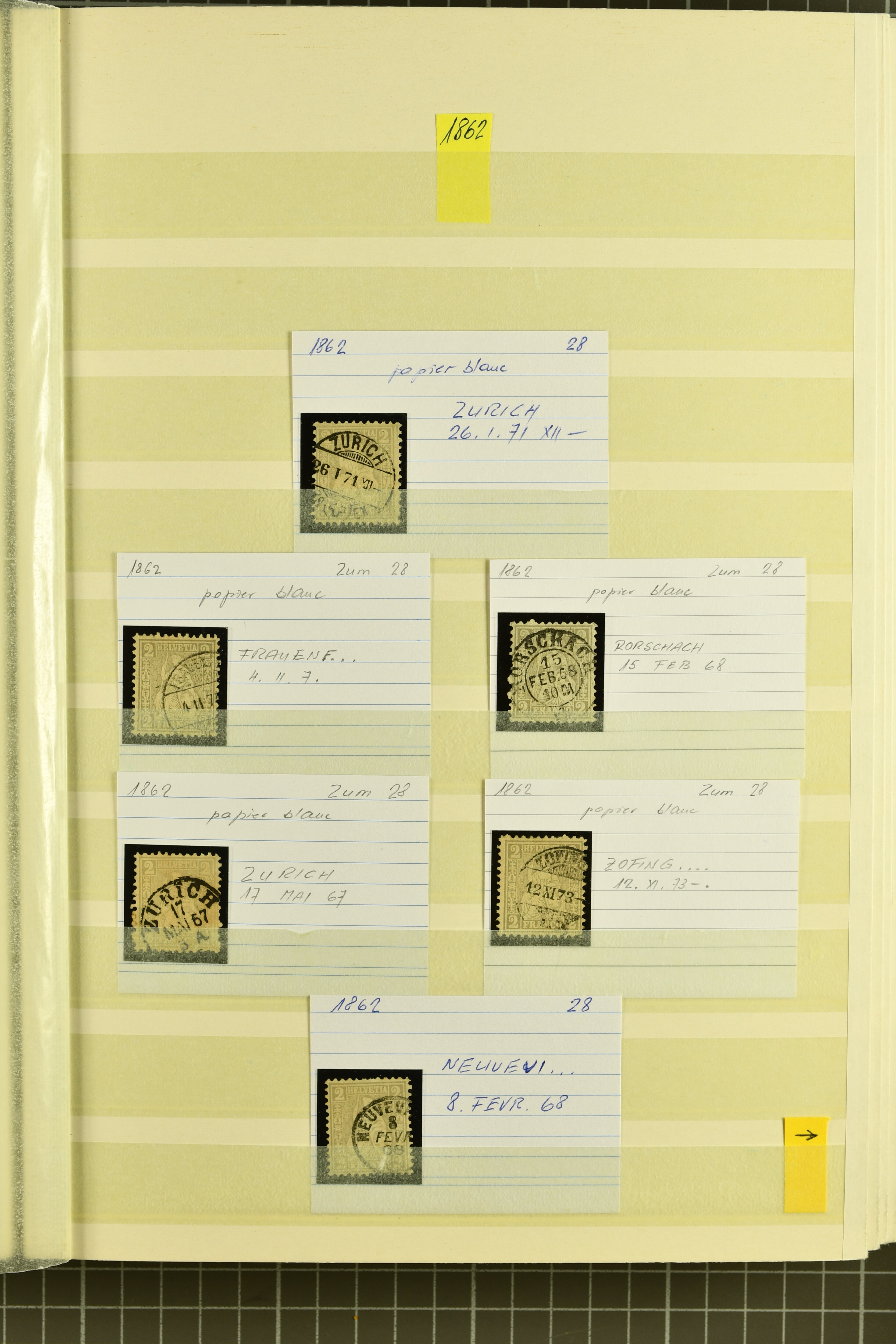 9860 image1843/1887: Attraktives Restlot ab Vorphila - 3 Briefe von "RHEINECK" je mit Zweikreis-Datumstempel, 1x 1843 nach Montmirail und 1851 n. Rorschach, 1853 n. 'Rapperswyl'. Brief von "THAL" via Rheineck und Sevelen. Balkenstempel "Zollbrück" auf Vorphila und auf Markenbrief mit 2x 5 Rp. Sitzende Helvetia. "Waltrigen" auf Brief ohne Marken 1858 n. und 2 Briefe mit Sitz. Helvetia "Waltringen" als Nebenstempel. Kleiner Brief mit 20 Rp. Sitz. Helvetia von "ARNI" nach Blankenburg. Zwei "ORDRE DE MARCHE" je mit Stempel intituliert 'FÈTE NATIONALE 1 Mars' 1x 1887 und 1x offenbar unverwendet, da nicht fertig ausgefüllt. Dazu 2 Steckkarten mit losen Durheimausgaben (9) und Strubel-Marken (16) darunter 15 Rp. Rayon III mit attraktivem Tinten-Gitter, mit Eckbüglein l.o., hierfür Attest Hermann (Image 1) (Image 2) (Image 3)