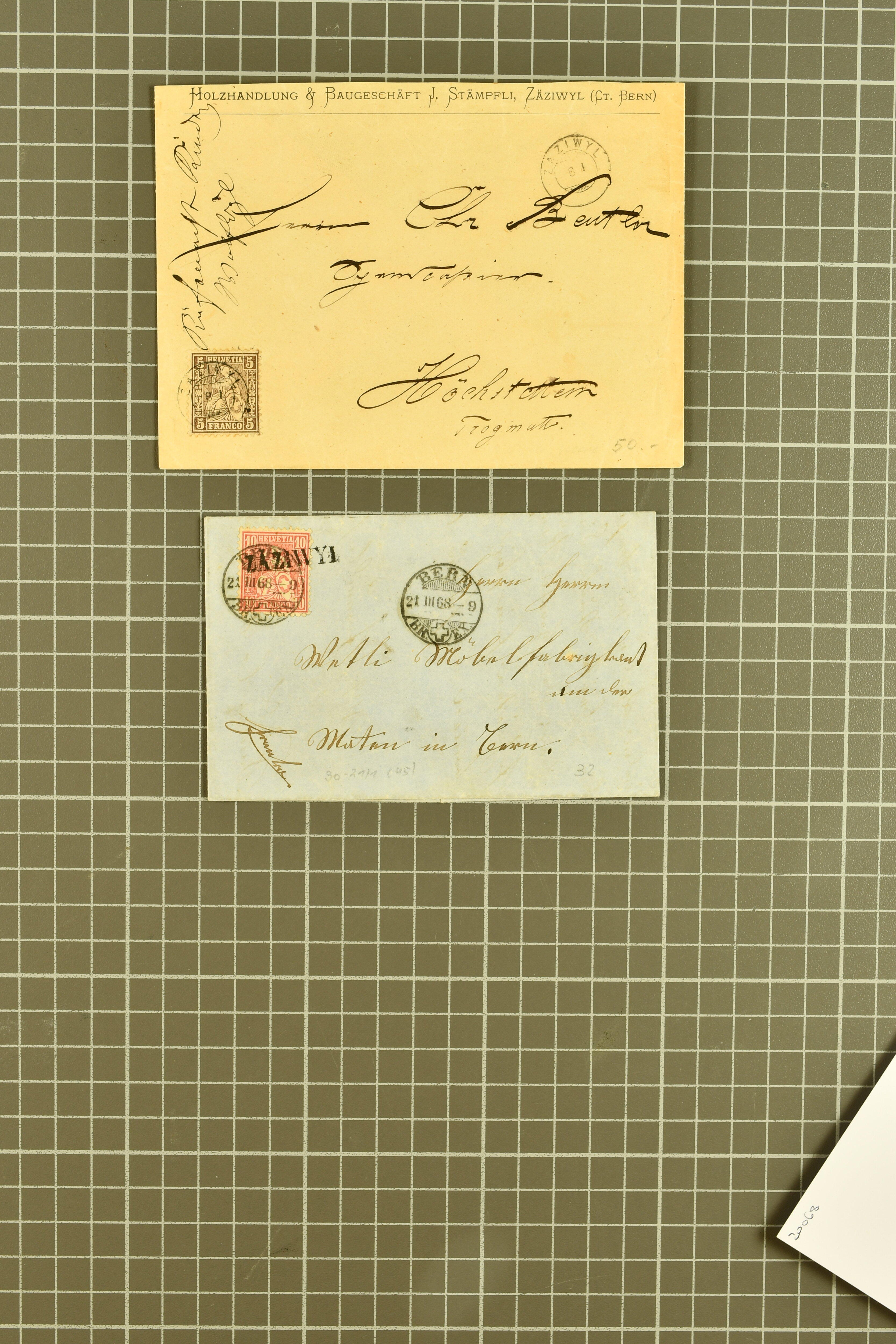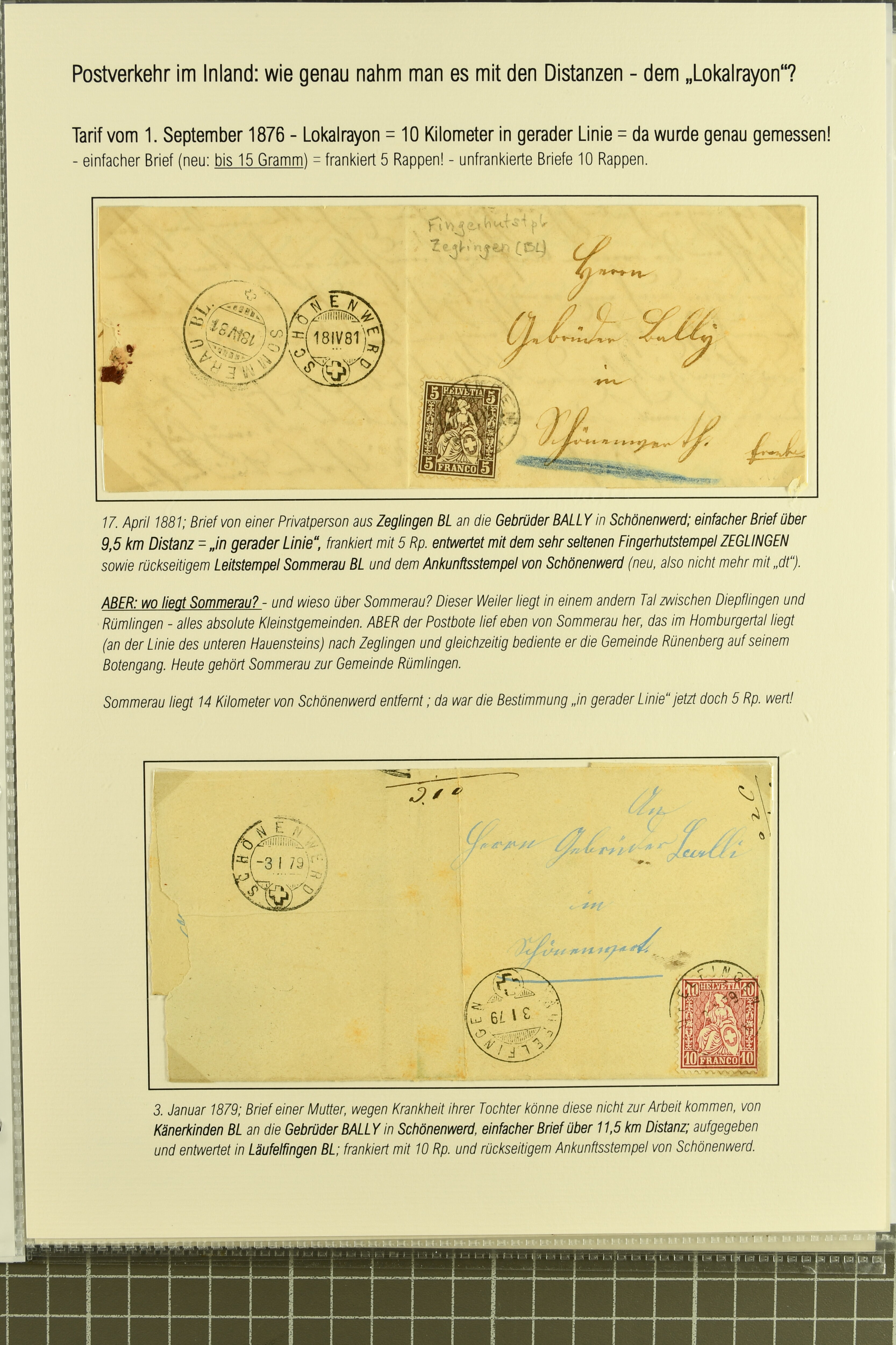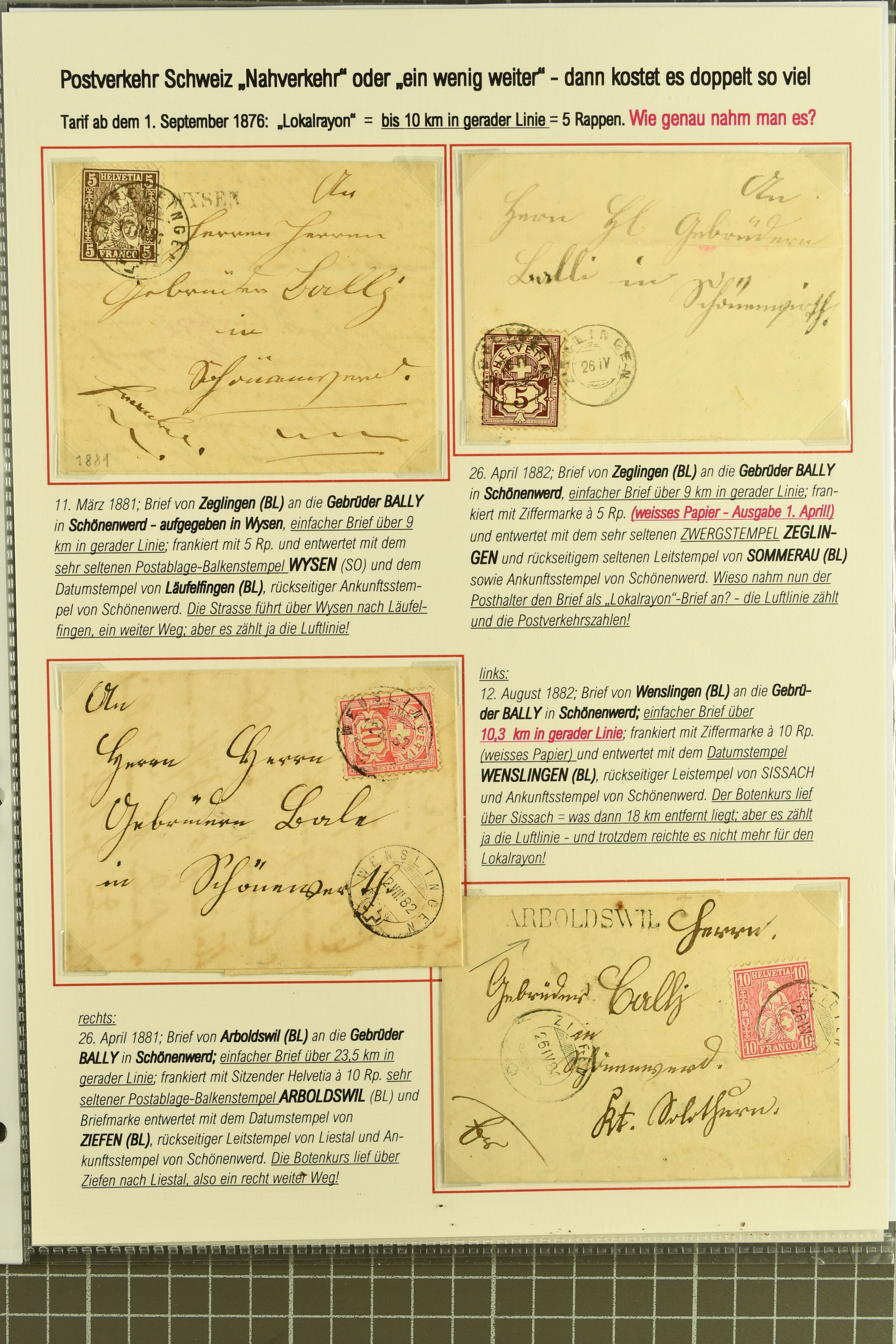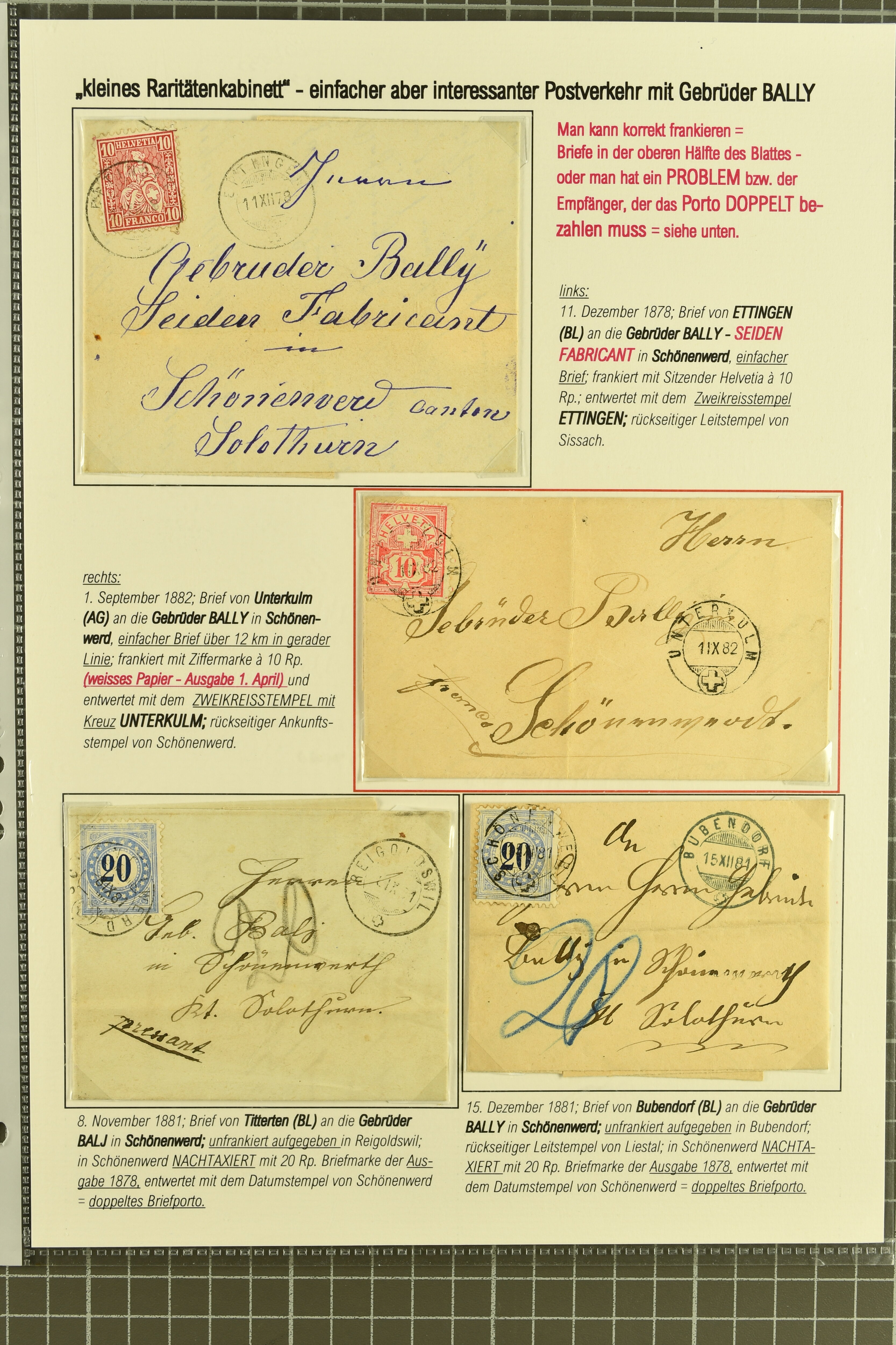 9871 cover image1878/82: Partie zehn ausgesuchter, kleinformatiger Falltbriefe mit Sitzender Helvetia, Ziffermuster oder Nachportomarken, alle adressiert an die Firma Bally in Schönenwerd. Dabei je ein Brief mit Sitzender 5 Rp. braun respektive Ziffermuster 5 Rp. hellbraunlila auf weissem Papier (SBK 54) mit seltenem Zwergstempel "ZEGLINGEN", Sitzende 5 Rp. braun sauber gest. "LÄUFELFINGEN 11.III.81" auf Faltbrieflein mit nebenges. seltenem Stabstempel "WYSEN", 10 Rp. rot gest. "ZIEFEN 26.IV.81" auf Faltbrieflein mit nebenges. Stabstp. "ARBOLDSWIL", zwei Frankaturen der Ziffermuster 10 Rp. hellrosa auf weissem Papier (SBK 55) sowie je ein unfrankiert aufgegebenes Brieflein von Reigoldswil resp. Bubendorf, bei Ankunft mit Nachportomarke 20 Rp. blau nachtaxiert. Eine aussergewöhnliche und höchst attraktive Zusammenstellung in guter Erhaltung (Image 1) (Image 2) (Image 3)