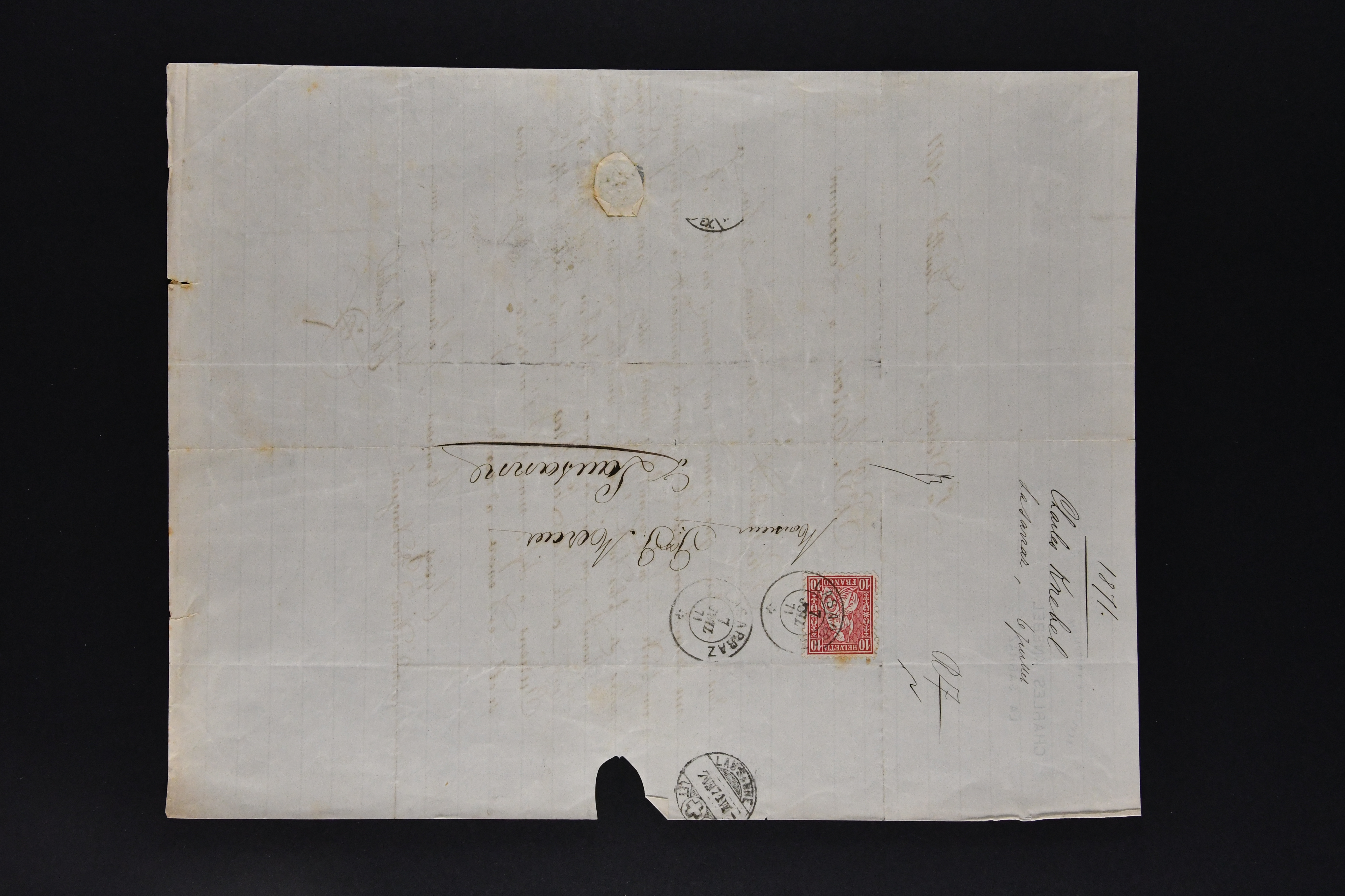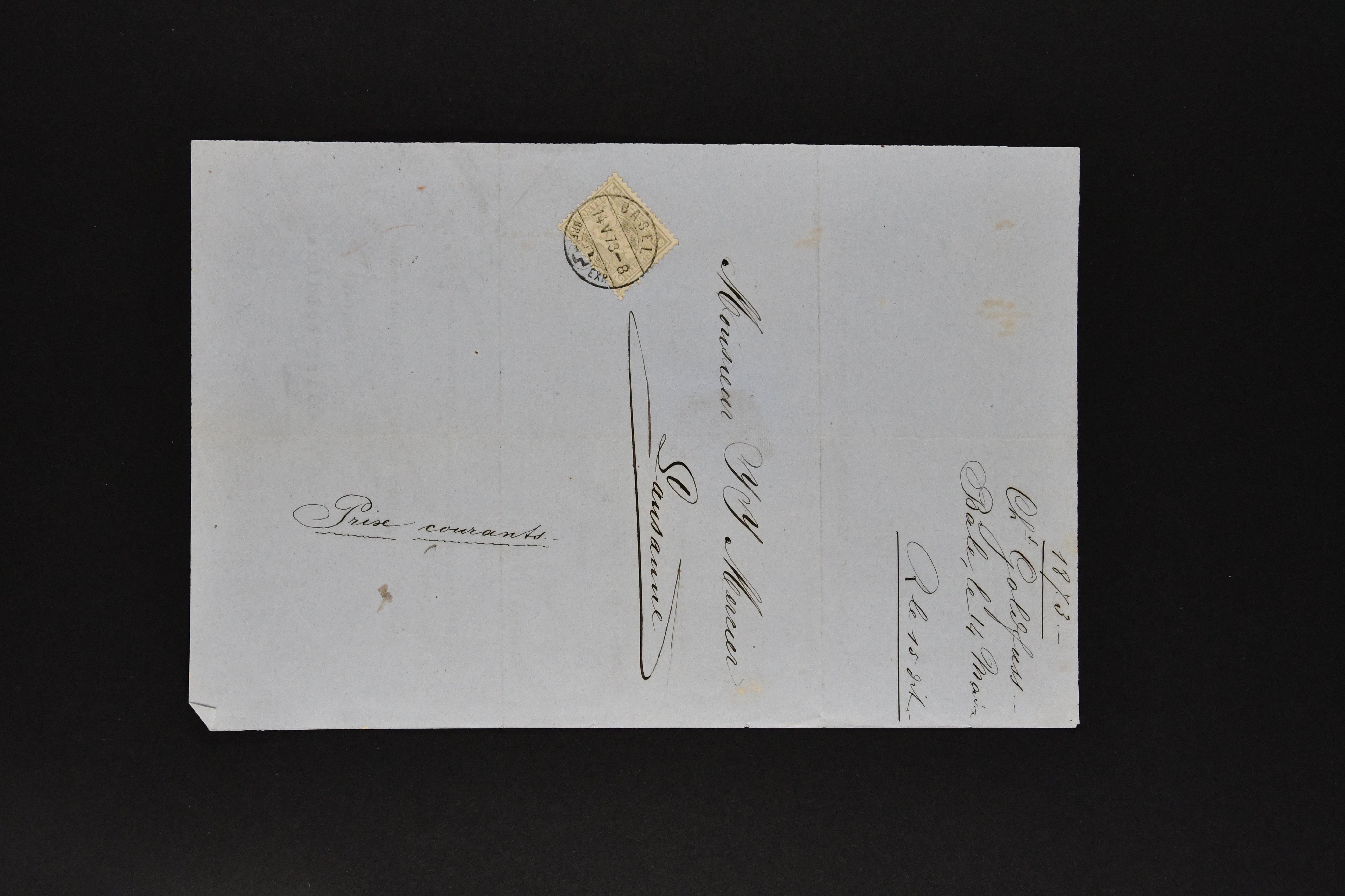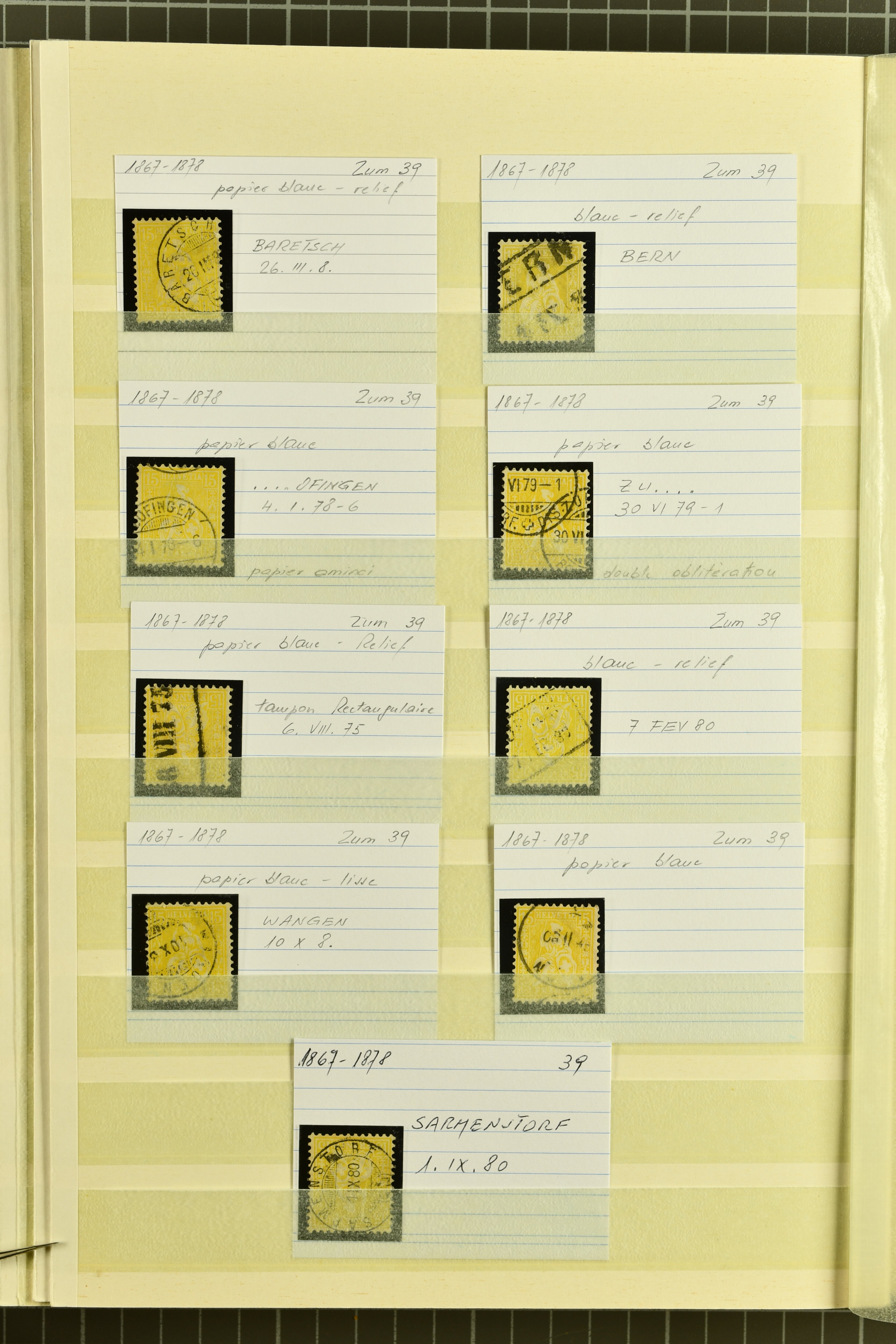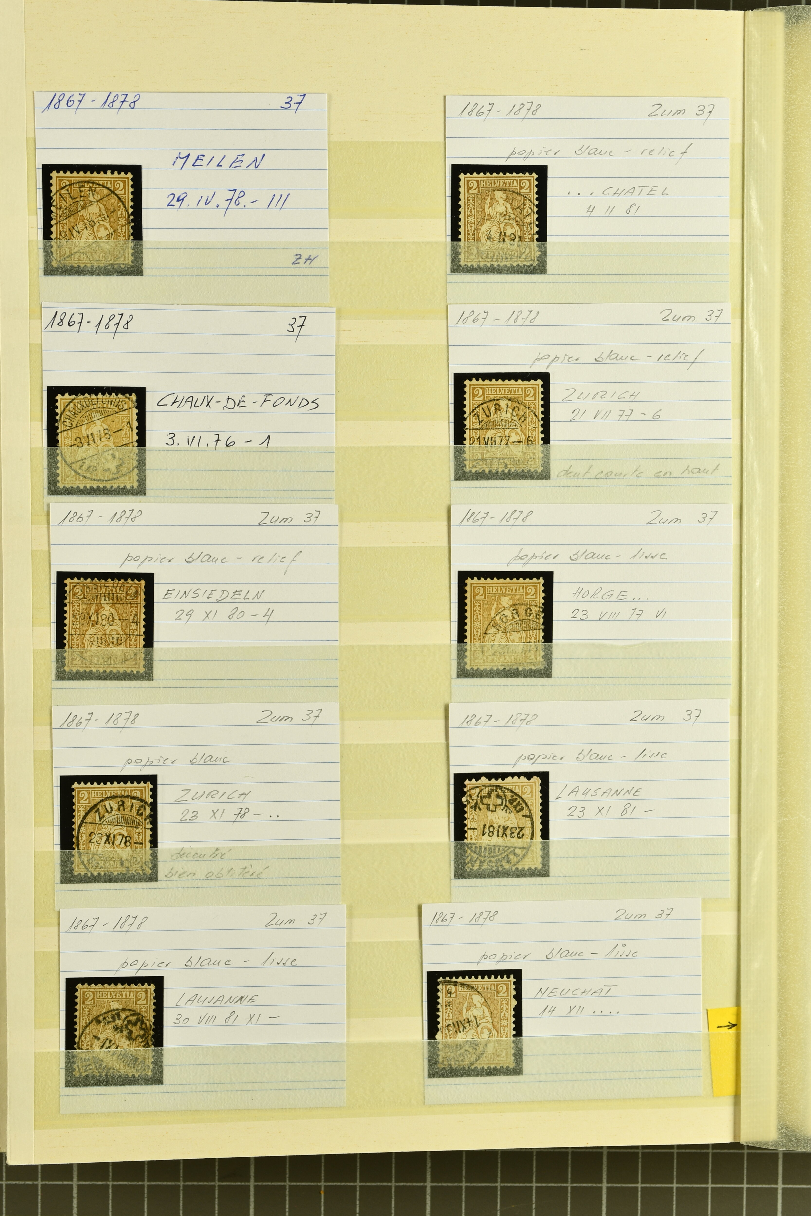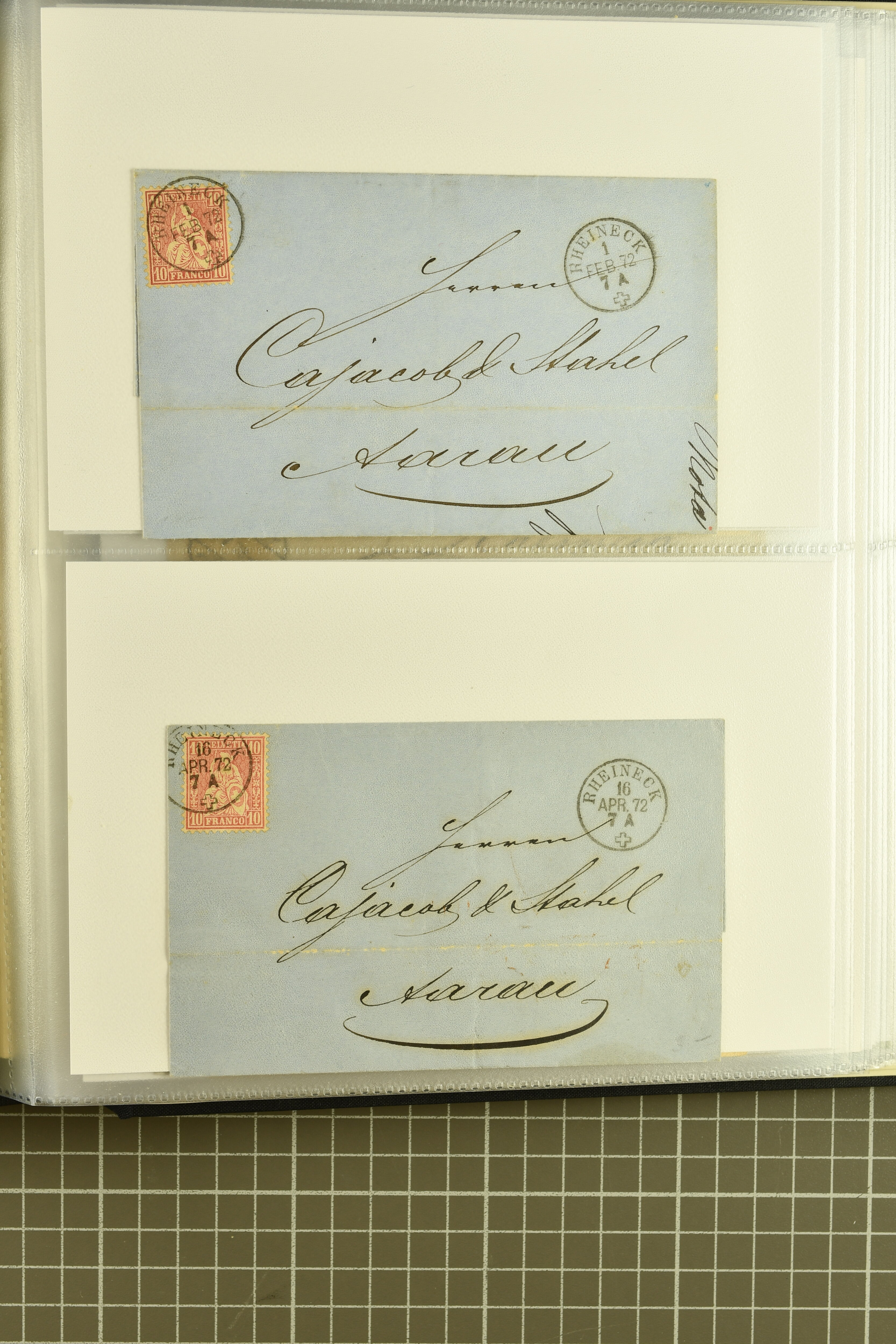 9871 cover image1878/82: Partie zehn ausgesuchter, kleinformatiger Falltbriefe mit Sitzender Helvetia, Ziffermuster oder Nachportomarken, alle adressiert an die Firma Bally in Schönenwerd. Dabei je ein Brief mit Sitzender 5 Rp. braun respektive Ziffermuster 5 Rp. hellbraunlila auf weissem Papier (SBK 54) mit seltenem Zwergstempel "ZEGLINGEN", Sitzende 5 Rp. braun sauber gest. "LÄUFELFINGEN 11.III.81" auf Faltbrieflein mit nebenges. seltenem Stabstempel "WYSEN", 10 Rp. rot gest. "ZIEFEN 26.IV.81" auf Faltbrieflein mit nebenges. Stabstp. "ARBOLDSWIL", zwei Frankaturen der Ziffermuster 10 Rp. hellrosa auf weissem Papier (SBK 55) sowie je ein unfrankiert aufgegebenes Brieflein von Reigoldswil resp. Bubendorf, bei Ankunft mit Nachportomarke 20 Rp. blau nachtaxiert. Eine aussergewöhnliche und höchst attraktive Zusammenstellung in guter Erhaltung (Image 1) (Image 2) (Image 3)