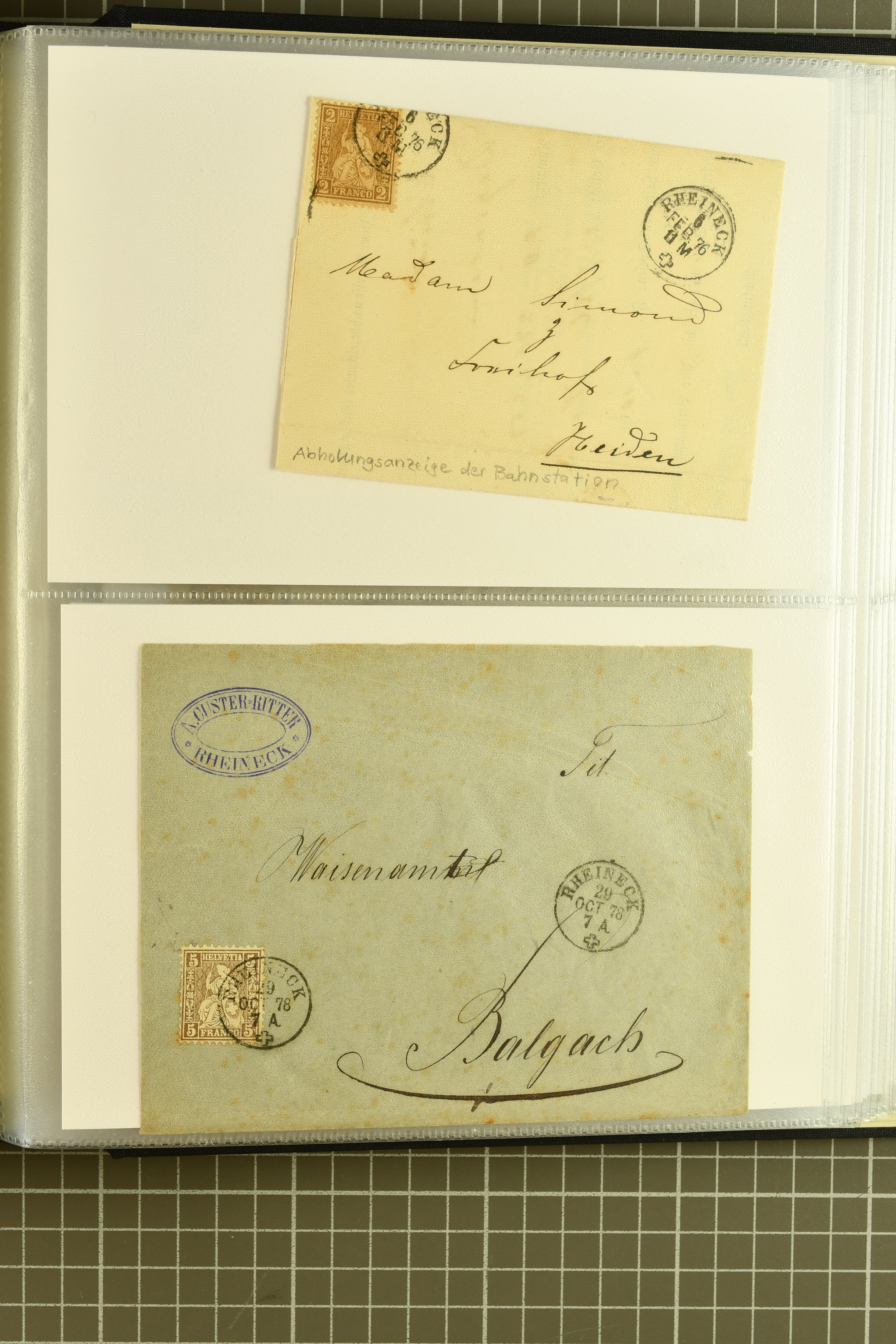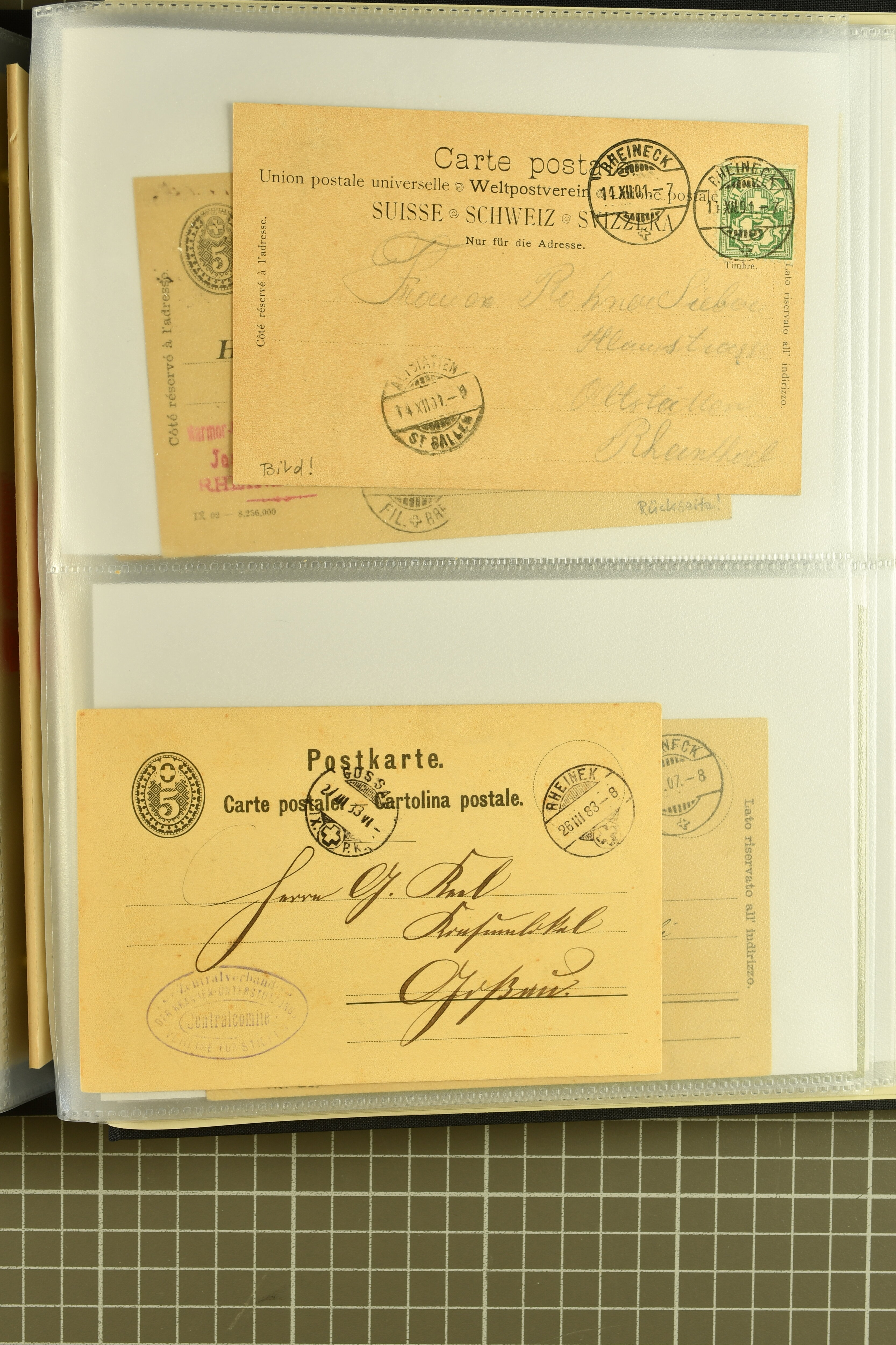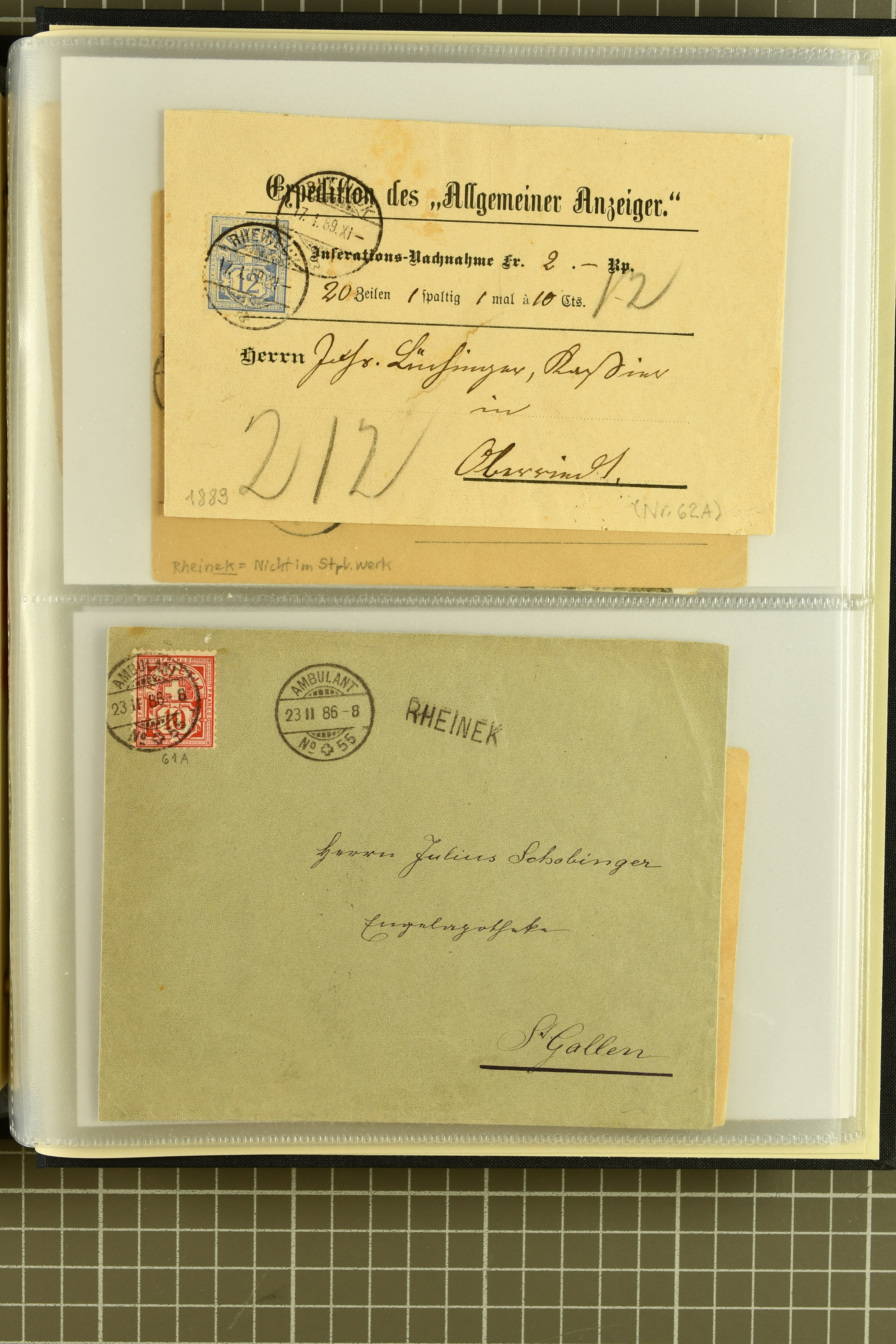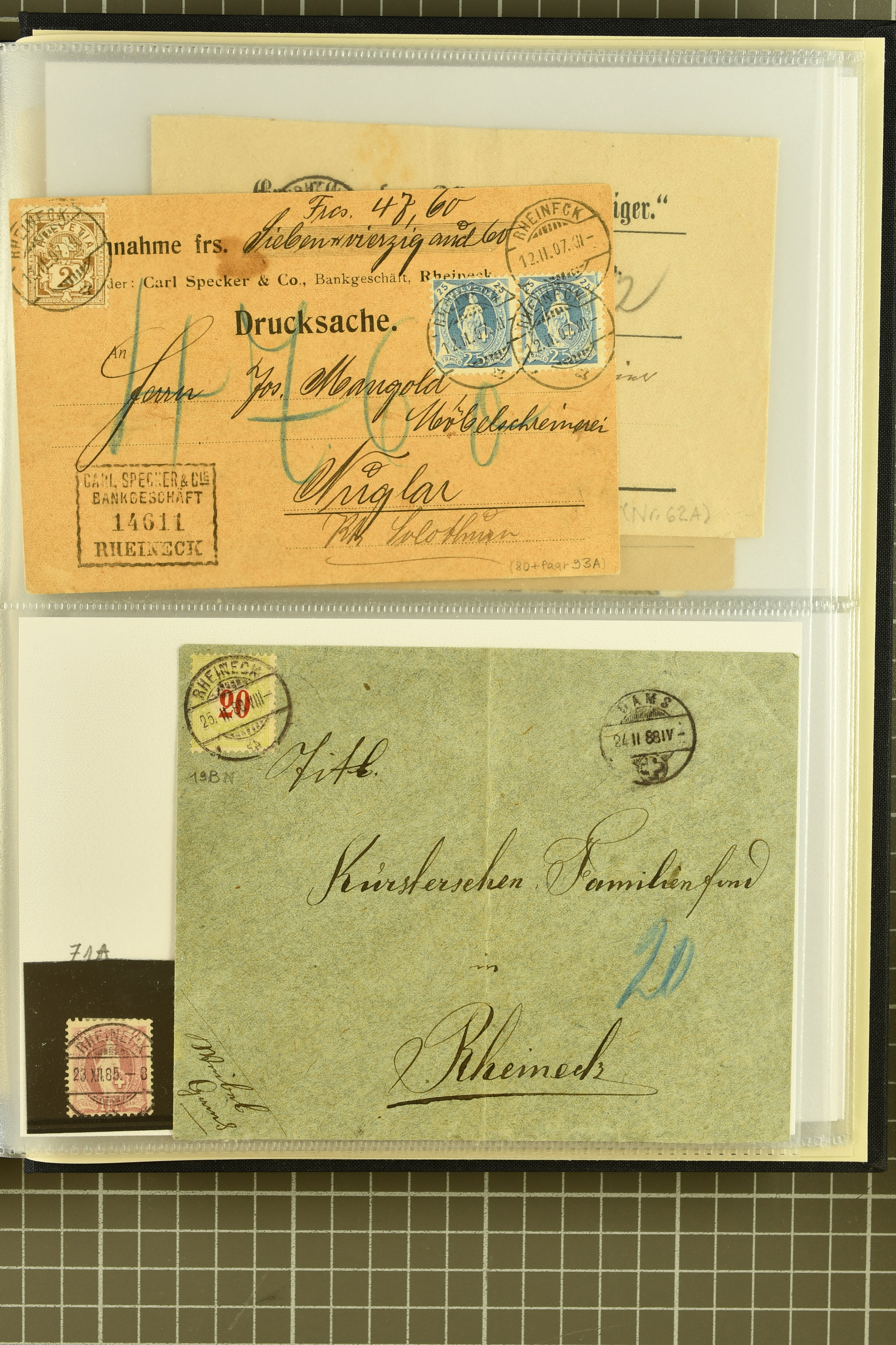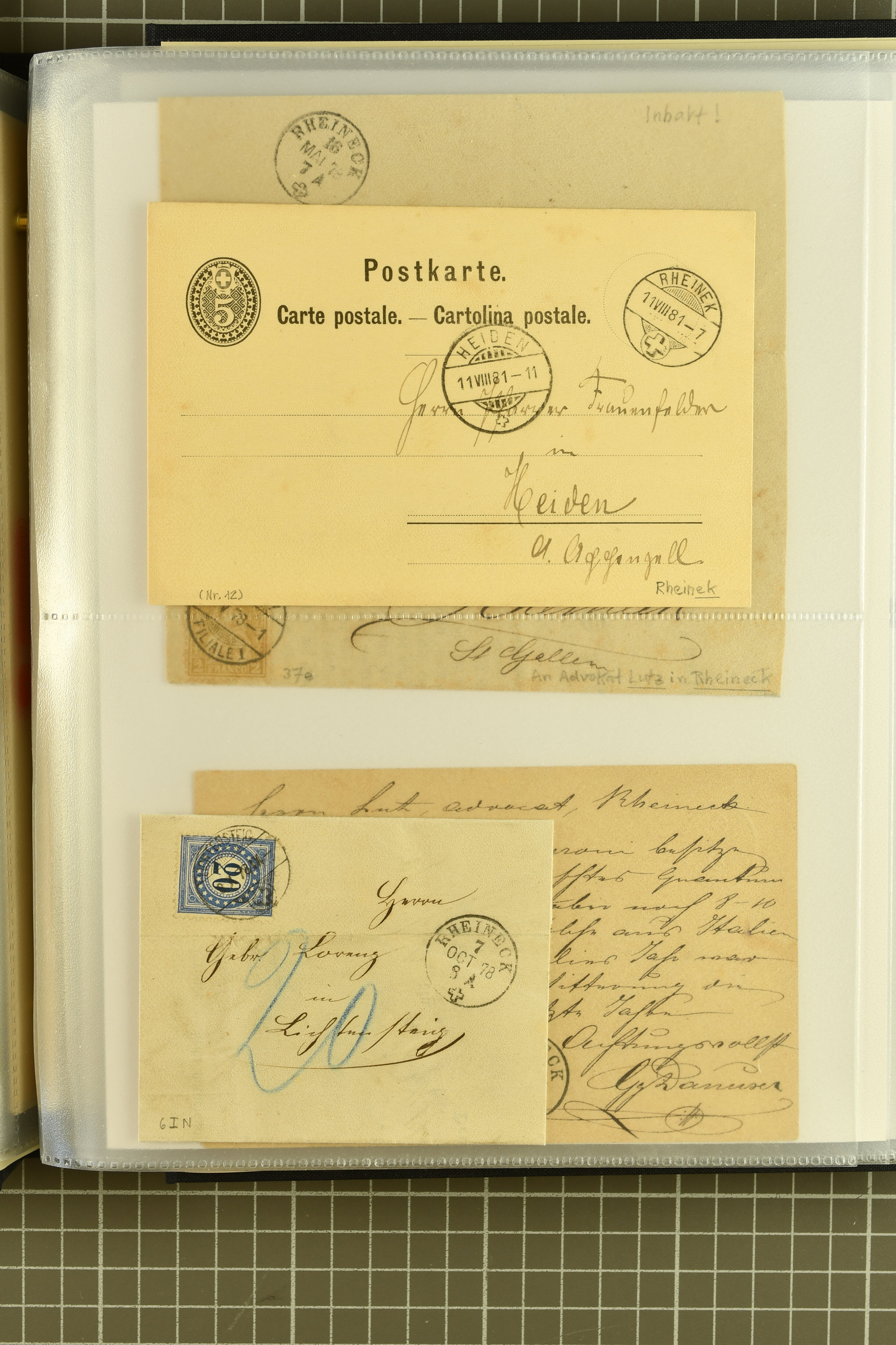 9858 cover image1862/1910ca.: Zusammenstellung von Belegen, alle von RHEINECK mit den verschiedenen Stempeln und deren verschiedenen Schreibweisen, dabei 20 Rp. Strubel Nachnahme von 1862, diverse Sitzende Helvetia, Tüblibriefe, Ganzsachen- und Ansichtspostkarten; dabei auch ein Beleg mit 20 Rp. Nachporto blau - insgesamt 49 Belege und zwei lose Marken (Image 1) (Image 2) (Image 3) (Image 4) (Image 5) (Image 6) (Image 7) (Image 8) (Image 9) (Image 10) (Image 11) (Image 12) (Image 13) (Image 14) (Image 15) (Image 16) (Image 17) (Image 18) (Image 19) (Image 20) (Image 21) (Image 22) (Image 23) (Image 24) (Image 25) (Image 26) (Image 27) (Image 28) (Image 29) (Image 30) (Image 31)