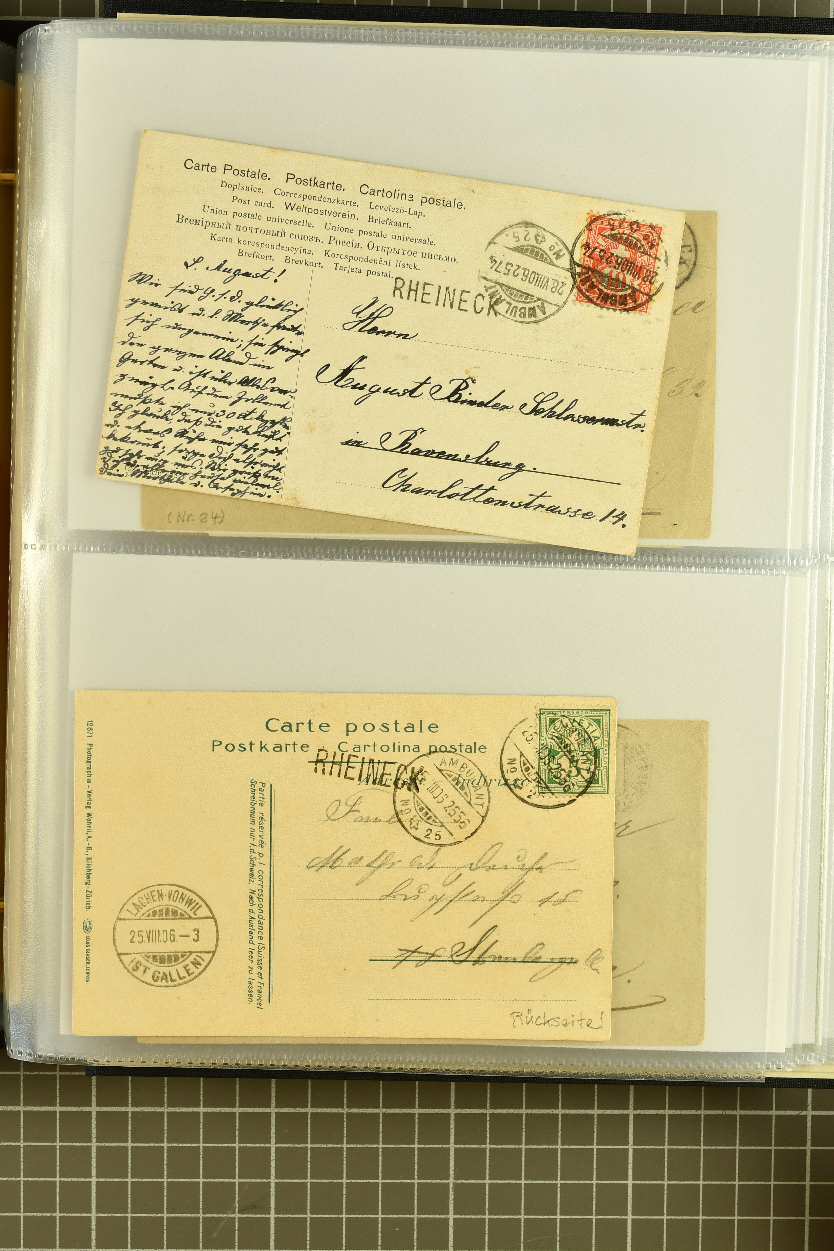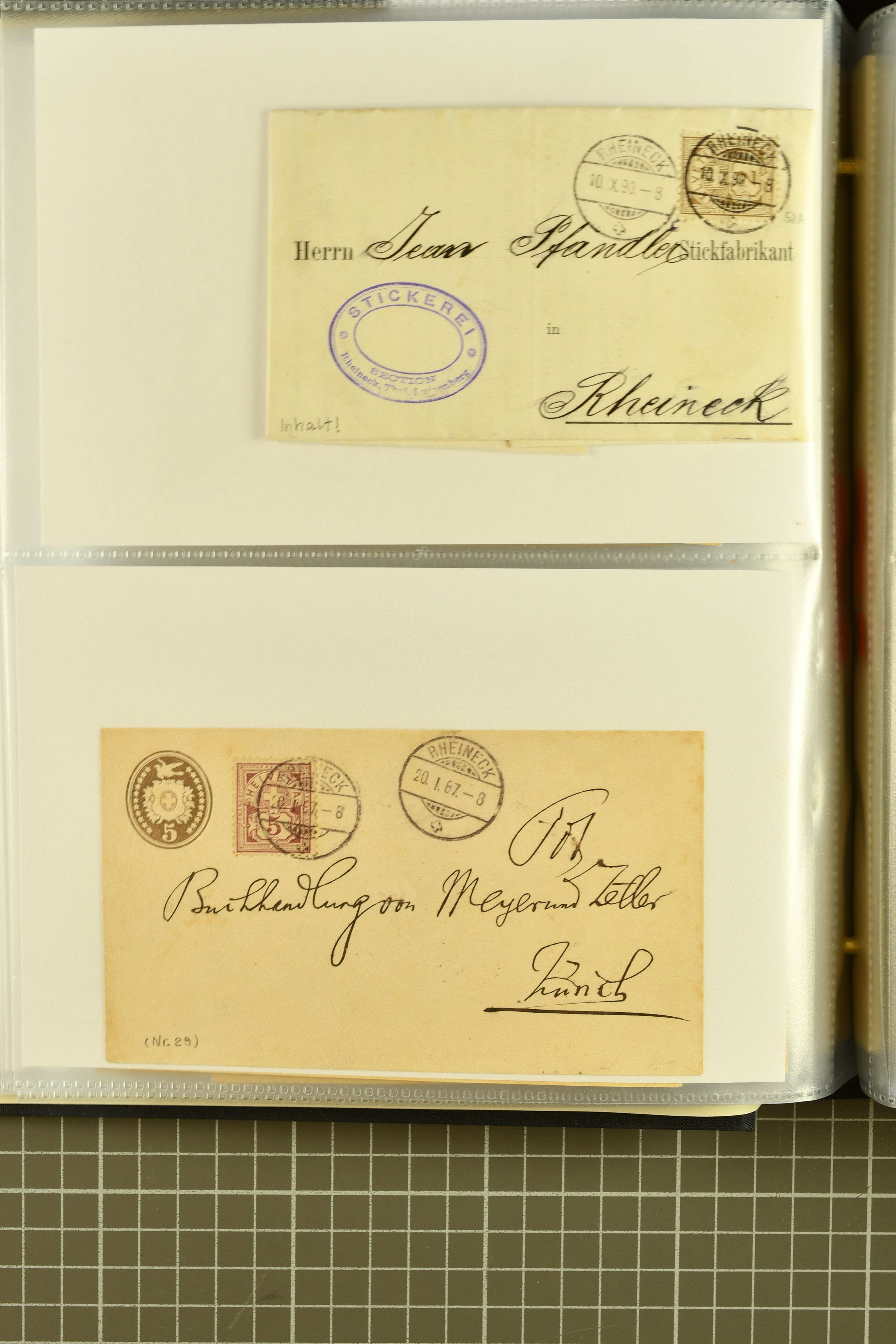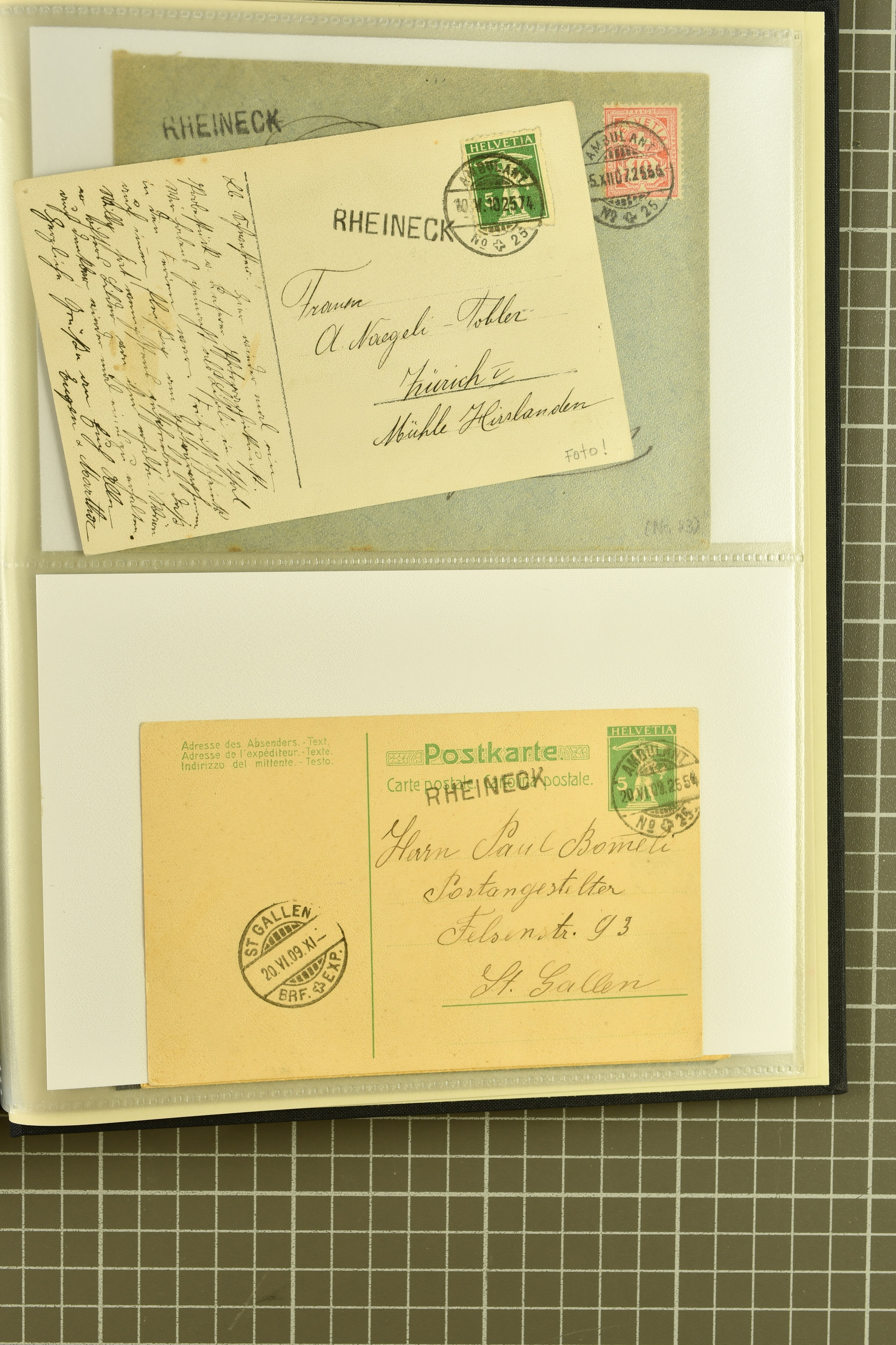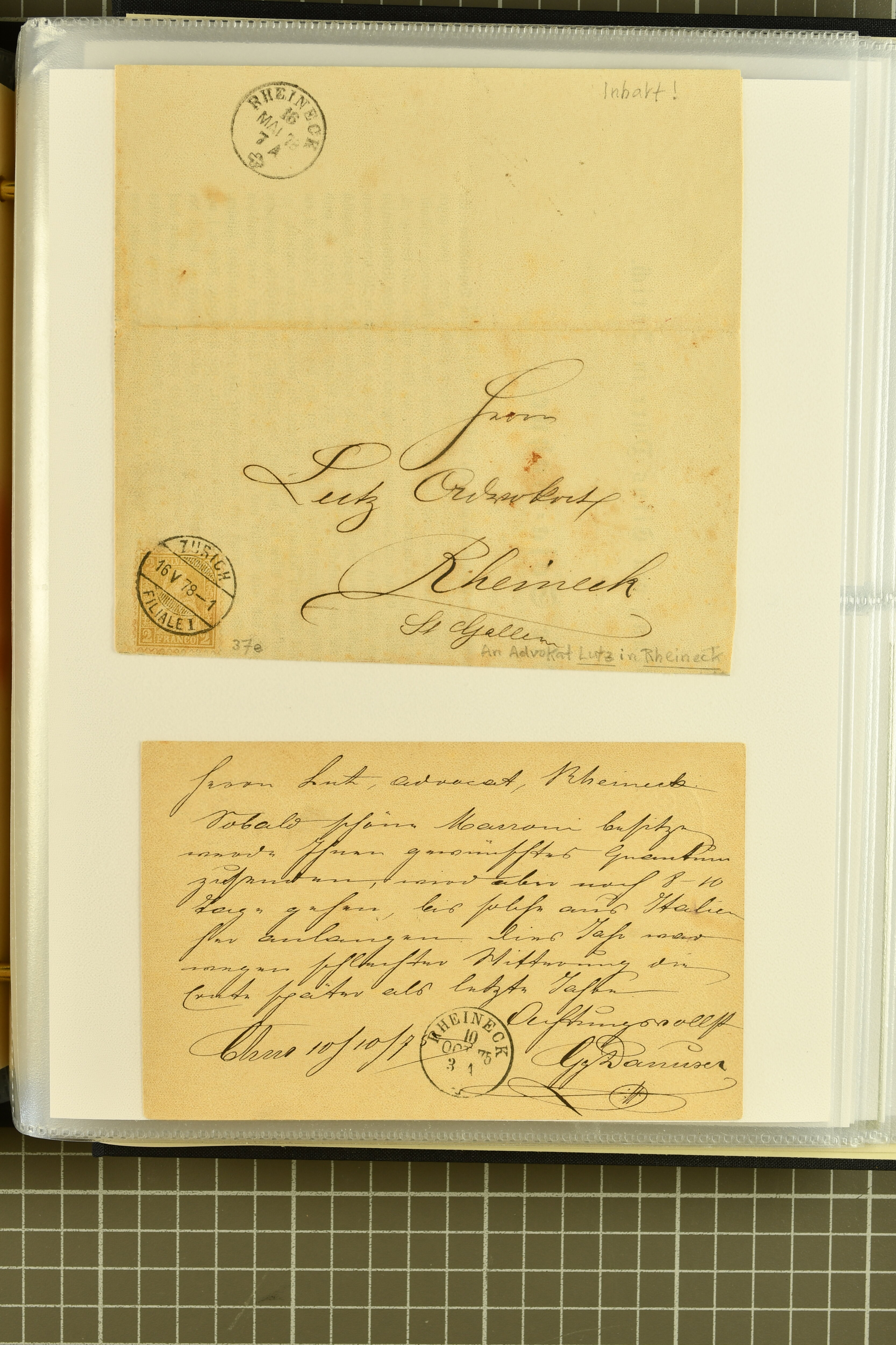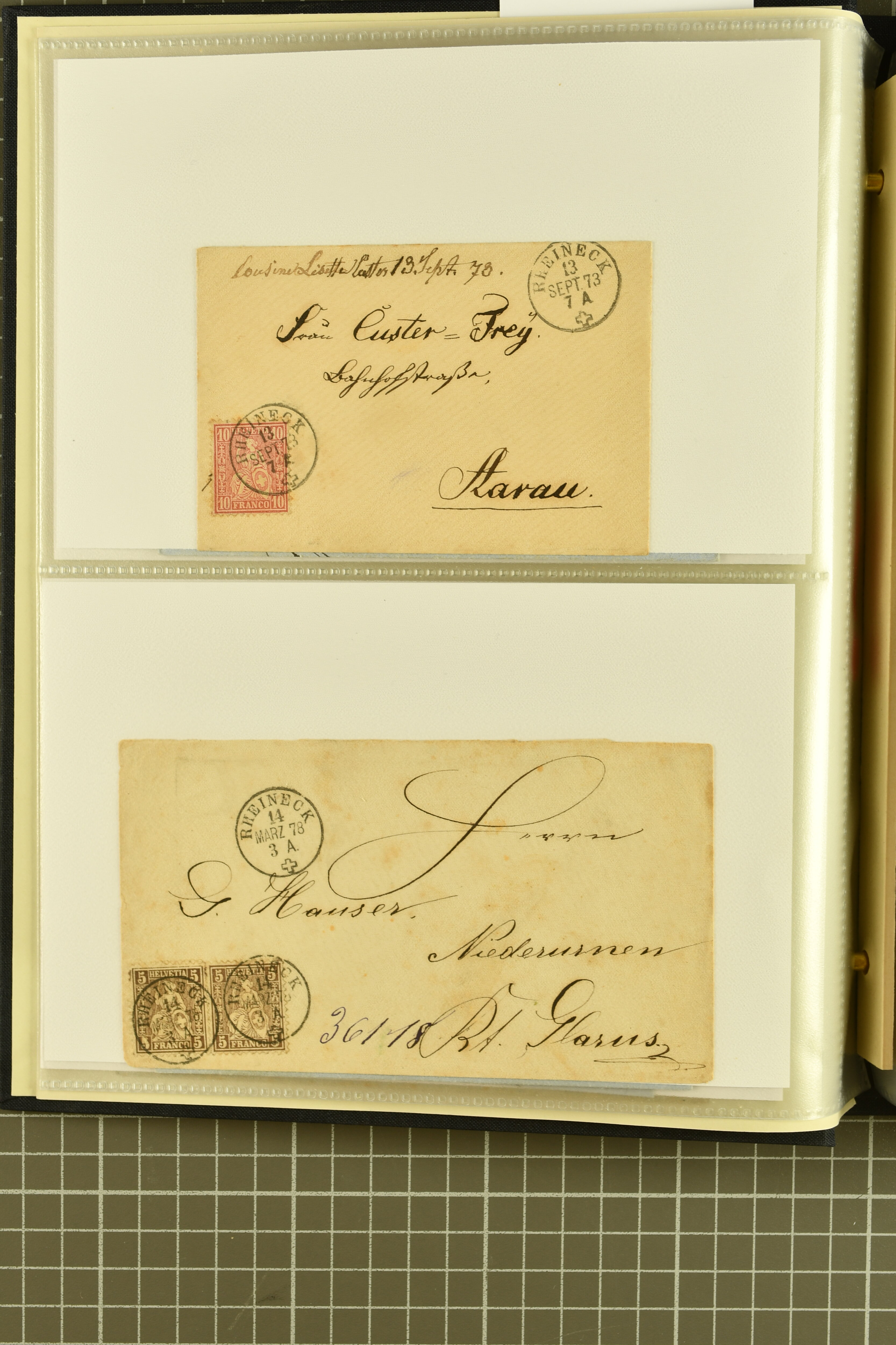9858 cover image1862/1910ca.: Zusammenstellung von Belegen, alle von RHEINECK mit den verschiedenen Stempeln und deren verschiedenen Schreibweisen, dabei 20 Rp. Strubel Nachnahme von 1862, diverse Sitzende Helvetia, Tüblibriefe, Ganzsachen- und Ansichtspostkarten; dabei auch ein Beleg mit 20 Rp. Nachporto blau - insgesamt 49 Belege und zwei lose Marken (Image 1) (Image 2) (Image 3) (Image 4) (Image 5) (Image 6) (Image 7) (Image 8) (Image 9) (Image 10) (Image 11) (Image 12) (Image 13) (Image 14) (Image 15) (Image 16) (Image 17) (Image 18) (Image 19) (Image 20) (Image 21) (Image 22) (Image 23) (Image 24) (Image 25) (Image 26) (Image 27) (Image 28) (Image 29) (Image 30) (Image 31)