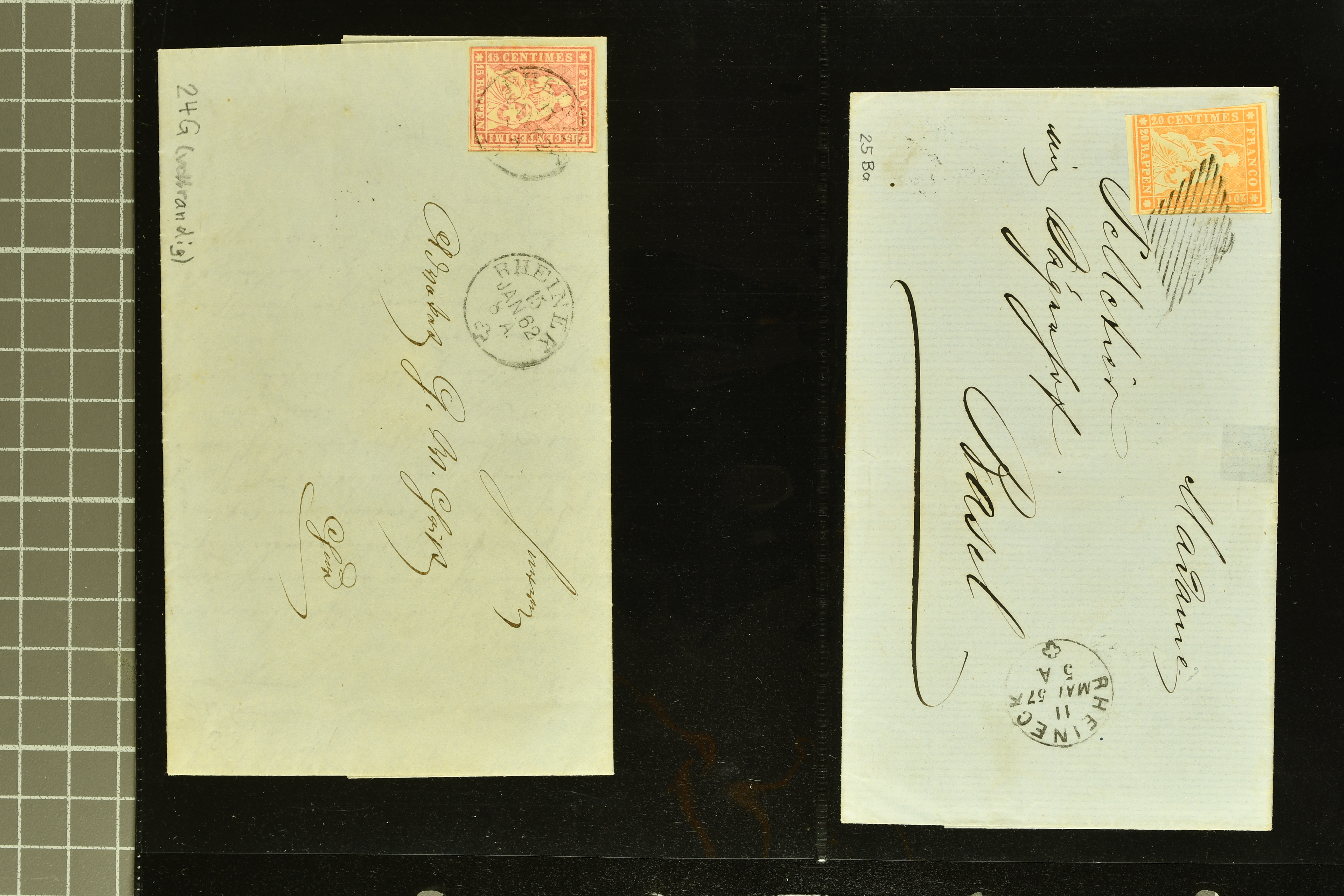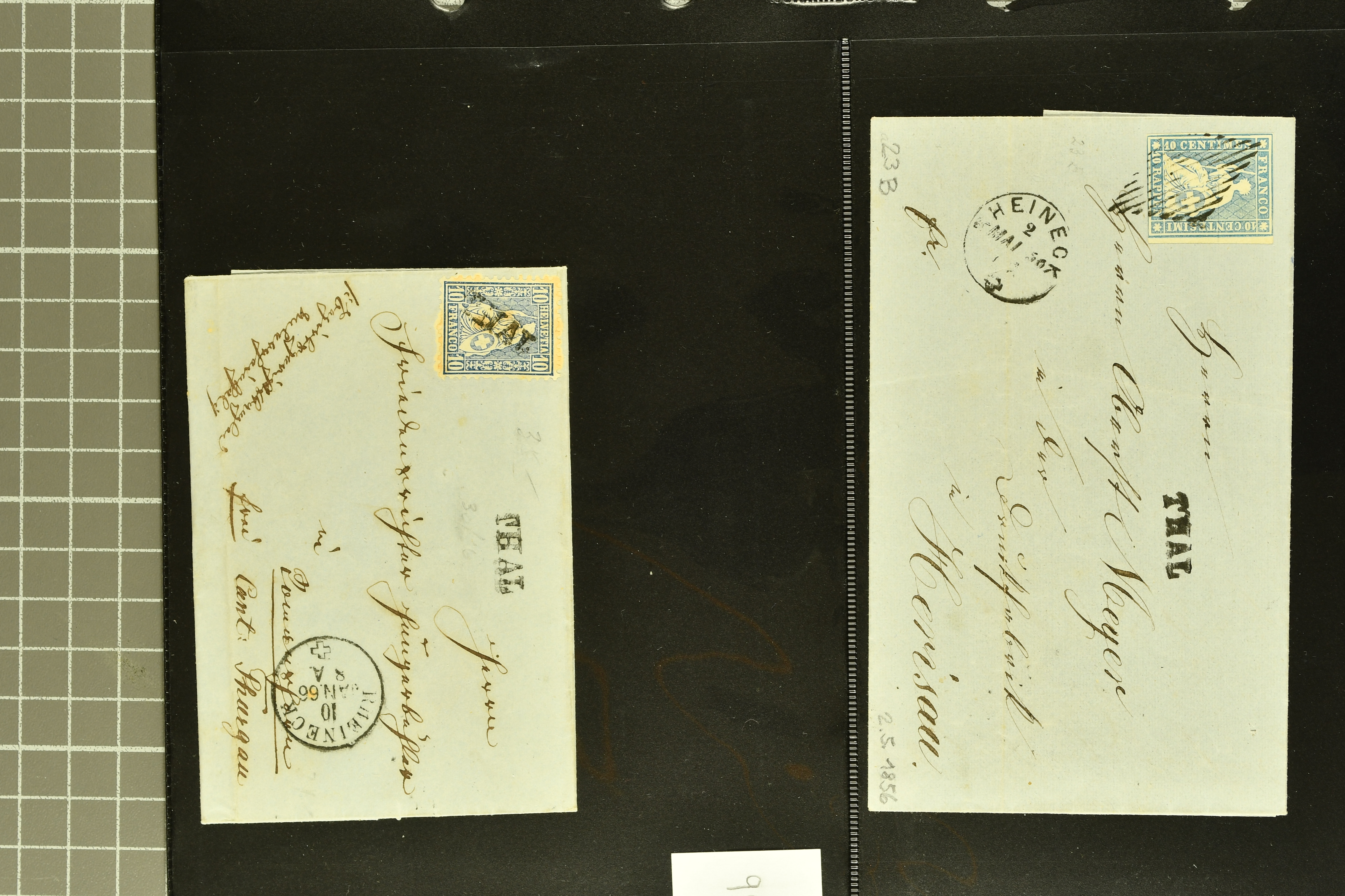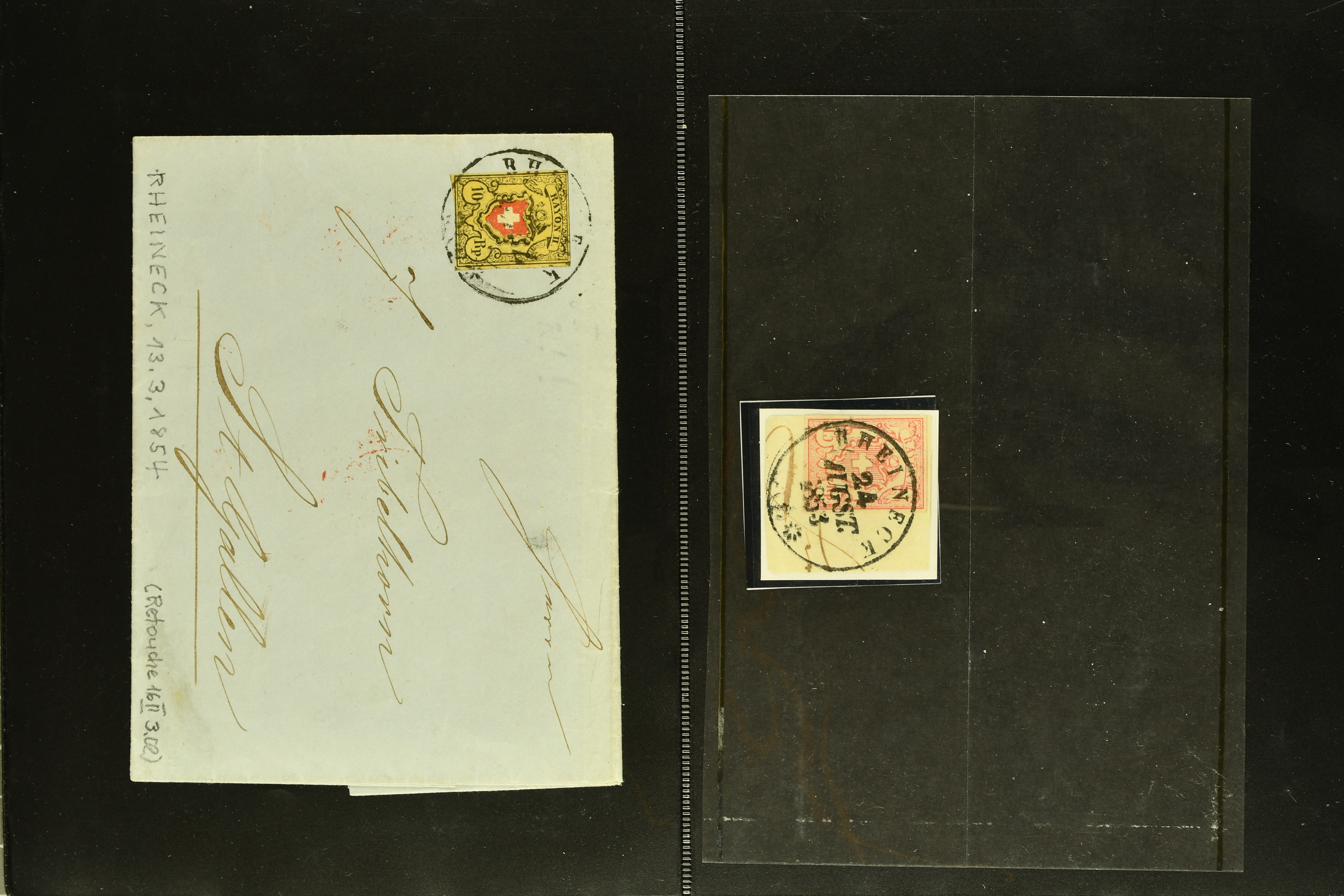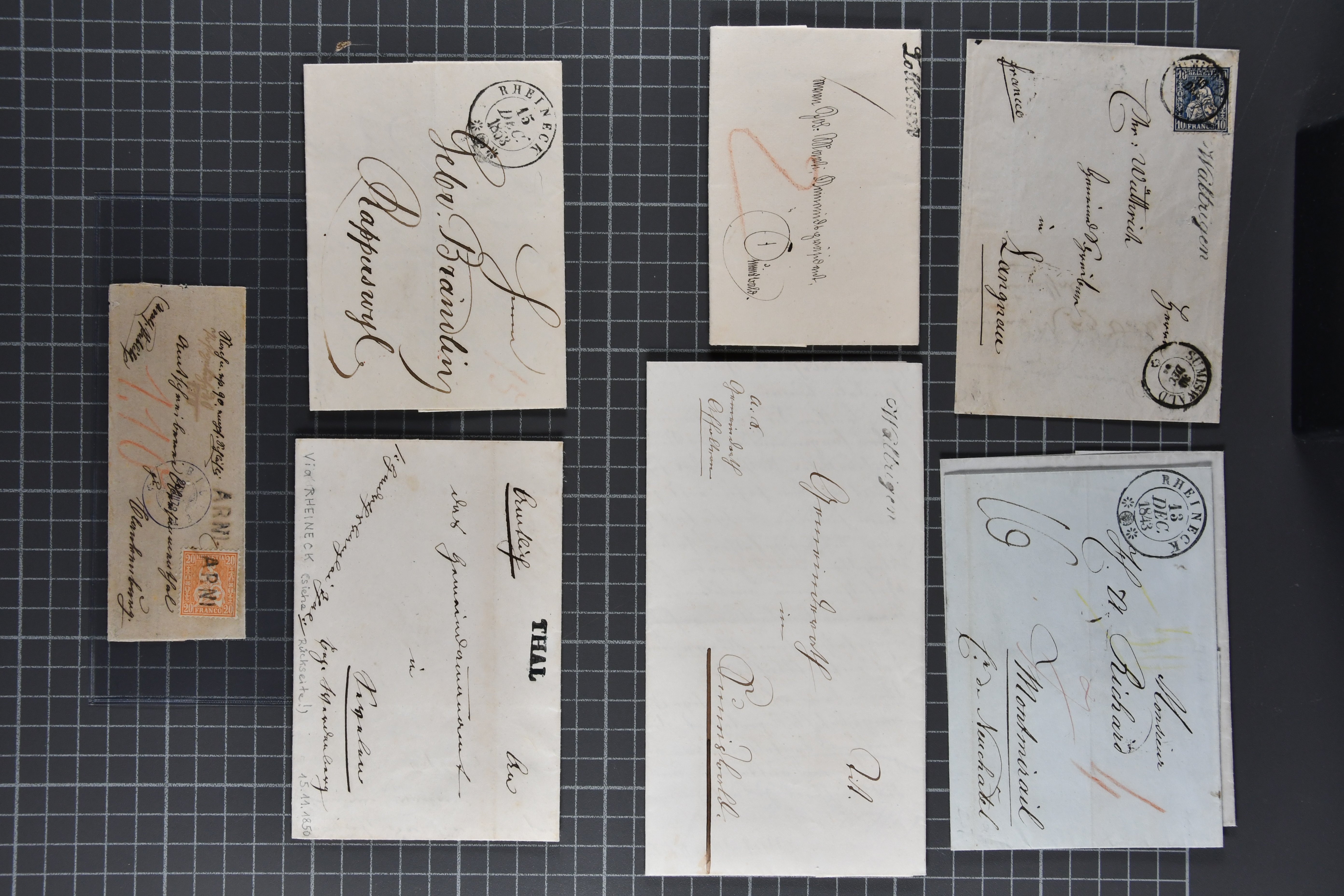9868 piece/cover image1850/69: Kleine Heimatsammlung mit einem Briefstück und sechs Briefen von Rheineck. Dabei Rayon II, Stein D: Type 2 r/u und Retouche "Schwarzer Fleck über 'YO' entfernt" (Zu. Spez. 16/II.3.02), klar und übergehend entw. mit gr. Zierkreisstp. "RHEINECK..." in schwarz auf vollst. Faltbrief im 2. Briefkreis nach St. Gallen, Rayon III, gr. Wertziffer: Type 6, klar und übergehend entw. mit gr. Zierkreisstp. "RHEINECK 24 AUGST. 1853" (AW 5244) in schwarz auf Briefstück, drei Strubelbriefe inkl. 10 Rp. grauultramarin (SBK 23B) mit Bogenrand rechts, klar und übergehend entw. mit schwarzer eidg. Raute mit nebenges. Stabstp. "THAL" und beigefügtem Einkreisstp. "RHEINECK 2 MAI 56..." in schwarz auf Faltbrief nach Herisau, 20 Rp. gelblichorange (SBK 25B) auf Faltbrief der 2. Gewichtsstufe im 3. Briefkreis nach Basel oder Sitzende Helvetia 10 Rp. blau (SBK 31), zentr. entw. mit Stabstp. "THAL" auf Fltbrief nach Romanshorn. Gute Erhaltung; zwei Befunde (Image 1) (Image 2) (Image 3) (Image 4) (Image 5) (Image 6)