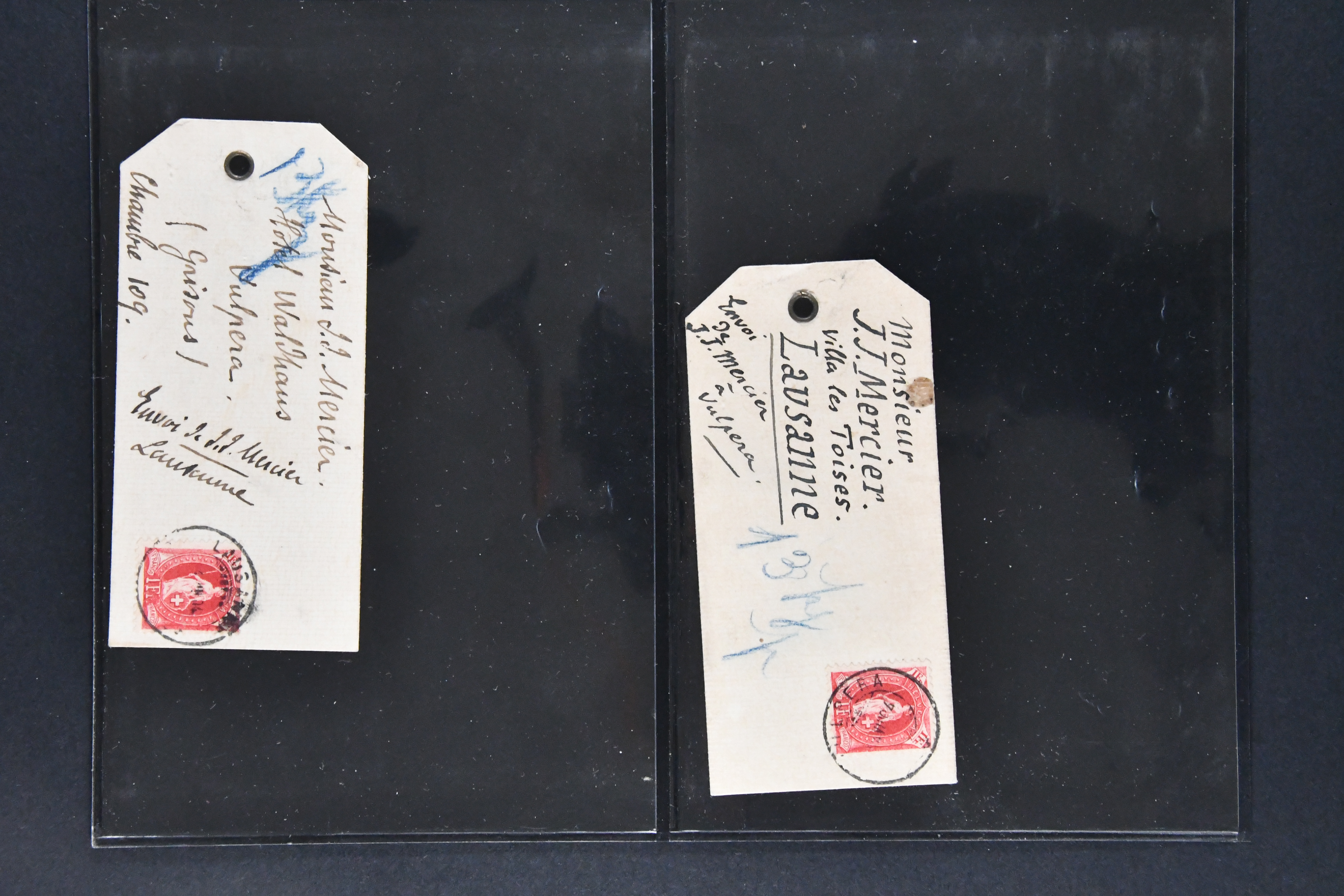 9859 cover 1889/1935: Sammlung der Rasierklingen-Stempel, inklusive etwas Dubletten mit einigen seltenen Stücken in Briefalbum. Dazu Handbuch der Rasierklingenstempel der Schweiz von 2015, Artikel M. Rutherford in zwei Ausgaben der BBZ und etliche weitere, auch Kopien usw. Über 100 Belege, dabei Vorläufer von Lausanne (Nr. 0.02)