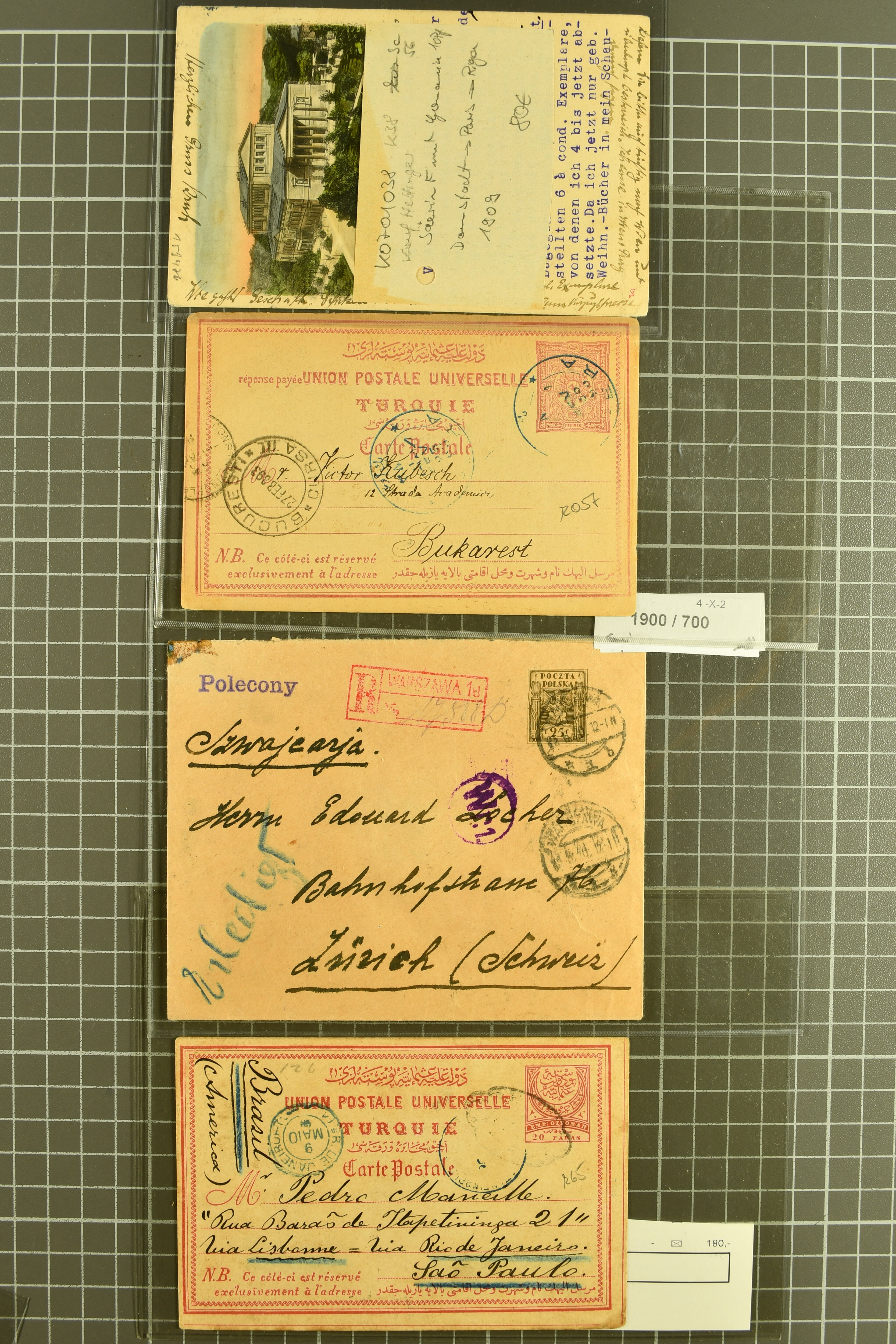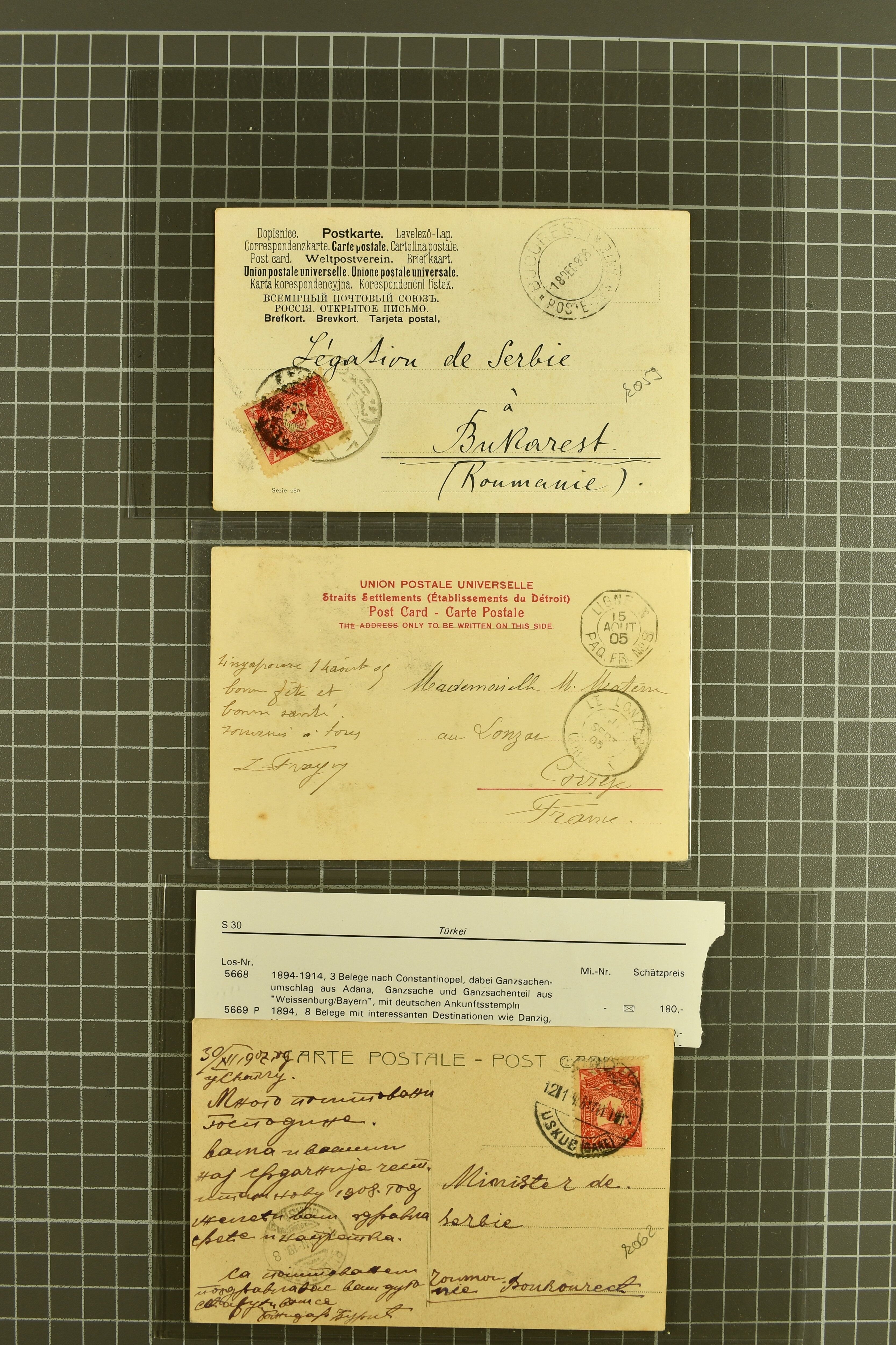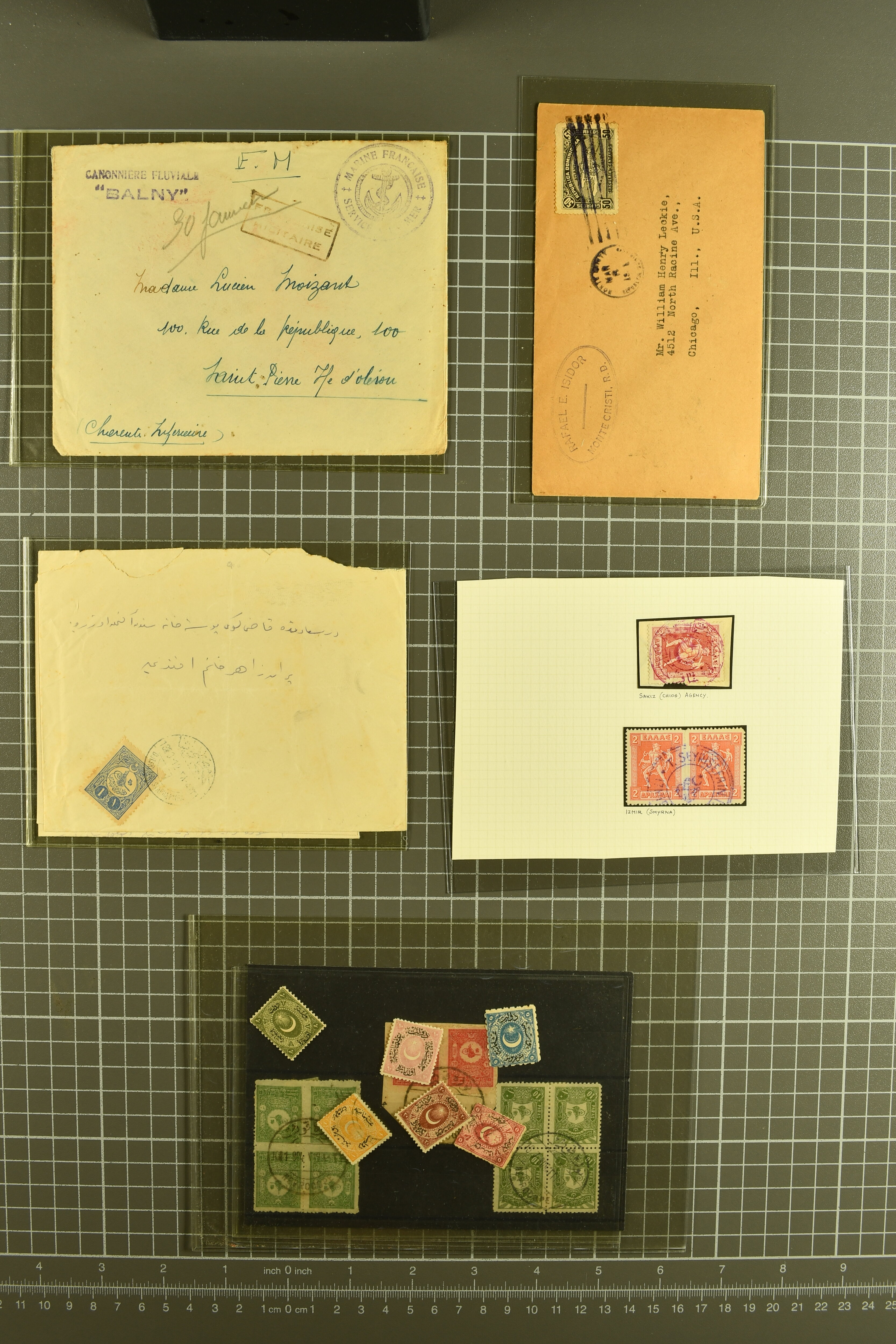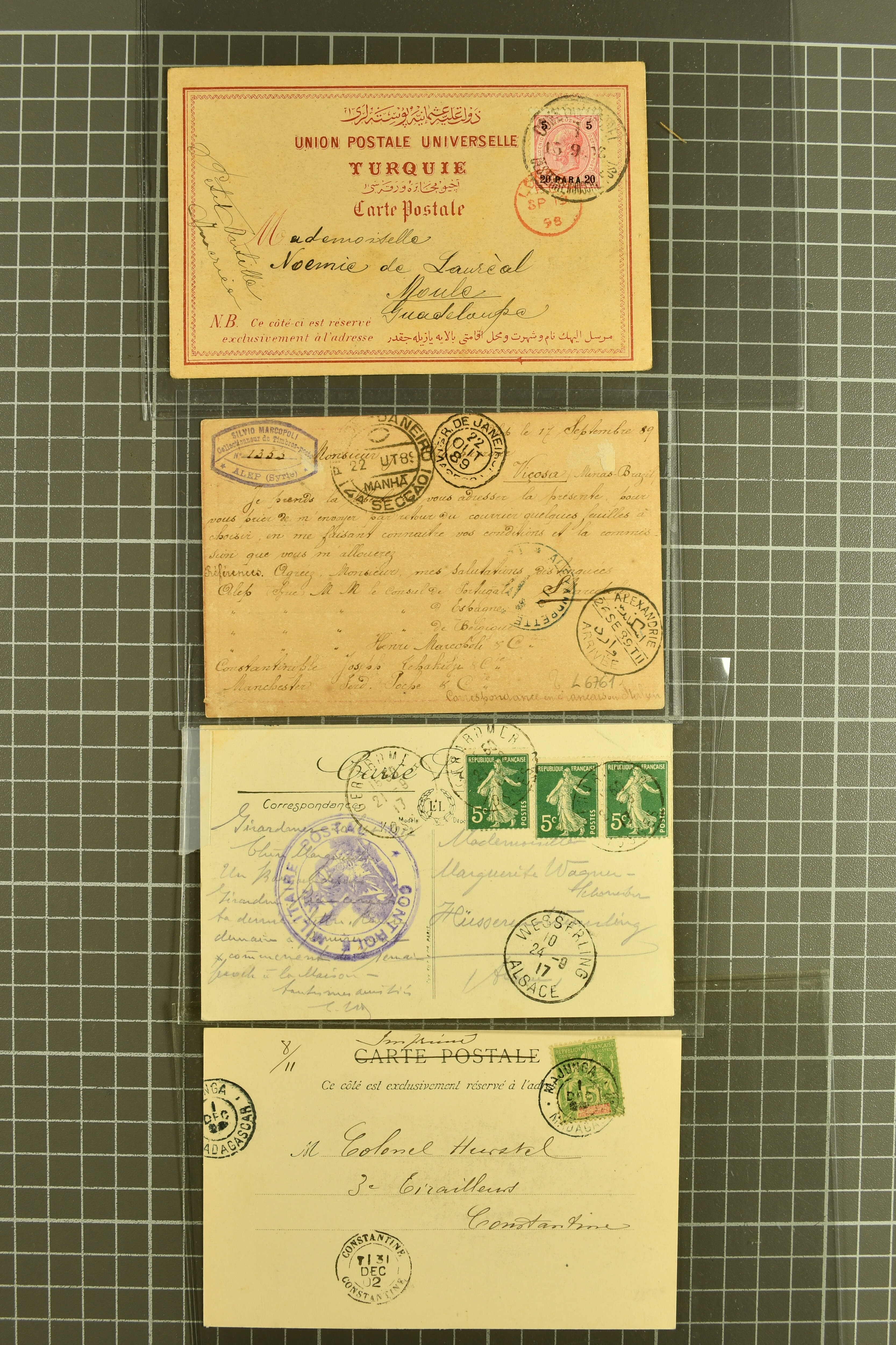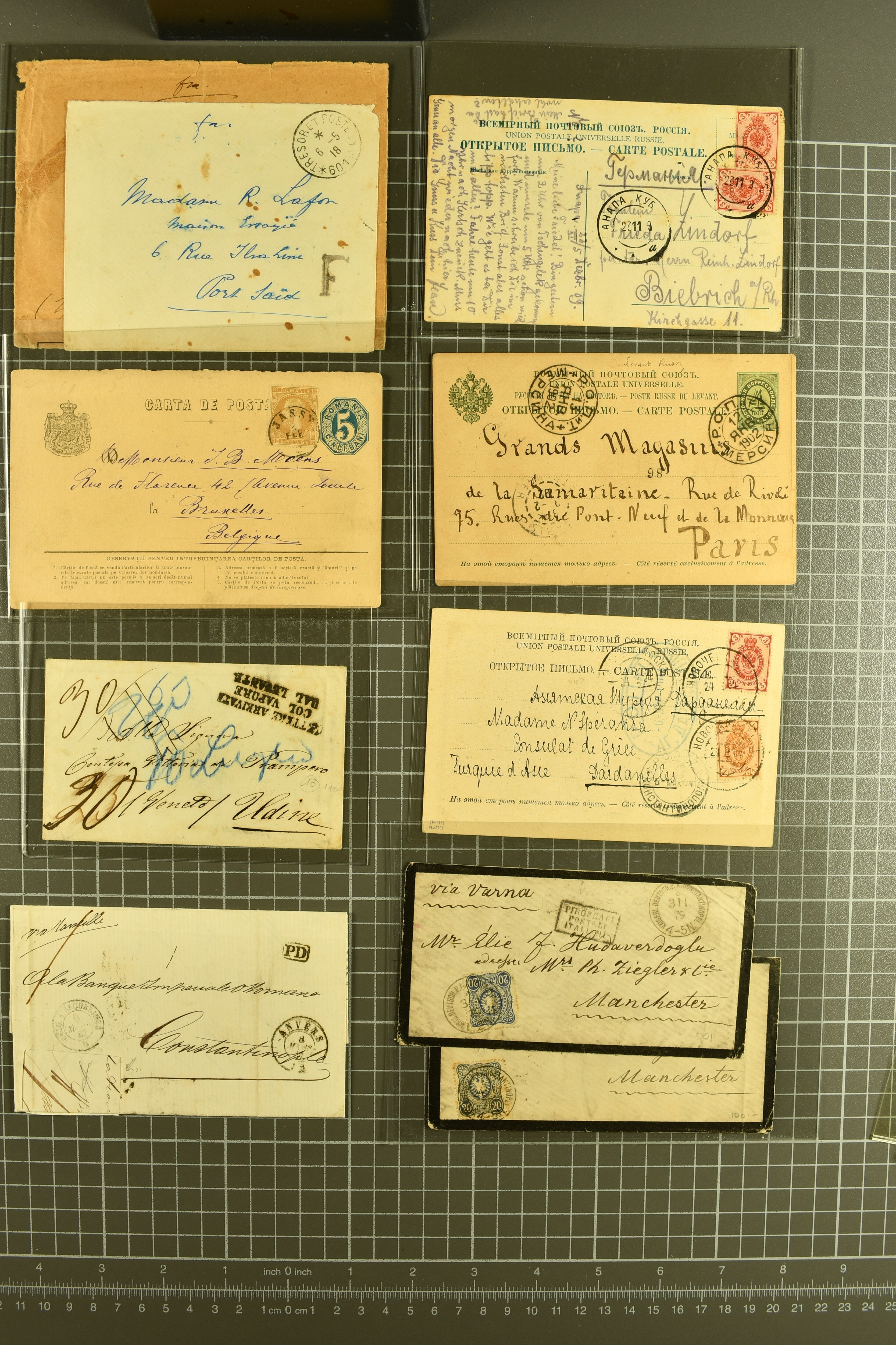 1500 cover/bof image1867/1920: Diverse group of covers/cards (20) and some loose with 1877 cover from Brousse, Turkey with Germany 20 pfe. to Lyon by Italian ship, 1877 cover from Constantinople with Germany 20 pfe. blue pair tied German P.O. in Cosp., and two covers from same Office to Manchester, 1902 Russian Levant 4 k. green card used from Mersina, 1902 cover to Rixheim bearing Vathy 1 pi. on 25 c. black on rose tied by "Vathy / Samos" cds, 1905 Turkey 20 pa. card used from Nevrocope, 1911 card with Russia 2 x 3 k. red tied "Anapa" cds, 1913 Balkan War cover registered from Russian P.O. in Constantinople to Xanthe via Rustschuk franked at 2 piastres, 1920 card from Czechoslovak forces in Vladivostock to Brno with circular violet cachet "Soud Vojenskych Gosti D.V. Ve Vladivostoku", French Military cover with "Forces Navales en Extreme Orient / Flotille du Yang-Tsi-Kiang / Canonière Fluviale Balny" cachet on reverse etc (Image 1) (Image 2) (Image 3)