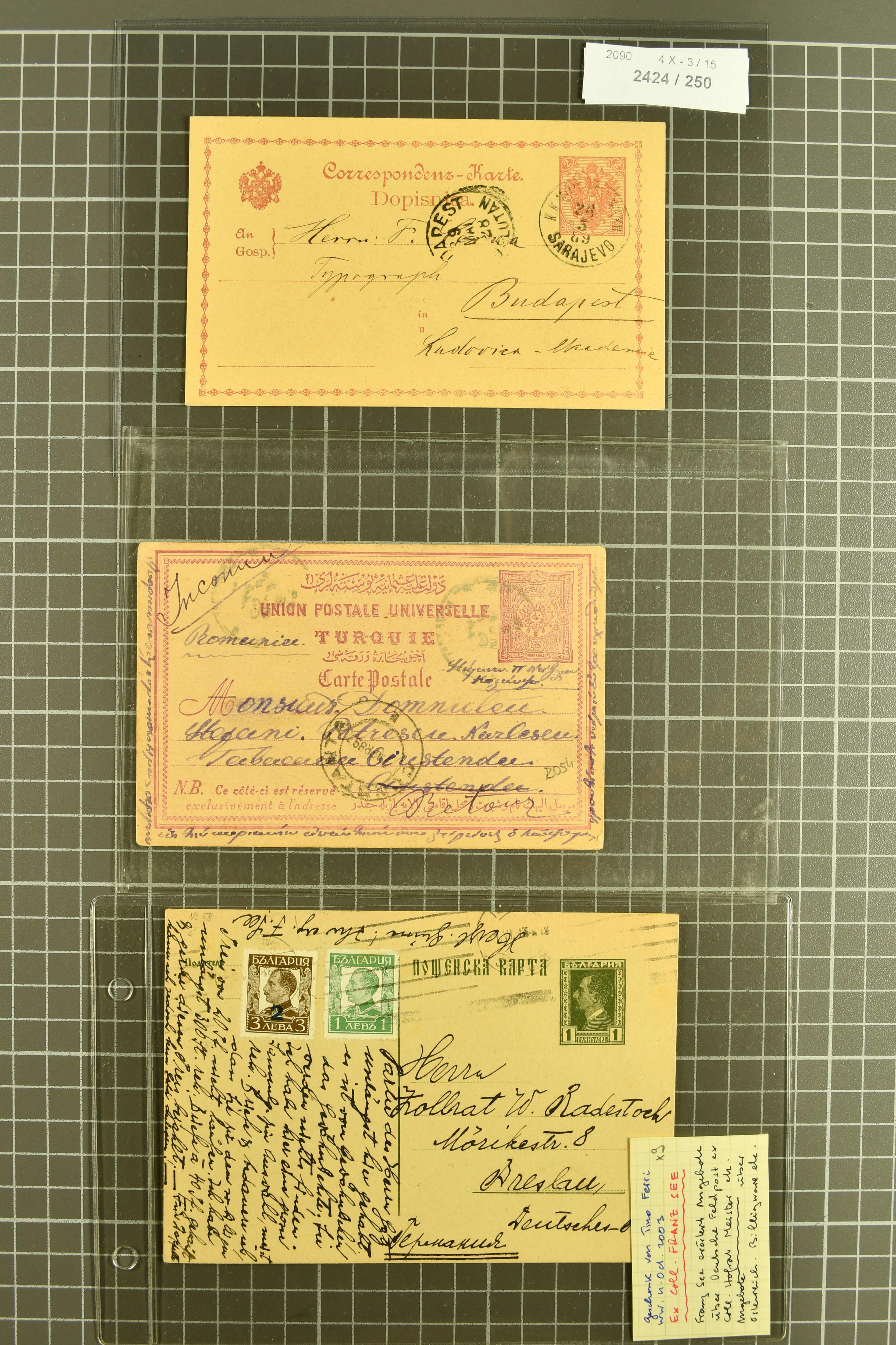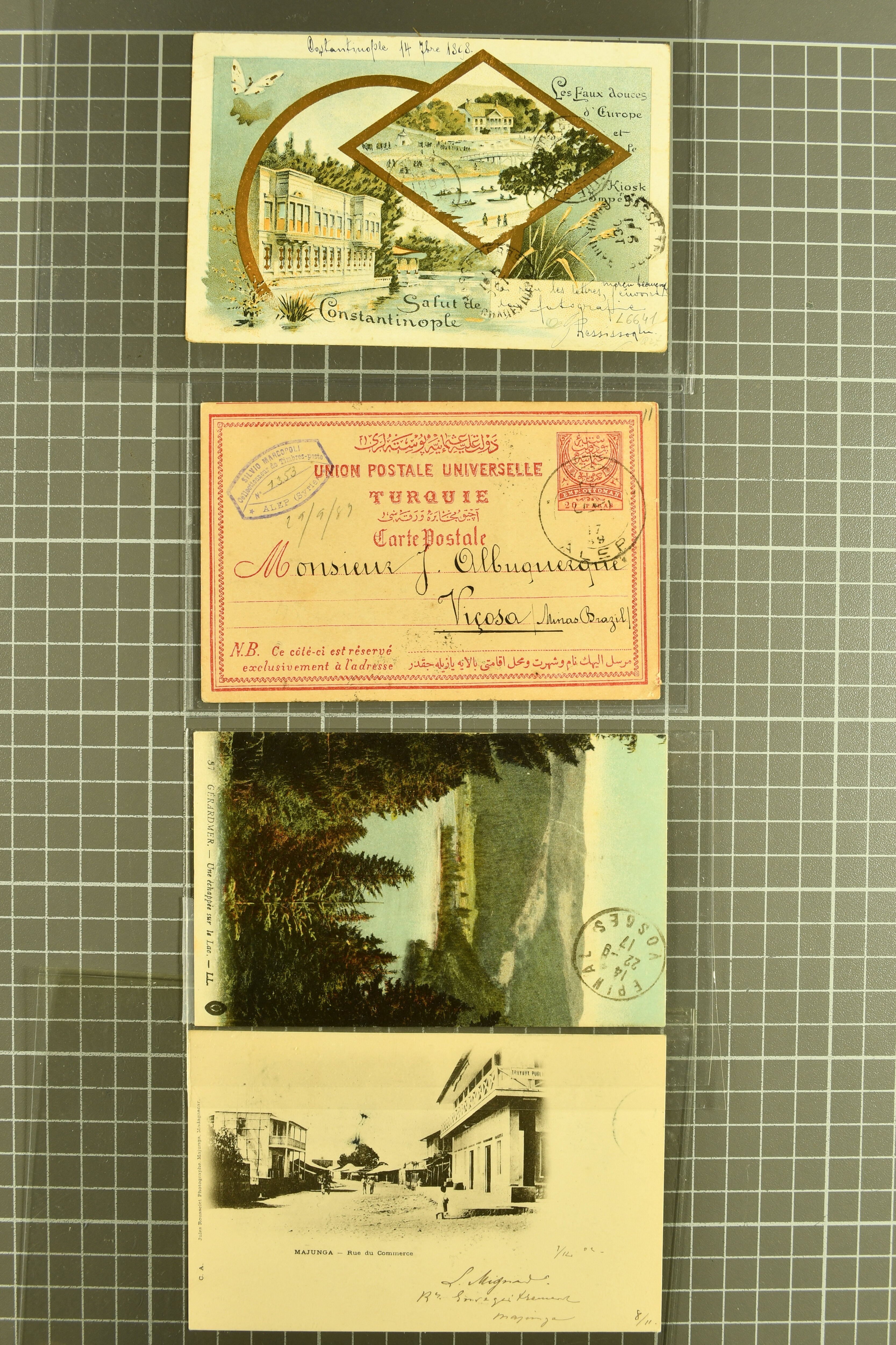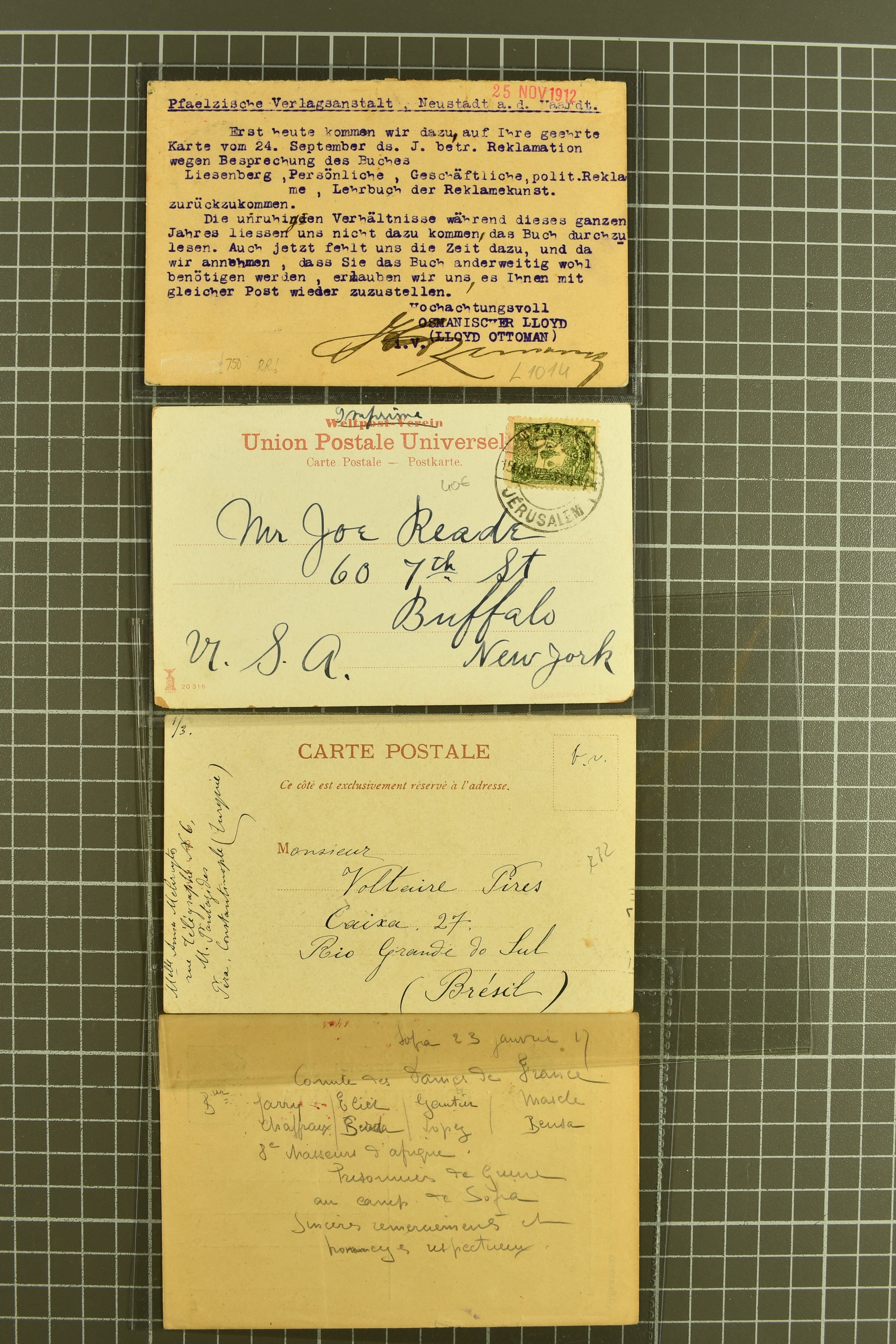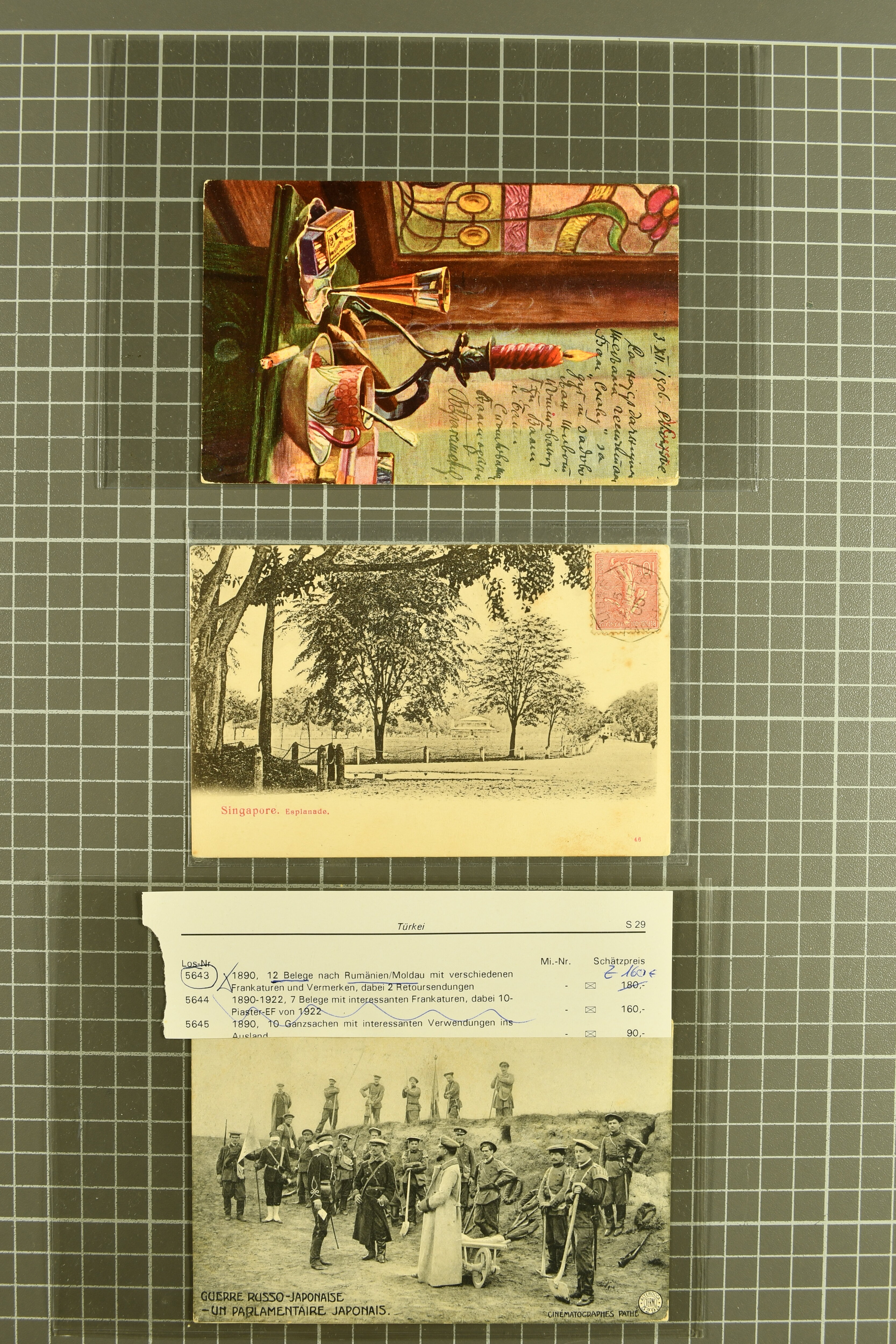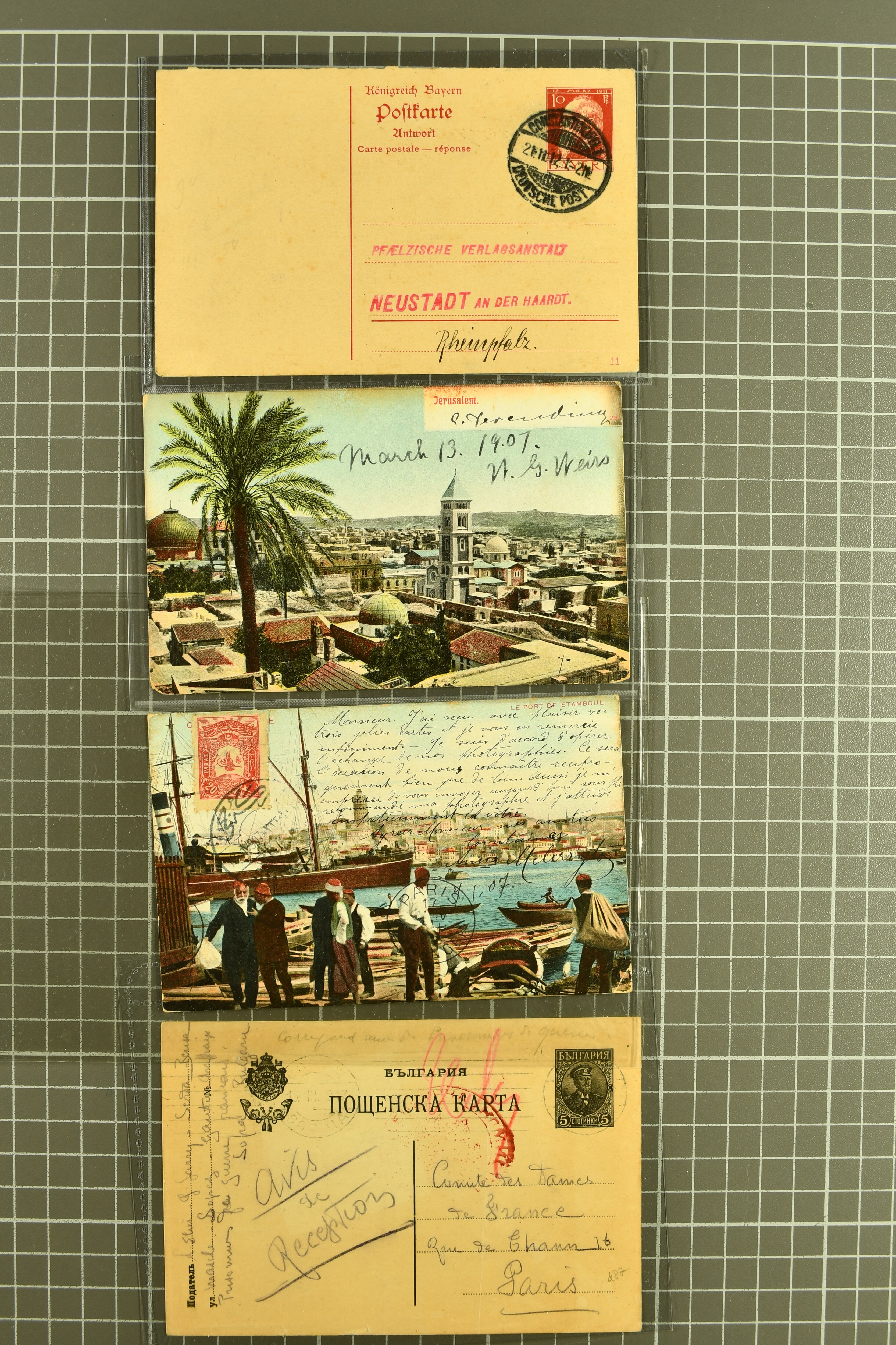 1500 cover/bof image1867/1920: Diverse group of covers/cards (20) and some loose with 1877 cover from Brousse, Turkey with Germany 20 pfe. to Lyon by Italian ship, 1877 cover from Constantinople with Germany 20 pfe. blue pair tied German P.O. in Cosp., and two covers from same Office to Manchester, 1902 Russian Levant 4 k. green card used from Mersina, 1902 cover to Rixheim bearing Vathy 1 pi. on 25 c. black on rose tied by "Vathy / Samos" cds, 1905 Turkey 20 pa. card used from Nevrocope, 1911 card with Russia 2 x 3 k. red tied "Anapa" cds, 1913 Balkan War cover registered from Russian P.O. in Constantinople to Xanthe via Rustschuk franked at 2 piastres, 1920 card from Czechoslovak forces in Vladivostock to Brno with circular violet cachet "Soud Vojenskych Gosti D.V. Ve Vladivostoku", French Military cover with "Forces Navales en Extreme Orient / Flotille du Yang-Tsi-Kiang / Canonière Fluviale Balny" cachet on reverse etc (Image 1) (Image 2) (Image 3)
