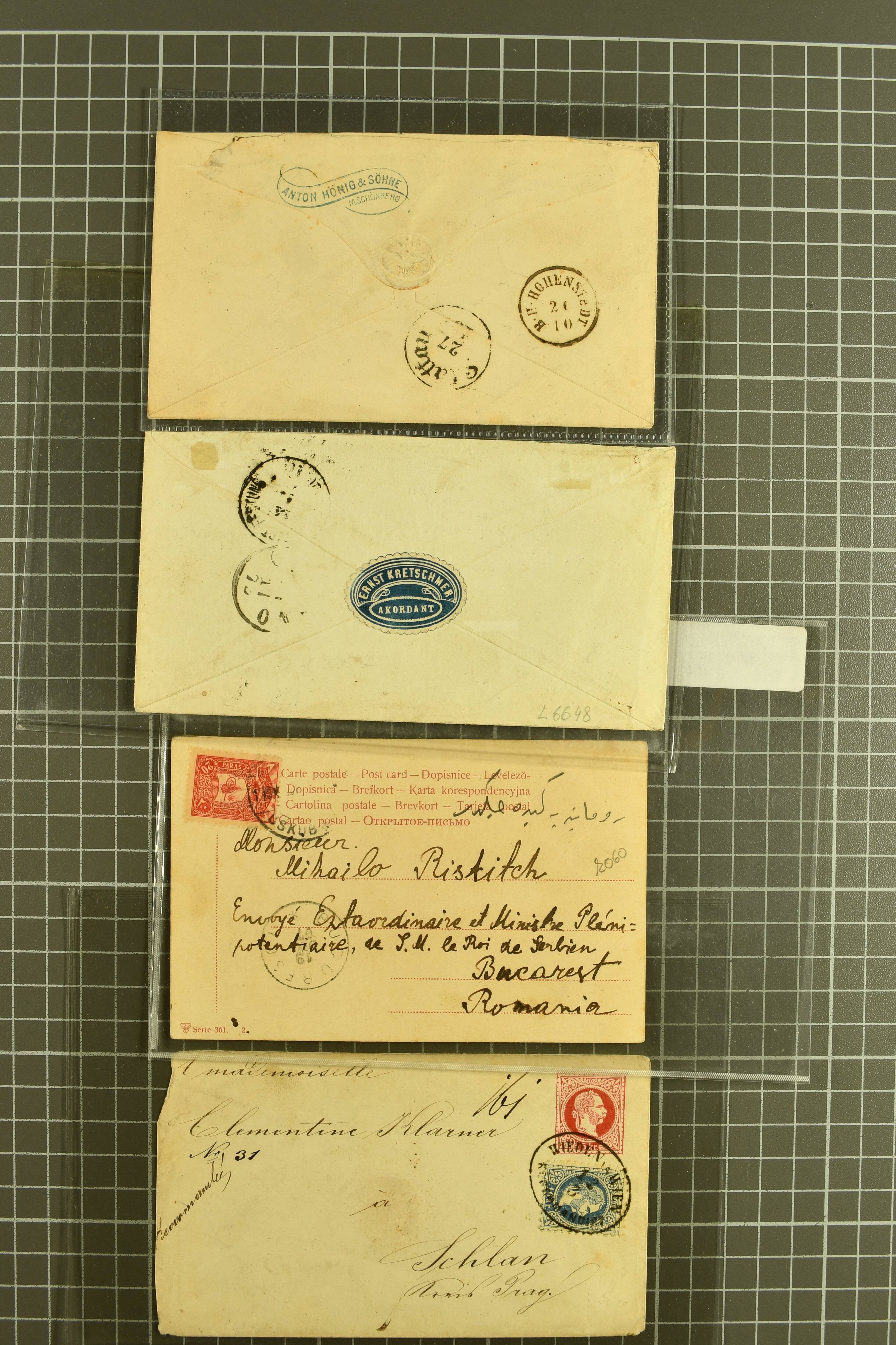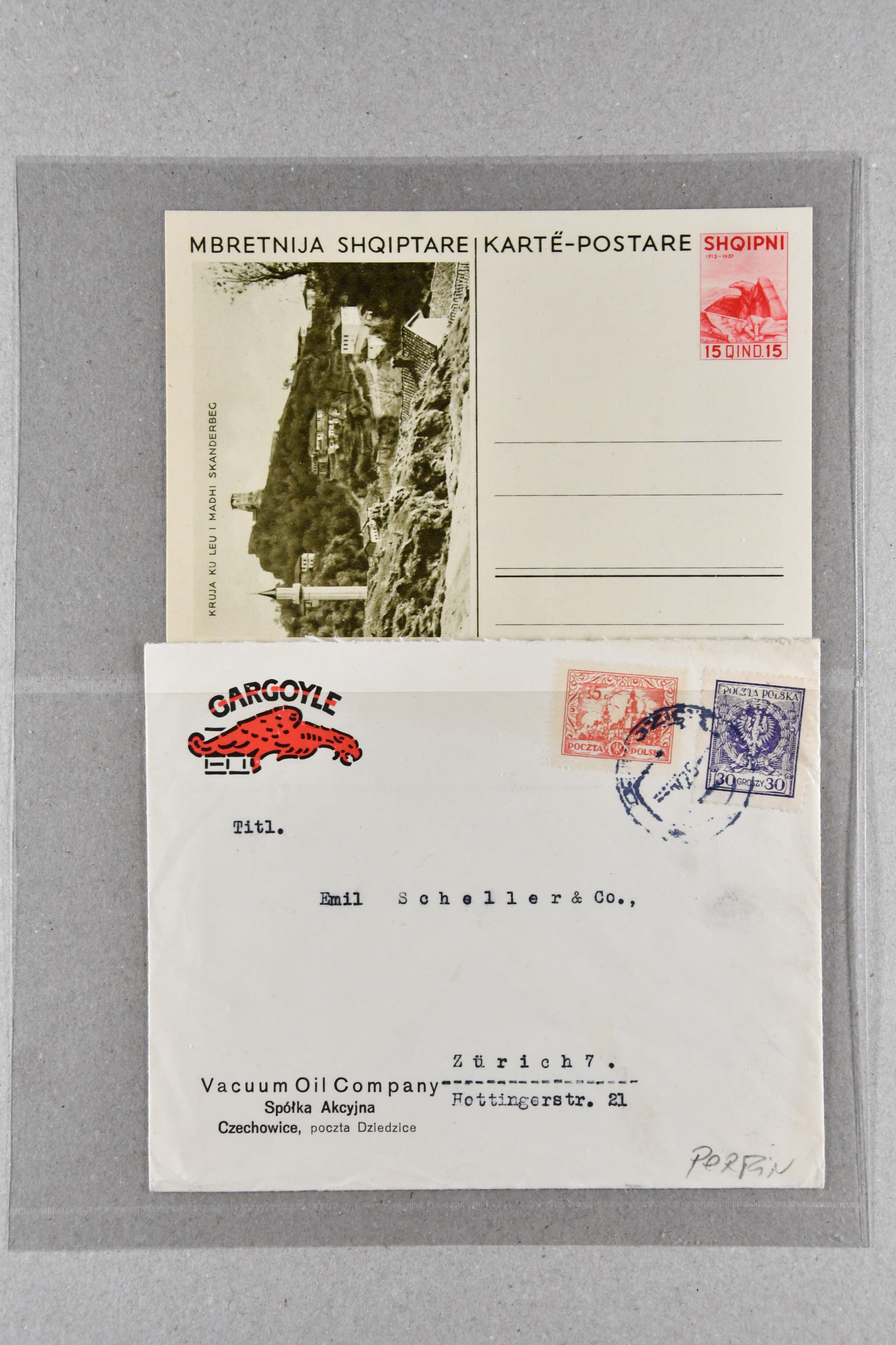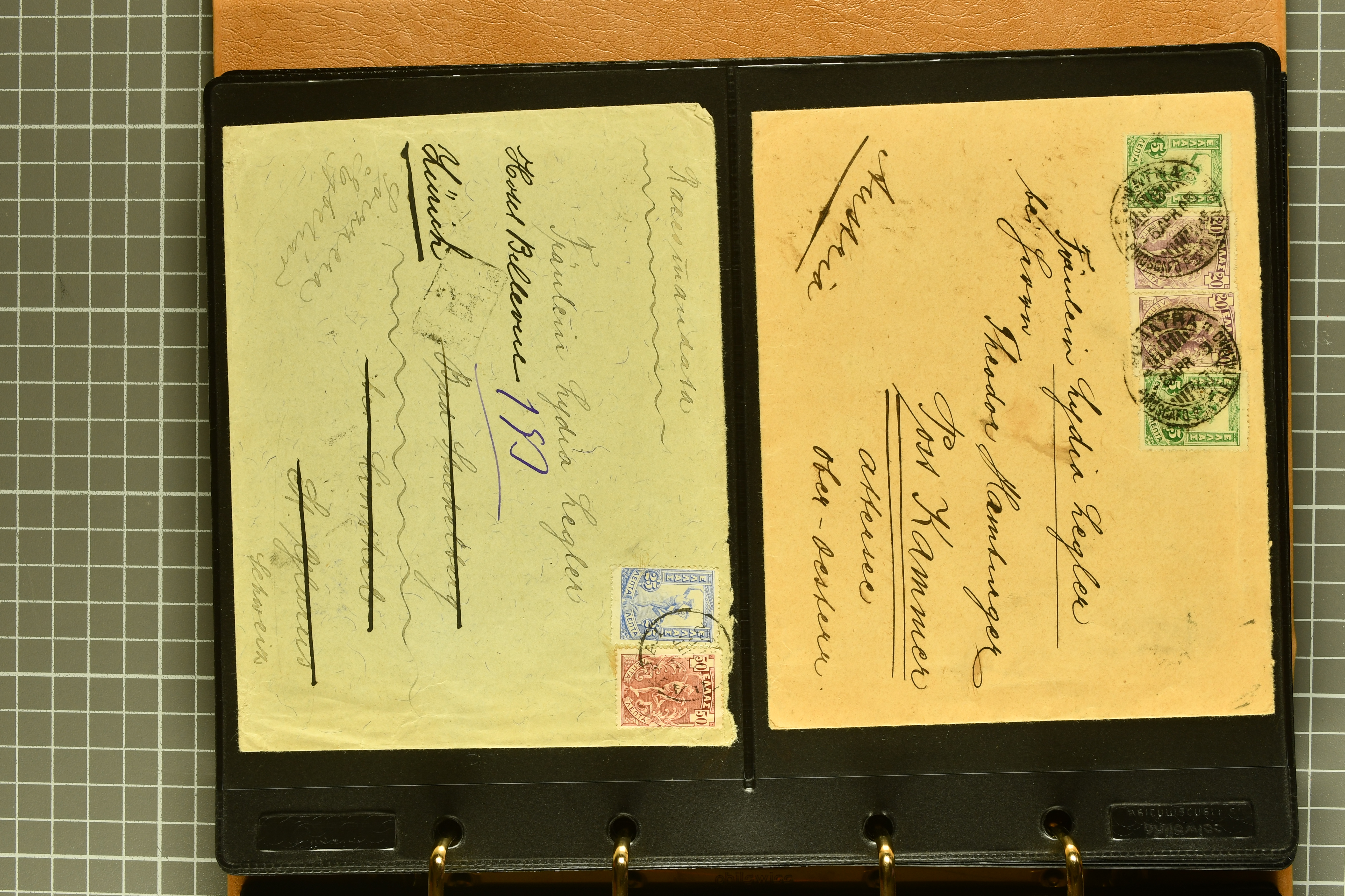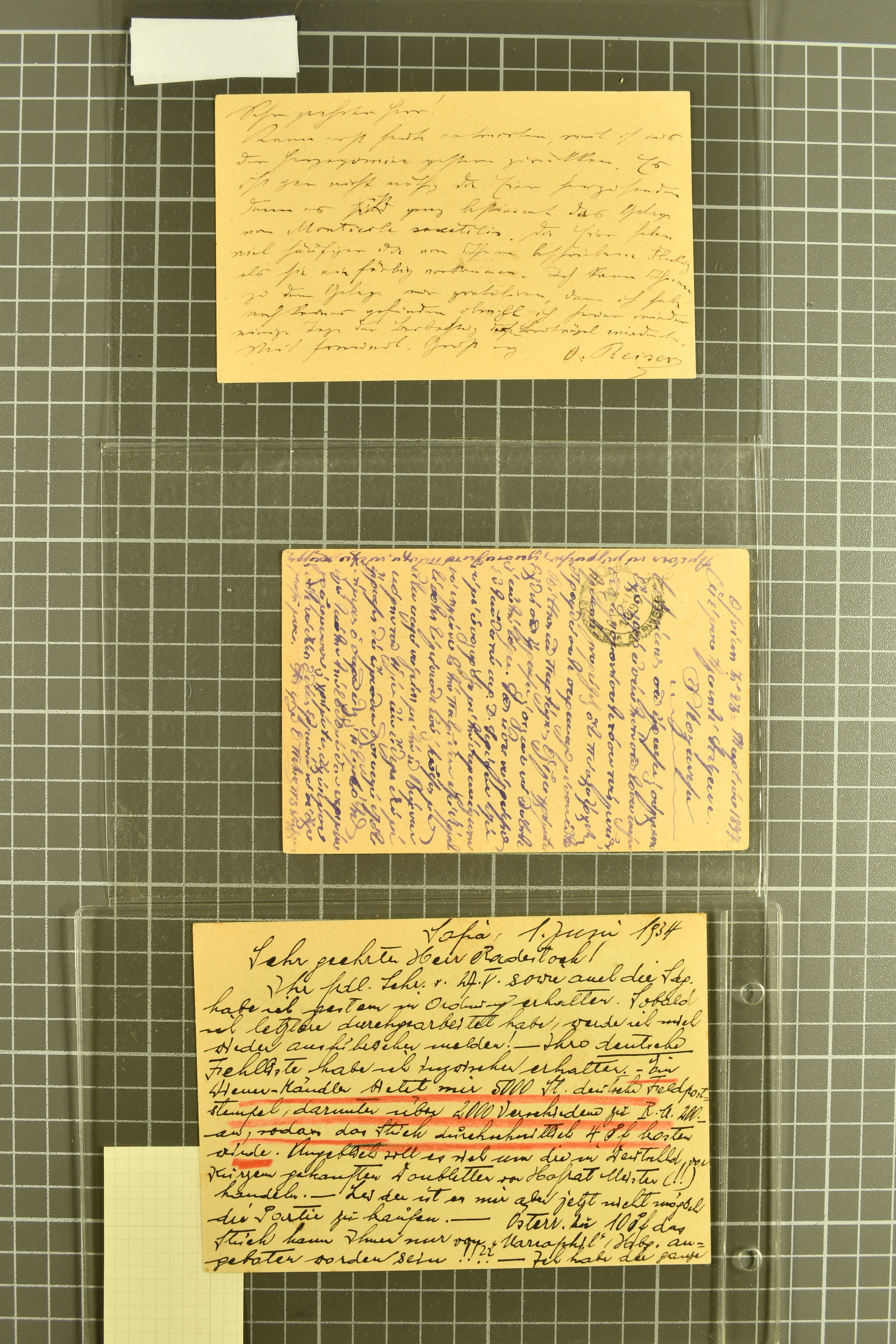 1501 cover image1870/1950c: Group 111 covers / postcards worldwide with many interesting usages including Bulgaria stationery cards from a French WWI POW in Bulgaria to France and to a Bulgarian POW in France with the corresponding censorship cancellations, a 1934 postcard written by Franz See; Poland two 1919/20 stationeries; Czechoslovakia 1929/31 three express stationery postcards; Hungary 1820 envelope from Buda Festung Ofen "F. OFEN" to Modern (Müller 1049a), 1917 complete stationery parcel card Sopron to Constantinople Turkey with 2 kr Franz-Josef & 25 f. Turul; Latvia airmail cover 1928 Riga to Luzern Switzerland, DERULUFT Riga, Invalid stamps; Austria three 1864/67 stationery envelopes with additional frankings, postcard 1898 from Austrian PO in Constantinople to Gouadeloupe, 1889 postcard from FPO Sarajevo; France Alsace française 1917 Gerardmer to Wesserling, censure militaire, 1902 PC from Majunga Madagascar; Romania 1907/21 three PC's to Constantinople or Smyrna; Russia eleven imperial covers / stationeries incl. MTF's; Tunesia 1939 first airmal service Marseille Tunis Damascus; Great Britain 1943 three censored covers to Switzerland; Bavaria 1906 registerd cover to Simla, then Calcutta with Aden Sea Post cancellation, response postcard used 1912 from Constantinople; German Empire PPC Darmstadt to Paris, forwarded to Riga Russia 1909, combination franking with 10 pf. and 10 c.; Belgium 1902 express postcard, 1907 card with punctured and embossed corners; Netherlands 1938 Airmail First flight Amsterdam Batavia Sydney; Ottoman Empire 1907 postcard to New York, four cards to Brazil and five to Romania; Singapore 1905 picture postcard French Ship Mail Ligne N PAQ FR No 8 to France; further items from Japan, Lebanon, Serbia, Sweden, Hyderabad, India, Switzerland, Mexico, Cuba, Egypt, and Finland, in addition India 1957-70, group 48 First Day Covers (Image 1) (Image 2) (Image 3) (Image 4) (Image 5) (Image 6) (Image 7) (Image 8) (Image 9) (Image 10) (Image 11) (Image 12) (Image 13) (Image 14) (Image 15) (Image 16)