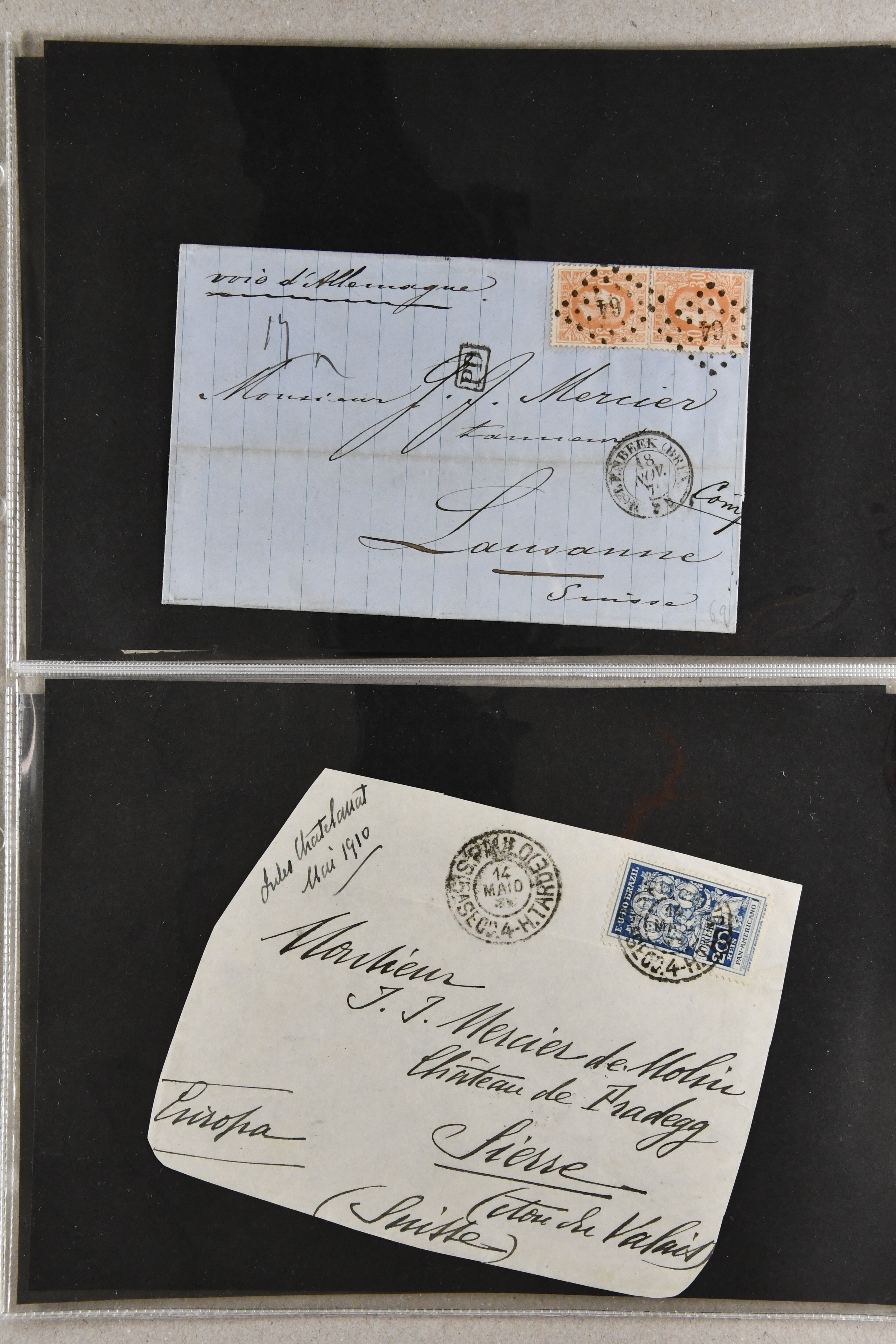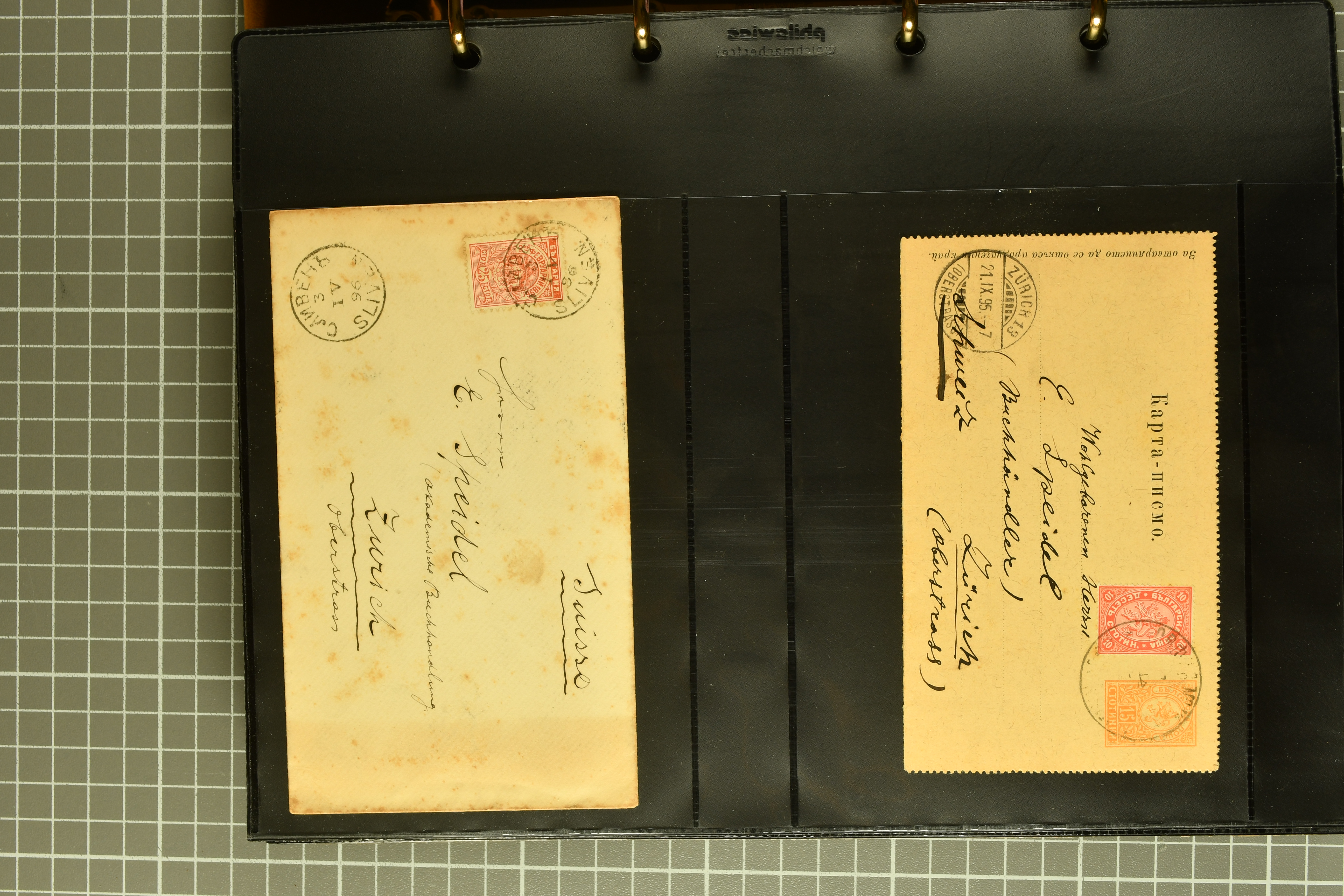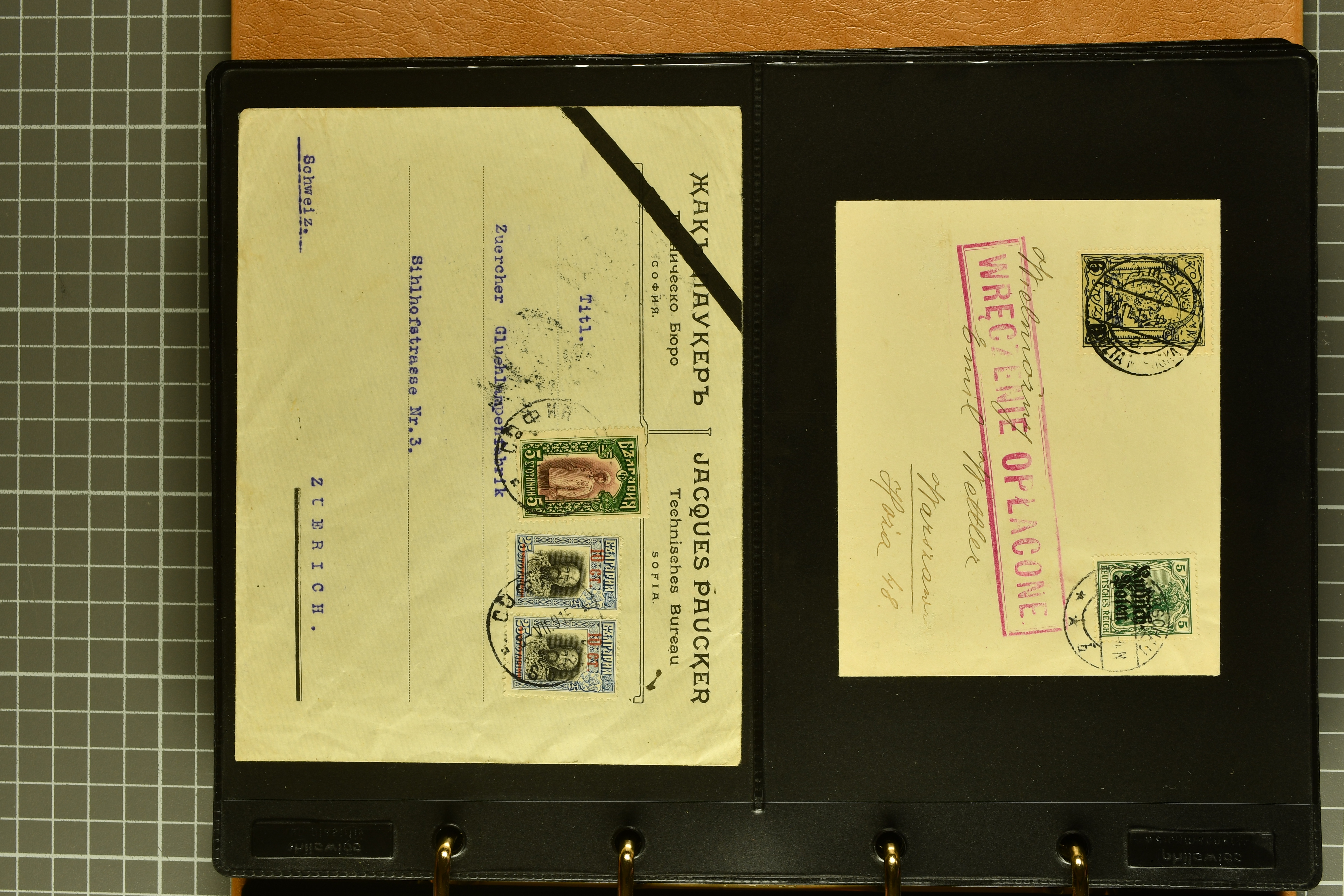 1503 cover 1775/1921: Interesting and desirable diverse lot of old covers and cards in somewhat mixed condition. Including folded letter from Cap d’Haiti with “Colonies par L’Isle de Ré” cancel to Bordeaux; four covers with President Salomon issues – two to Germany, one to Switzerland, one to the USA; folded letter from Antwerp to Alexandrette 1861; German stationery postcard 'Nur für Marineschiffspost' 1897 from Smyrna to Wilhelmshaven (Cretan blockade); Austrian Levant, three covers 1872/79, one to Sarajevo; Austrian Levant issue for Crete used in Vienna; registered cover from New Caledonia 1903 with attractive franking to Lucerne; small archive of French Morocco picture postcards from military senders to Switzerland; cover with Temesvár issue and Romanian stamps to Switzerland 1921; Hungary, two covers from Orsova to Vienna 1876 and to Widdin (Bulgaria) 1887; Russia, 3 k. stationery postcard with uprated 1 k. stamp (1866 issue) with local post cancel “No 225” to Poland; three covers from the Netherlands including a three-colour franking to Trieste 1892, and a return cover 1890 routed via Como, Milan, Zürich back to Amsterdam; Mozambique, 10 r. stationery postcard uprated with 50 r. to Antwerp, Belgium; picture postcard from Tiflis Georgia with inflation franking; money bill with franking of 2.1 million roubles for a transfer of 35 million from Шемаха (Schemacha, Azerbaijan); plus two older picture postcards from Russia