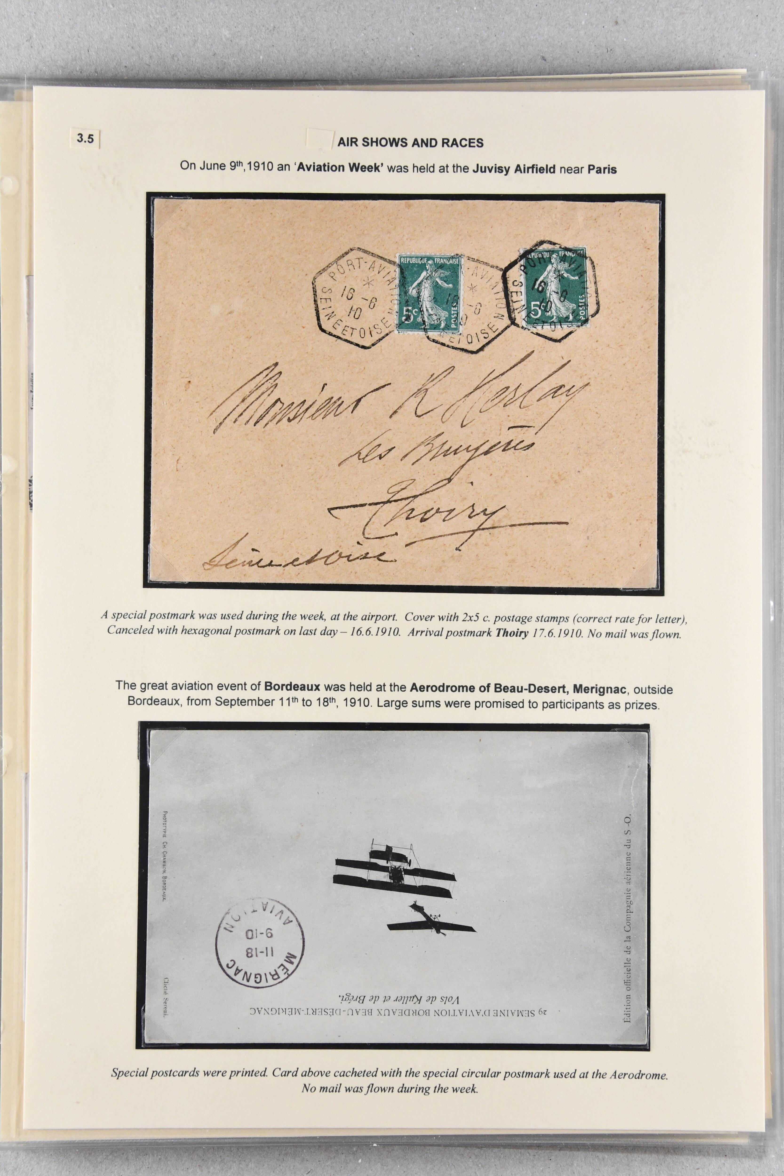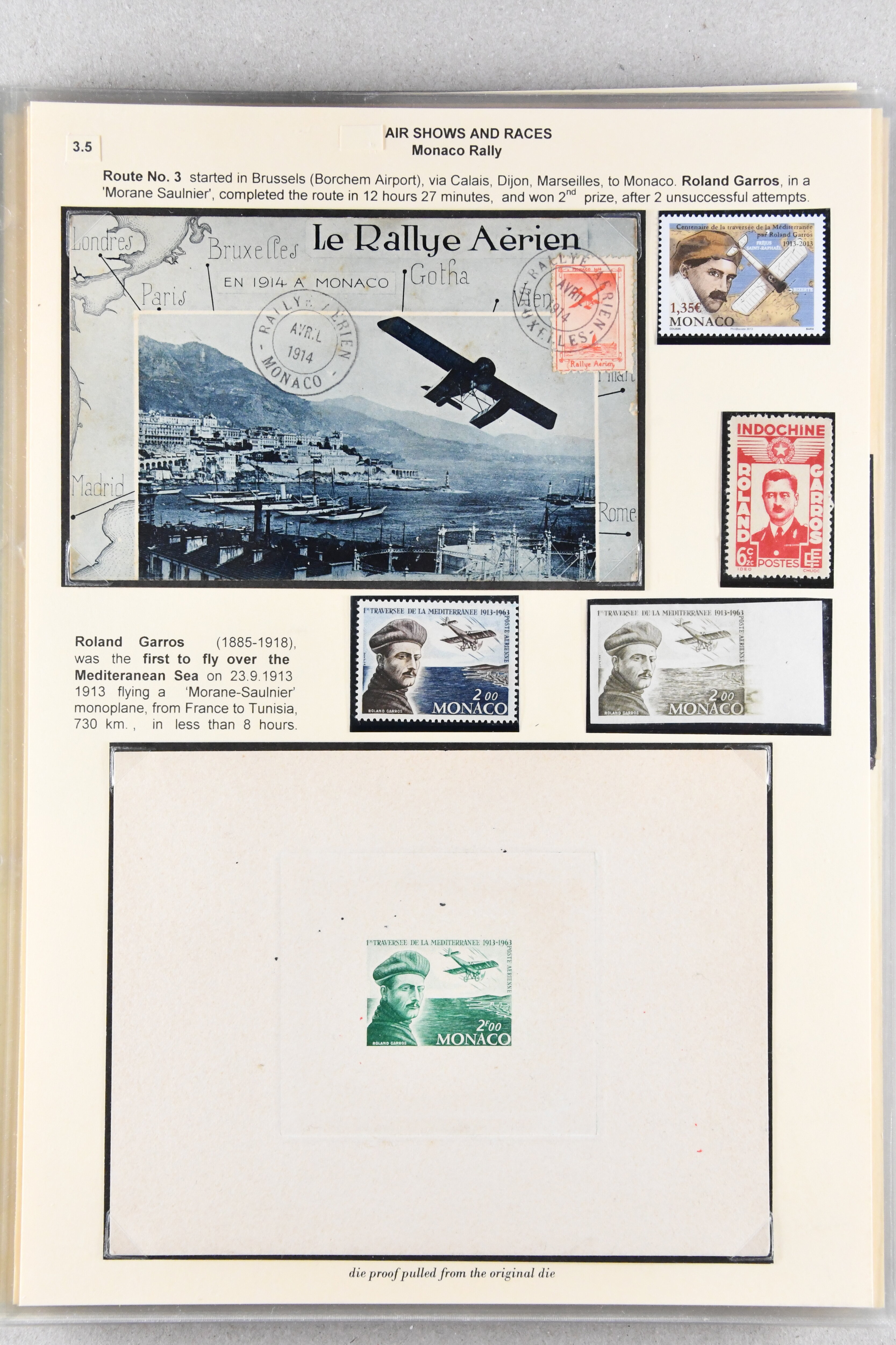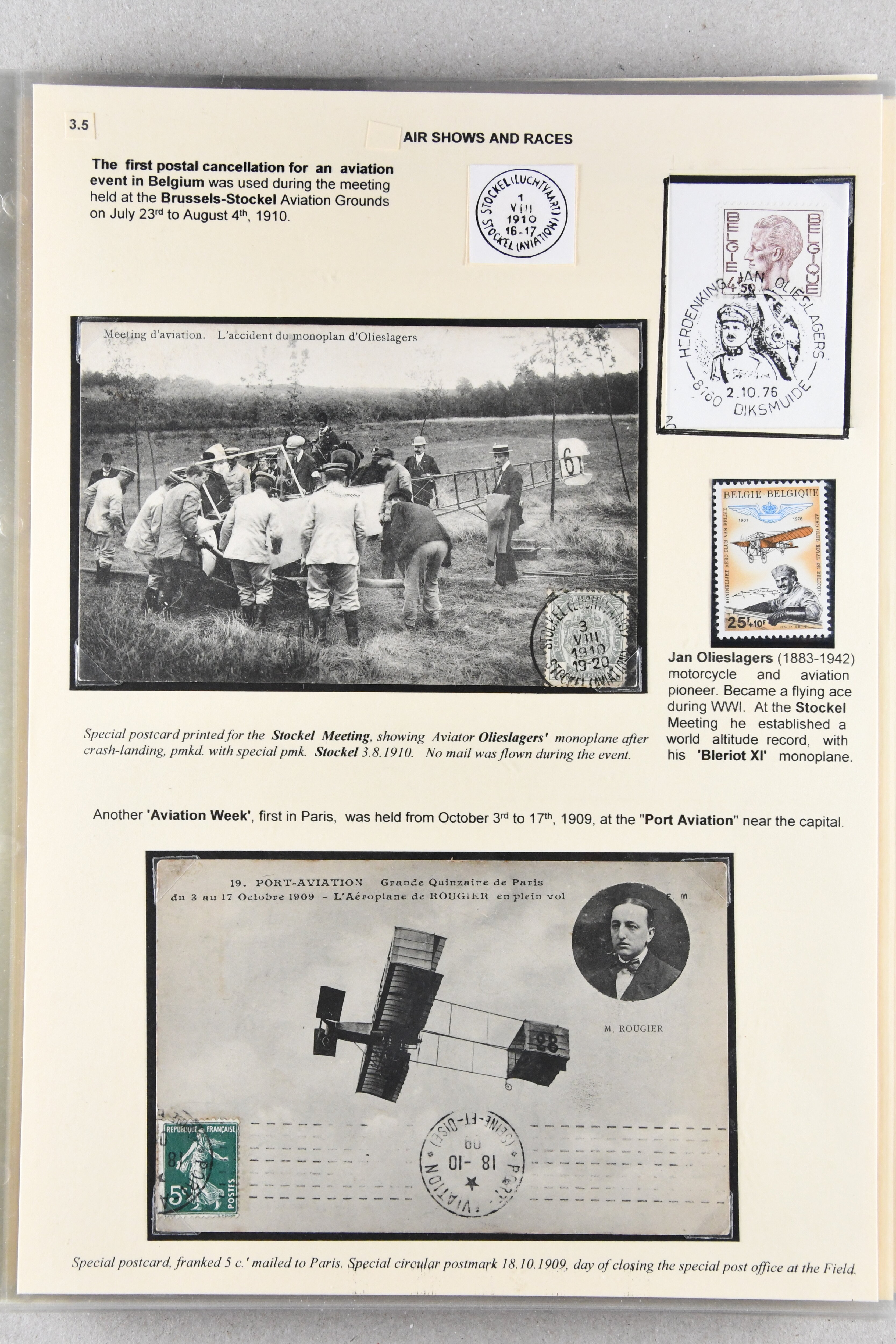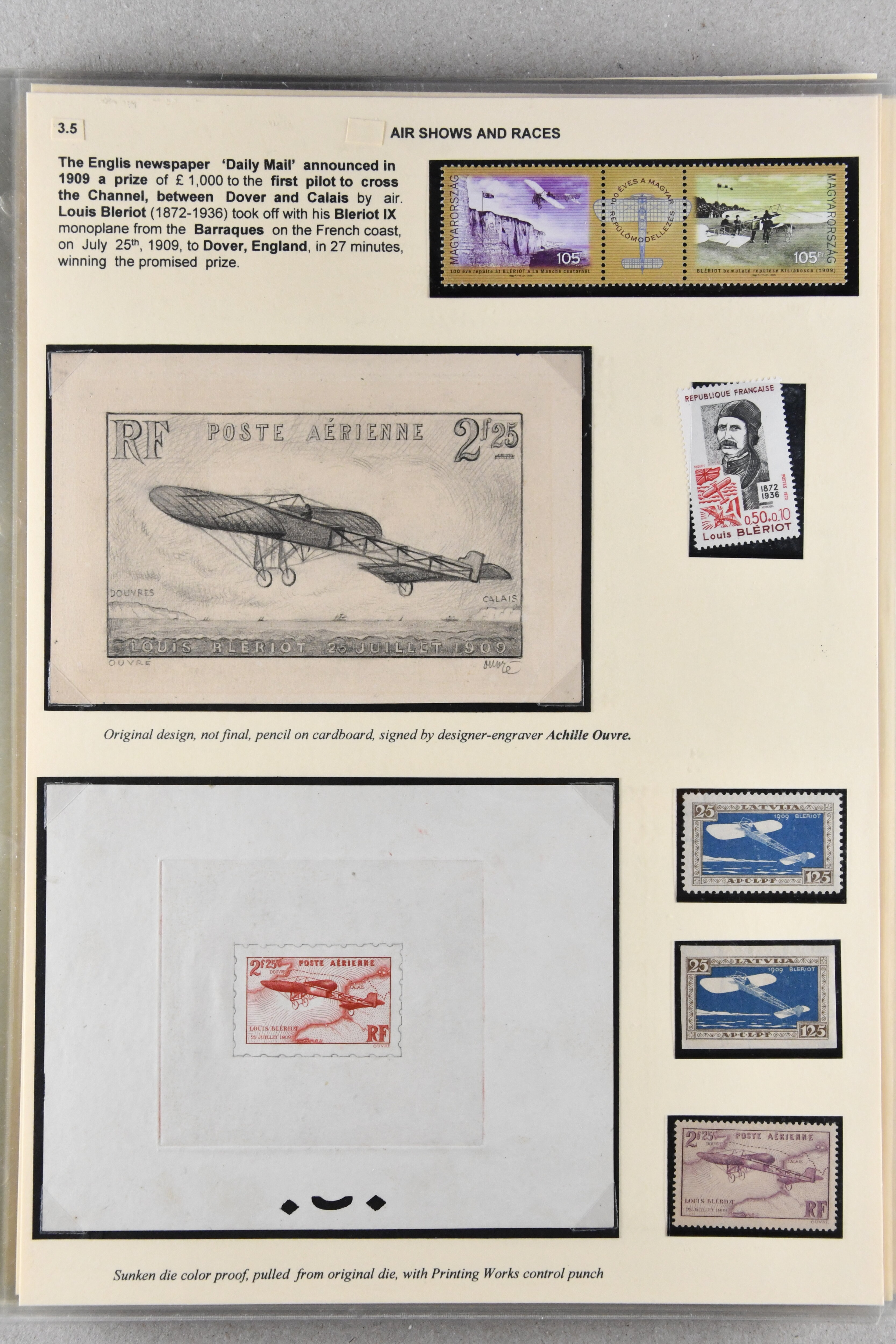 1490 **/*/cover/(*) image1888/2015: Collection of Airshow, Race and Pioneer Flight material, set-out on 25 exhibition pages, comprising over 100 items, including Proofs, an artist's original design drawing signed by engraver Achille Ouvre, special event cards, covers, airmail commemorative stamps, minisheets and a booklet. Noted; 1909 Aviation Week Paris postcard with event postmark, 1910 Henri Farman aviation week post card Rouen, France, also 1910 events in Lyon and Dijon, 1912 experimental flight Nancy to Luneville card with vingnette air mail stamp tied, 1914 The Monaco Air Rally illustrated cards (7), 1914 Air Exhibition Japan card depicting bi-plane take-off with event cachet, 1911 Morocco second event cards/cachet (2), 1912 Stockholm to Lidingö flight material post card damaged by sea water, sunken die proofs (4) and original artwork for Latvia airmail stamps depicting monoplane and assortment of issued airmail stamps. Useful assembly. Ex. The ‘Izhak Barak’ Collection: The Development of Aviation and Transportation of Mail by Air until 1914 (Image 1) (Image 2) (Image 3) (Image 4) (Image 5) (Image 6) (Image 7) (Image 8) (Image 9) (Image 10) (Image 11) (Image 12) (Image 13) (Image 14) (Image 15) (Image 16) (Image 17) (Image 18) (Image 19) (Image 20) (Image 21) (Image 22) (Image 23) (Image 24) (Image 25) (Image 26)
