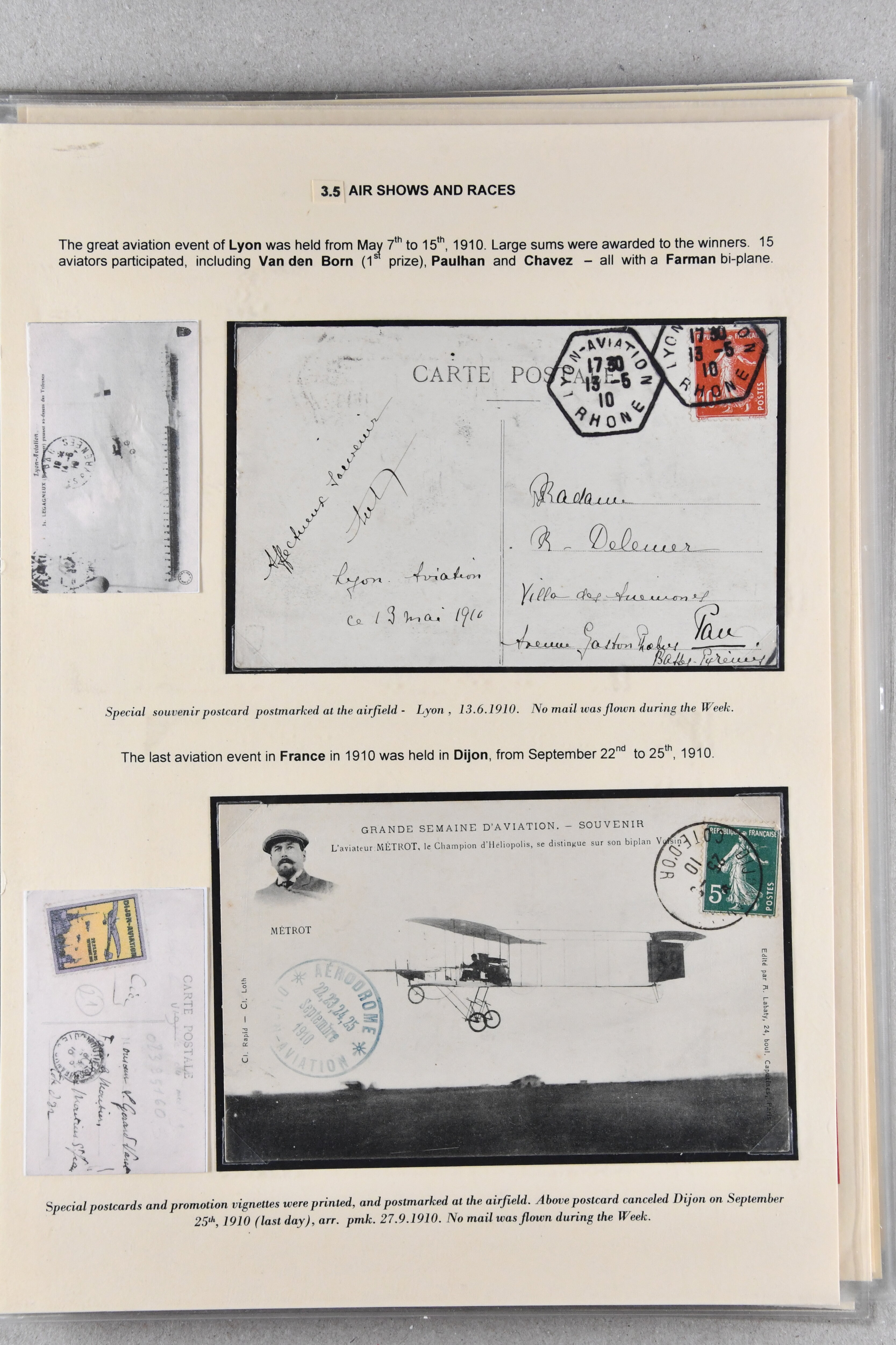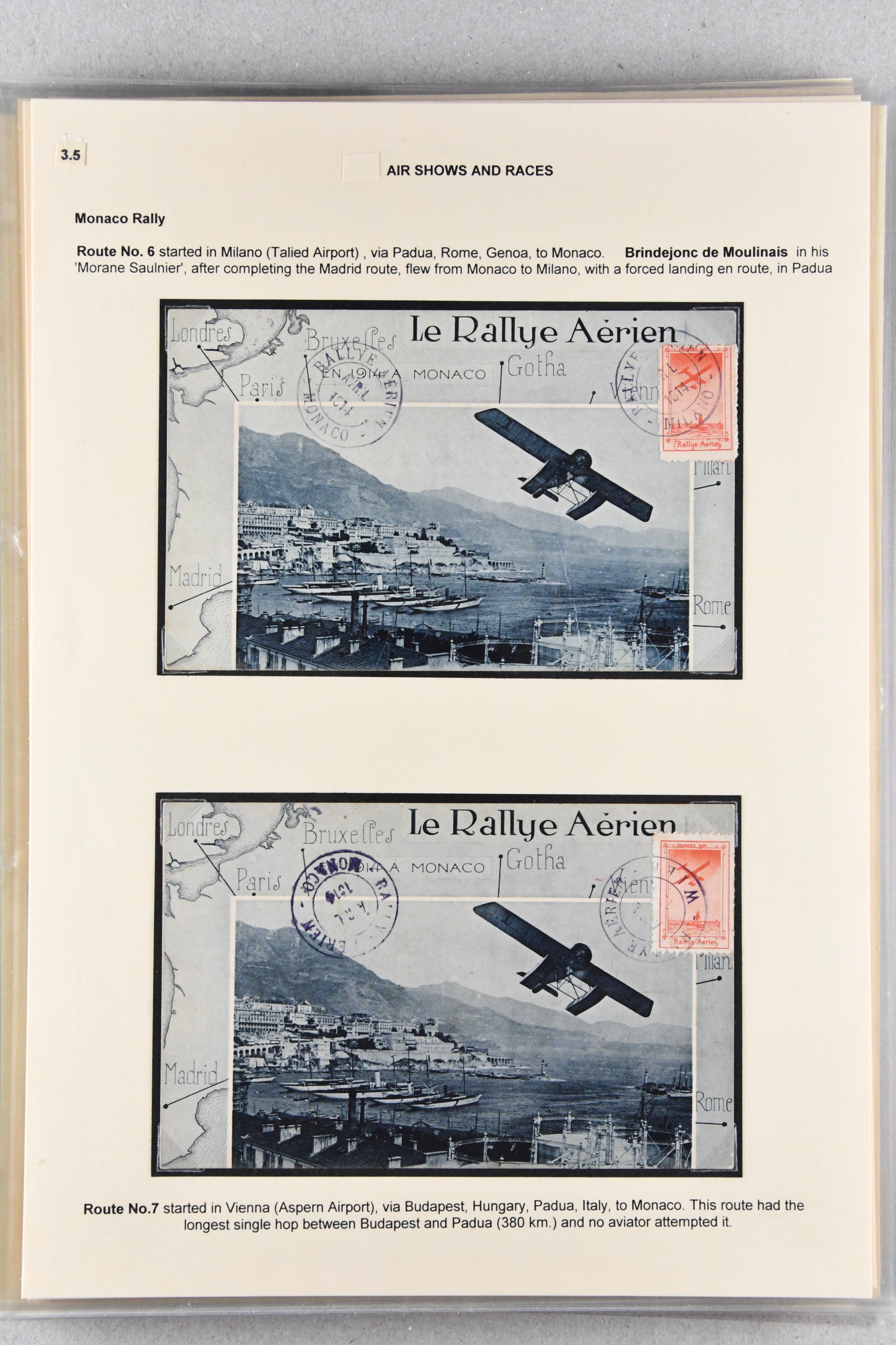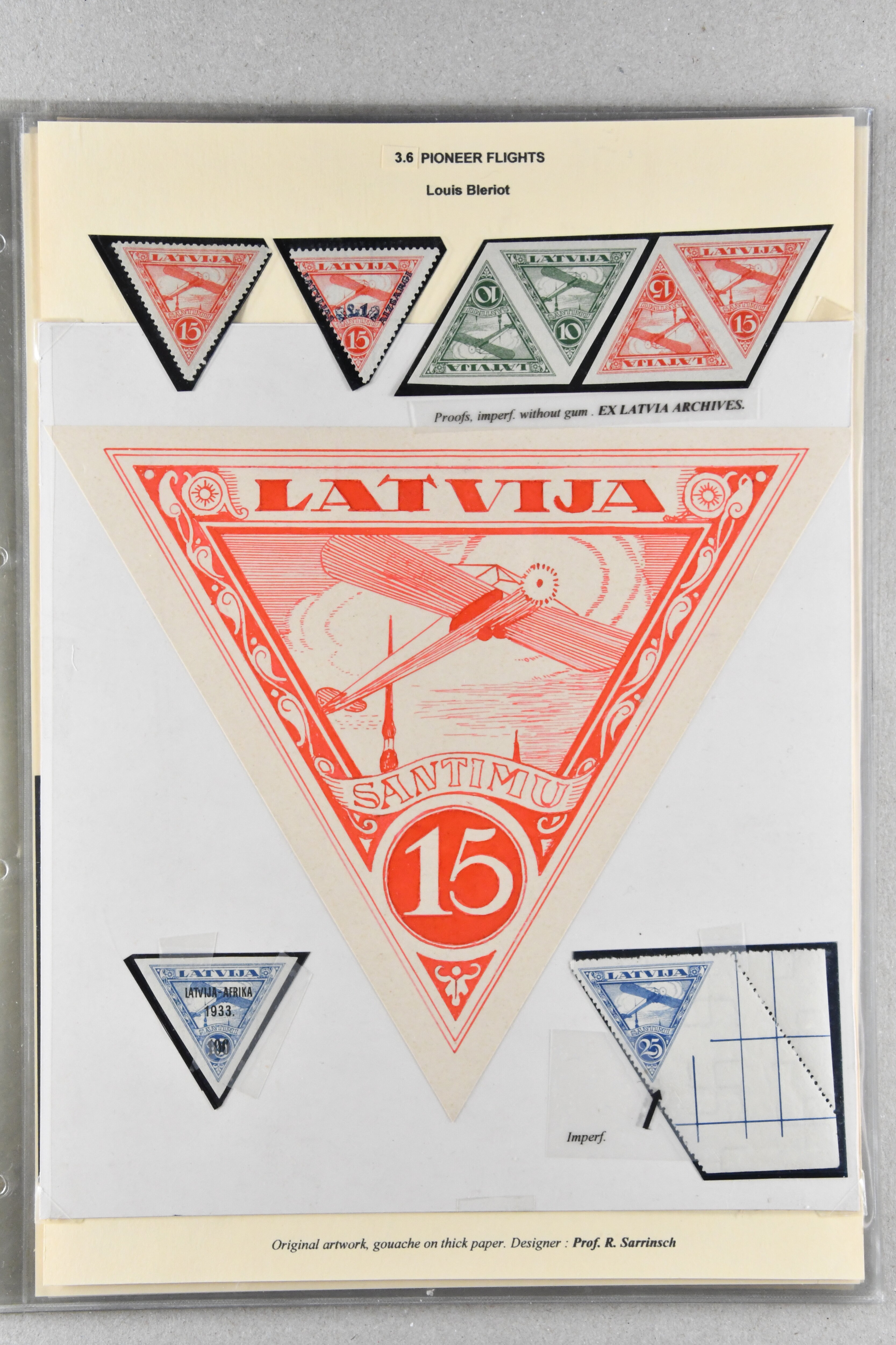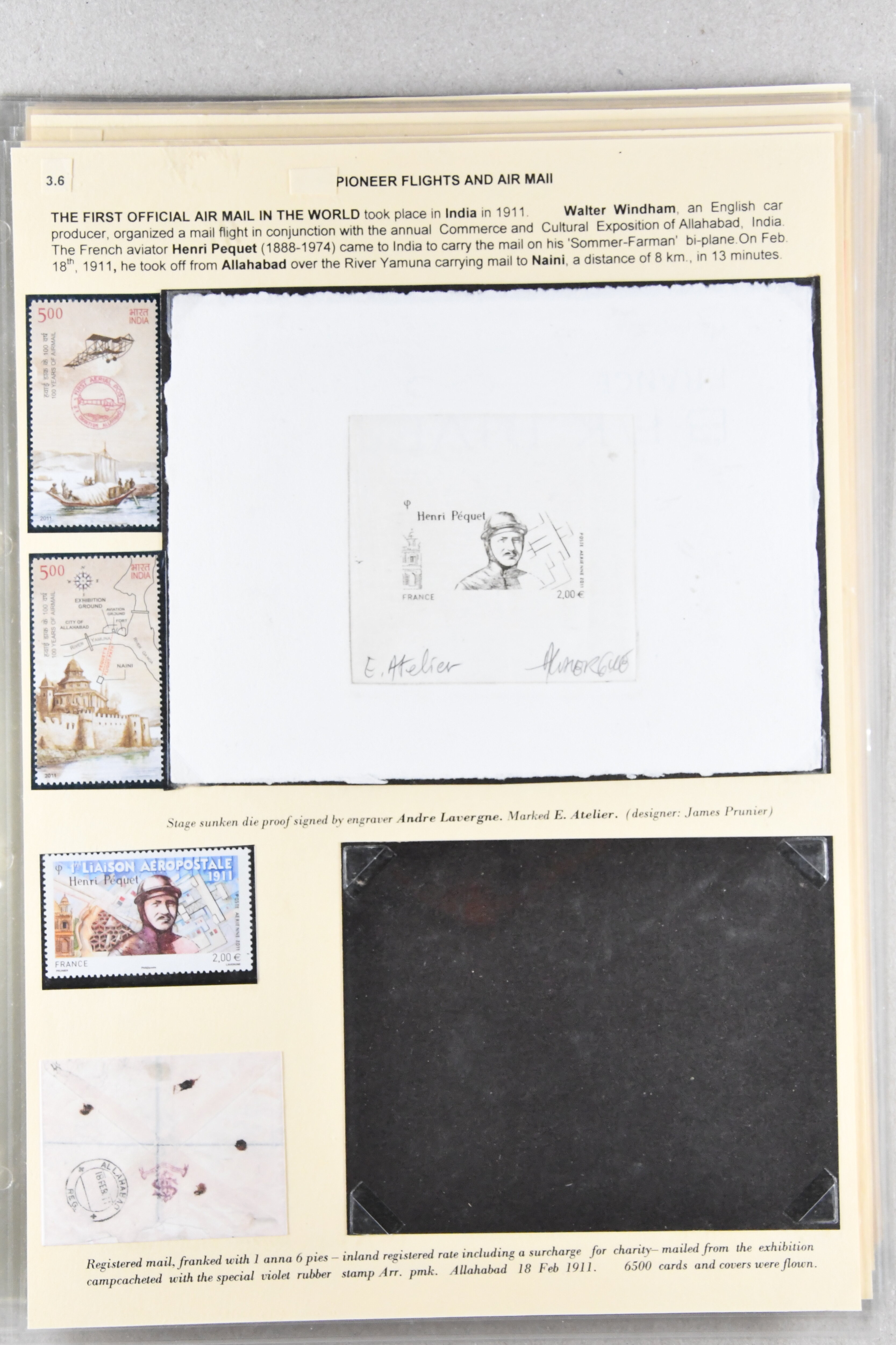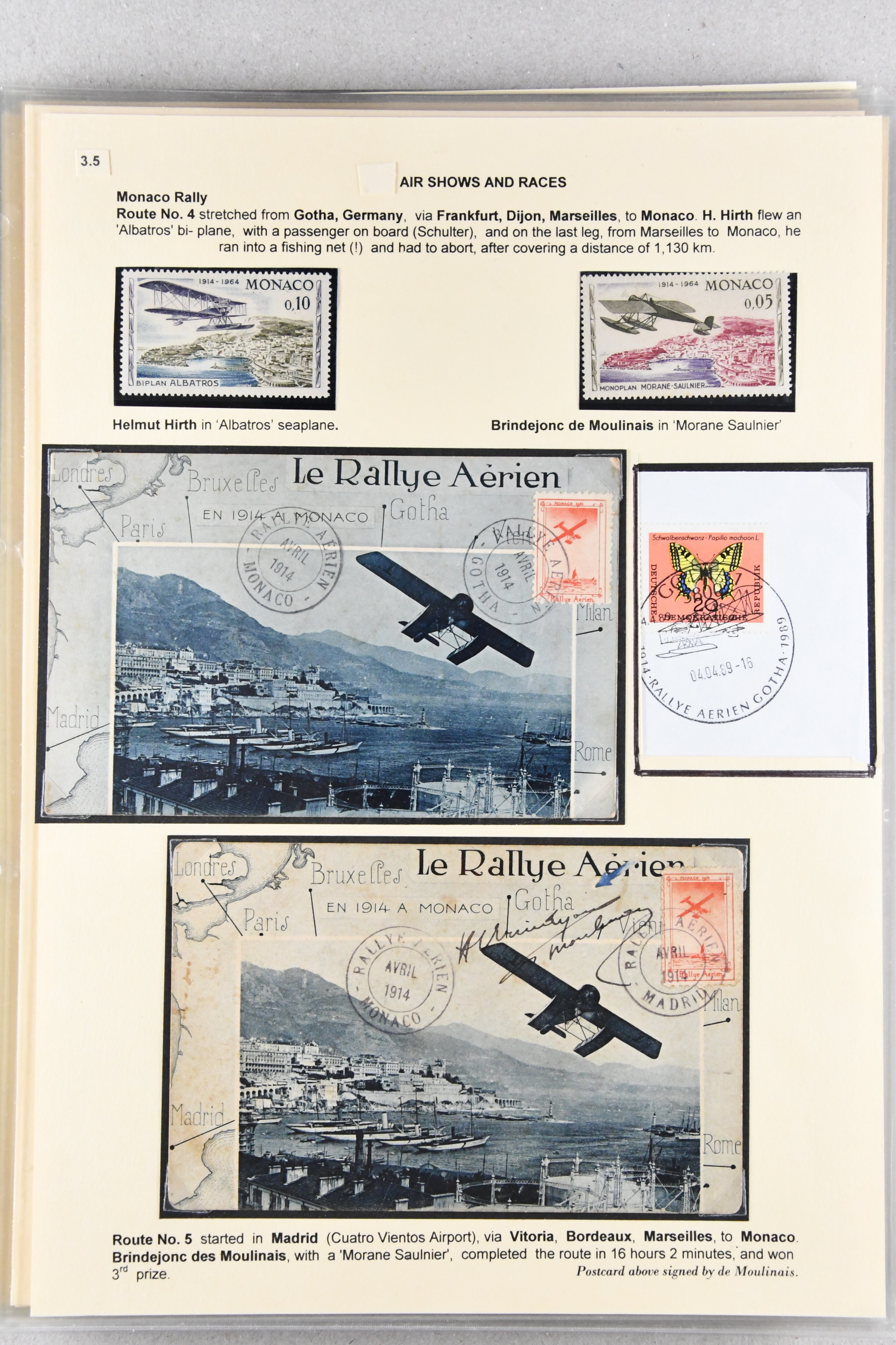 1490 **/*/cover/(*) image1888/2015: Collection of Airshow, Race and Pioneer Flight material, set-out on 25 exhibition pages, comprising over 100 items, including Proofs, an artist's original design drawing signed by engraver Achille Ouvre, special event cards, covers, airmail commemorative stamps, minisheets and a booklet. Noted; 1909 Aviation Week Paris postcard with event postmark, 1910 Henri Farman aviation week post card Rouen, France, also 1910 events in Lyon and Dijon, 1912 experimental flight Nancy to Luneville card with vingnette air mail stamp tied, 1914 The Monaco Air Rally illustrated cards (7), 1914 Air Exhibition Japan card depicting bi-plane take-off with event cachet, 1911 Morocco second event cards/cachet (2), 1912 Stockholm to Lidingö flight material post card damaged by sea water, sunken die proofs (4) and original artwork for Latvia airmail stamps depicting monoplane and assortment of issued airmail stamps. Useful assembly. Ex. The ‘Izhak Barak’ Collection: The Development of Aviation and Transportation of Mail by Air until 1914 (Image 1) (Image 2) (Image 3) (Image 4) (Image 5) (Image 6) (Image 7) (Image 8) (Image 9) (Image 10) (Image 11) (Image 12) (Image 13) (Image 14) (Image 15) (Image 16) (Image 17) (Image 18) (Image 19) (Image 20) (Image 21) (Image 22) (Image 23) (Image 24) (Image 25) (Image 26)