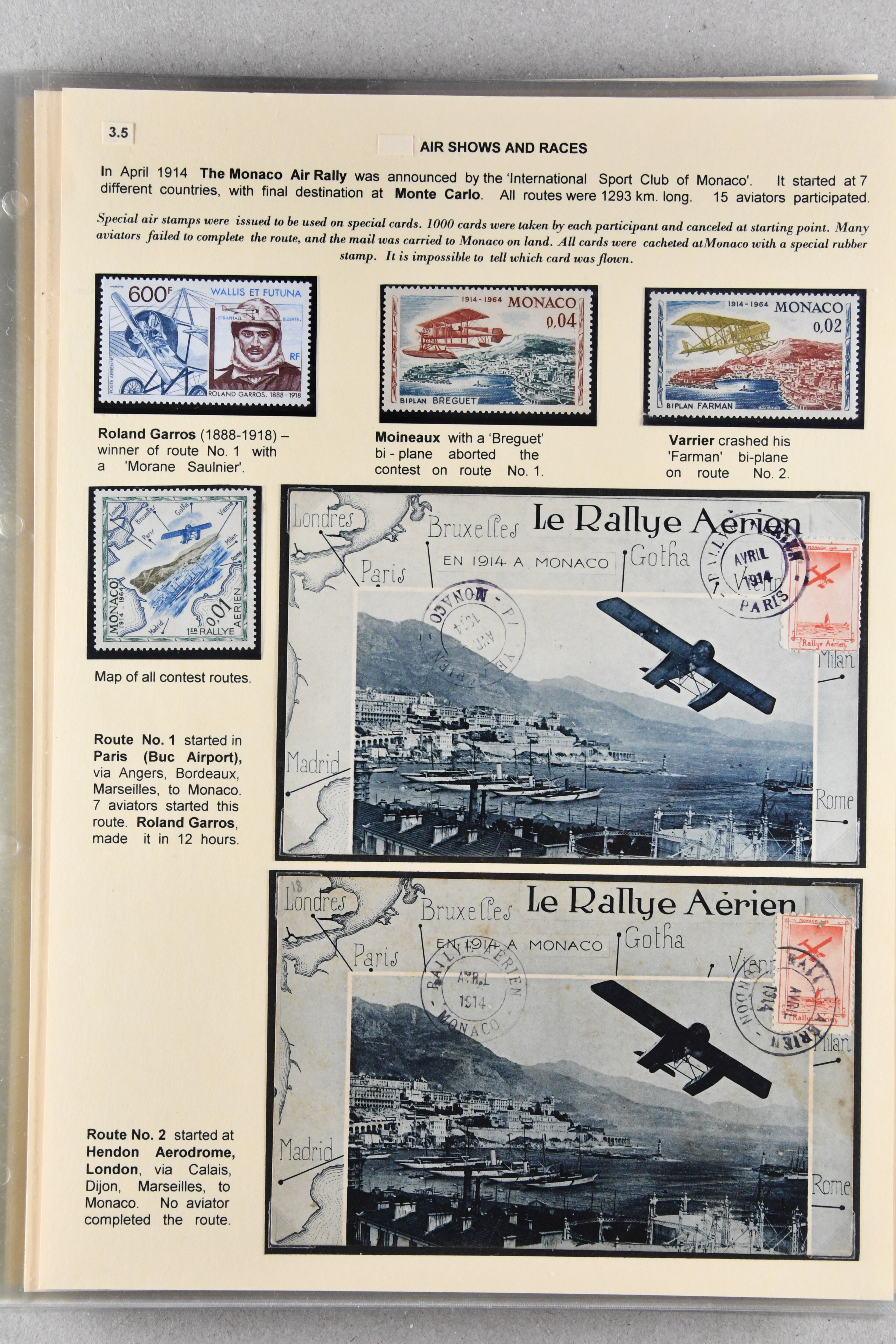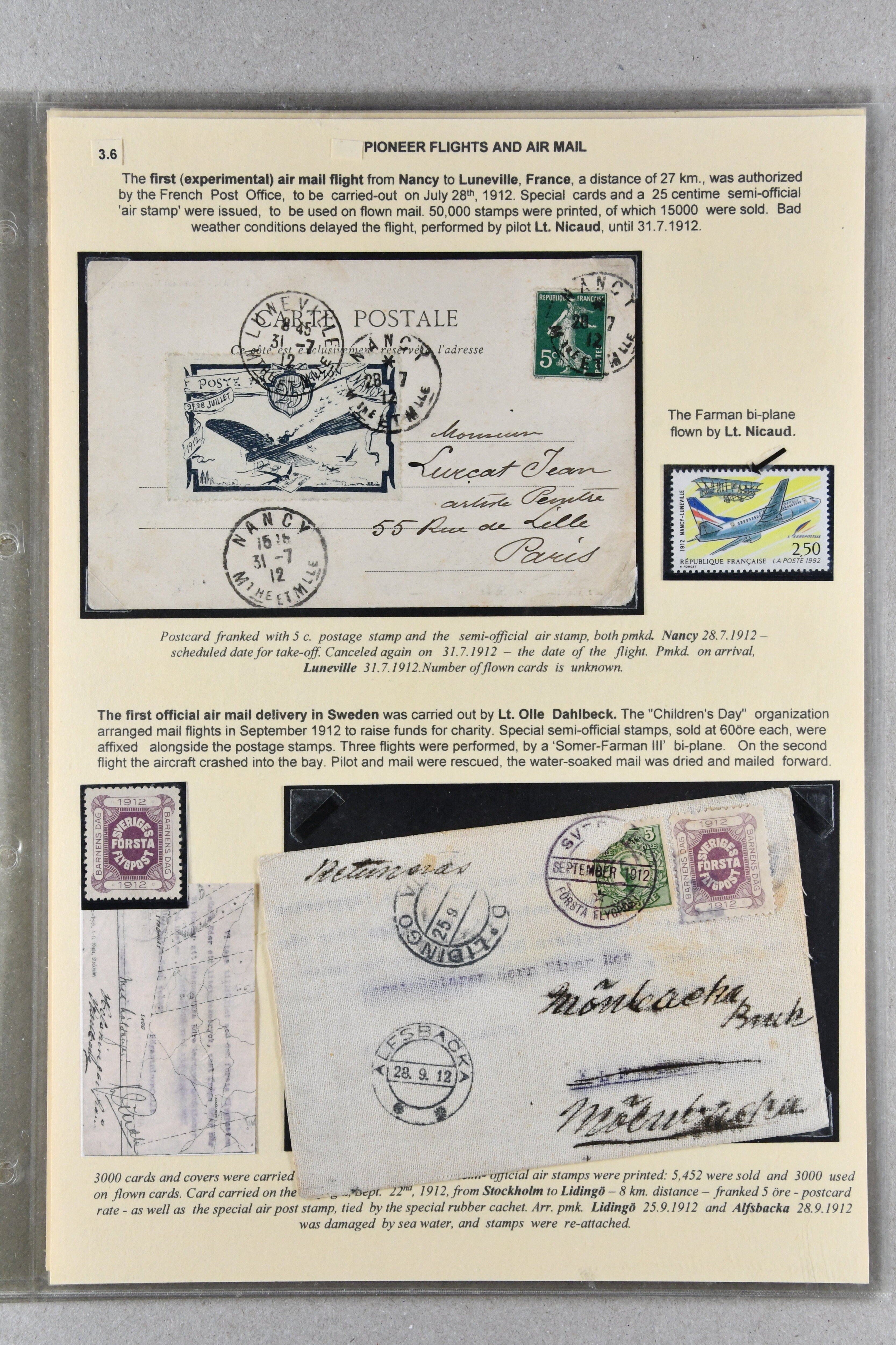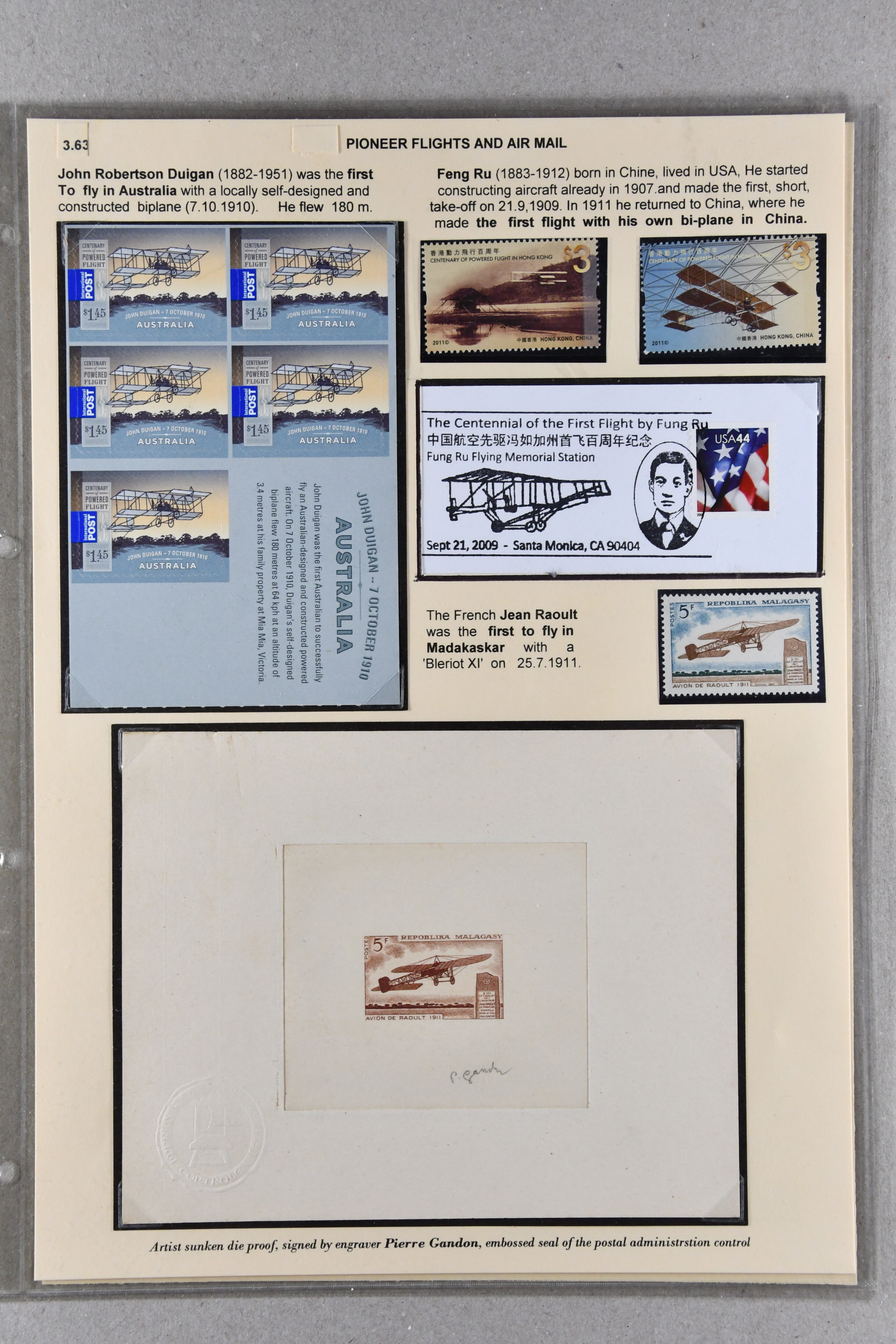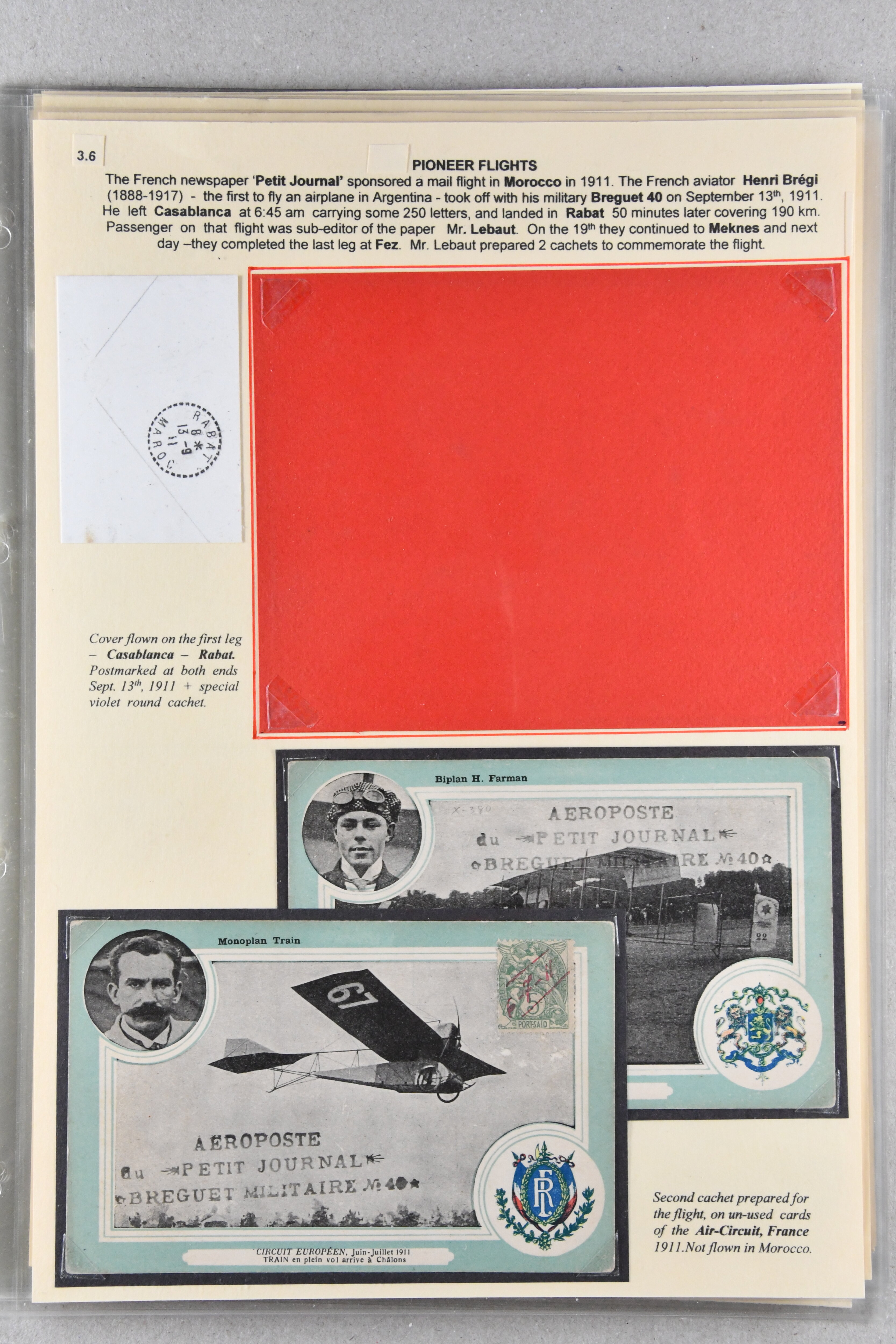 1490 **/*/cover/(*) image1888/2015: Collection of Airshow, Race and Pioneer Flight material, set-out on 25 exhibition pages, comprising over 100 items, including Proofs, an artist's original design drawing signed by engraver Achille Ouvre, special event cards, covers, airmail commemorative stamps, minisheets and a booklet. Noted; 1909 Aviation Week Paris postcard with event postmark, 1910 Henri Farman aviation week post card Rouen, France, also 1910 events in Lyon and Dijon, 1912 experimental flight Nancy to Luneville card with vingnette air mail stamp tied, 1914 The Monaco Air Rally illustrated cards (7), 1914 Air Exhibition Japan card depicting bi-plane take-off with event cachet, 1911 Morocco second event cards/cachet (2), 1912 Stockholm to Lidingö flight material post card damaged by sea water, sunken die proofs (4) and original artwork for Latvia airmail stamps depicting monoplane and assortment of issued airmail stamps. Useful assembly. Ex. The ‘Izhak Barak’ Collection: The Development of Aviation and Transportation of Mail by Air until 1914 (Image 1) (Image 2) (Image 3) (Image 4) (Image 5) (Image 6) (Image 7) (Image 8) (Image 9) (Image 10) (Image 11) (Image 12) (Image 13) (Image 14) (Image 15) (Image 16) (Image 17) (Image 18) (Image 19) (Image 20) (Image 21) (Image 22) (Image 23) (Image 24) (Image 25) (Image 26)