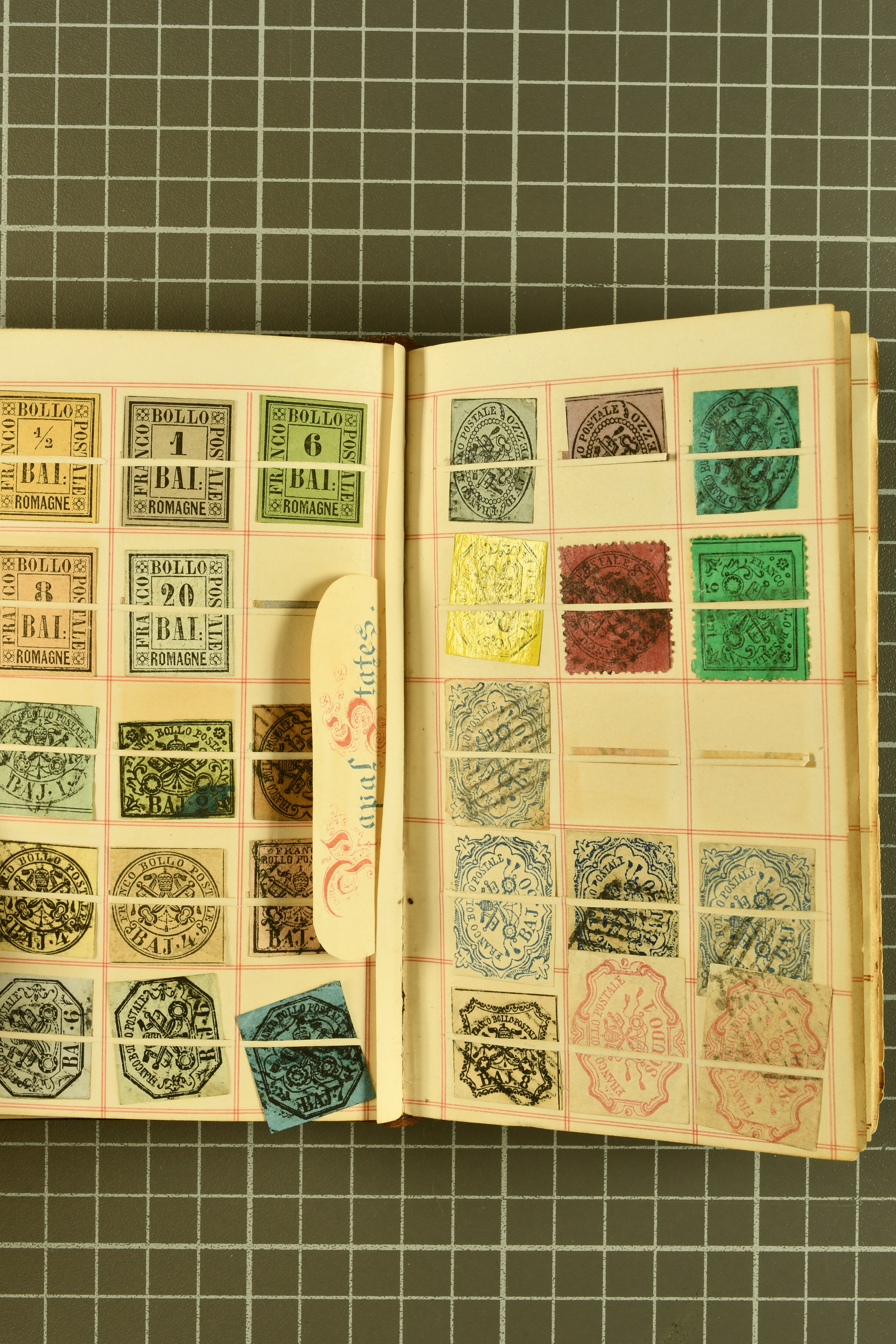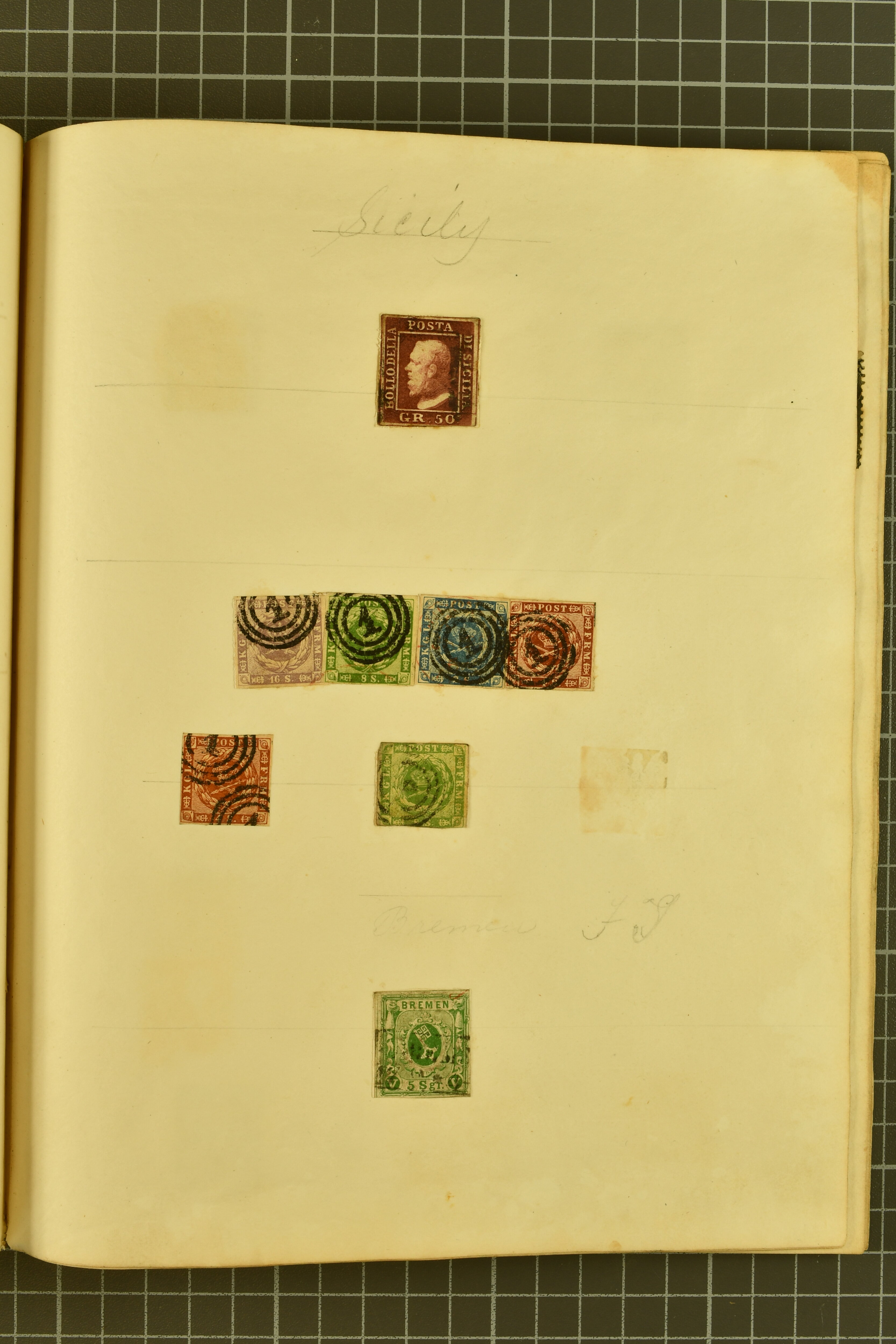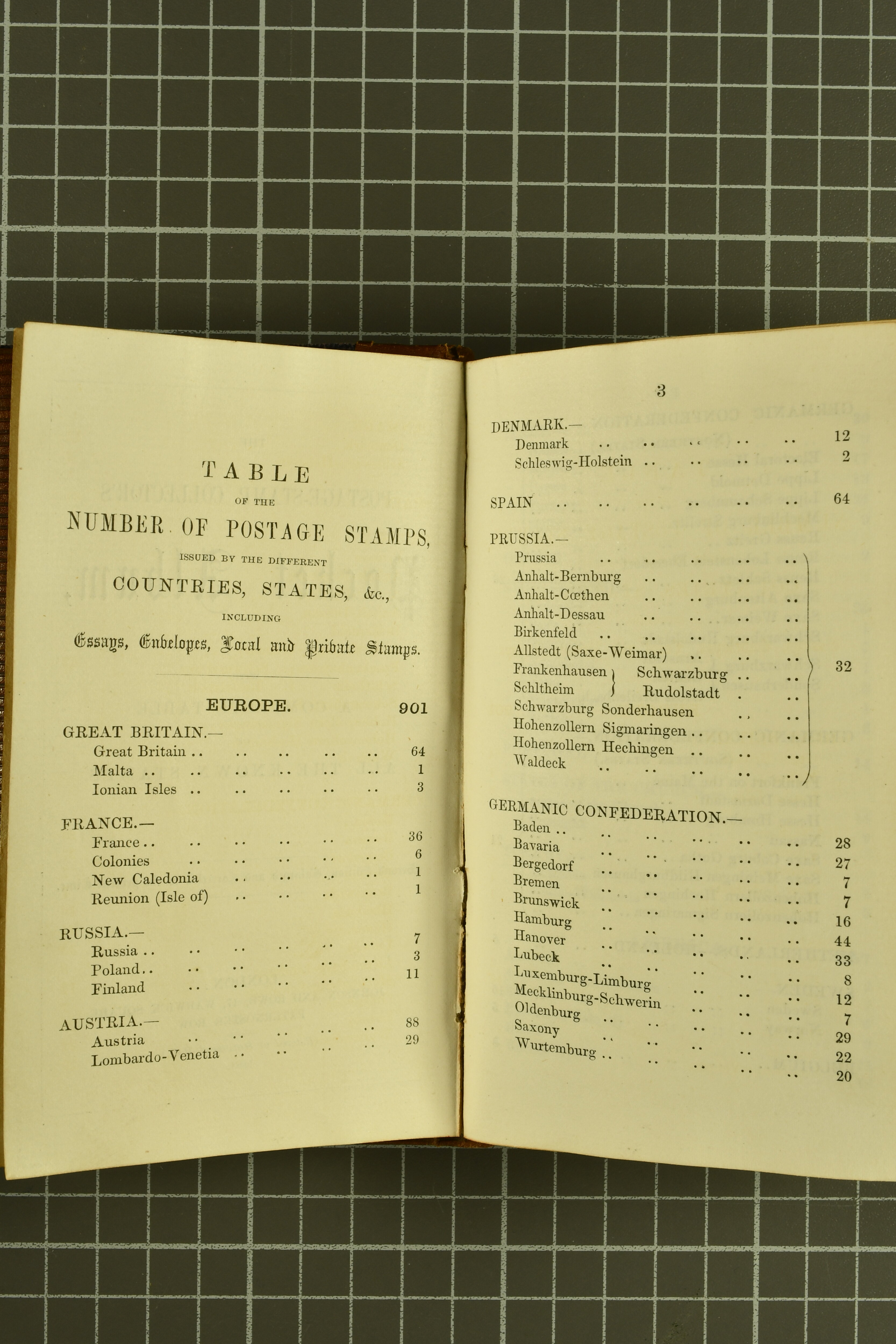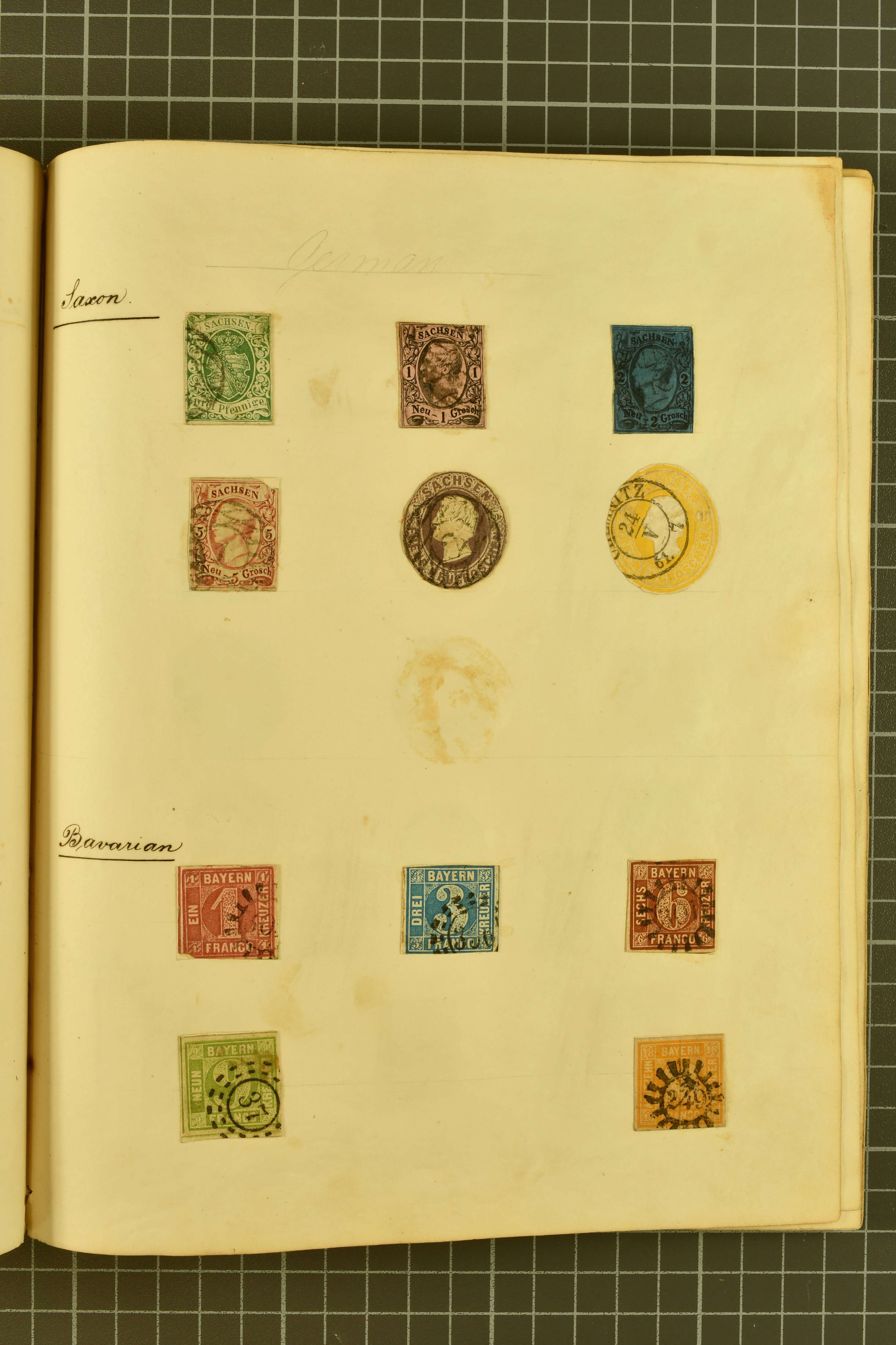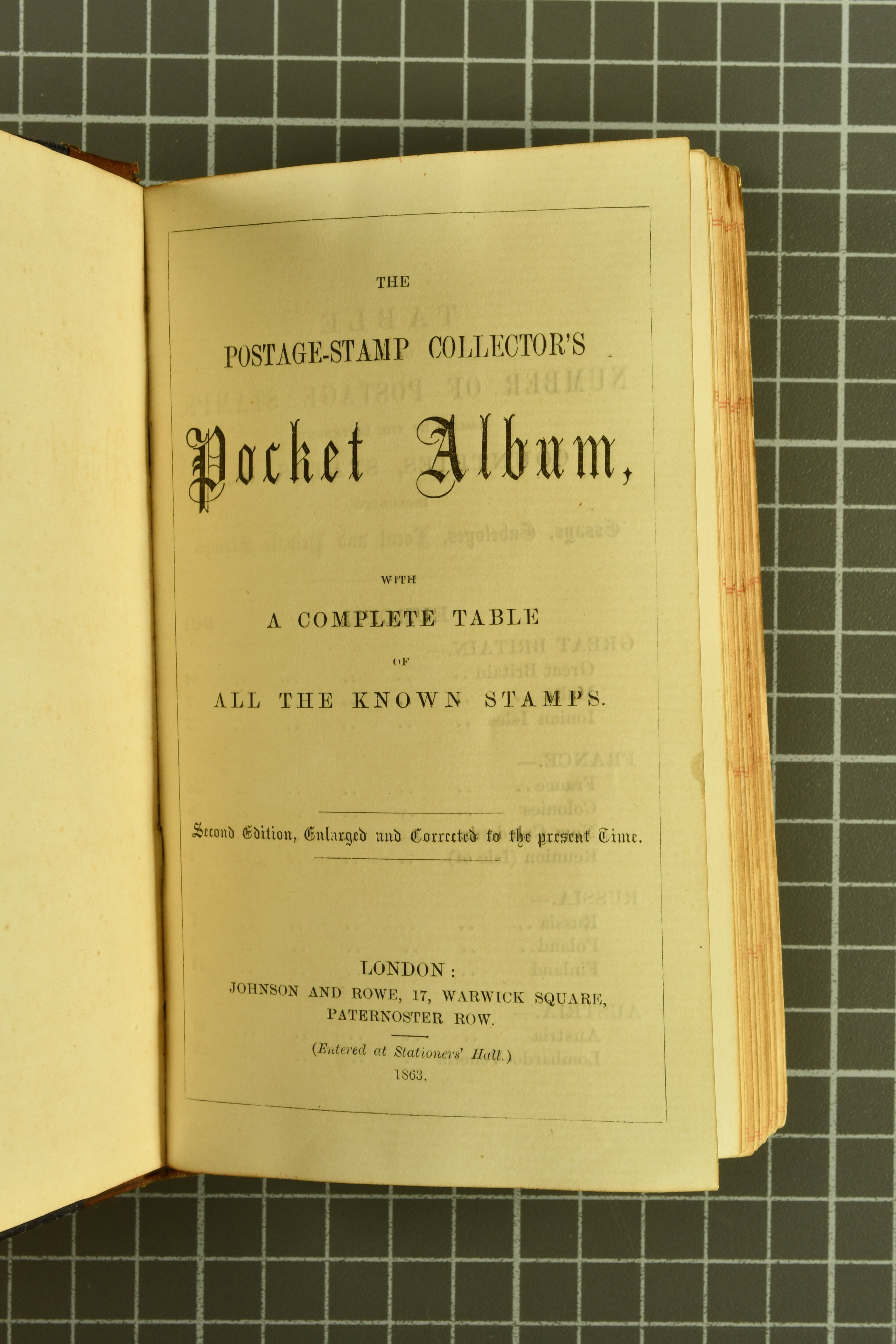 1492 imageStamp Collecting 1863: "The Postage Stamp Collector's Pocket Album with Complete Table of all the Known Stamps", 2nd Edition Enlarged and Corrected to the present time; issued by Johnson and Rowe of Warwick Square, Paternoster Row, London / 1863", with all the original stamps still intact and in a remarkable state of preservation, including genuine 1840 Great Britain 1 d. black used, Alsace 1871 set of seven used with duplication, Bavaria 1 kr. rose unused (2), 12 kr. red and used together with other German States and postal stationery cut-outs, Denmark 1854 8 sk. green unused (2), Finland 10 k. and 1860 10 k. unused, 1866 5 p. unused, France with 1849 Cérès 40 c. used (2), 1 fr. carmine used (7), India 1866 6 a. purple postal Fiscals used (2), Japan 1871 imperforate 48 m. brown used, 100 m. blue unused and used, 200 m. vermilion unused, perforated 100 m. blue unused and 'Mihon' Specimen; Luxemburg from 1859 used or from 1859 unused, Naples 1860 ½ tor. used, Netherlands 1852 issue and duplication used, New Brunswick 1851 6 d. yellow used, Norway 1855 4 sk. used (2) and Oscars, Nova Scotia 1851 1 d. used, Papal States 1852 50 baj. and 1 sc. used, Peru with PSNC reprint 1 r. in blue and in green, 2 r. in blue and in green; Poland with 1860 10 k. unused, Romania, Sardinia with 1851 5 c. black used, 1853 20 c. blue used, 1855 3 l. bronze used, Turkey 1863 issue unused, Sicily to 50 gr., Spain and Philippines, Tuscany with 1 q. black used (2), 1 so. unused and used, USA with 1847 5 c. used, 10 c. black used (2), Württemburg 1873 70 kr. used, and early reprints of stamps unavailable in England at time such as US Local Posts, Pony Express etc., also another early album but hand-made and both album and adhesives not as fine. Please Note: On the instructions of the family, the stamps are to stay where they are and cannot be examined by removal due to the method of original mounting with cotton. This is the earliest complete album this describer, with over 50 years in the philatelic trade, has ever encountered (Image 1) (Image 2) (Image 3) (Image 4) (Image 5) (Image 6) (Image 7) (Image 8) (Image 9) (Image 10) (Image 11) (Image 12) (Image 13) (Image 14) (Image 15) (Image 16) (Image 17) (Image 18) (Image 19) (Image 20) (Image 21) (Image 22) (Image 23) (Image 24) (Image 25) (Image 26) (Image 27)