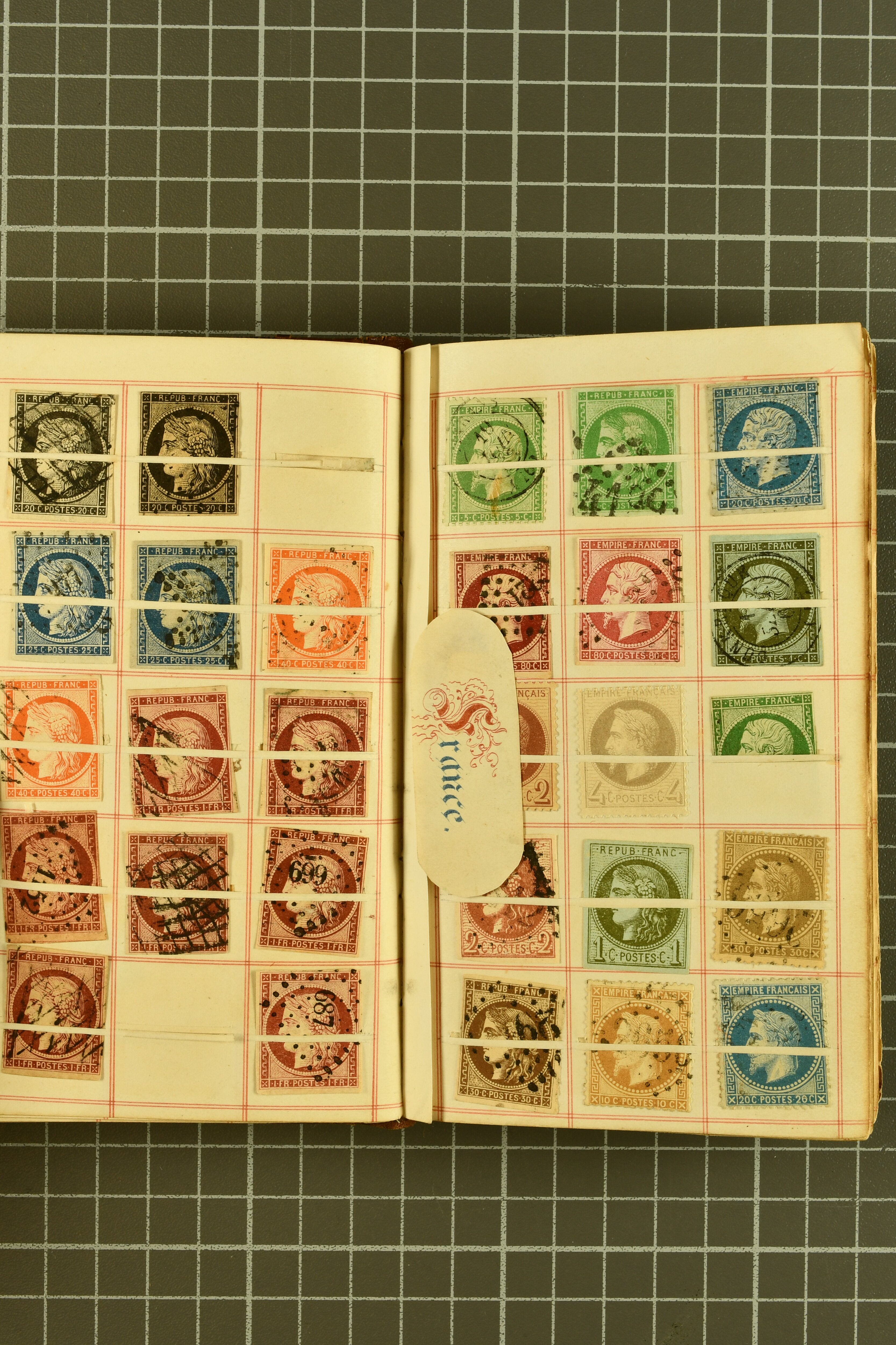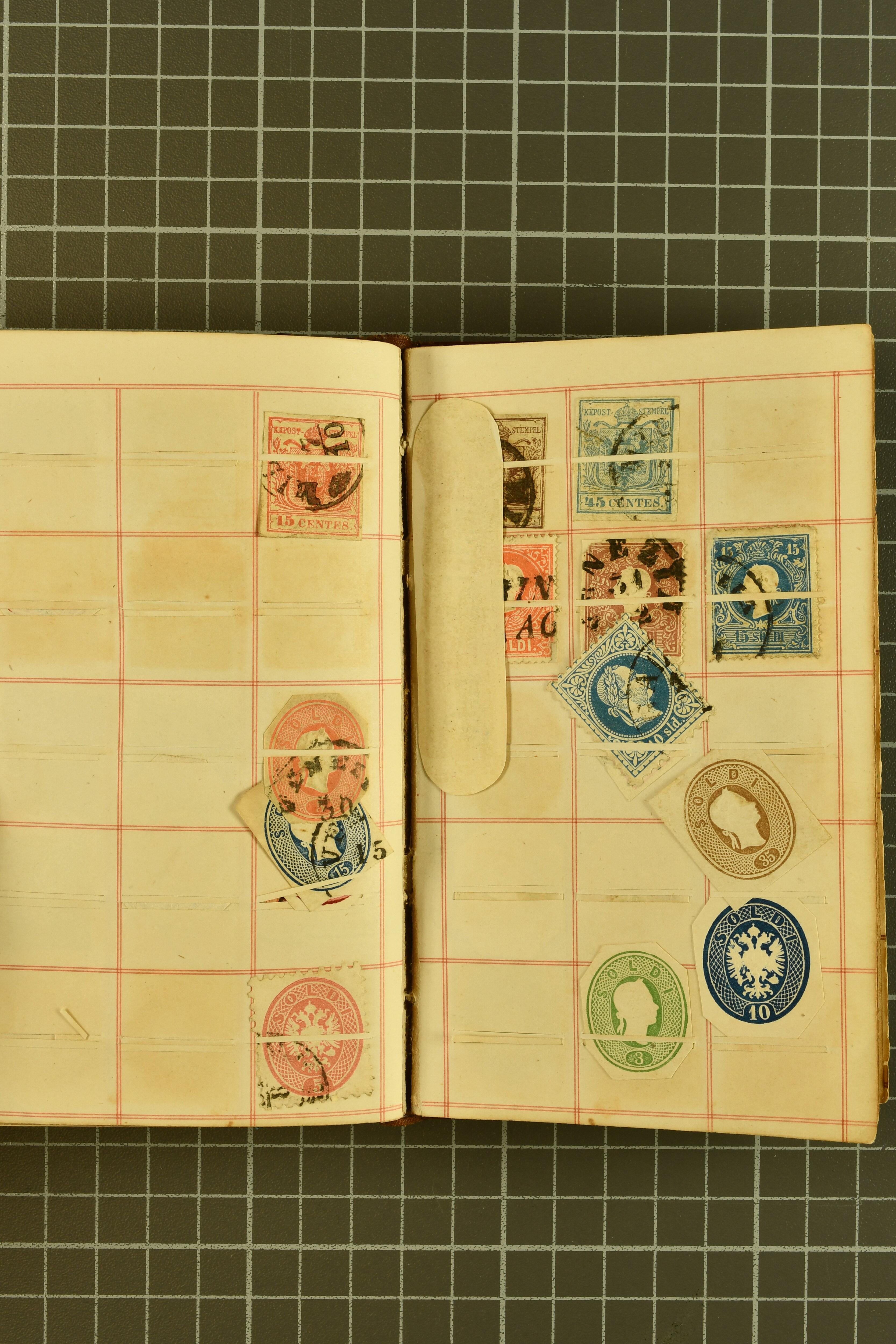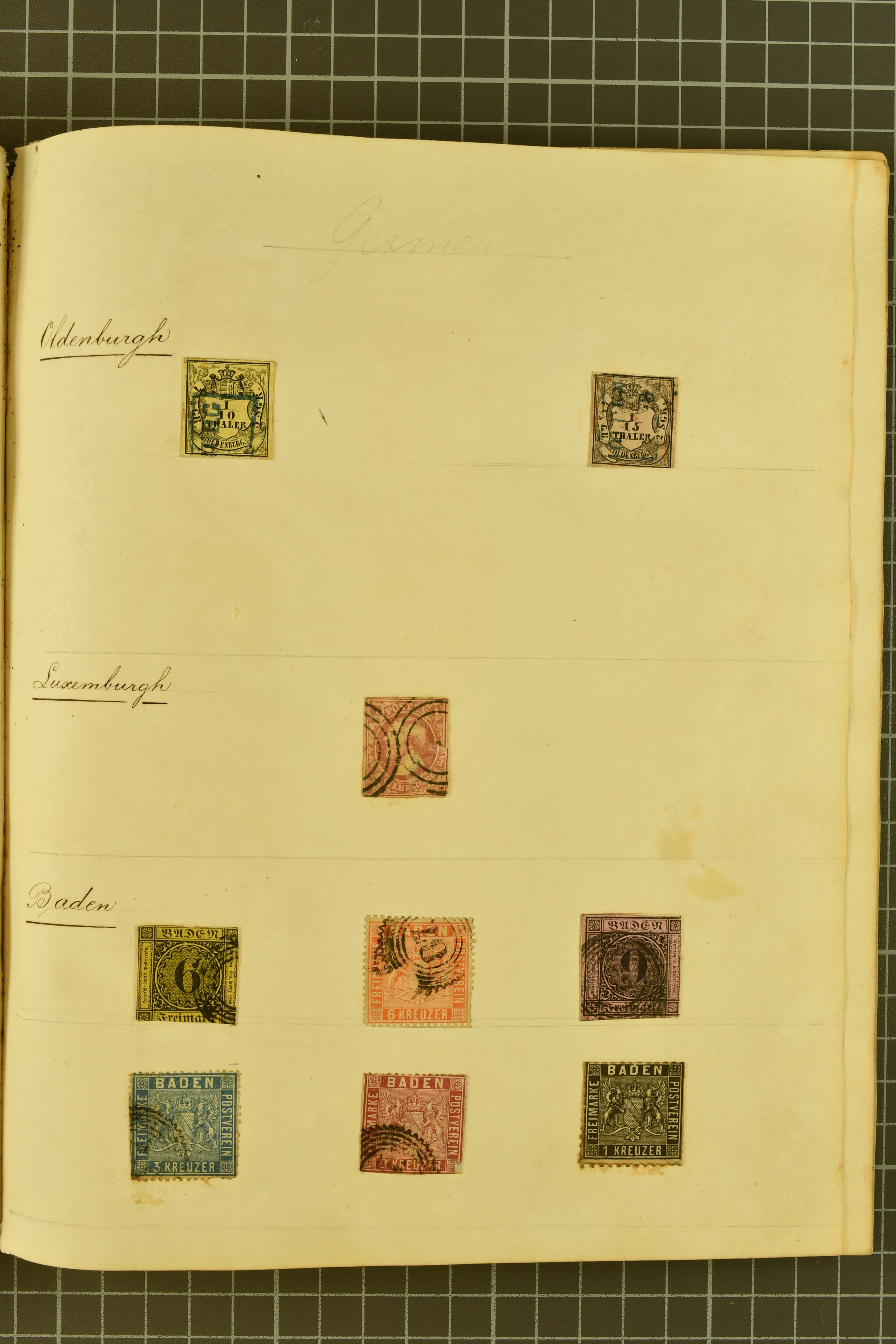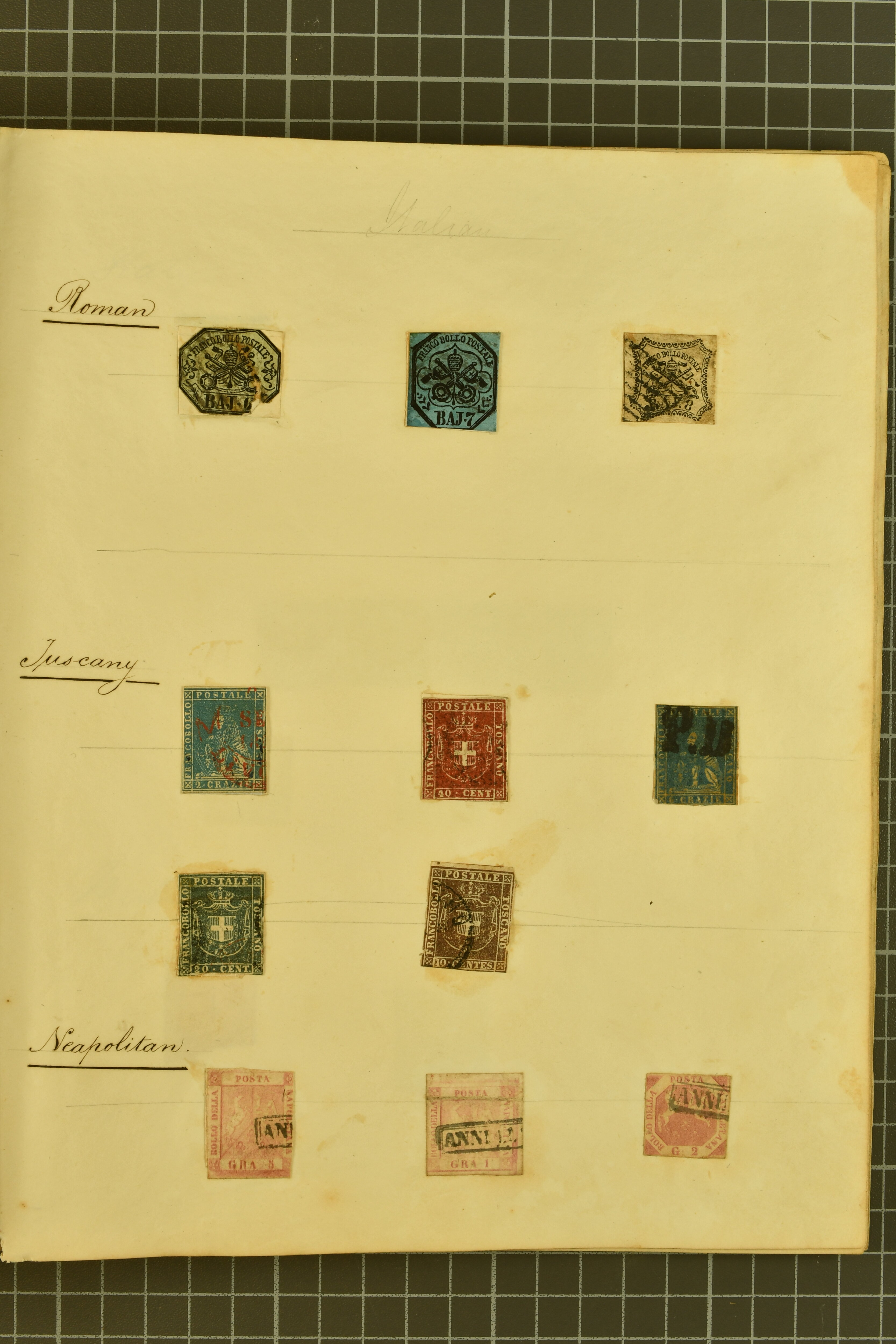 1492 imageStamp Collecting 1863: "The Postage Stamp Collector's Pocket Album with Complete Table of all the Known Stamps", 2nd Edition Enlarged and Corrected to the present time; issued by Johnson and Rowe of Warwick Square, Paternoster Row, London / 1863", with all the original stamps still intact and in a remarkable state of preservation, including genuine 1840 Great Britain 1 d. black used, Alsace 1871 set of seven used with duplication, Bavaria 1 kr. rose unused (2), 12 kr. red and used together with other German States and postal stationery cut-outs, Denmark 1854 8 sk. green unused (2), Finland 10 k. and 1860 10 k. unused, 1866 5 p. unused, France with 1849 Cérès 40 c. used (2), 1 fr. carmine used (7), India 1866 6 a. purple postal Fiscals used (2), Japan 1871 imperforate 48 m. brown used, 100 m. blue unused and used, 200 m. vermilion unused, perforated 100 m. blue unused and 'Mihon' Specimen; Luxemburg from 1859 used or from 1859 unused, Naples 1860 ½ tor. used, Netherlands 1852 issue and duplication used, New Brunswick 1851 6 d. yellow used, Norway 1855 4 sk. used (2) and Oscars, Nova Scotia 1851 1 d. used, Papal States 1852 50 baj. and 1 sc. used, Peru with PSNC reprint 1 r. in blue and in green, 2 r. in blue and in green; Poland with 1860 10 k. unused, Romania, Sardinia with 1851 5 c. black used, 1853 20 c. blue used, 1855 3 l. bronze used, Turkey 1863 issue unused, Sicily to 50 gr., Spain and Philippines, Tuscany with 1 q. black used (2), 1 so. unused and used, USA with 1847 5 c. used, 10 c. black used (2), Württemburg 1873 70 kr. used, and early reprints of stamps unavailable in England at time such as US Local Posts, Pony Express etc., also another early album but hand-made and both album and adhesives not as fine. Please Note: On the instructions of the family, the stamps are to stay where they are and cannot be examined by removal due to the method of original mounting with cotton. This is the earliest complete album this describer, with over 50 years in the philatelic trade, has ever encountered (Image 1) (Image 2) (Image 3) (Image 4) (Image 5) (Image 6) (Image 7) (Image 8) (Image 9) (Image 10) (Image 11) (Image 12) (Image 13) (Image 14) (Image 15) (Image 16) (Image 17) (Image 18) (Image 19) (Image 20) (Image 21) (Image 22) (Image 23) (Image 24) (Image 25) (Image 26) (Image 27)