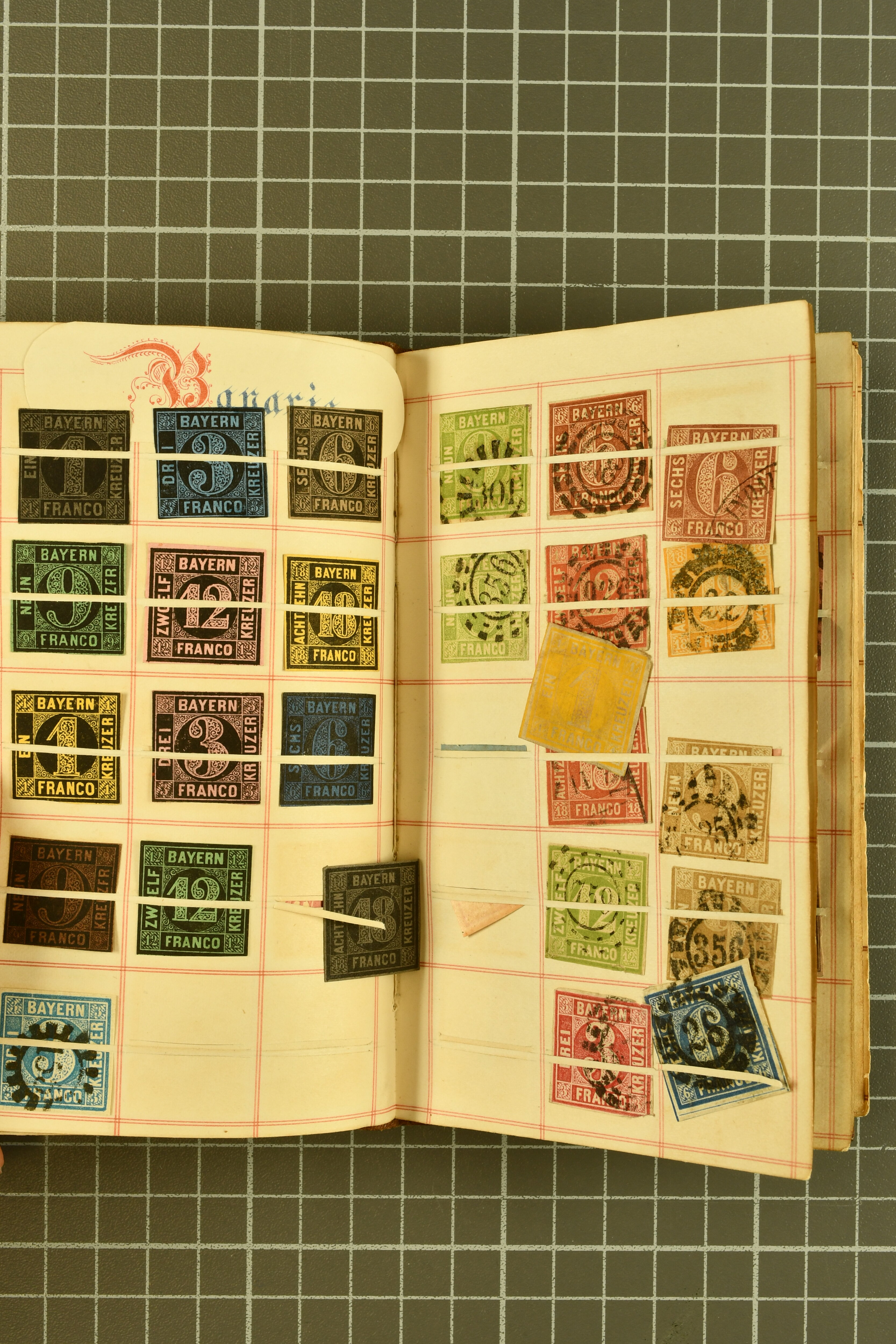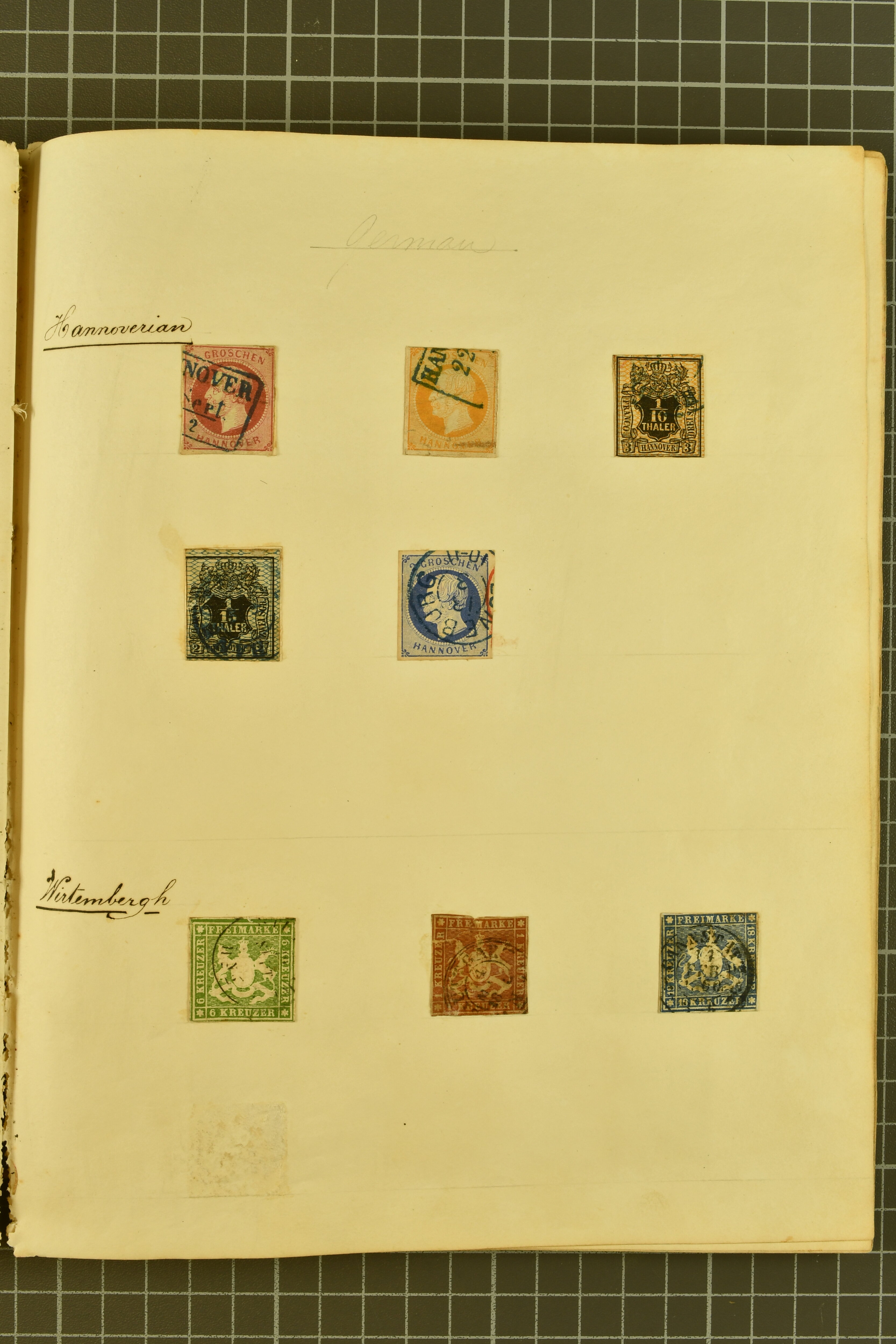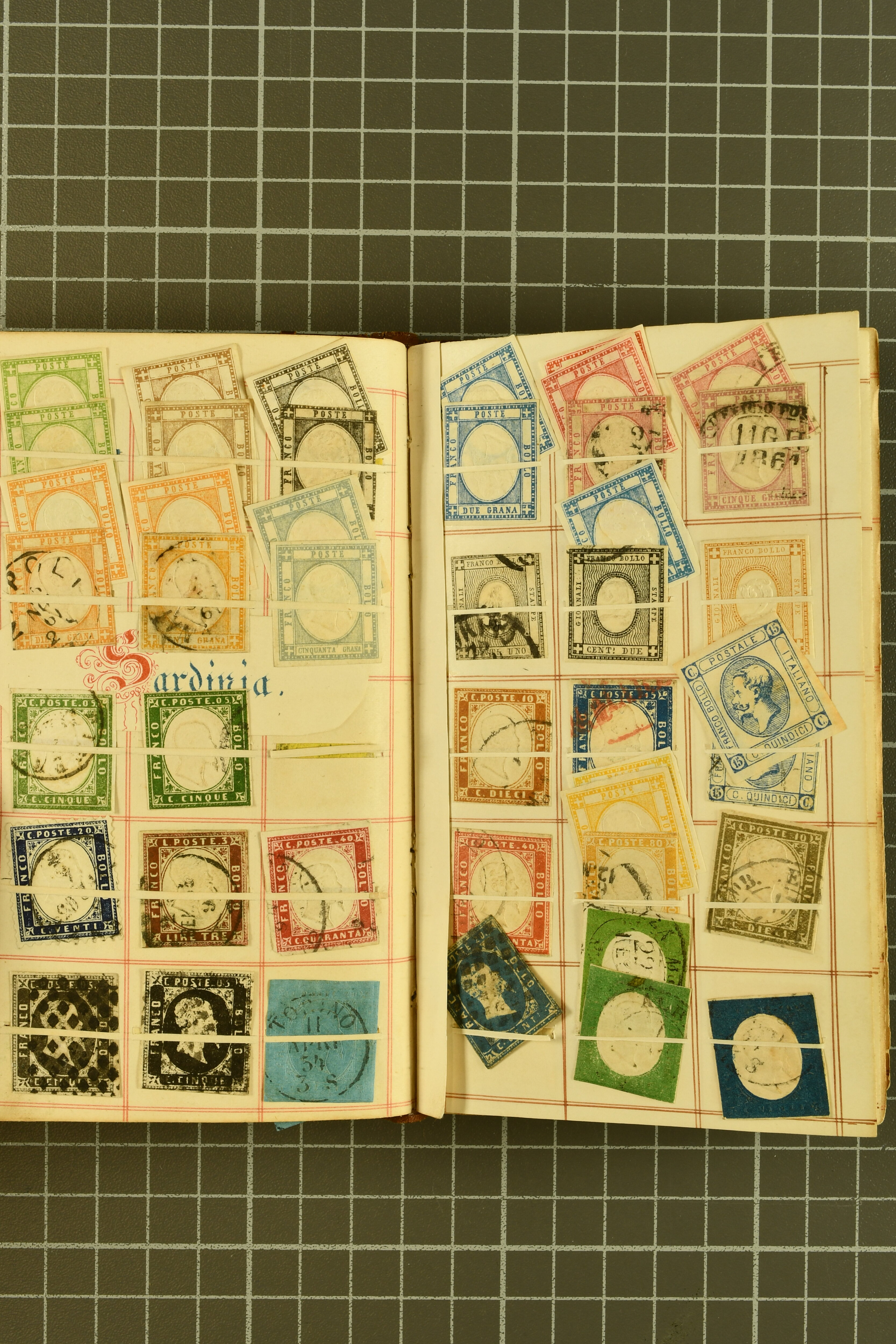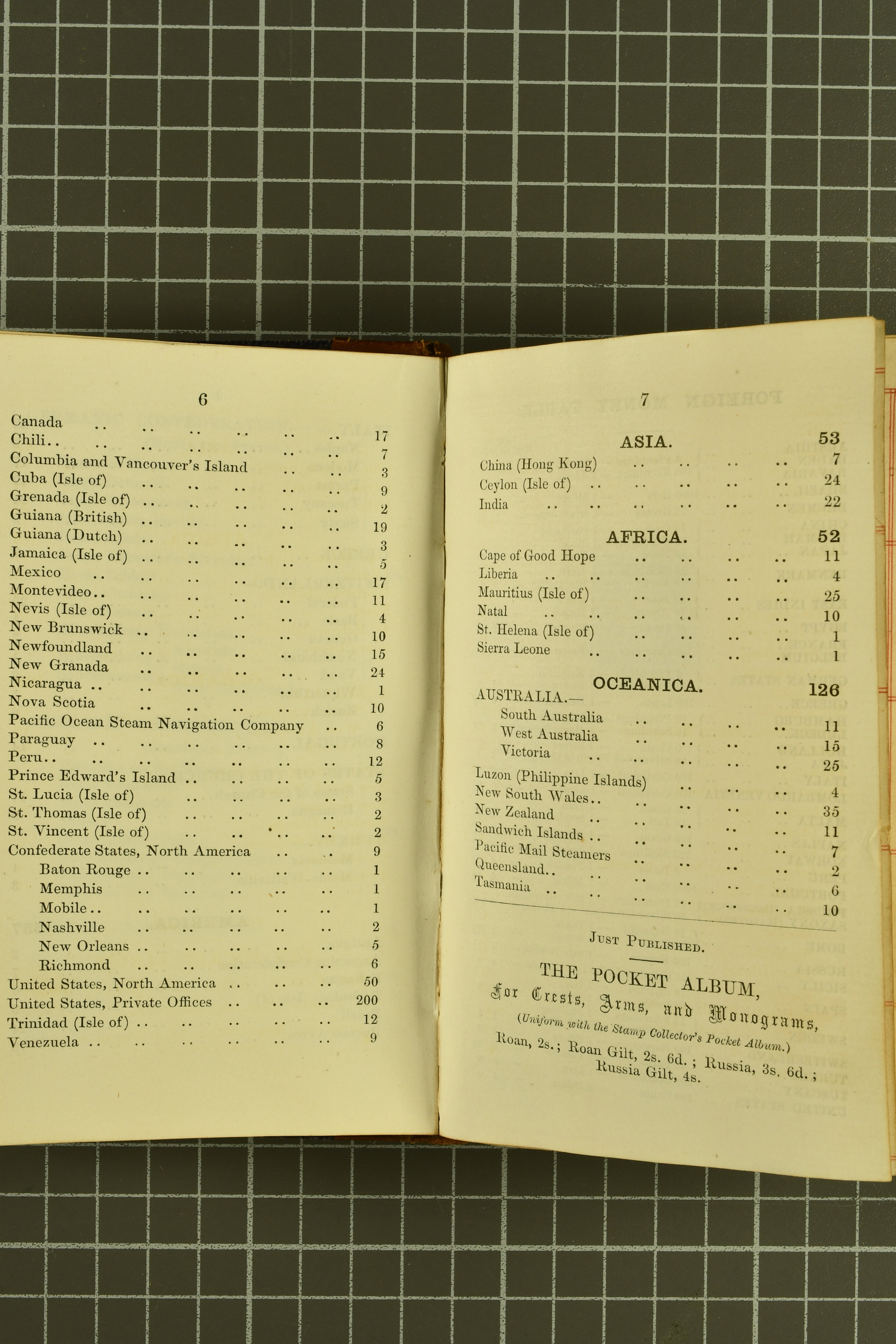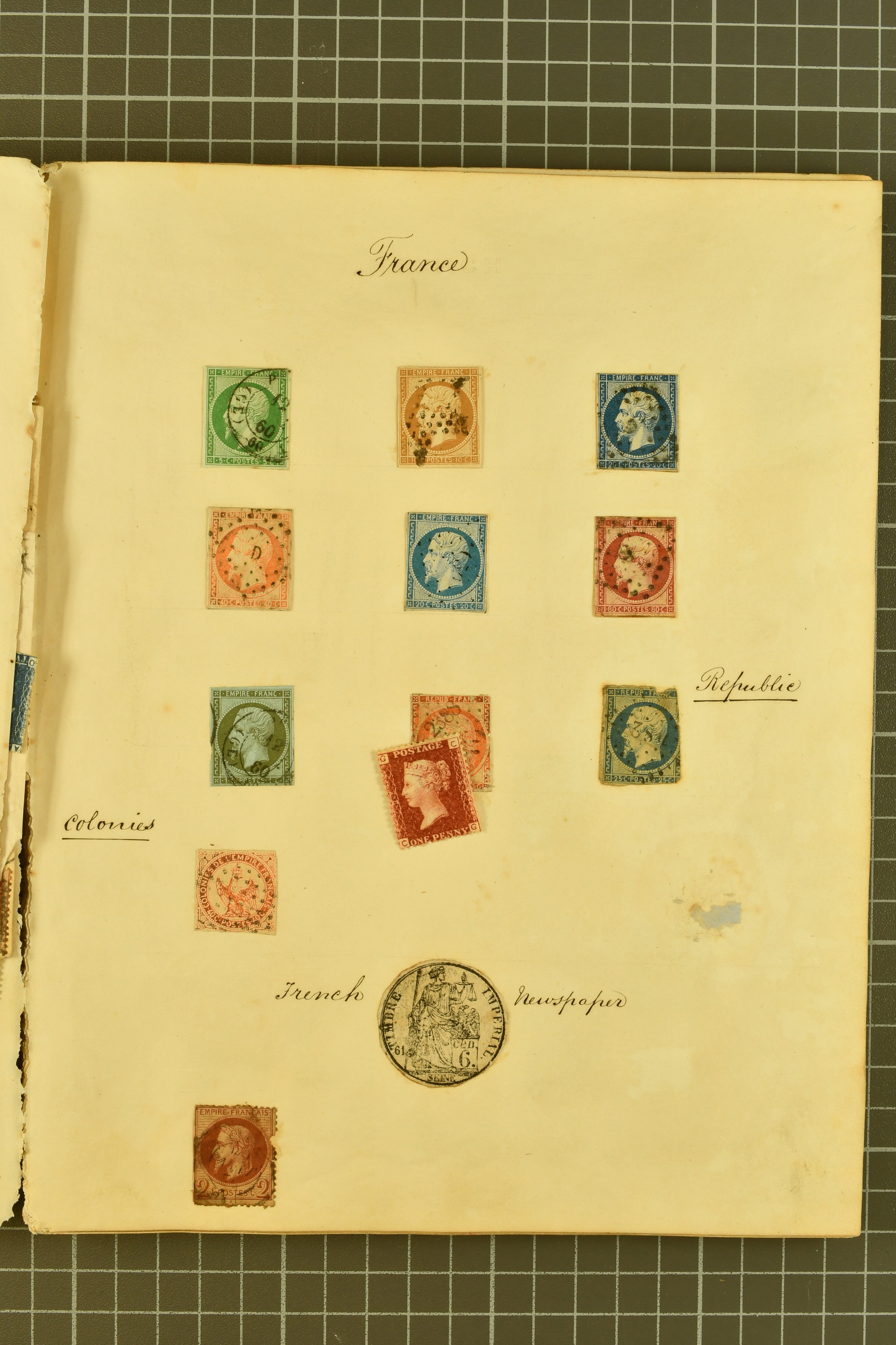 1492 imageStamp Collecting 1863: "The Postage Stamp Collector's Pocket Album with Complete Table of all the Known Stamps", 2nd Edition Enlarged and Corrected to the present time; issued by Johnson and Rowe of Warwick Square, Paternoster Row, London / 1863", with all the original stamps still intact and in a remarkable state of preservation, including genuine 1840 Great Britain 1 d. black used, Alsace 1871 set of seven used with duplication, Bavaria 1 kr. rose unused (2), 12 kr. red and used together with other German States and postal stationery cut-outs, Denmark 1854 8 sk. green unused (2), Finland 10 k. and 1860 10 k. unused, 1866 5 p. unused, France with 1849 Cérès 40 c. used (2), 1 fr. carmine used (7), India 1866 6 a. purple postal Fiscals used (2), Japan 1871 imperforate 48 m. brown used, 100 m. blue unused and used, 200 m. vermilion unused, perforated 100 m. blue unused and 'Mihon' Specimen; Luxemburg from 1859 used or from 1859 unused, Naples 1860 ½ tor. used, Netherlands 1852 issue and duplication used, New Brunswick 1851 6 d. yellow used, Norway 1855 4 sk. used (2) and Oscars, Nova Scotia 1851 1 d. used, Papal States 1852 50 baj. and 1 sc. used, Peru with PSNC reprint 1 r. in blue and in green, 2 r. in blue and in green; Poland with 1860 10 k. unused, Romania, Sardinia with 1851 5 c. black used, 1853 20 c. blue used, 1855 3 l. bronze used, Turkey 1863 issue unused, Sicily to 50 gr., Spain and Philippines, Tuscany with 1 q. black used (2), 1 so. unused and used, USA with 1847 5 c. used, 10 c. black used (2), Württemburg 1873 70 kr. used, and early reprints of stamps unavailable in England at time such as US Local Posts, Pony Express etc., also another early album but hand-made and both album and adhesives not as fine. Please Note: On the instructions of the family, the stamps are to stay where they are and cannot be examined by removal due to the method of original mounting with cotton. This is the earliest complete album this describer, with over 50 years in the philatelic trade, has ever encountered (Image 1) (Image 2) (Image 3) (Image 4) (Image 5) (Image 6) (Image 7) (Image 8) (Image 9) (Image 10) (Image 11) (Image 12) (Image 13) (Image 14) (Image 15) (Image 16) (Image 17) (Image 18) (Image 19) (Image 20) (Image 21) (Image 22) (Image 23) (Image 24) (Image 25) (Image 26) (Image 27)
