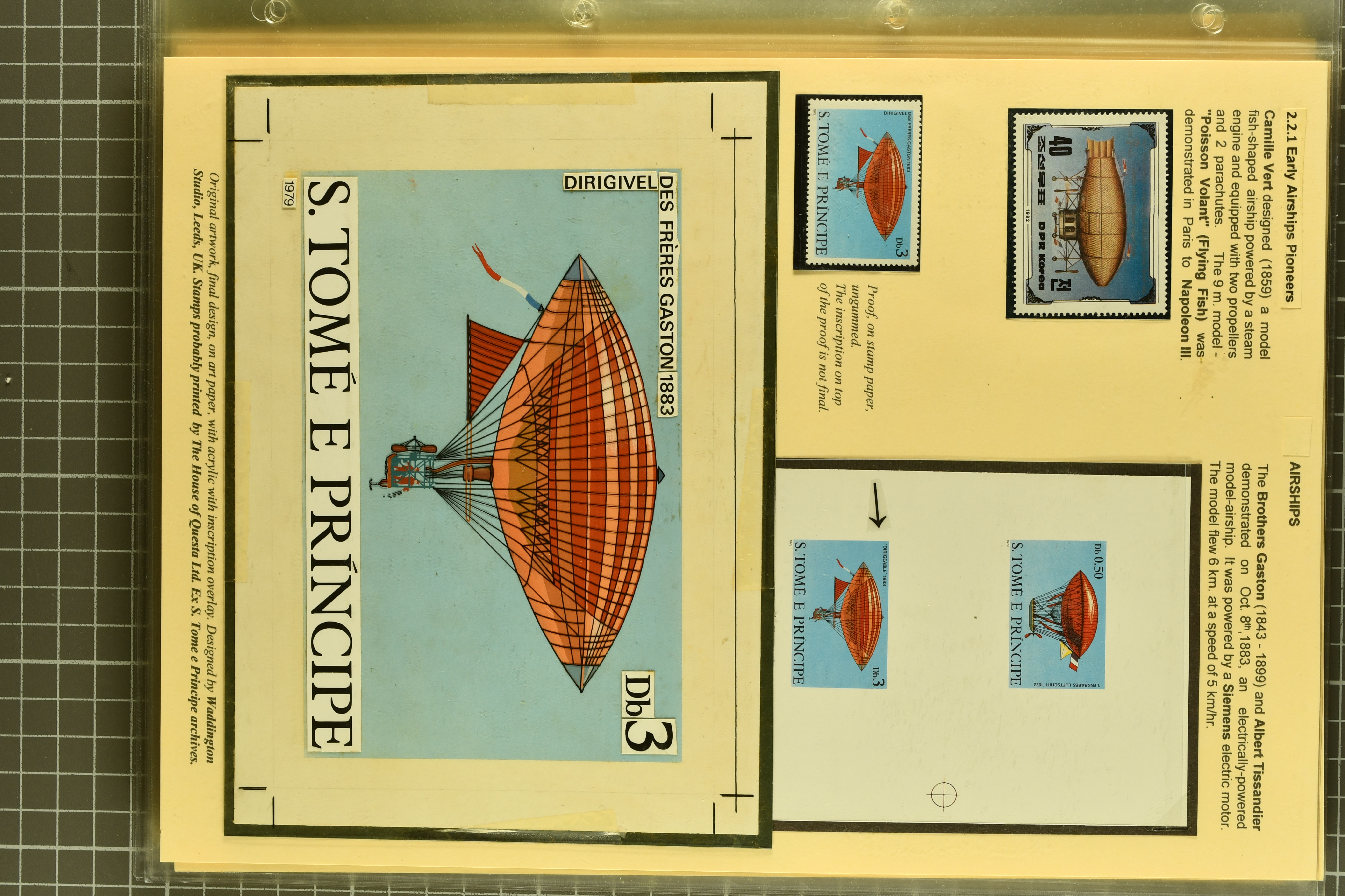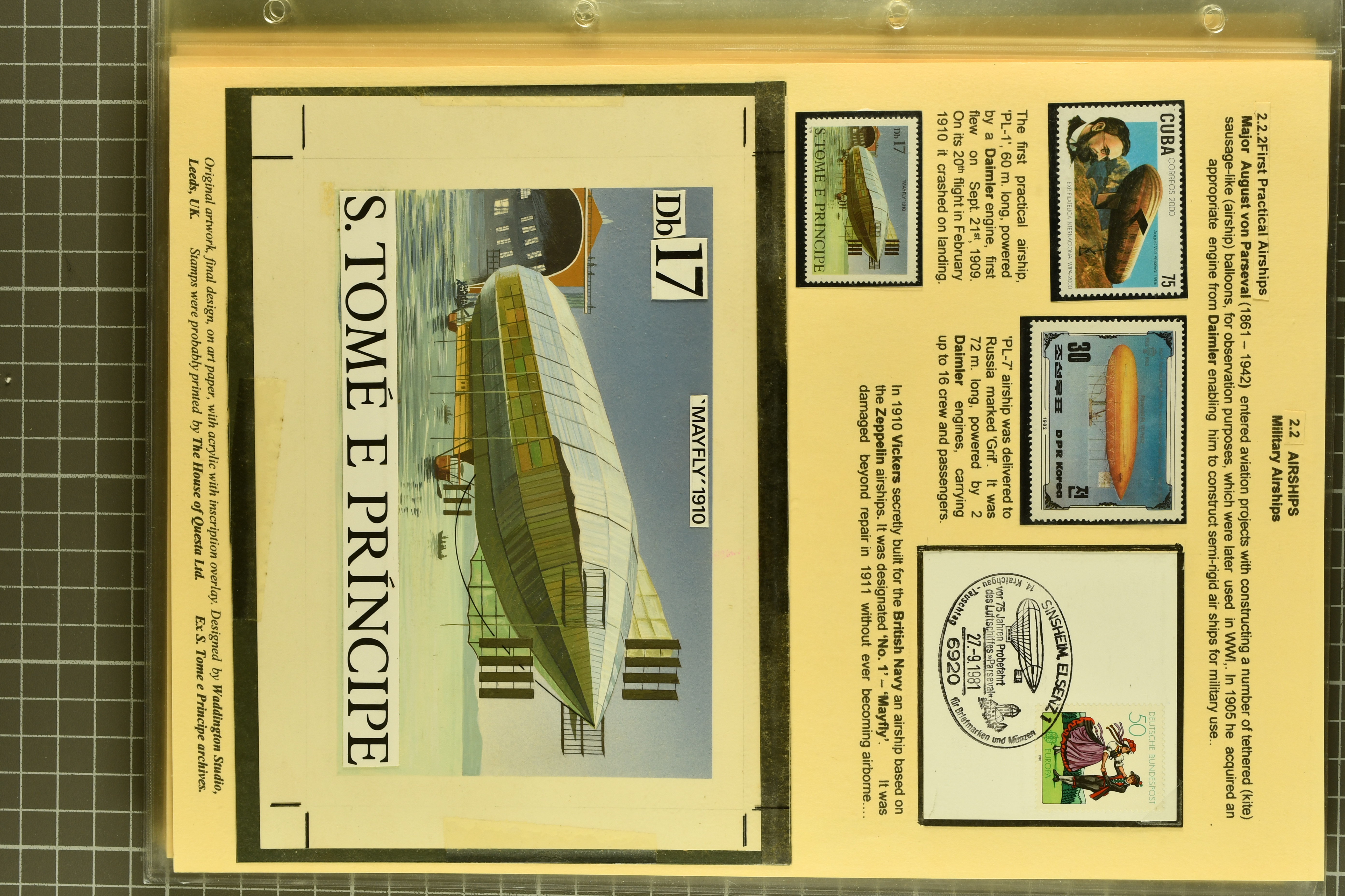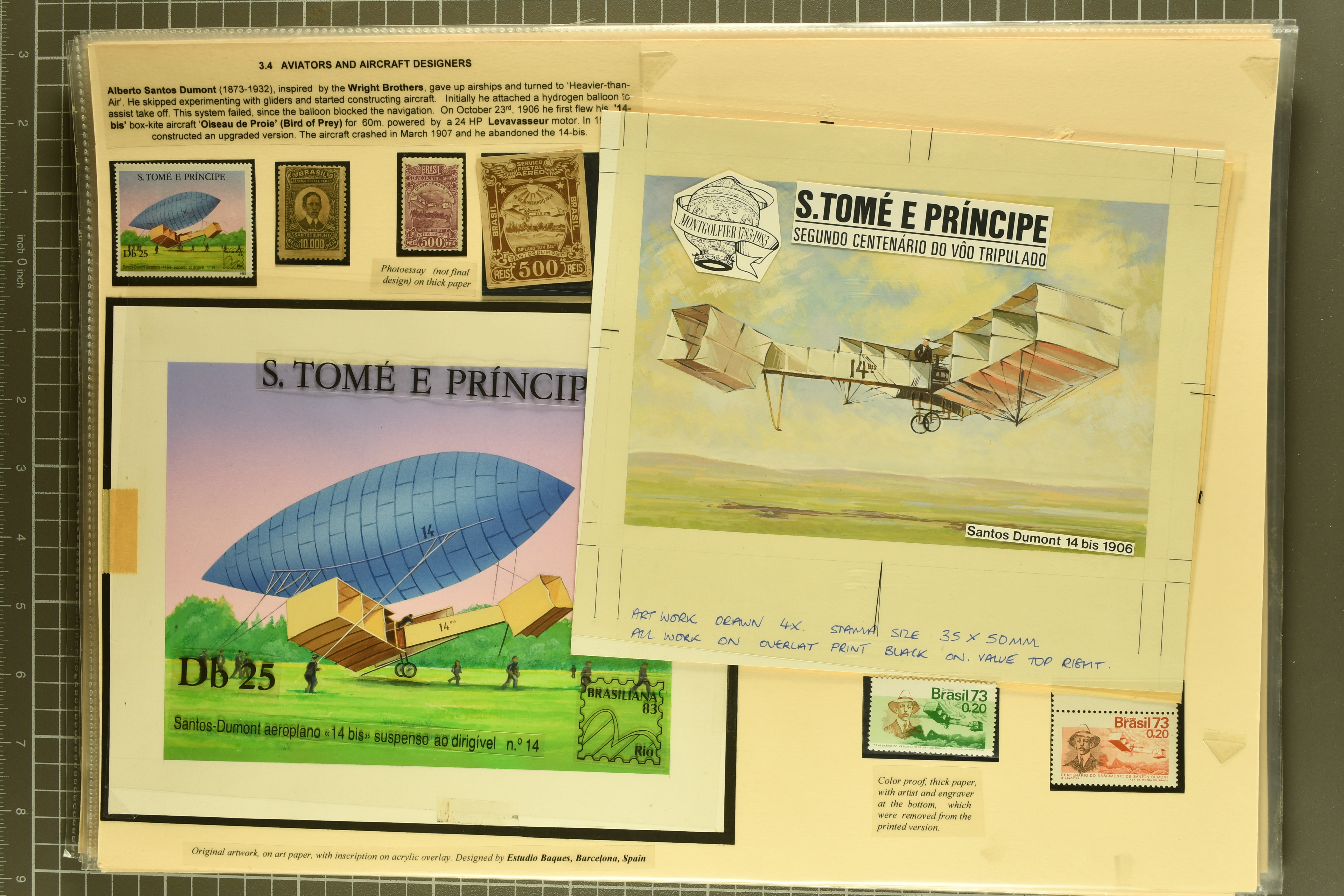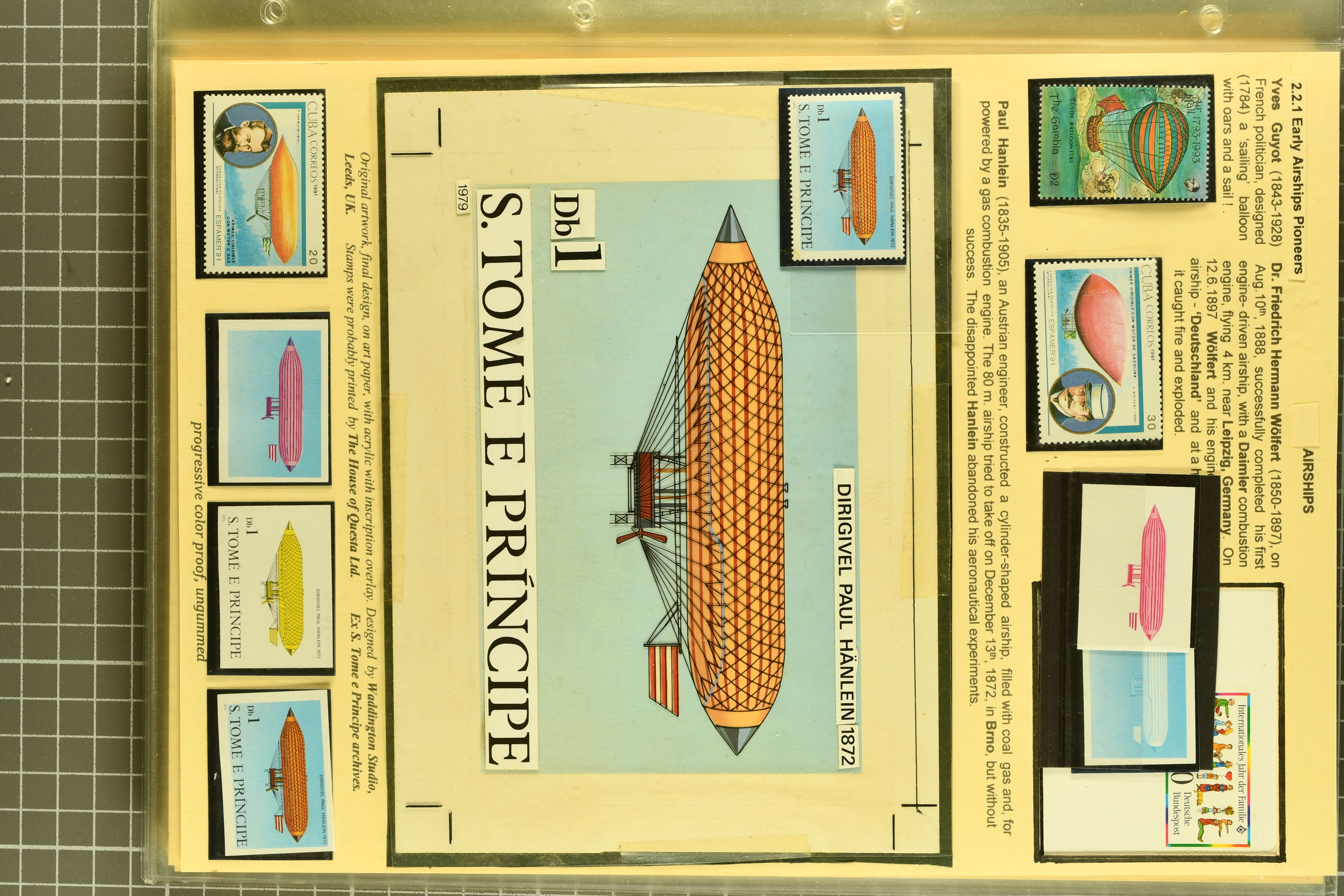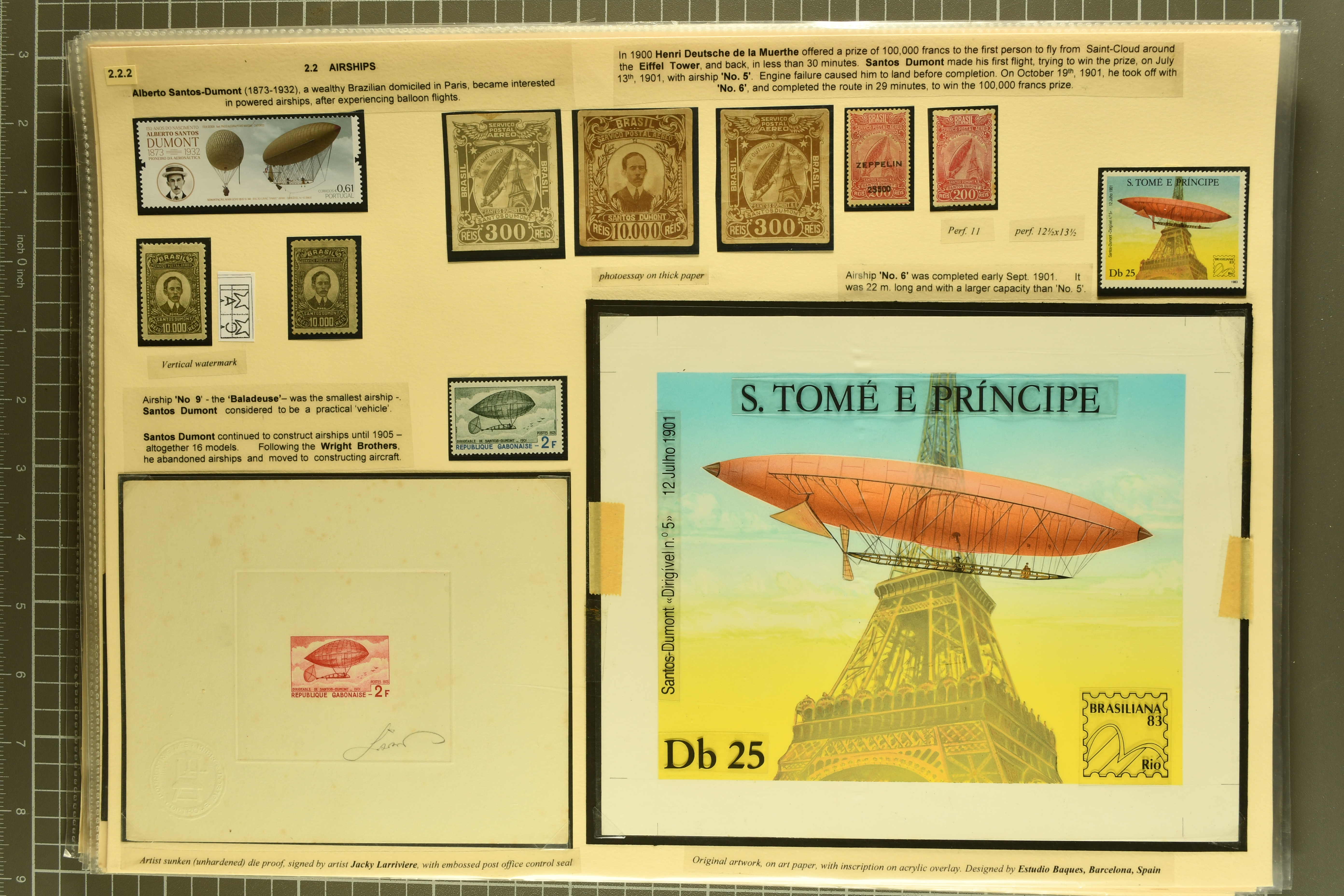 1491 **/*/cover/(*) image1979/2005: Airship, Aviator and Aircraft Constructors study collection, set-out upon 25 exhibition pages (x8 being A3), comprising over 200 items of which 16 are original artists artwork on cardboard, 28 proofs including sunken die proof, photographic and colour trials. Large quantity of Essay/Artwork/Minisheets for São Tomé and Príncipe airmail stamps, such as 200th Anniversary of Manned Flights, with a quantity of airmail related commenorative/airmail stamps from other countries including; Brazil (Santos Dumont portrait / airship), Denmark (Viggo Bang sketch and artwork), USA, Cuba, Czechoslovakia, DPR Korea, Gabon, Monoco, Slovakia, France, Sierra Leone, Canada, Syria, Jersey, Peru and others. Range of overprinted airmail issues including varieties. Colourful and visually appealing thematic study, with many scarce and fine items. Ex. The ‘Izhak Barak’ Collection: The Development of Aviation and Transportation of Mail by Air until 1914 (Image 1) (Image 2) (Image 3) (Image 4) (Image 5) (Image 6) (Image 7) (Image 8) (Image 9) (Image 10) (Image 11) (Image 12) (Image 13) (Image 14) (Image 15) (Image 16) (Image 17) (Image 18) (Image 19) (Image 20) (Image 21) (Image 22) (Image 23) (Image 24) (Image 25) (Image 26) (Image 27) (Image 28)