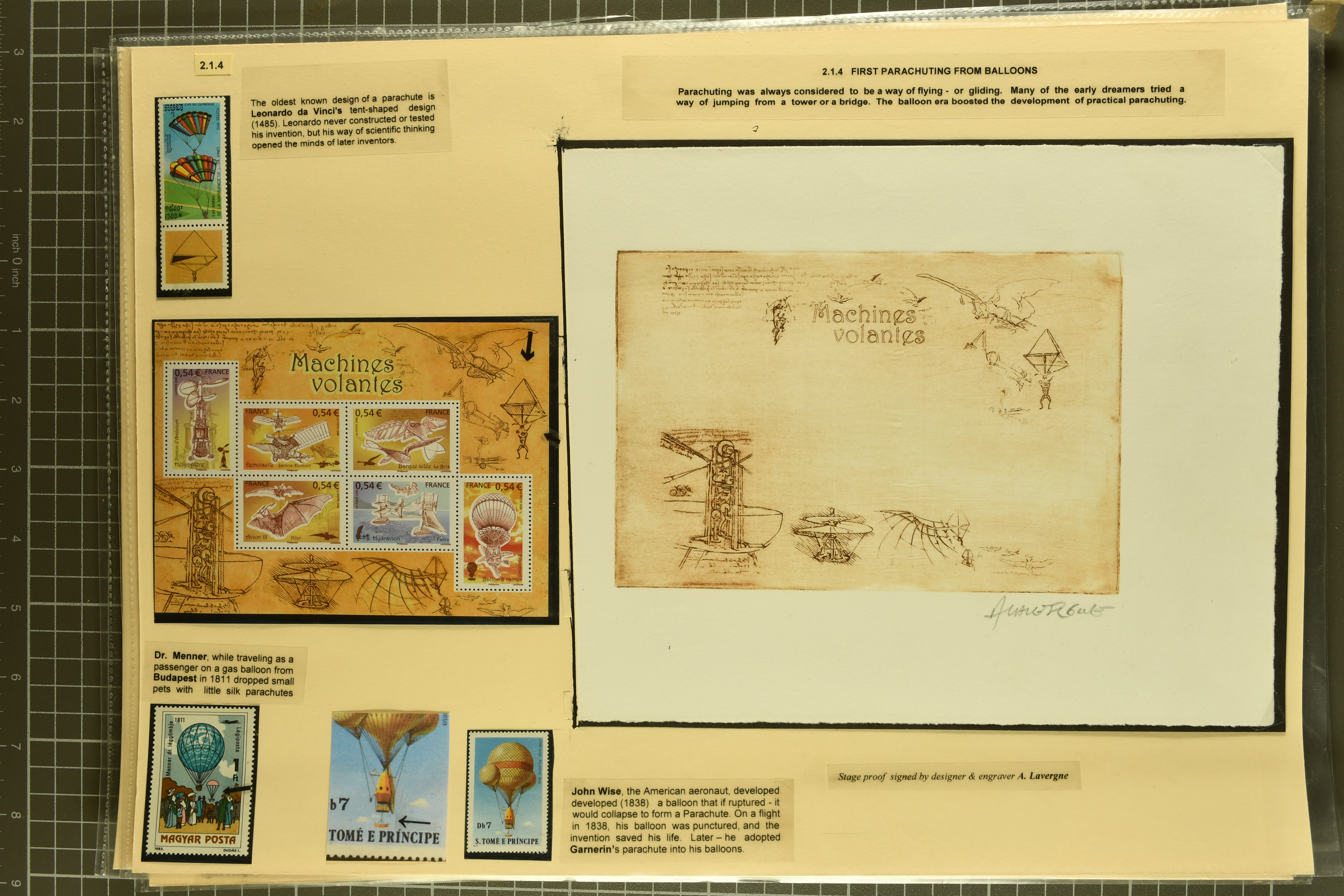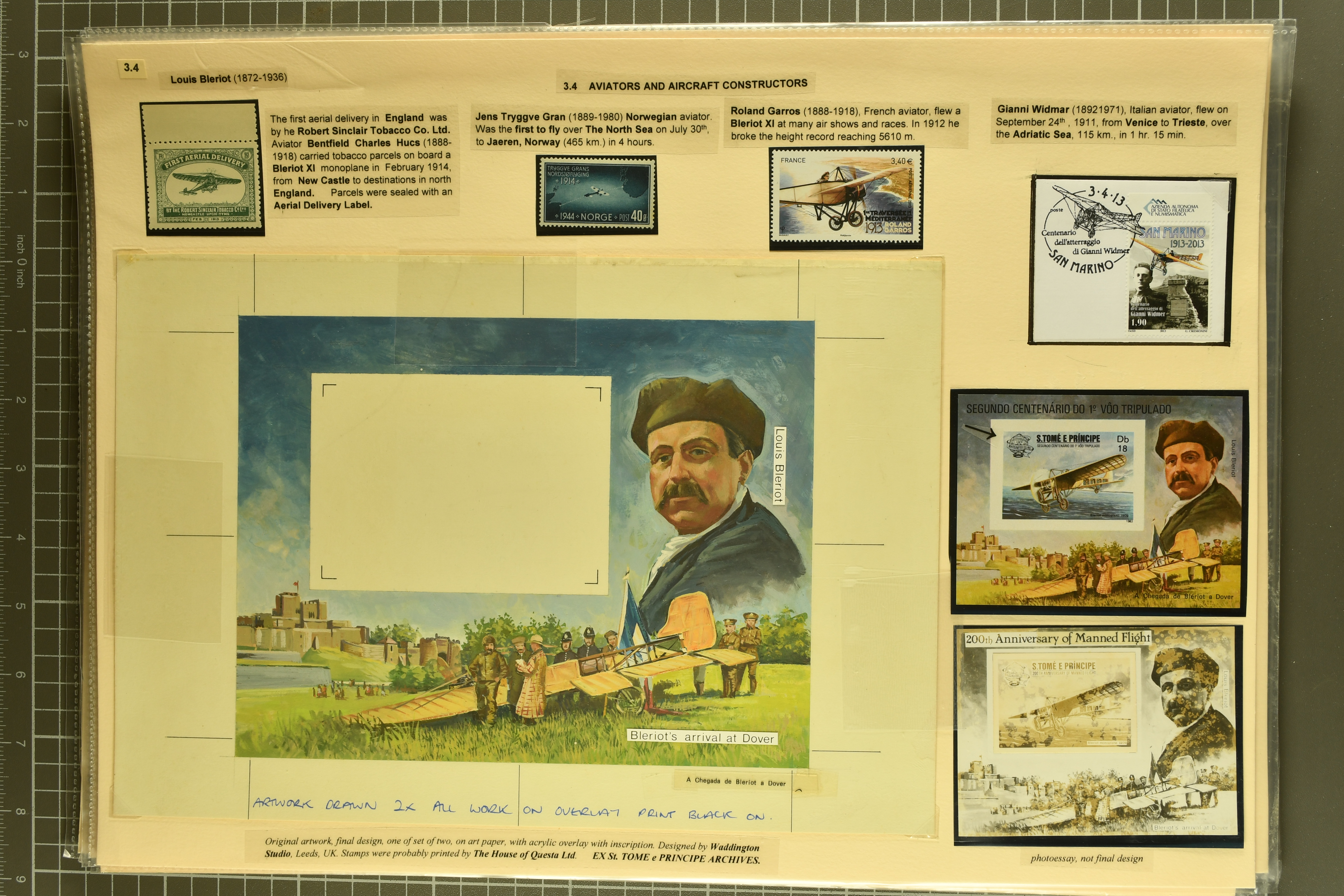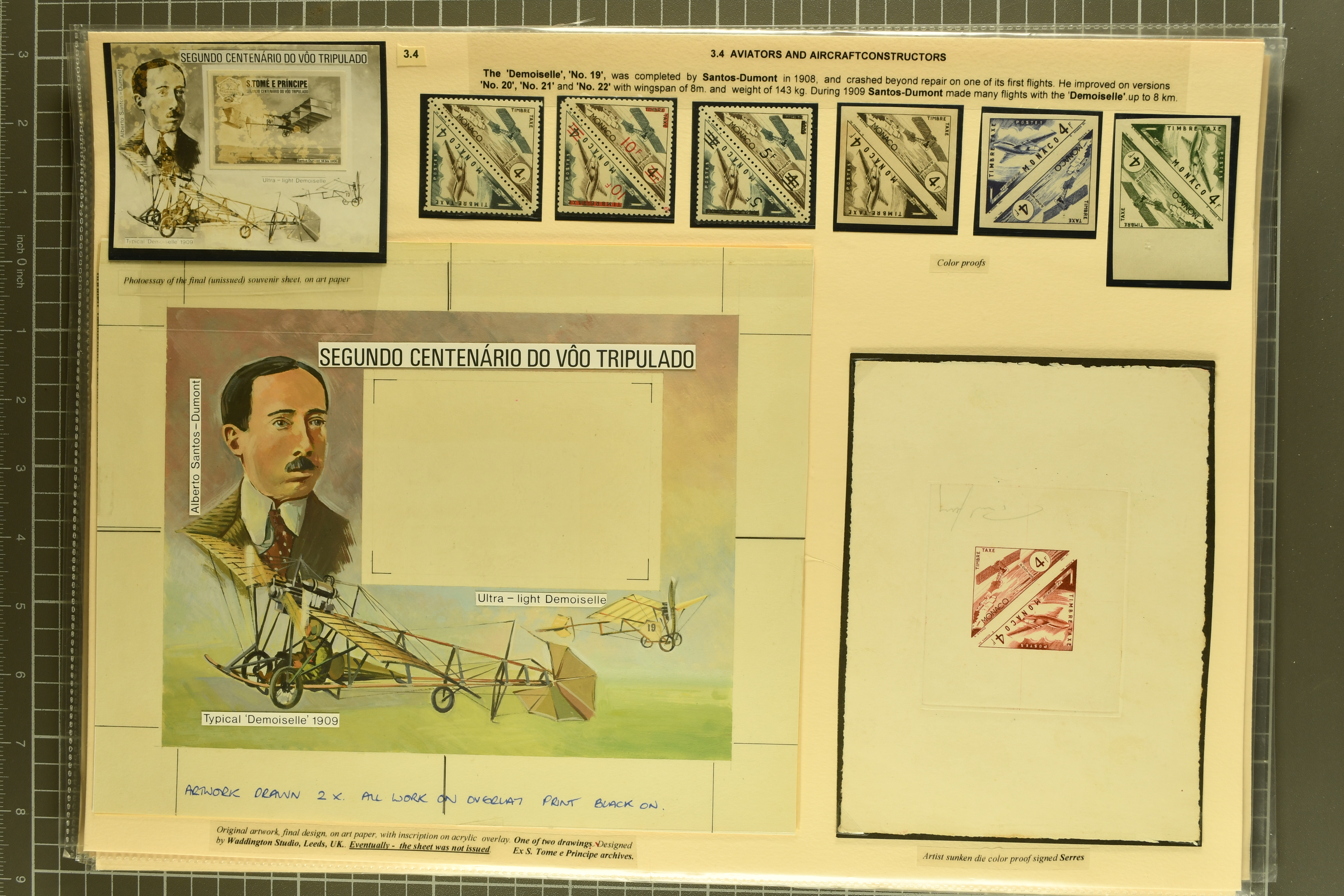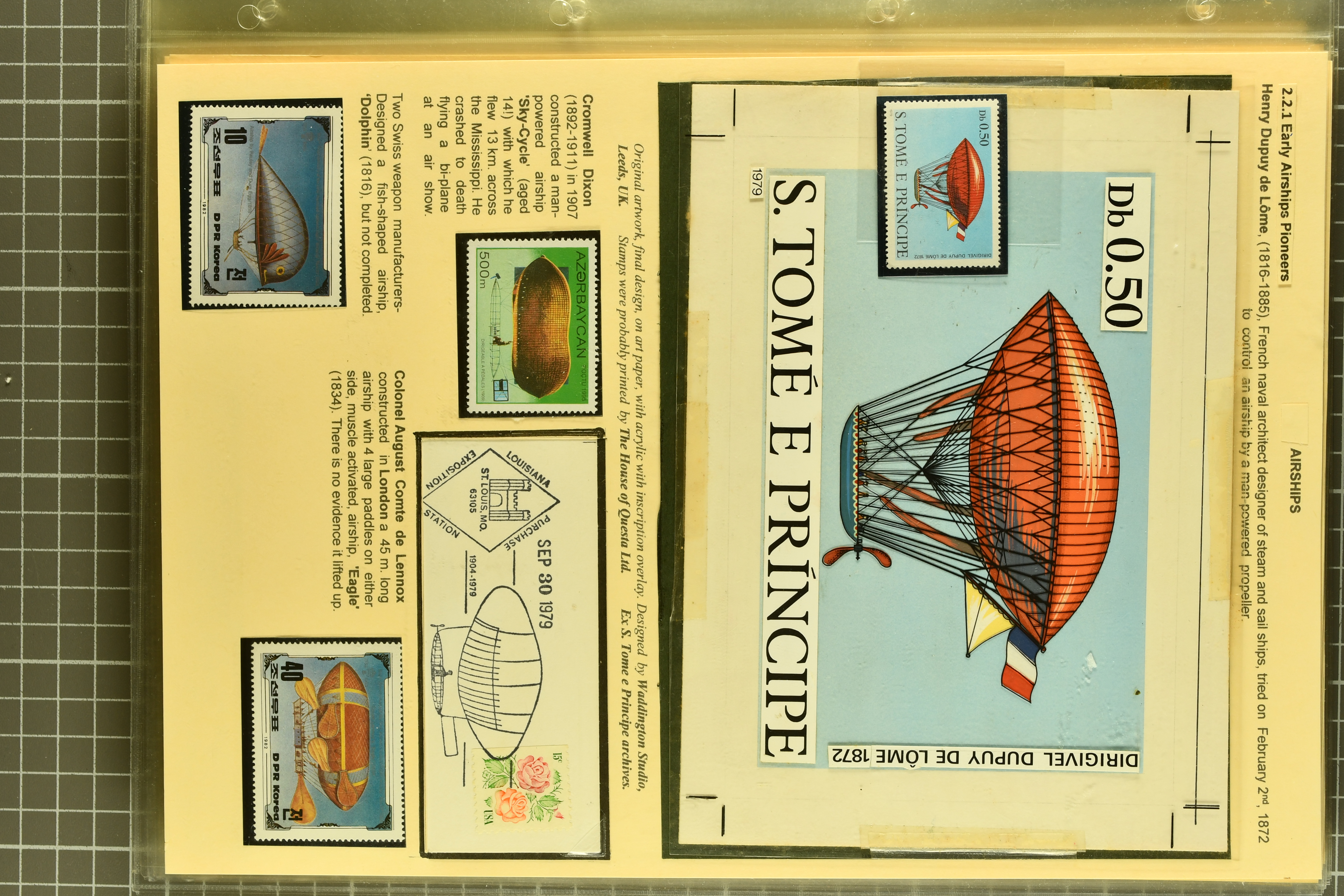 1491 **/*/cover/(*) image1979/2005: Airship, Aviator and Aircraft Constructors study collection, set-out upon 25 exhibition pages (x8 being A3), comprising over 200 items of which 16 are original artists artwork on cardboard, 28 proofs including sunken die proof, photographic and colour trials. Large quantity of Essay/Artwork/Minisheets for São Tomé and Príncipe airmail stamps, such as 200th Anniversary of Manned Flights, with a quantity of airmail related commenorative/airmail stamps from other countries including; Brazil (Santos Dumont portrait / airship), Denmark (Viggo Bang sketch and artwork), USA, Cuba, Czechoslovakia, DPR Korea, Gabon, Monoco, Slovakia, France, Sierra Leone, Canada, Syria, Jersey, Peru and others. Range of overprinted airmail issues including varieties. Colourful and visually appealing thematic study, with many scarce and fine items. Ex. The ‘Izhak Barak’ Collection: The Development of Aviation and Transportation of Mail by Air until 1914 (Image 1) (Image 2) (Image 3) (Image 4) (Image 5) (Image 6) (Image 7) (Image 8) (Image 9) (Image 10) (Image 11) (Image 12) (Image 13) (Image 14) (Image 15) (Image 16) (Image 17) (Image 18) (Image 19) (Image 20) (Image 21) (Image 22) (Image 23) (Image 24) (Image 25) (Image 26) (Image 27) (Image 28)
