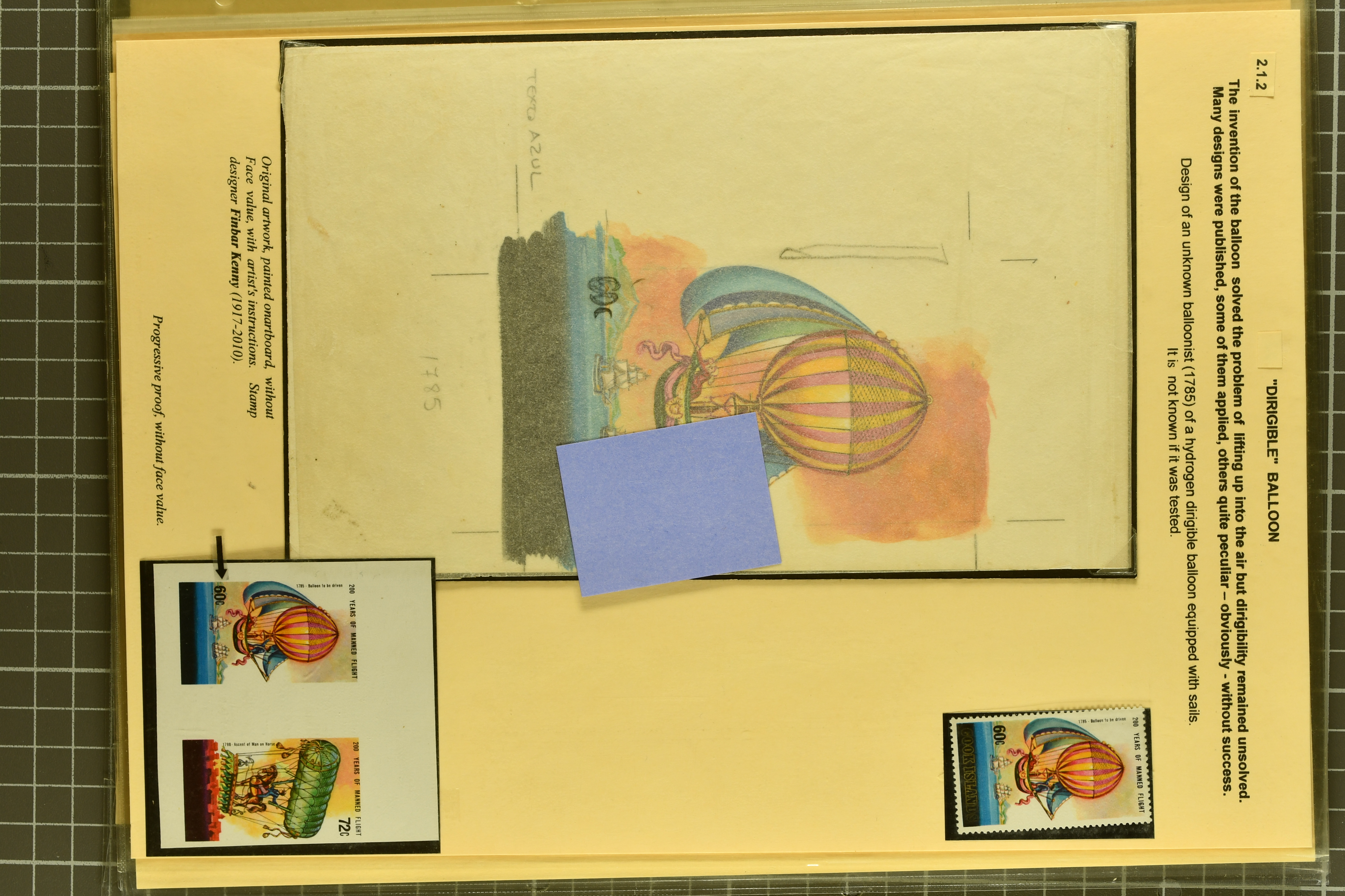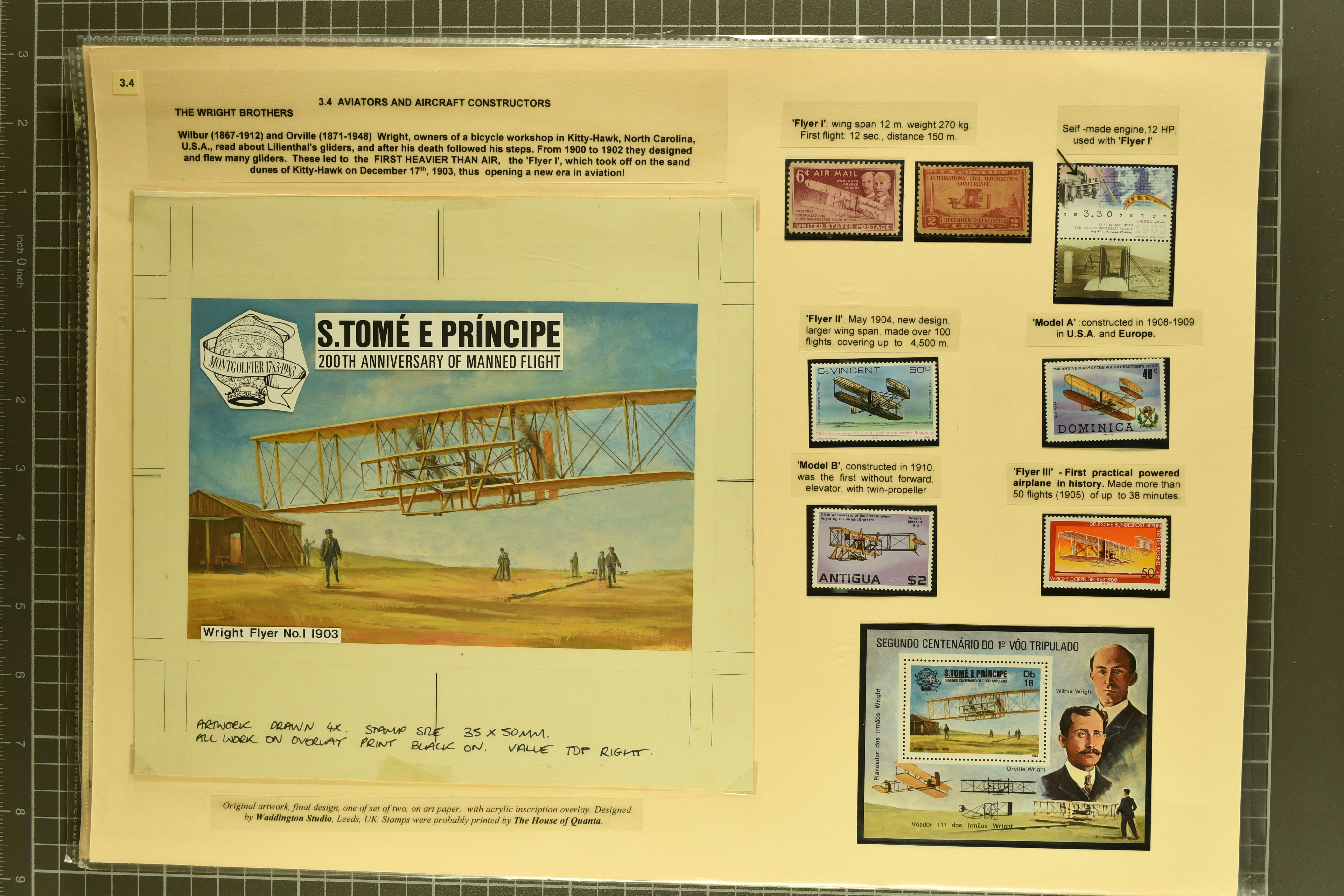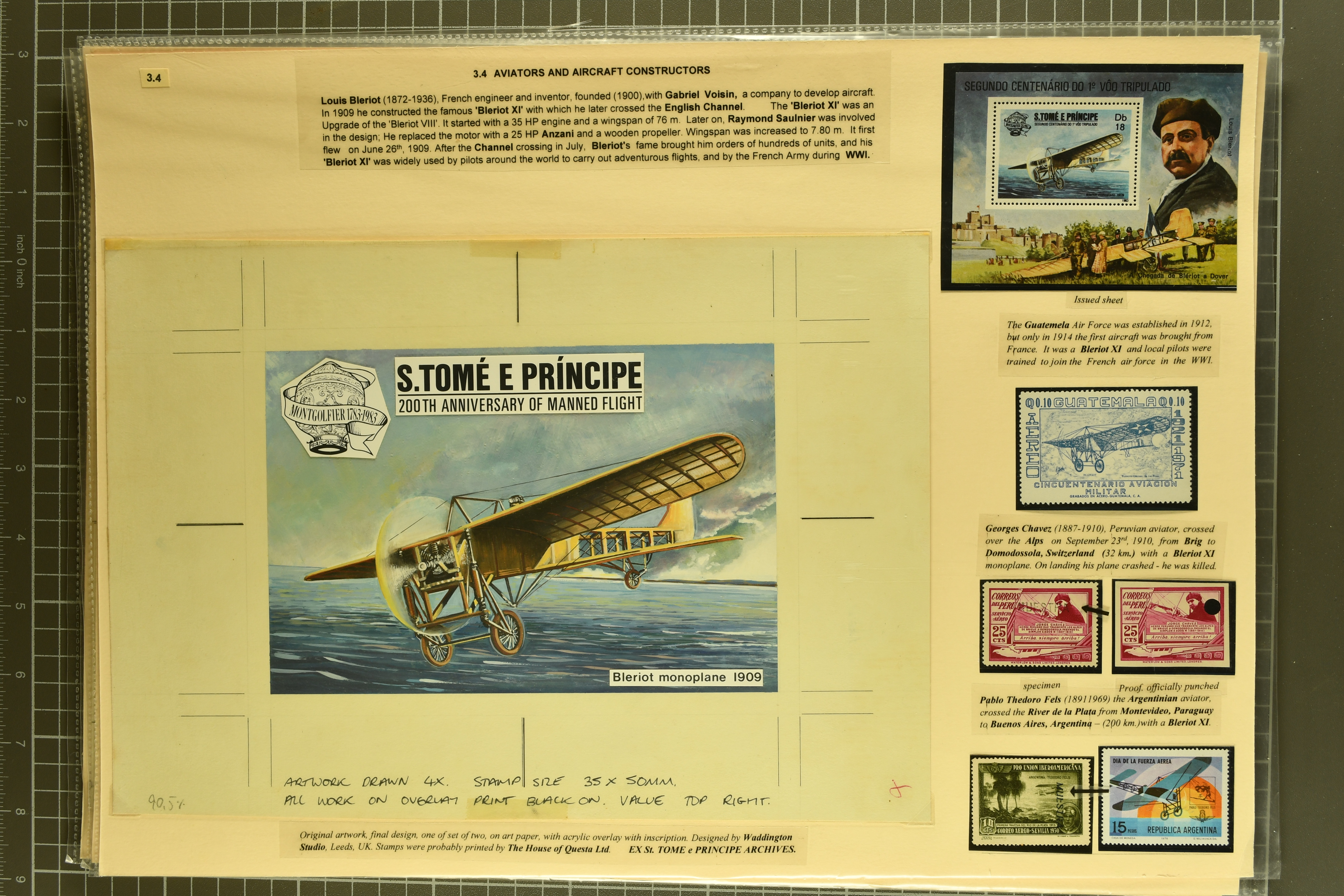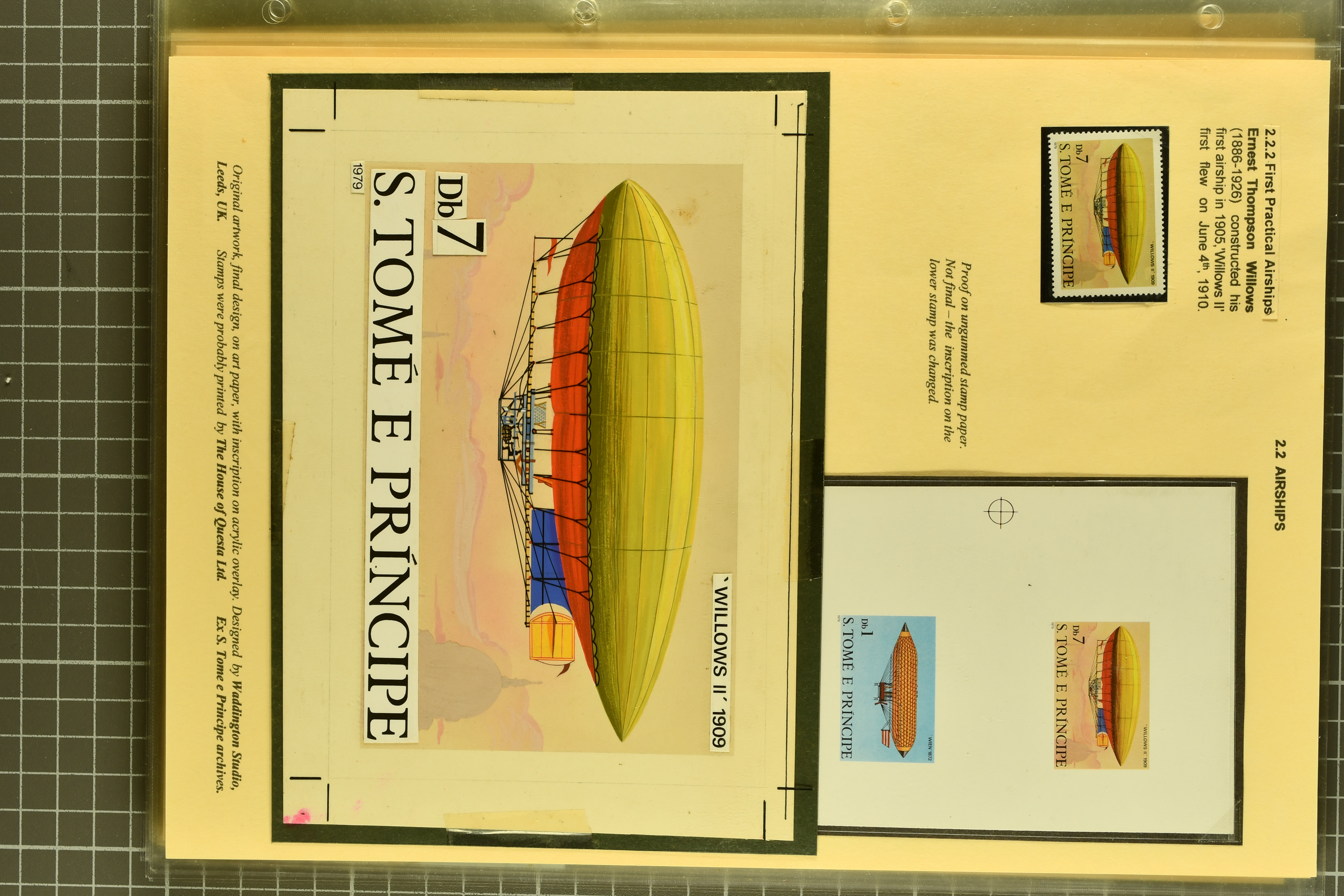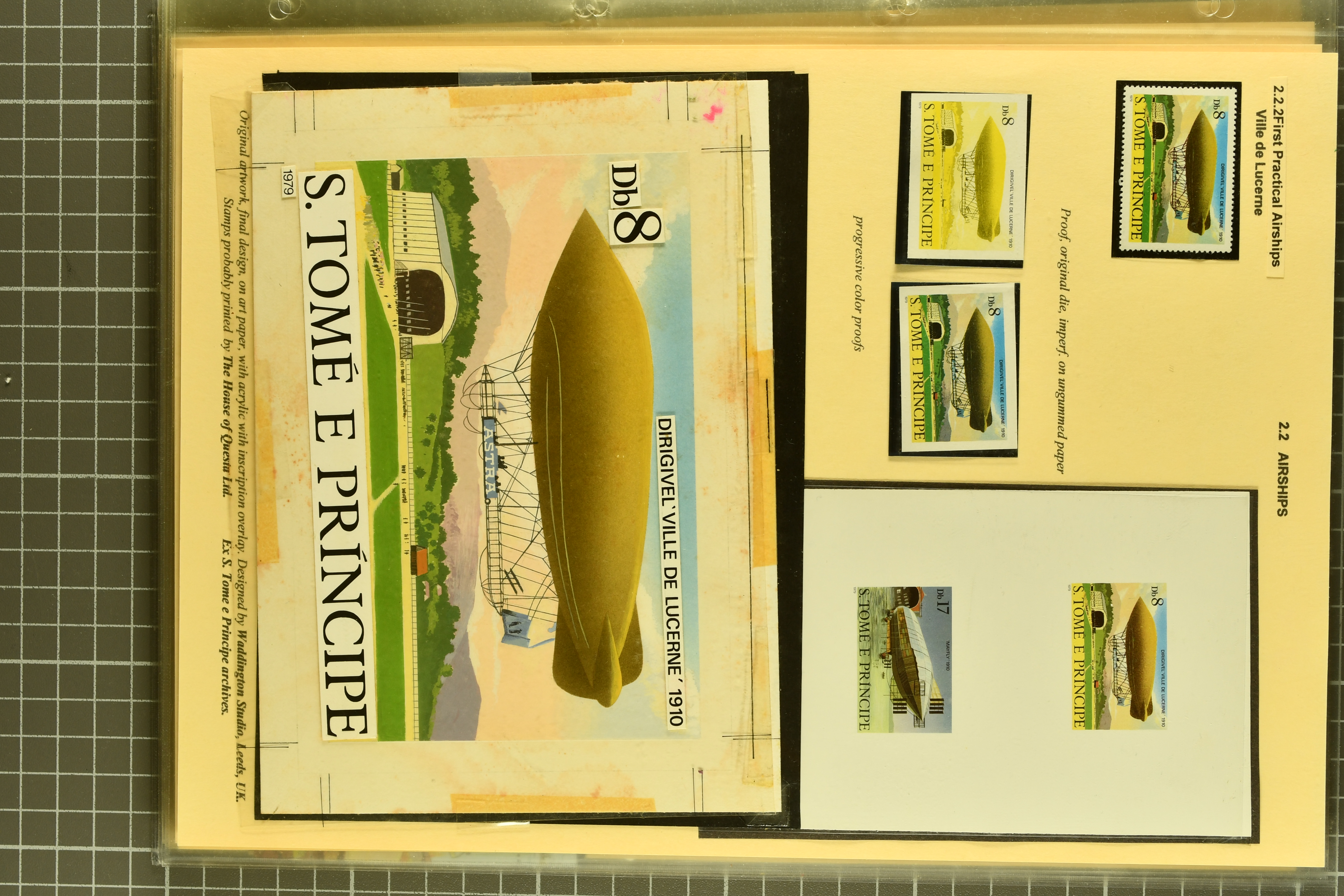 1491 **/*/cover/(*) image1979/2005: Airship, Aviator and Aircraft Constructors study collection, set-out upon 25 exhibition pages (x8 being A3), comprising over 200 items of which 16 are original artists artwork on cardboard, 28 proofs including sunken die proof, photographic and colour trials. Large quantity of Essay/Artwork/Minisheets for São Tomé and Príncipe airmail stamps, such as 200th Anniversary of Manned Flights, with a quantity of airmail related commenorative/airmail stamps from other countries including; Brazil (Santos Dumont portrait / airship), Denmark (Viggo Bang sketch and artwork), USA, Cuba, Czechoslovakia, DPR Korea, Gabon, Monoco, Slovakia, France, Sierra Leone, Canada, Syria, Jersey, Peru and others. Range of overprinted airmail issues including varieties. Colourful and visually appealing thematic study, with many scarce and fine items. Ex. The ‘Izhak Barak’ Collection: The Development of Aviation and Transportation of Mail by Air until 1914 (Image 1) (Image 2) (Image 3) (Image 4) (Image 5) (Image 6) (Image 7) (Image 8) (Image 9) (Image 10) (Image 11) (Image 12) (Image 13) (Image 14) (Image 15) (Image 16) (Image 17) (Image 18) (Image 19) (Image 20) (Image 21) (Image 22) (Image 23) (Image 24) (Image 25) (Image 26) (Image 27) (Image 28)