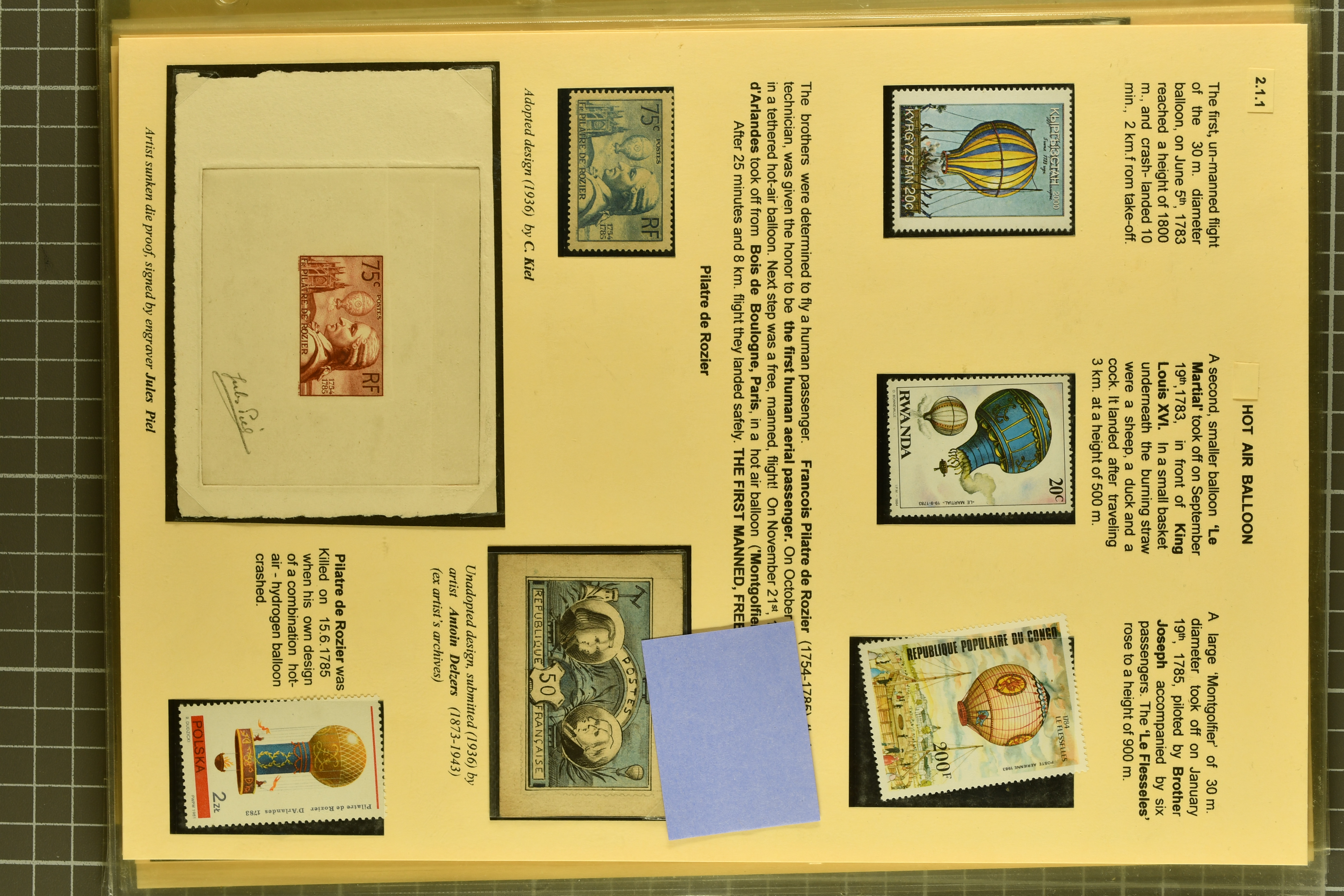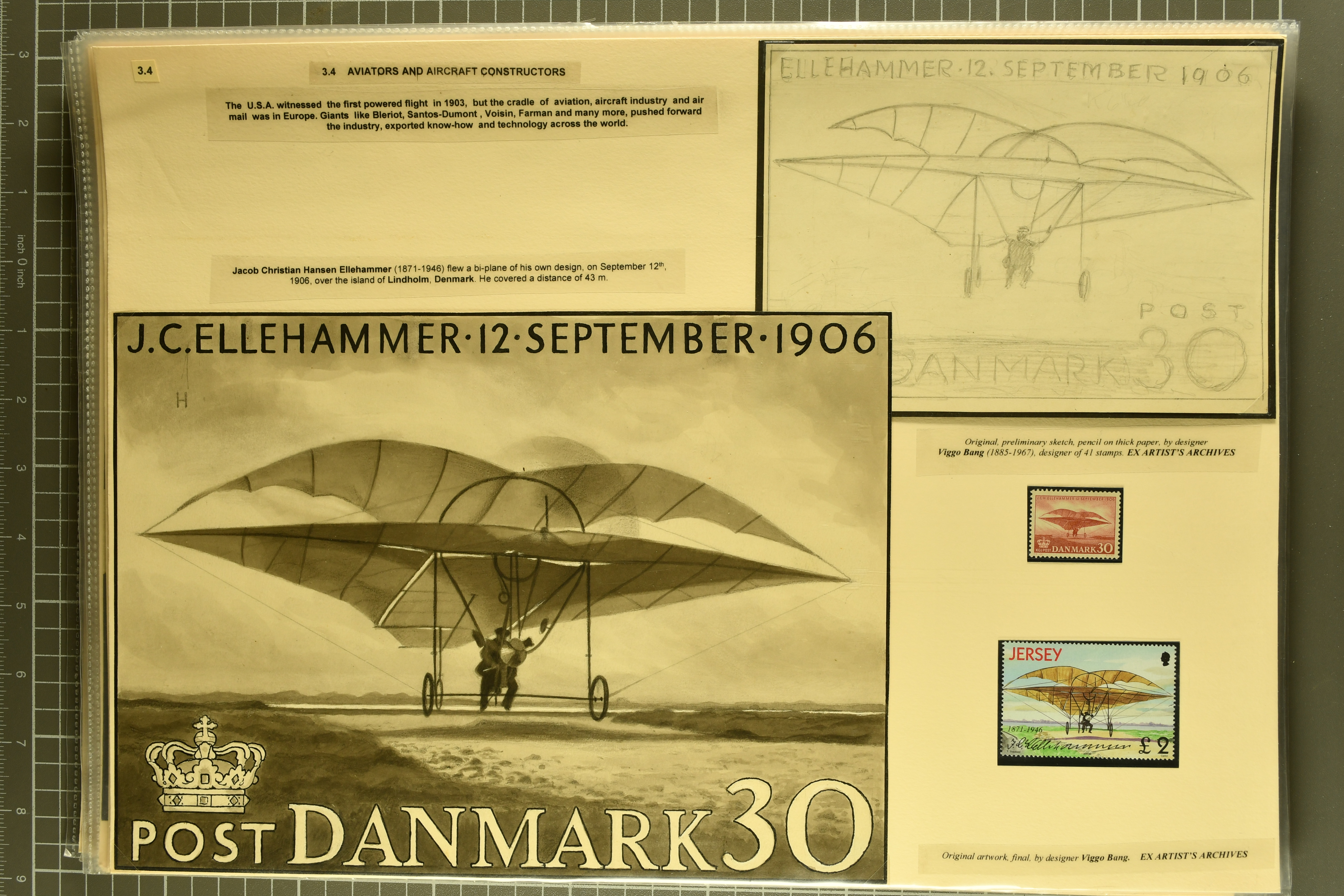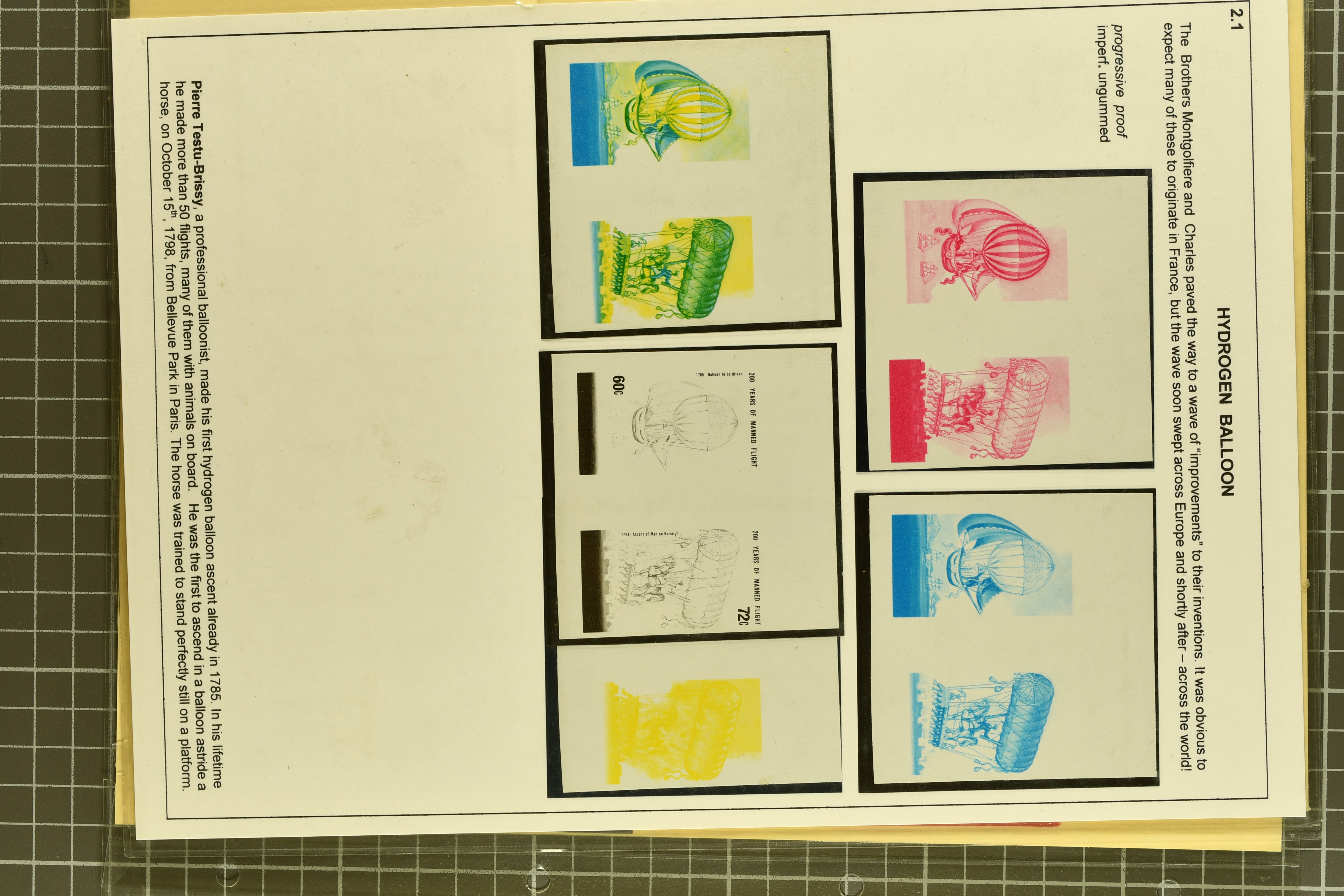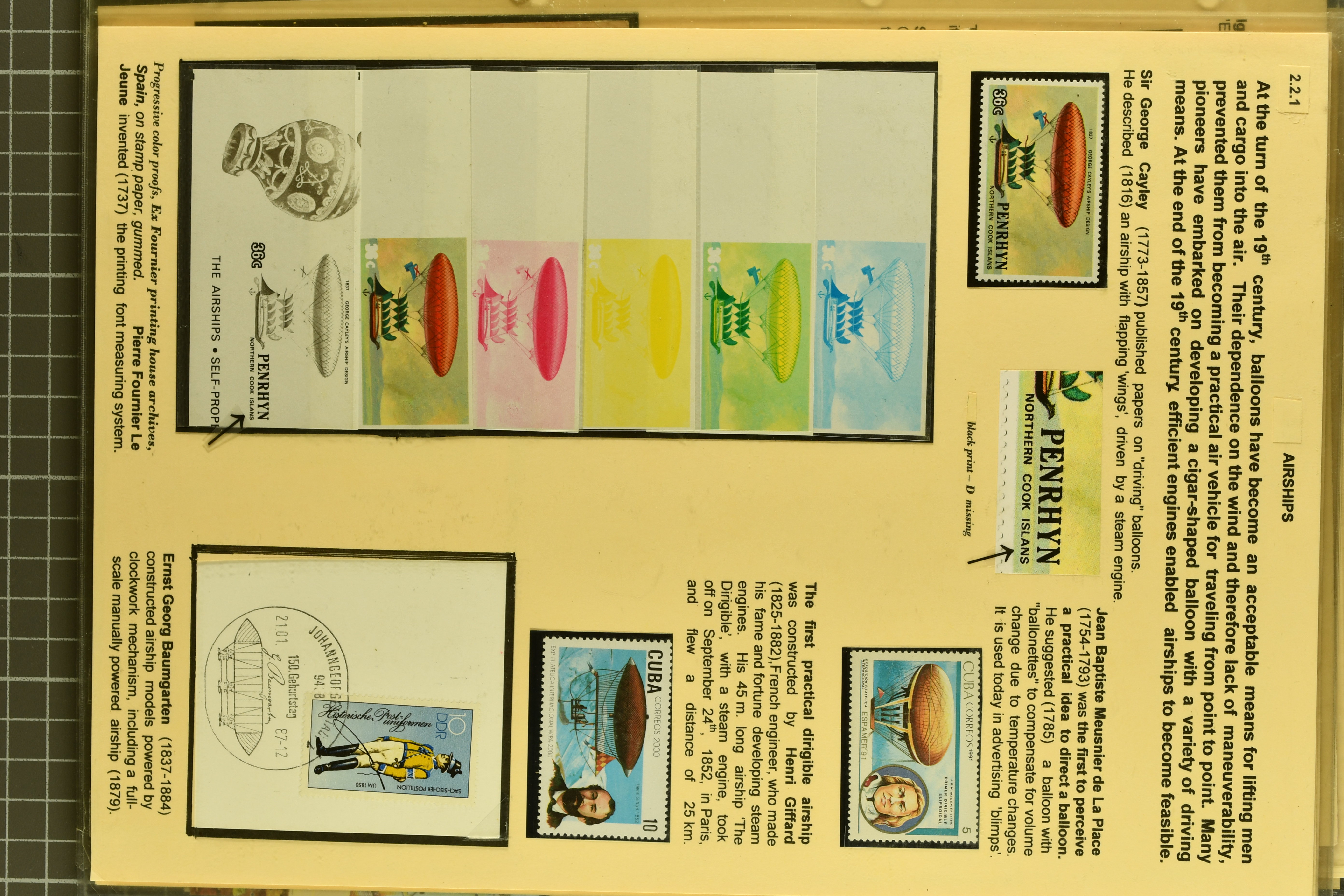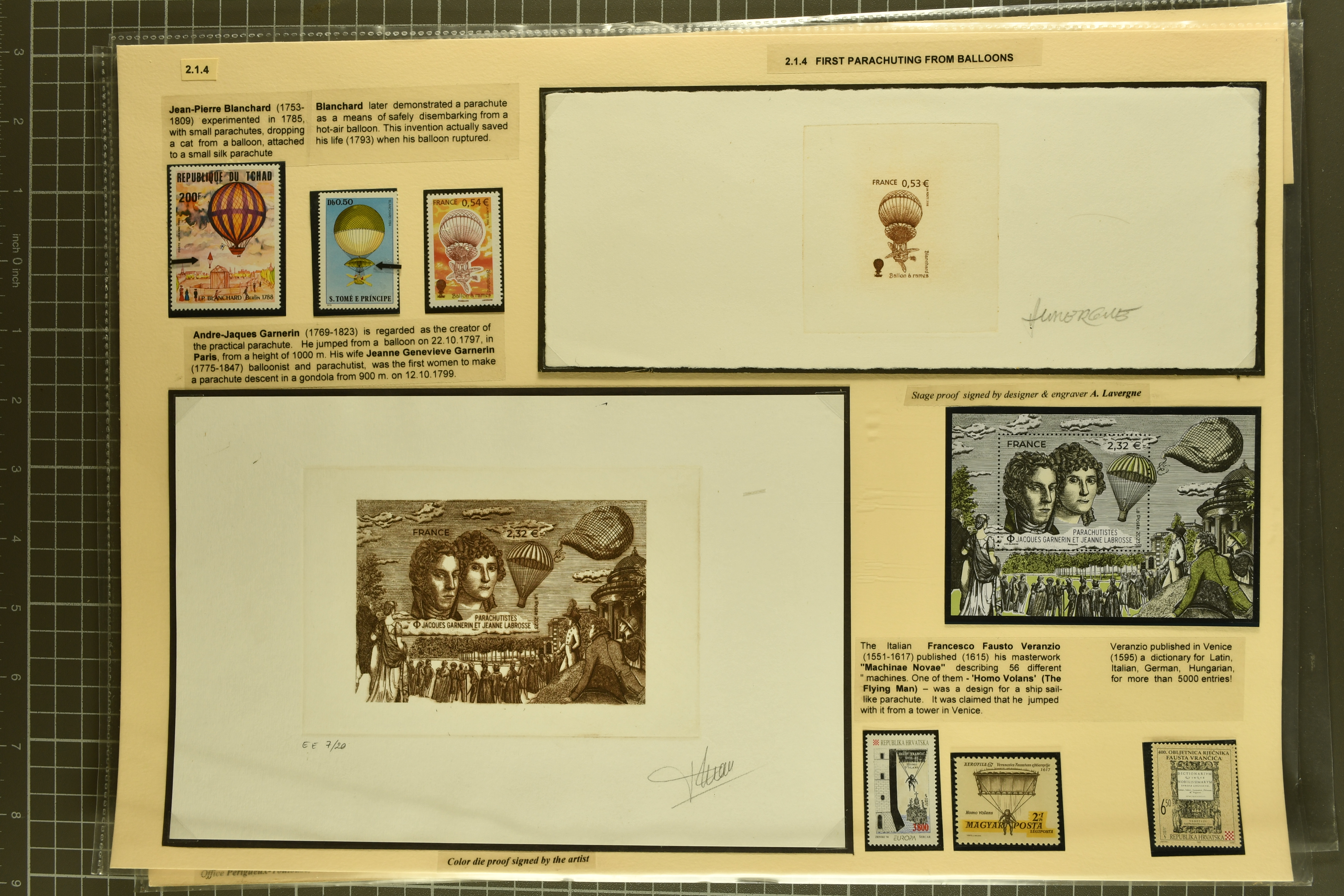 1491 **/*/cover/(*) image1979/2005: Airship, Aviator and Aircraft Constructors study collection, set-out upon 25 exhibition pages (x8 being A3), comprising over 200 items of which 16 are original artists artwork on cardboard, 28 proofs including sunken die proof, photographic and colour trials. Large quantity of Essay/Artwork/Minisheets for São Tomé and Príncipe airmail stamps, such as 200th Anniversary of Manned Flights, with a quantity of airmail related commenorative/airmail stamps from other countries including; Brazil (Santos Dumont portrait / airship), Denmark (Viggo Bang sketch and artwork), USA, Cuba, Czechoslovakia, DPR Korea, Gabon, Monoco, Slovakia, France, Sierra Leone, Canada, Syria, Jersey, Peru and others. Range of overprinted airmail issues including varieties. Colourful and visually appealing thematic study, with many scarce and fine items. Ex. The ‘Izhak Barak’ Collection: The Development of Aviation and Transportation of Mail by Air until 1914 (Image 1) (Image 2) (Image 3) (Image 4) (Image 5) (Image 6) (Image 7) (Image 8) (Image 9) (Image 10) (Image 11) (Image 12) (Image 13) (Image 14) (Image 15) (Image 16) (Image 17) (Image 18) (Image 19) (Image 20) (Image 21) (Image 22) (Image 23) (Image 24) (Image 25) (Image 26) (Image 27) (Image 28)