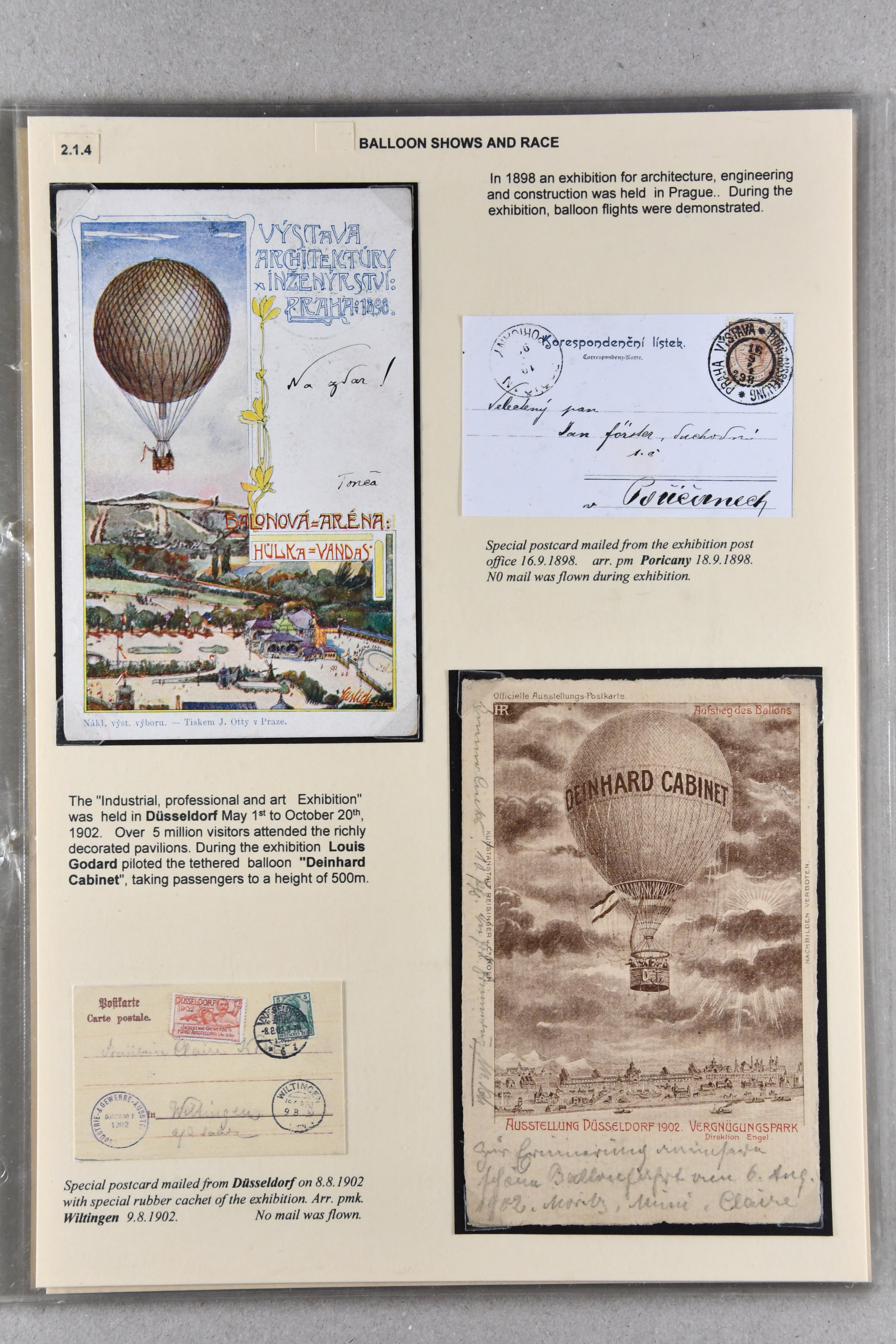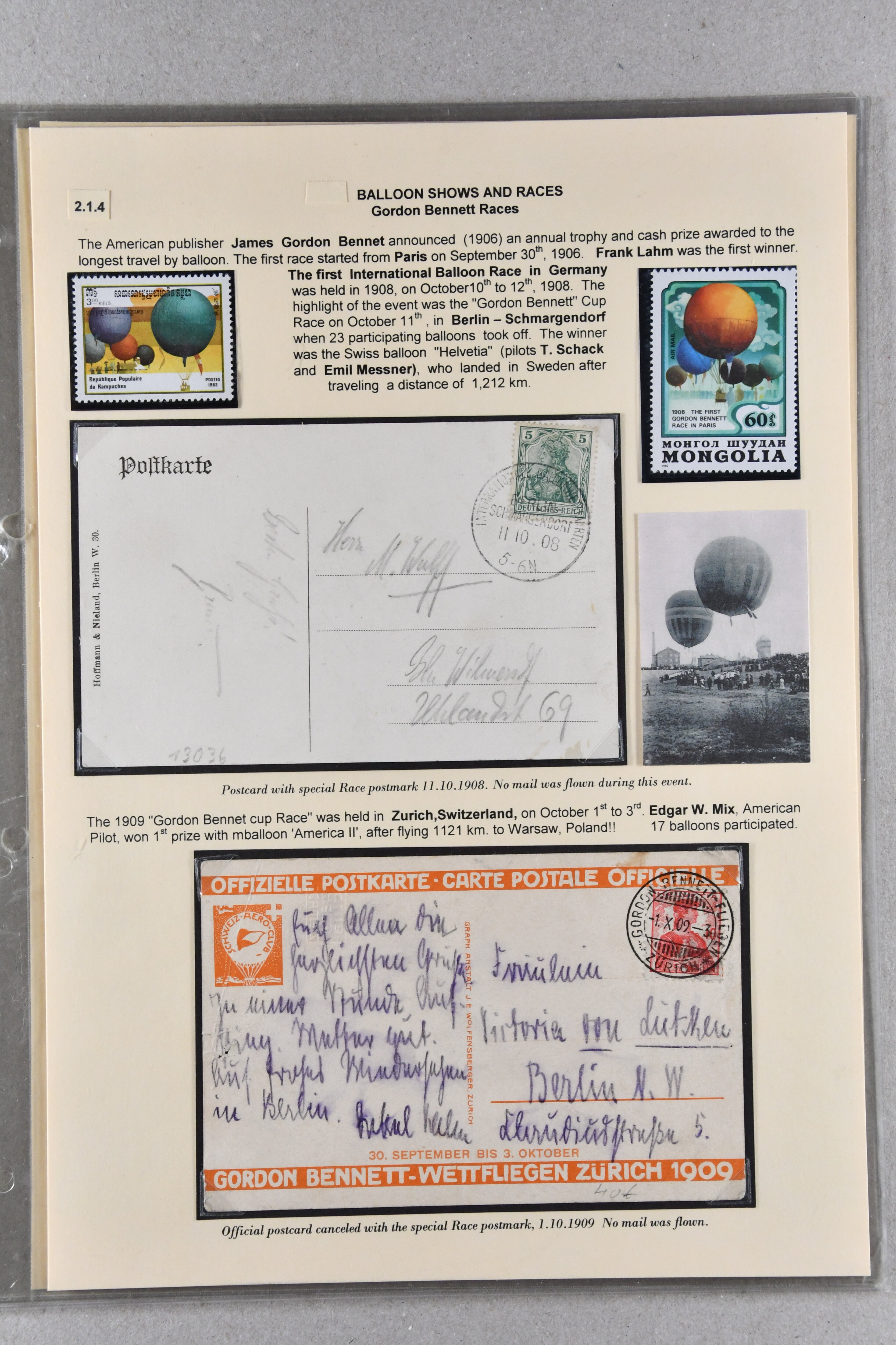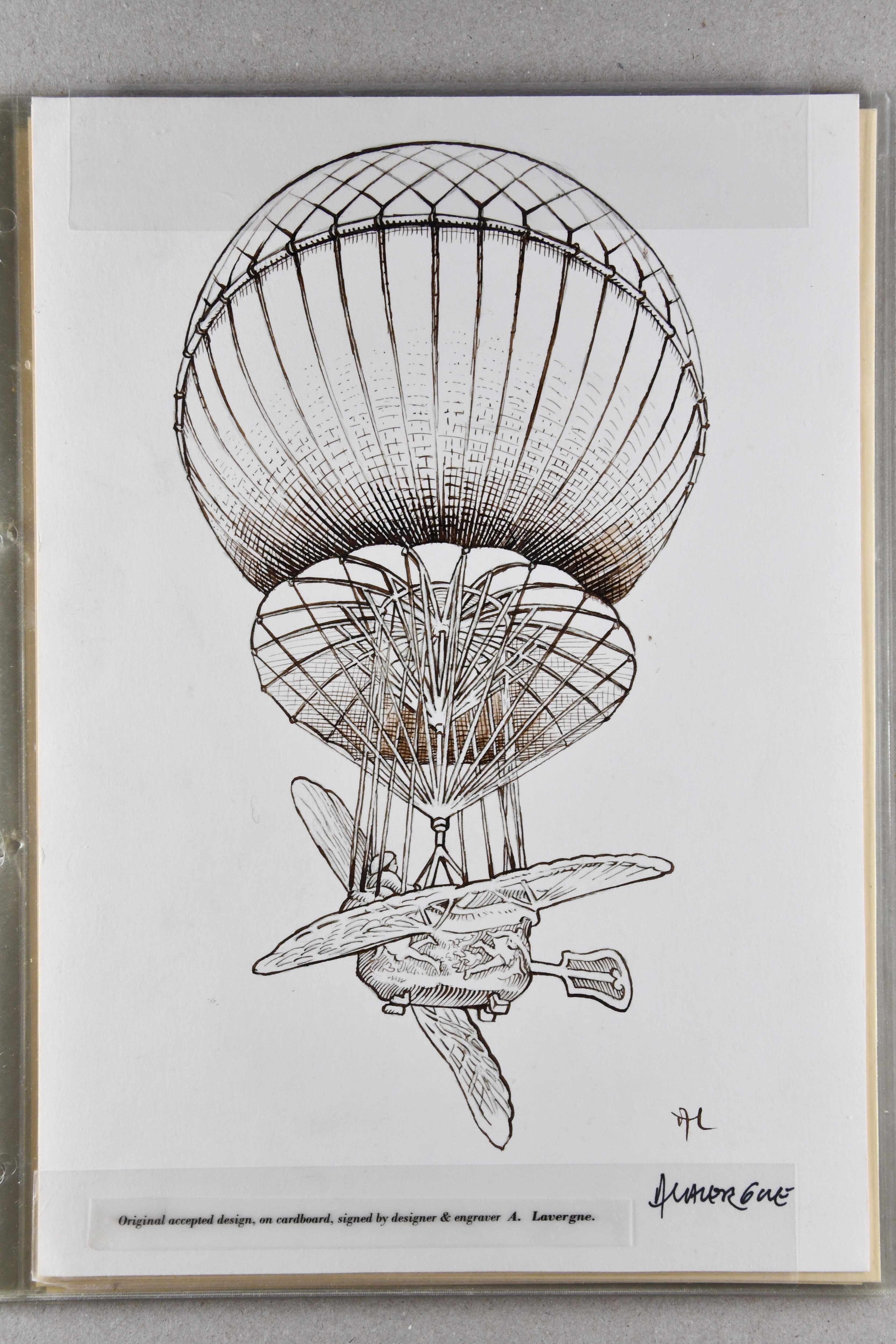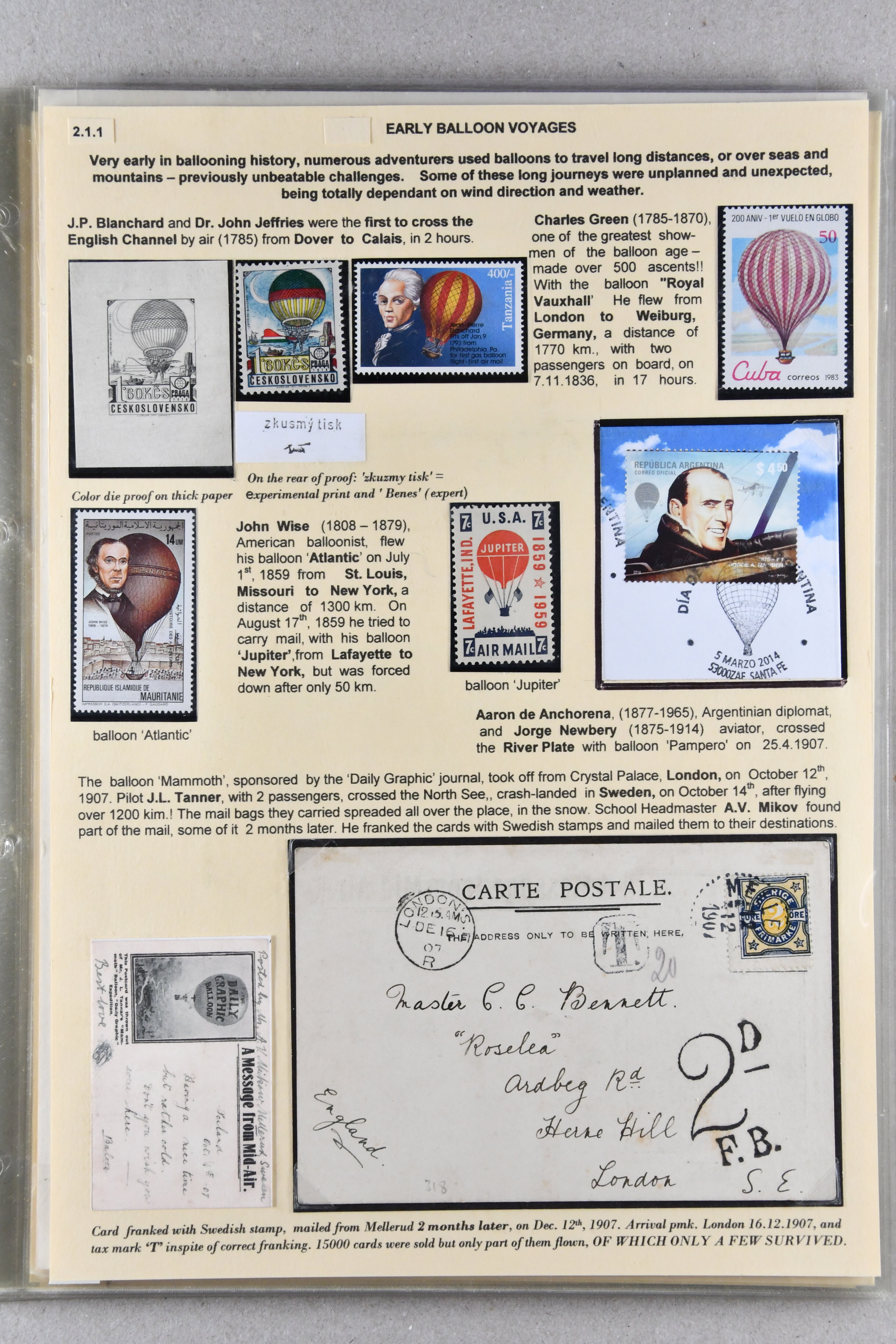 1504 cover image1891-1913: Collection of early Balloon voyages, shows and races, set-out on ten exhibition pages, comprising 19 early flight event cards, 14 commerative/balloon stamps, a Die Proof and 1 artists drawn Essay. Includes cards depicting balloons, from 1891 International Electromechanical Exhibition, 1894 souvenir card from the Lyon Exposition, 1896 National Swiss Exhibition, 1898 Austrian Jubilee Exhibition, 1907 "Daily Graphic" Expedition picture post card and others. The essay is an original accepted design on cardboard signed by designer and engraver A. Lavergne for a Czechoslovakia balloon stamp. There is a Die proof of the stamp and an unused example. Also, included is a page of more modern material with a card and three stamps. Additionally, two A3 size exhibition pages relating to Parachuting from Balloons, with 3 sunken die proofs signed by A. Lavergne, 9 commemorative/balloon stamps and 3 minisheets.Condition is in the main fine. Scarce group. Ex. The ‘Izhak Barak’ Collection: The Development of Aviation and Transportation of Mail by Air until 1914 (Image 1) (Image 2) (Image 3) (Image 4) (Image 5) (Image 6) (Image 7) (Image 8) (Image 9) (Image 10) (Image 11)