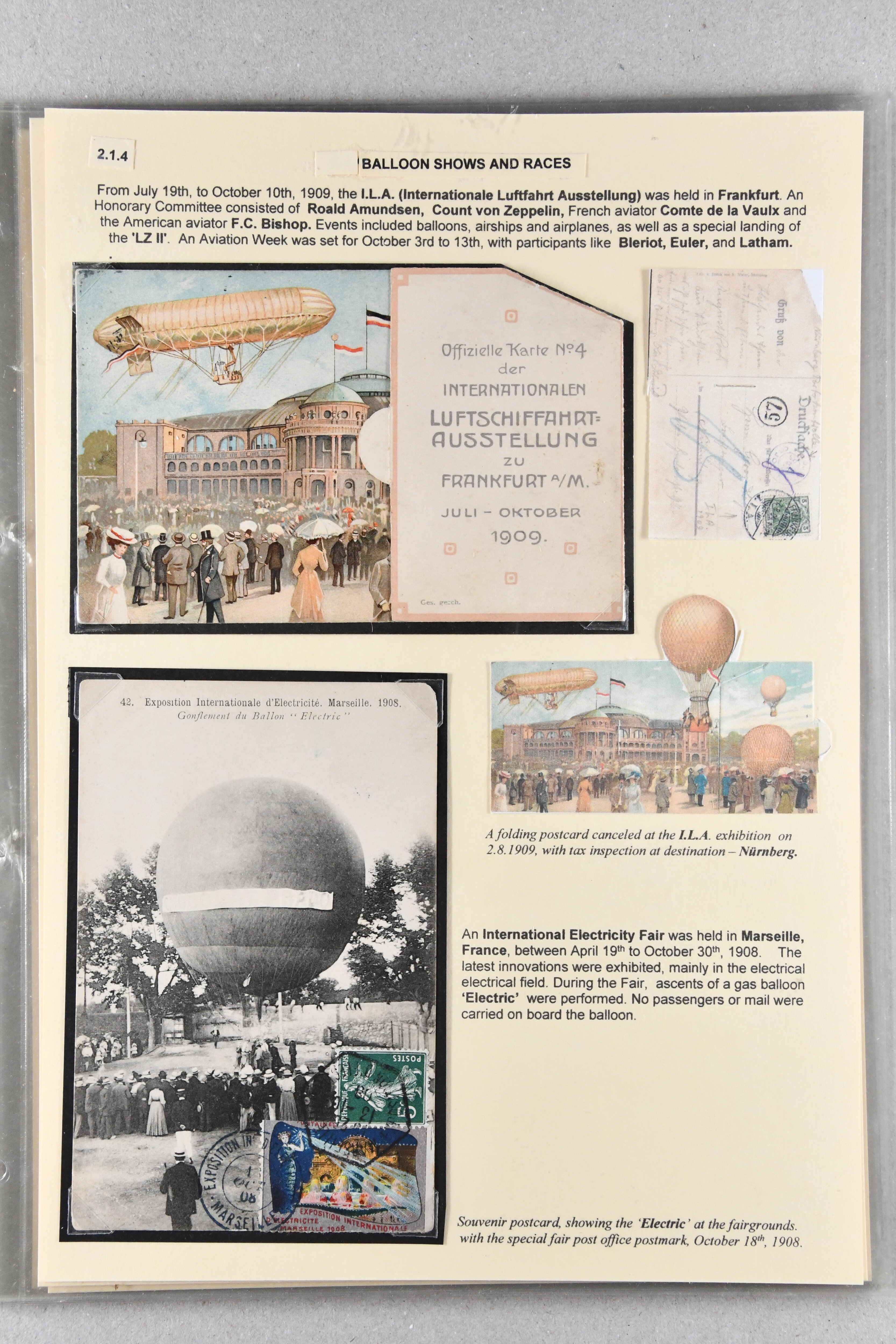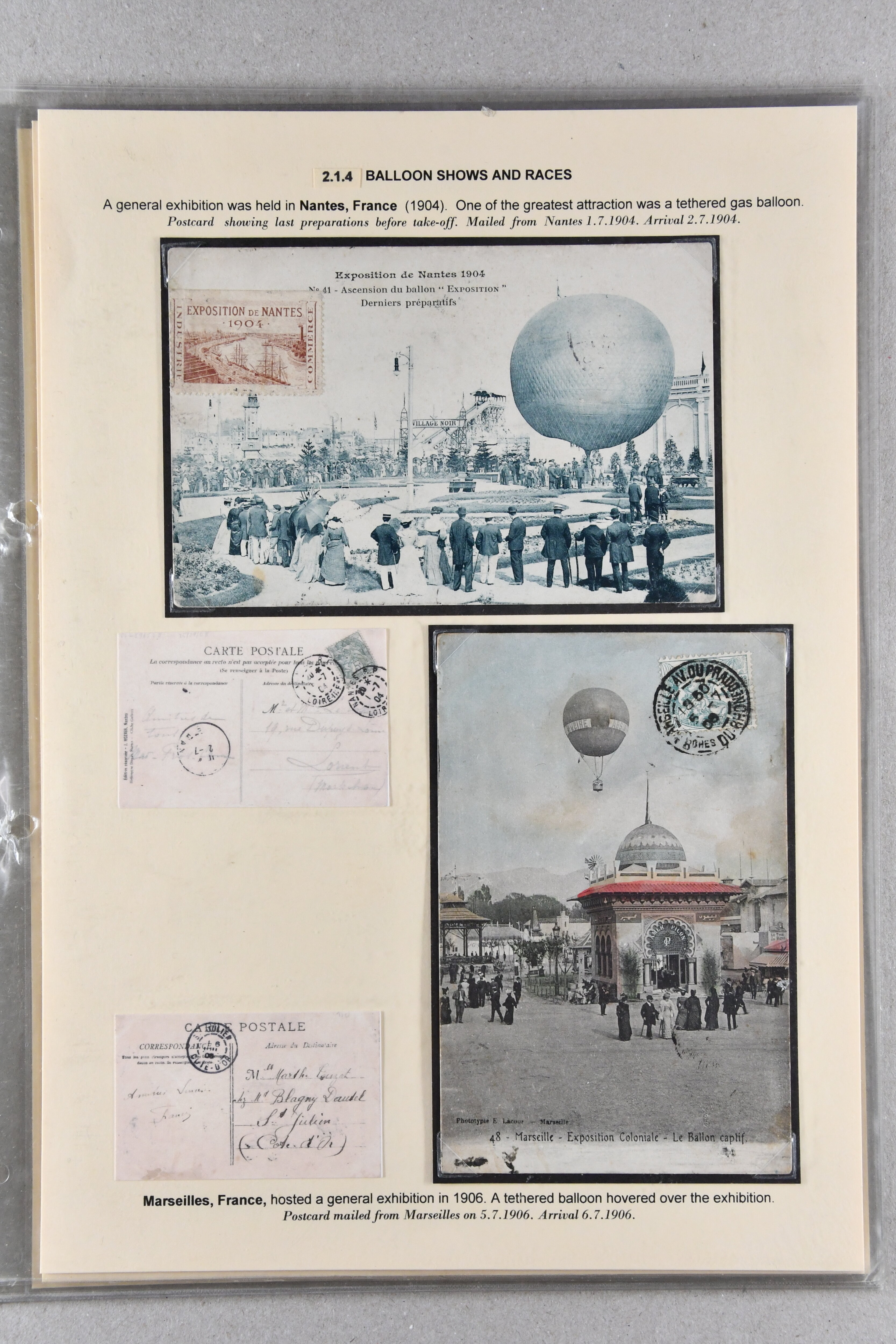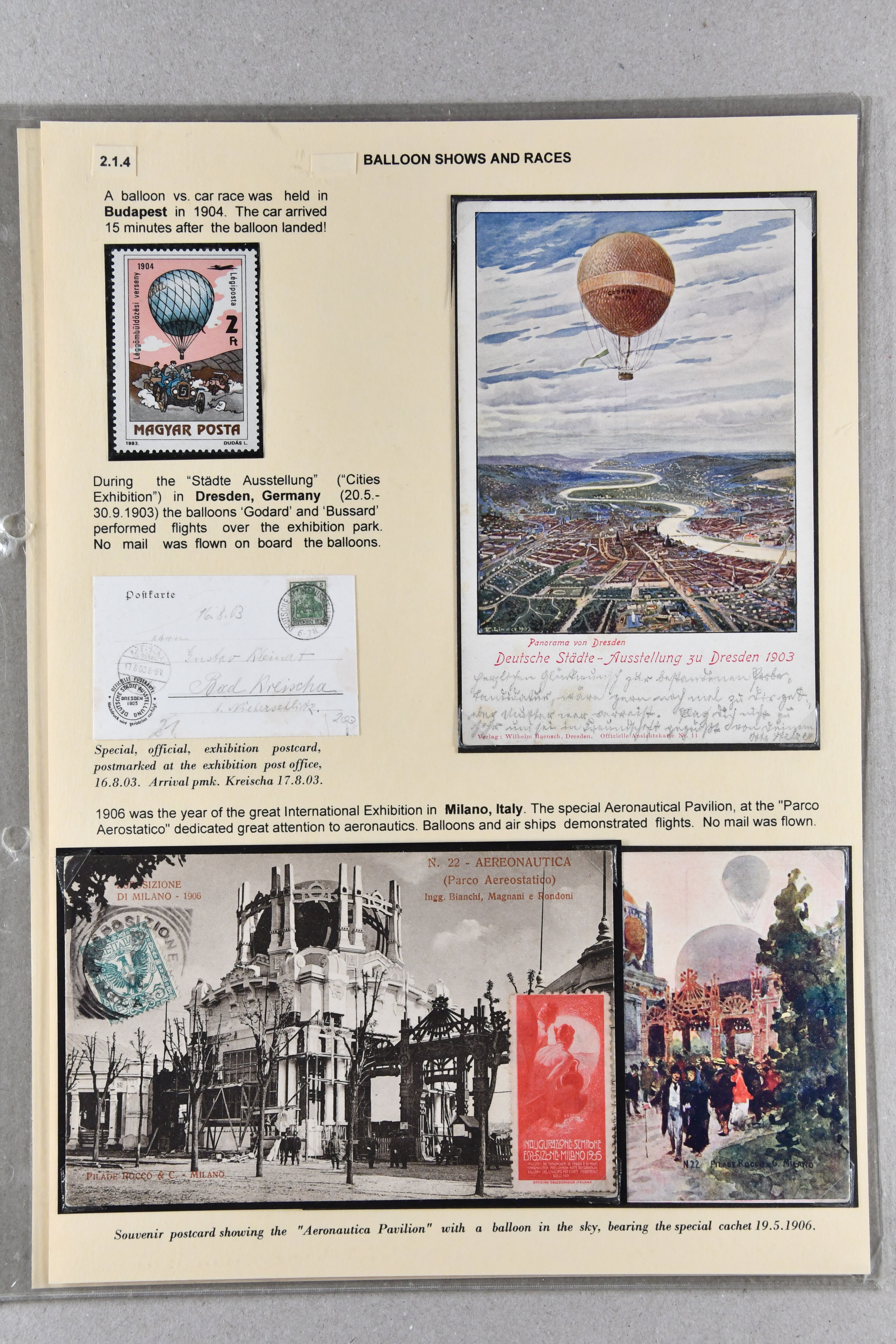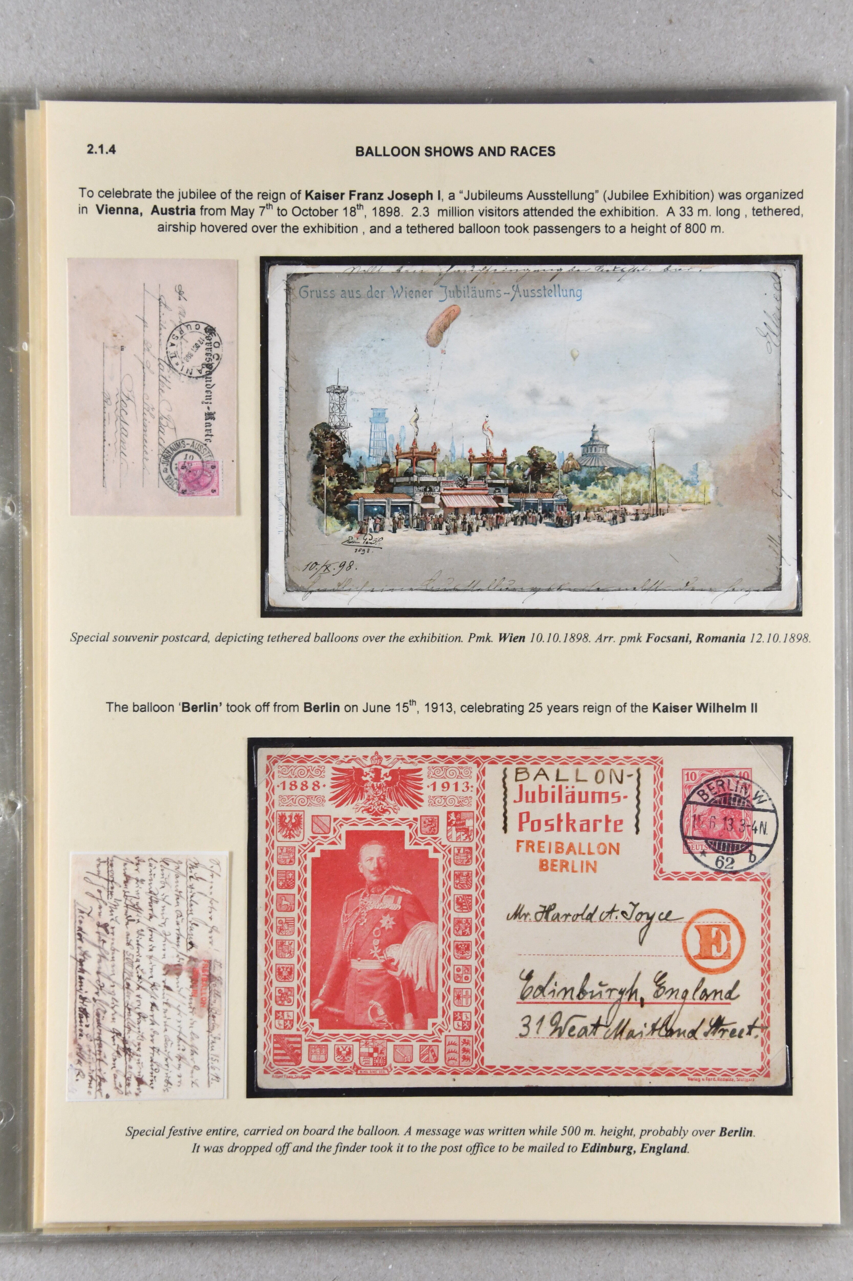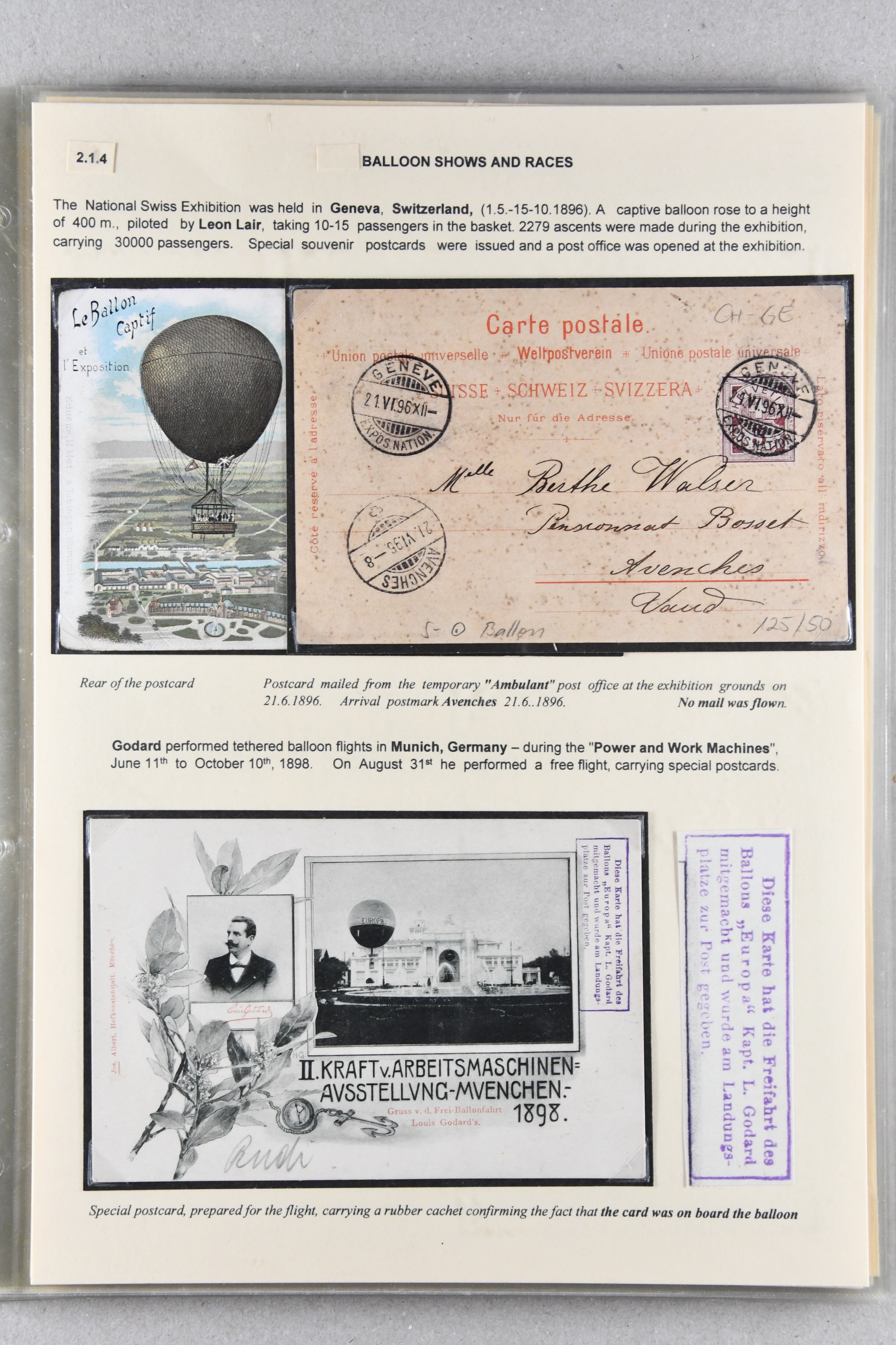 1504 cover image1891-1913: Collection of early Balloon voyages, shows and races, set-out on ten exhibition pages, comprising 19 early flight event cards, 14 commerative/balloon stamps, a Die Proof and 1 artists drawn Essay. Includes cards depicting balloons, from 1891 International Electromechanical Exhibition, 1894 souvenir card from the Lyon Exposition, 1896 National Swiss Exhibition, 1898 Austrian Jubilee Exhibition, 1907 "Daily Graphic" Expedition picture post card and others. The essay is an original accepted design on cardboard signed by designer and engraver A. Lavergne for a Czechoslovakia balloon stamp. There is a Die proof of the stamp and an unused example. Also, included is a page of more modern material with a card and three stamps. Additionally, two A3 size exhibition pages relating to Parachuting from Balloons, with 3 sunken die proofs signed by A. Lavergne, 9 commemorative/balloon stamps and 3 minisheets.Condition is in the main fine. Scarce group. Ex. The ‘Izhak Barak’ Collection: The Development of Aviation and Transportation of Mail by Air until 1914 (Image 1) (Image 2) (Image 3) (Image 4) (Image 5) (Image 6) (Image 7) (Image 8) (Image 9) (Image 10) (Image 11)
