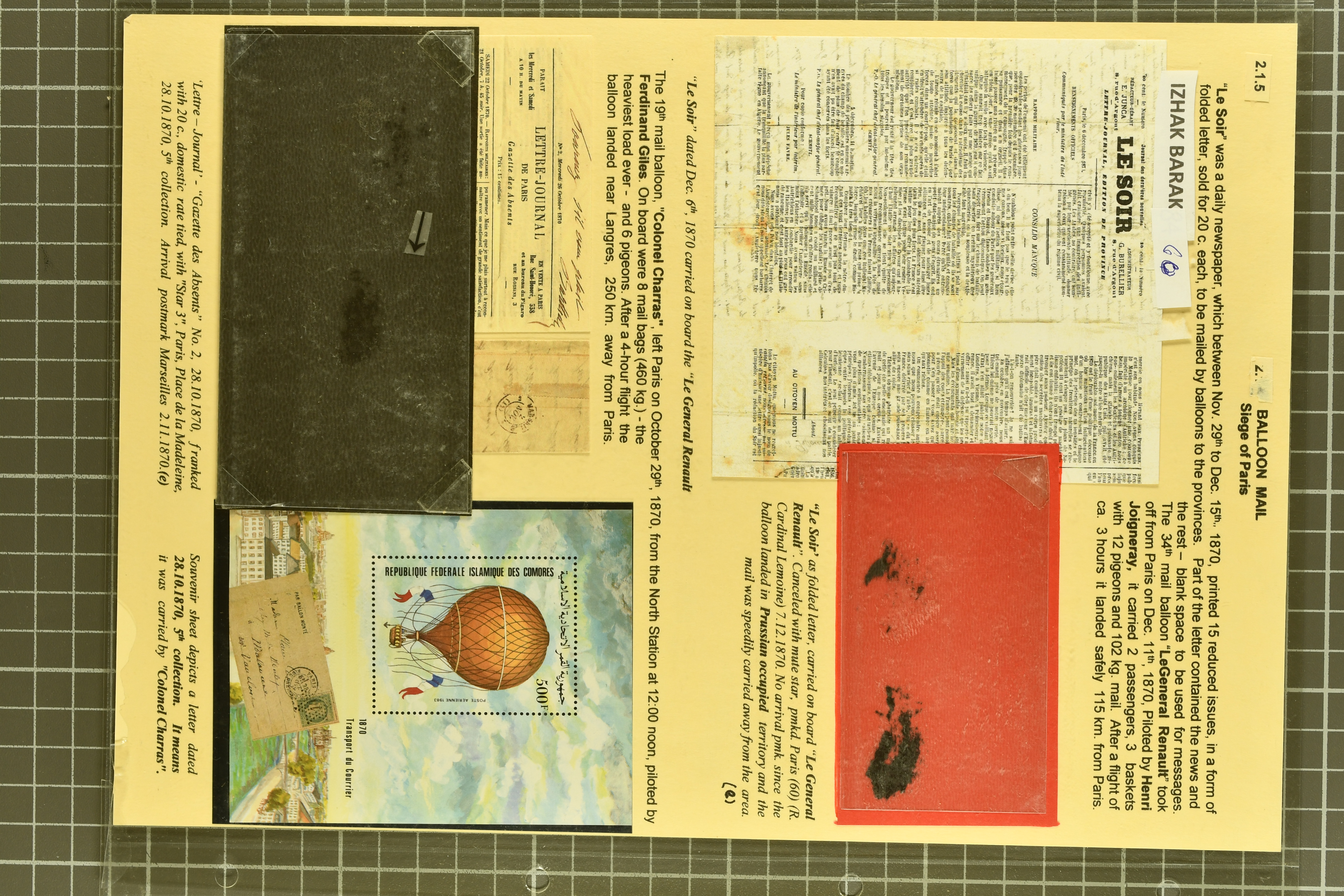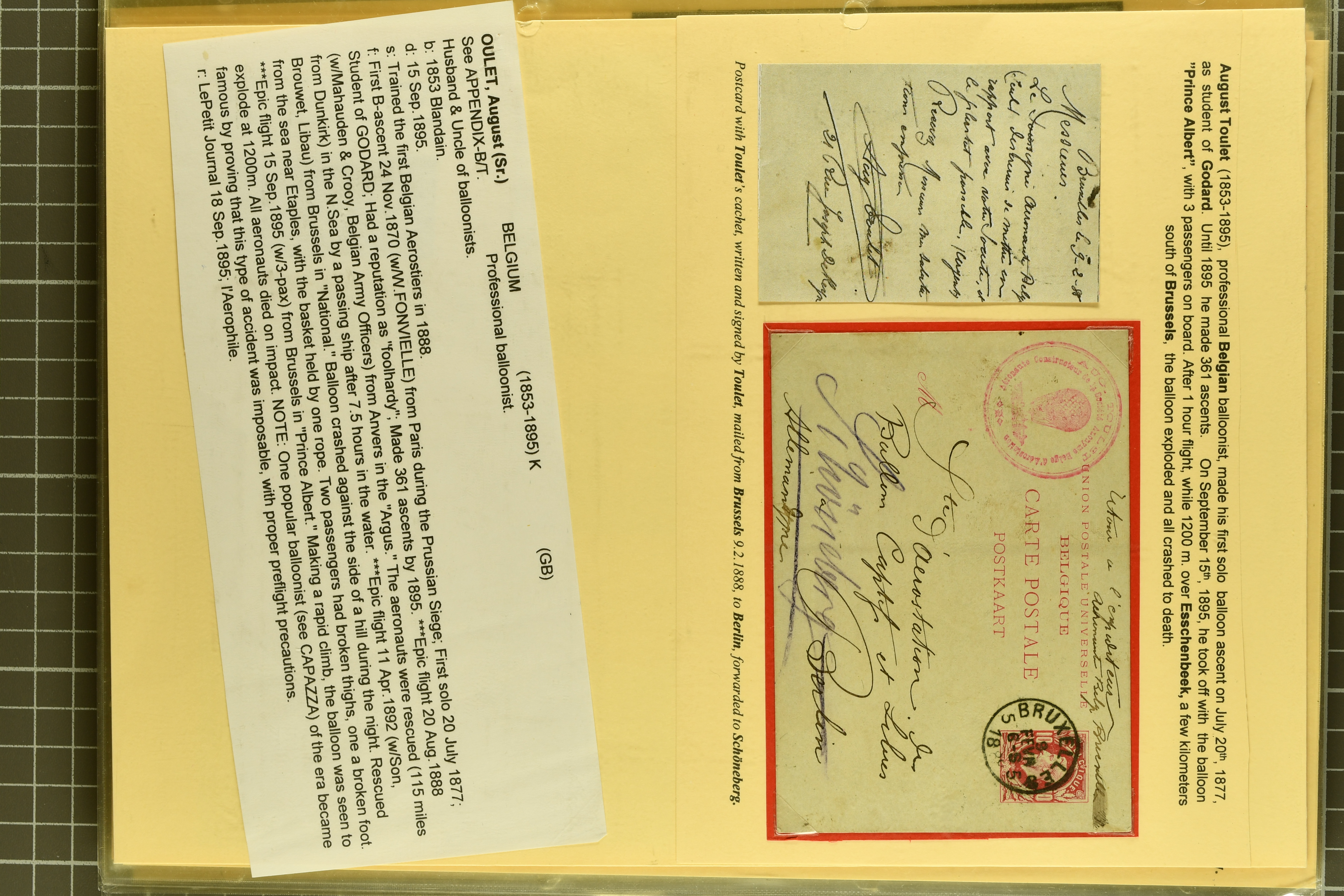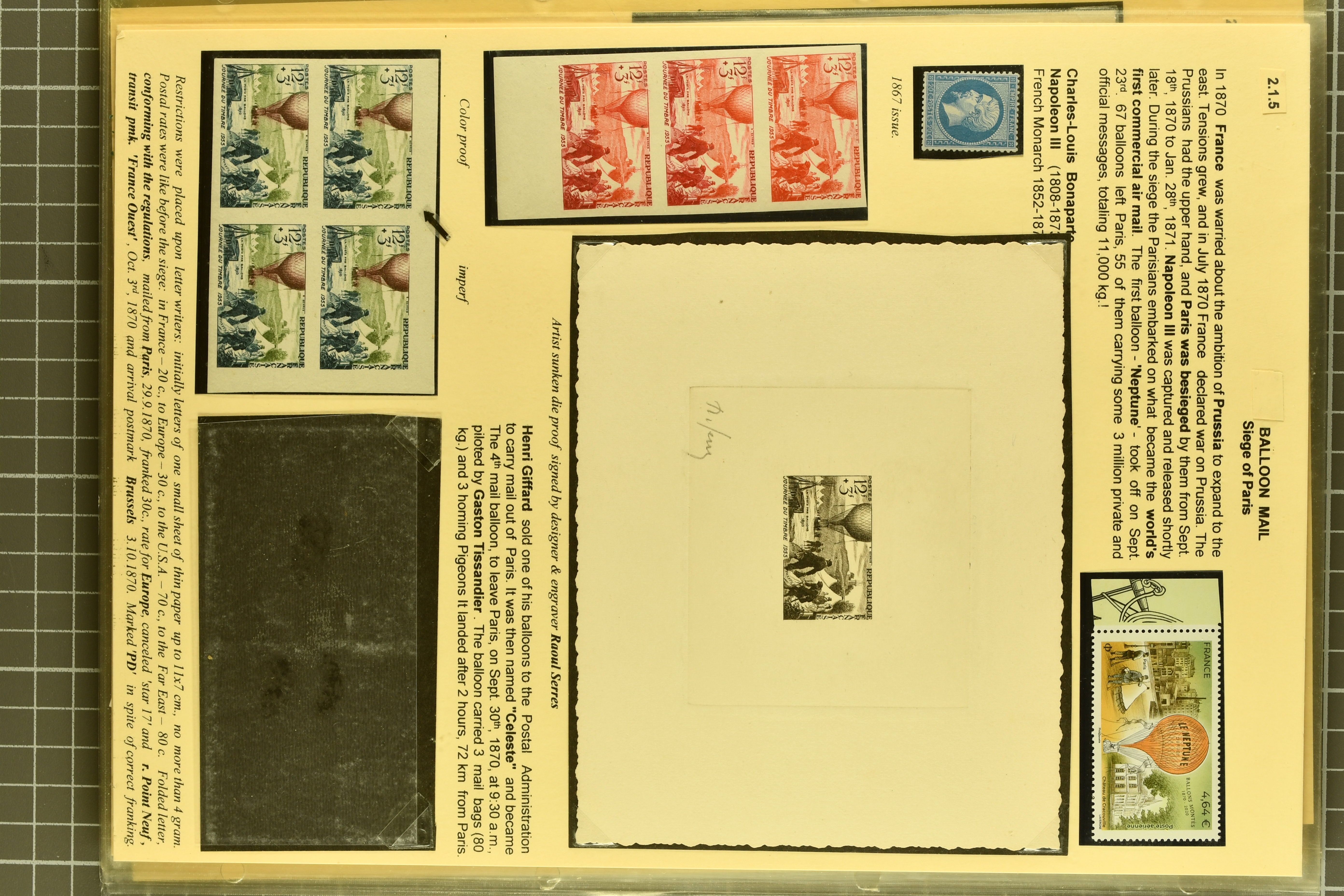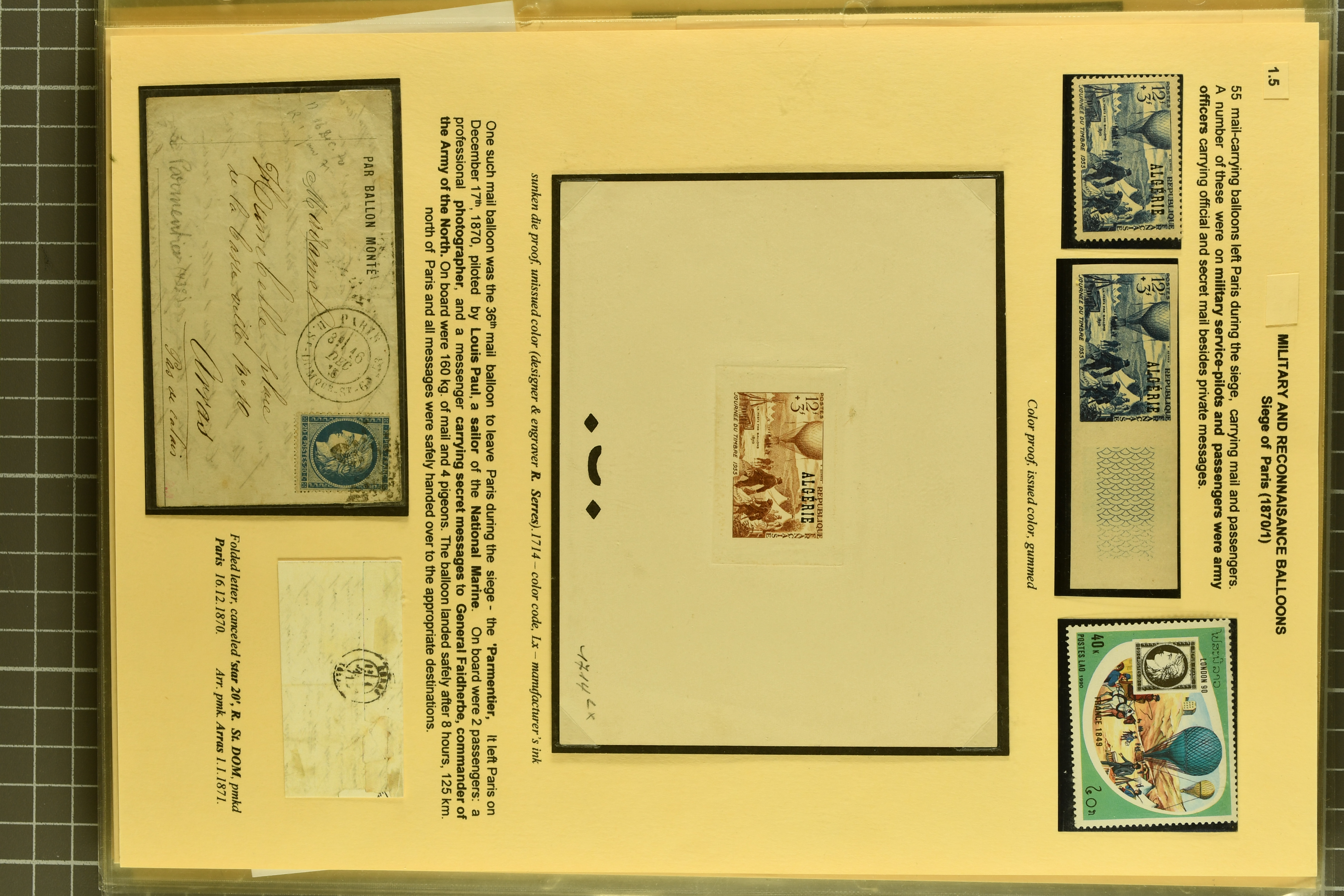 1489 **/*/cover/(*) image1871-1990: Specialist study of early Balloon voyages, set-out on twelve exhibition pages and loose pages, comprising an 1871 Ballon Monte cover flown on the 'Parmentier' and an 1888 August Toulet balloon flight from Brussels addressed to Berlin with early special event balloon cachet; also 4 essays (including pencil sketch portrait of Léon Gambetta with accompanying 1946 Paris-Montartre souvenir card franked with Gambetta 55 c.) of which 3 are original designs on cardboard by Finbar Kenny, 16 proofs (6 sunken) and 32 commemorative/balloon stamps. Condition is in the main fine. Scarce group. Ex. The ‘Izhak Barak’ Collection: The Development of Aviation and Transportation of Mail by Air until 1914 (Image 1) (Image 2) (Image 3) (Image 4) (Image 5) (Image 6) (Image 7) (Image 8) (Image 9) (Image 10) (Image 11) (Image 12) (Image 13) (Image 14) (Image 15) (Image 16) (Image 17) (Image 18)