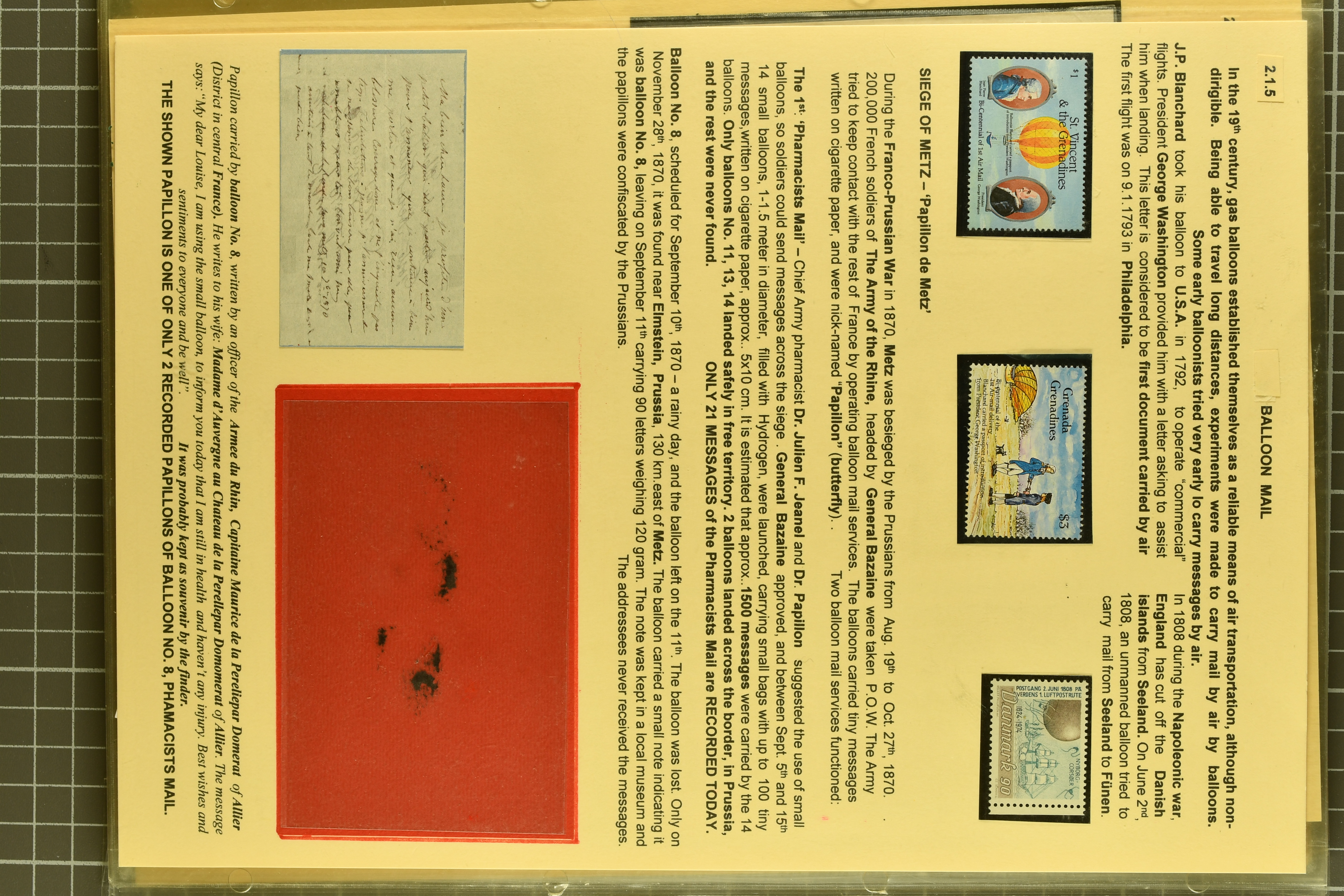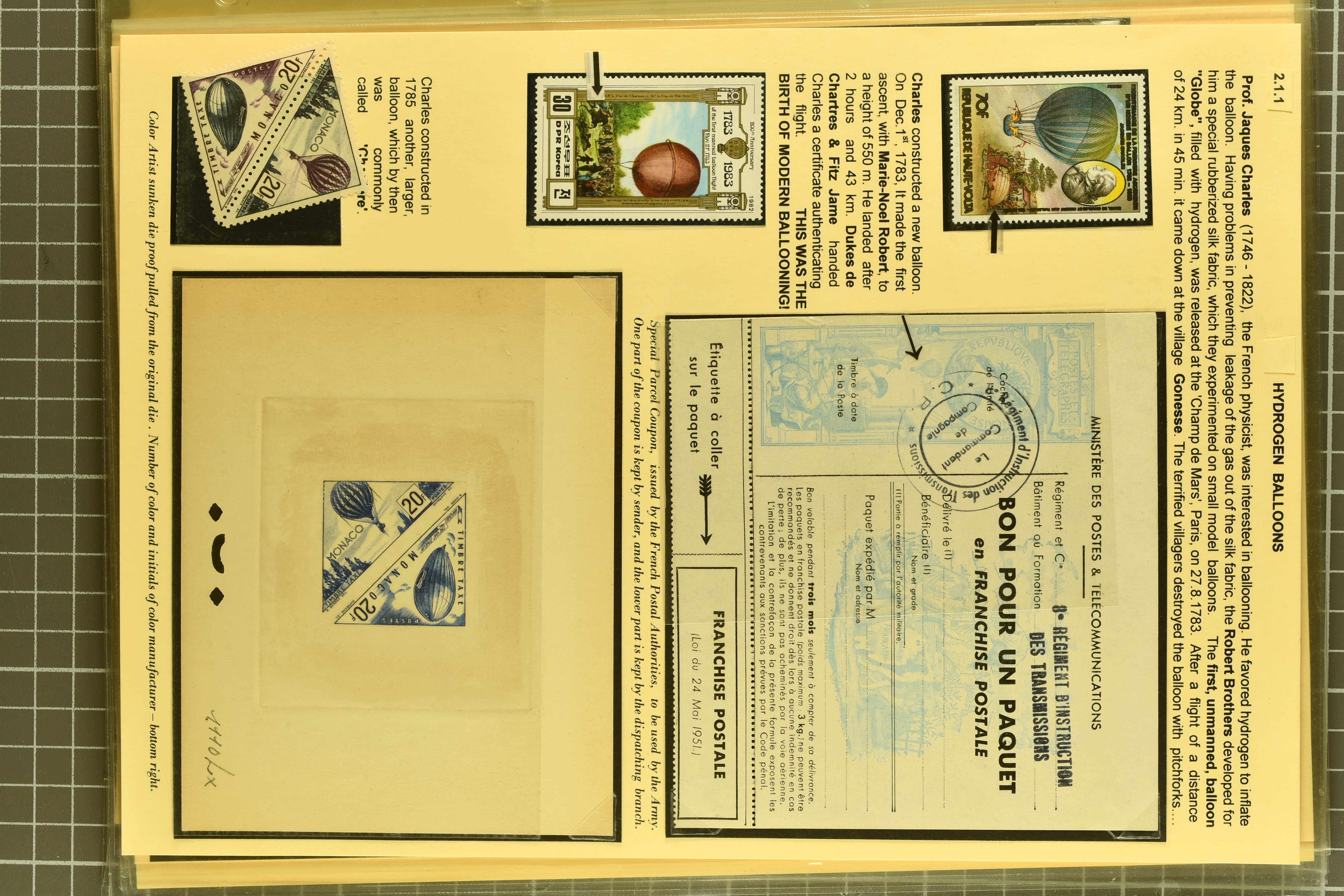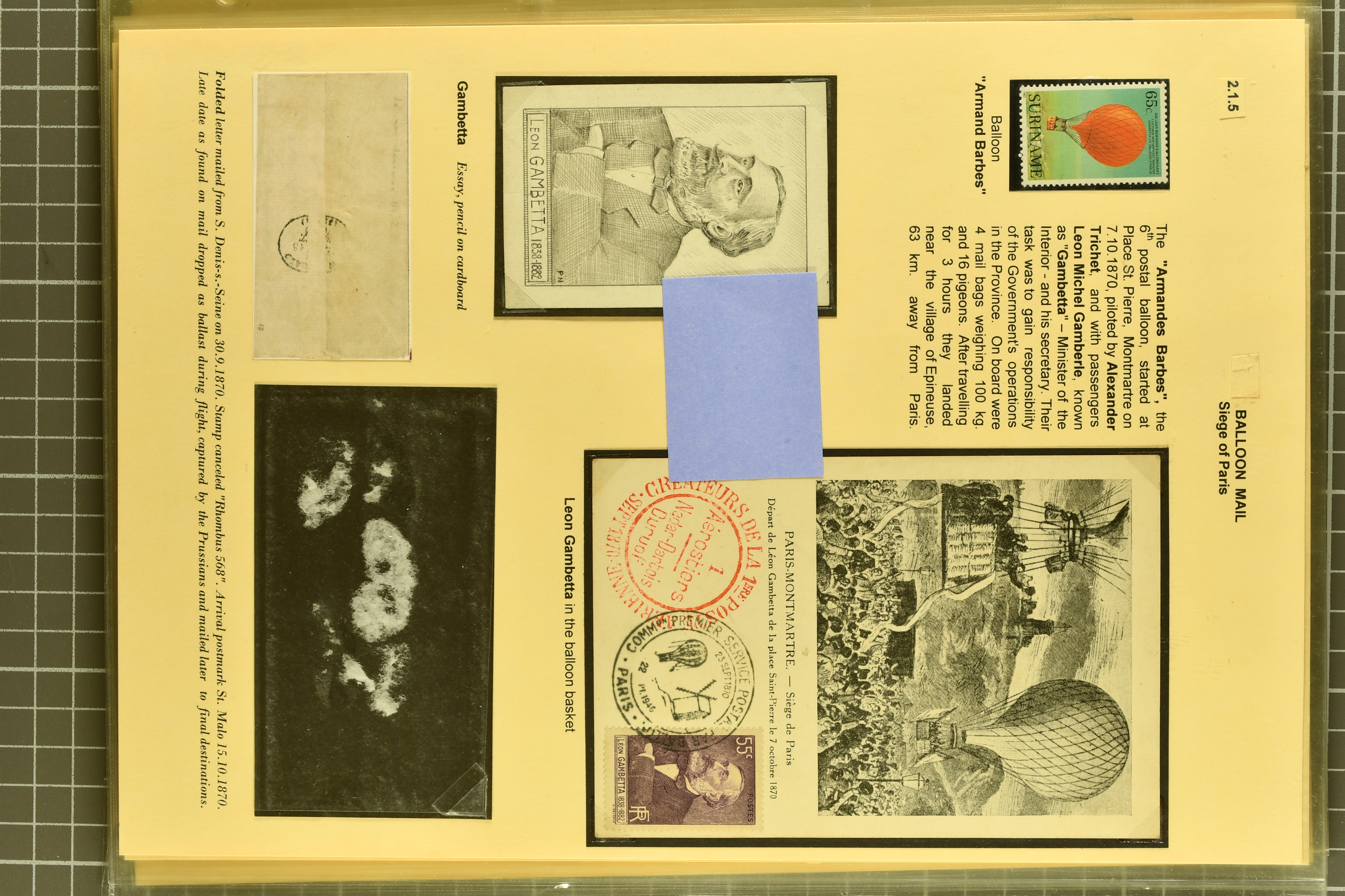 1489 **/*/cover/(*) image1871-1990: Specialist study of early Balloon voyages, set-out on twelve exhibition pages and loose pages, comprising an 1871 Ballon Monte cover flown on the 'Parmentier' and an 1888 August Toulet balloon flight from Brussels addressed to Berlin with early special event balloon cachet; also 4 essays (including pencil sketch portrait of Léon Gambetta with accompanying 1946 Paris-Montartre souvenir card franked with Gambetta 55 c.) of which 3 are original designs on cardboard by Finbar Kenny, 16 proofs (6 sunken) and 32 commemorative/balloon stamps. Condition is in the main fine. Scarce group. Ex. The ‘Izhak Barak’ Collection: The Development of Aviation and Transportation of Mail by Air until 1914 (Image 1) (Image 2) (Image 3) (Image 4) (Image 5) (Image 6) (Image 7) (Image 8) (Image 9) (Image 10) (Image 11) (Image 12) (Image 13) (Image 14) (Image 15) (Image 16) (Image 17) (Image 18)