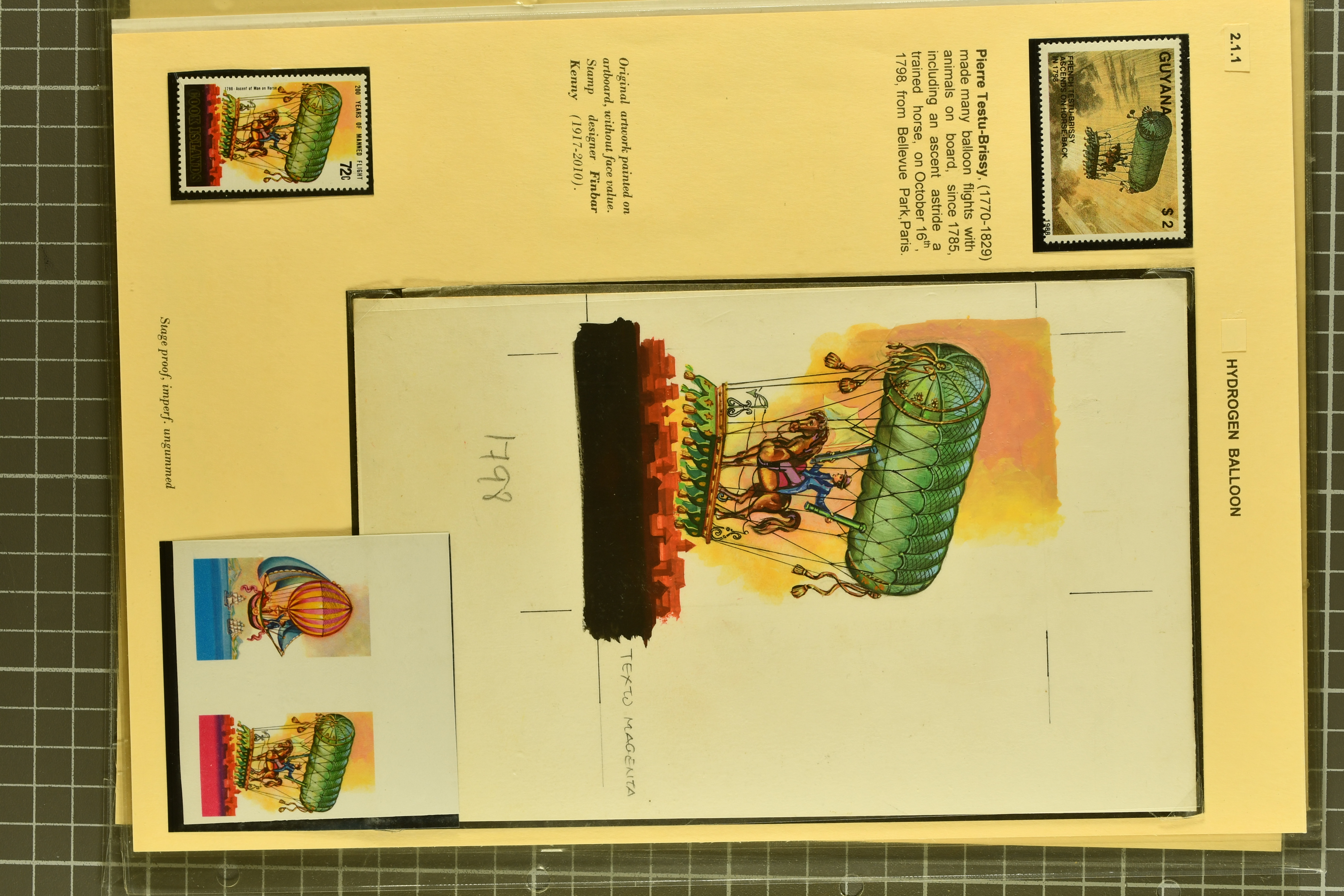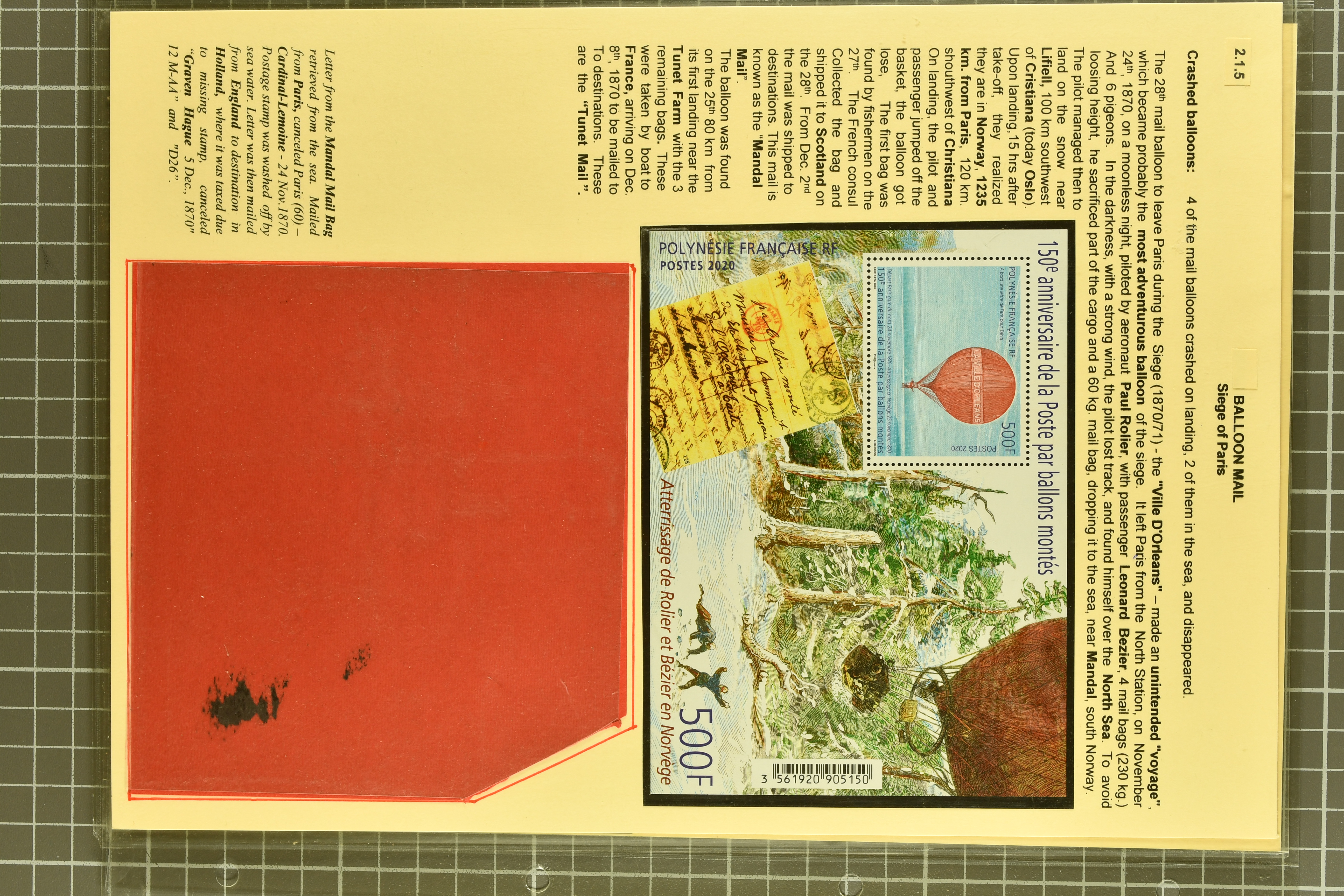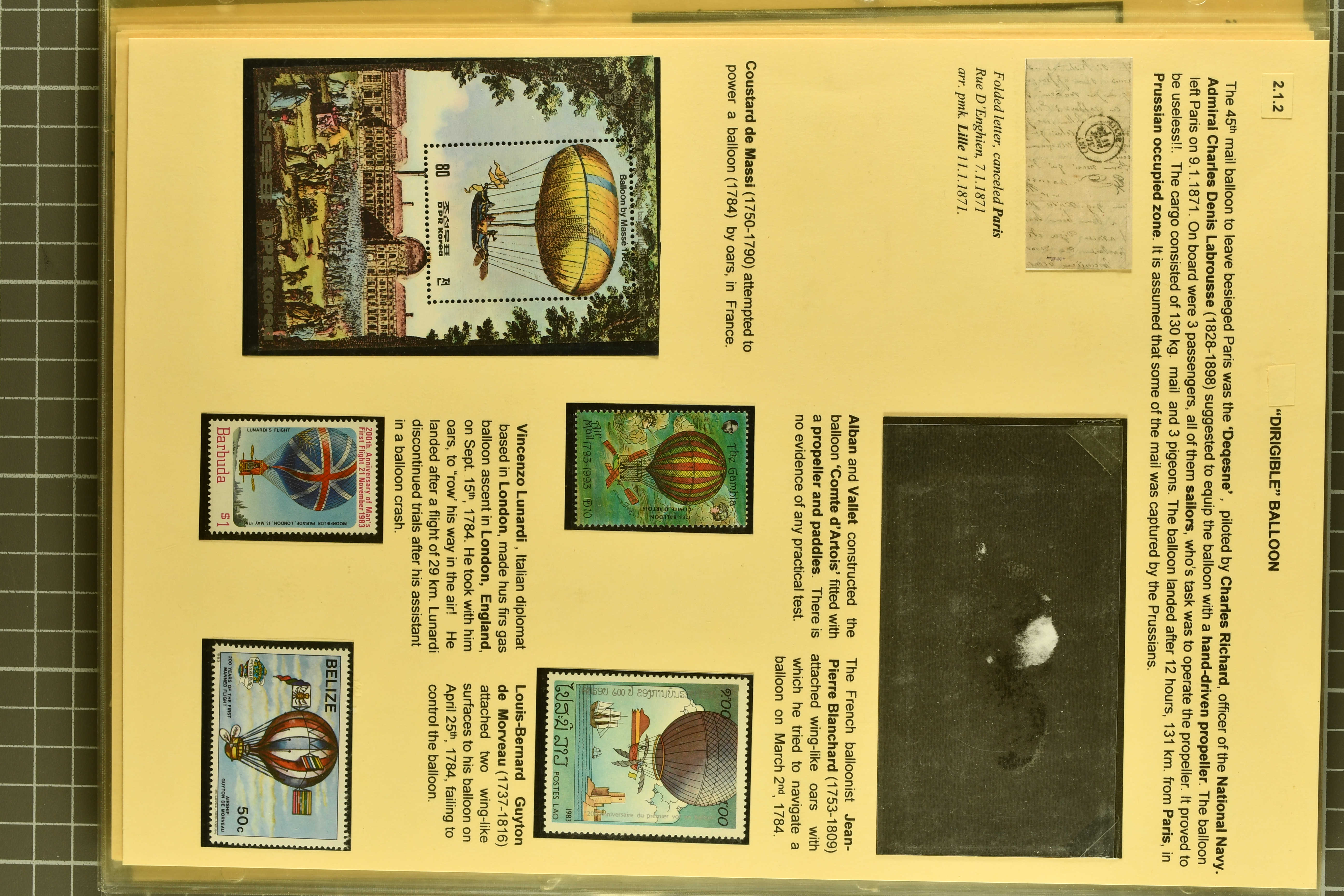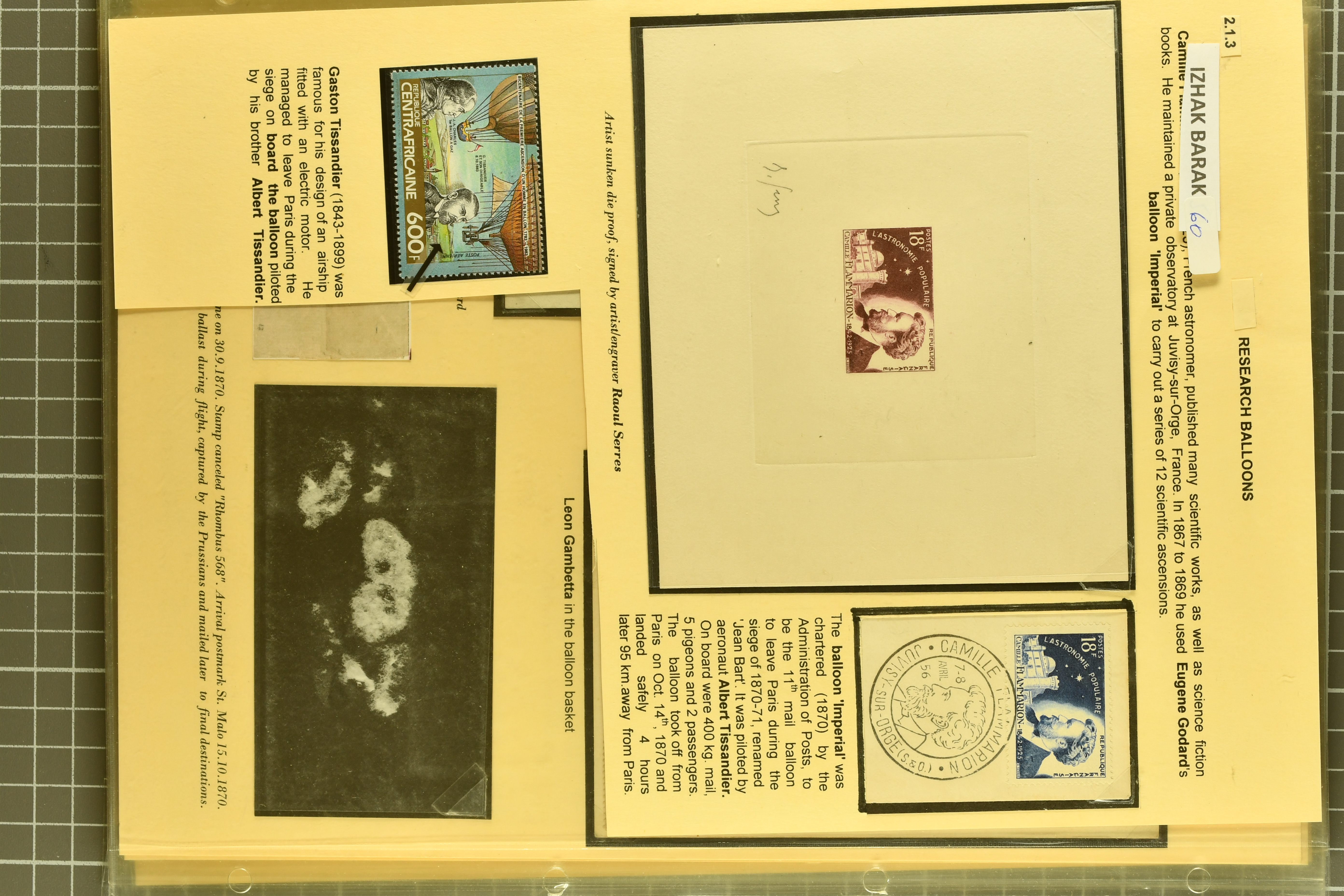 1489 **/*/cover/(*) image1871-1990: Specialist study of early Balloon voyages, set-out on twelve exhibition pages and loose pages, comprising an 1871 Ballon Monte cover flown on the 'Parmentier' and an 1888 August Toulet balloon flight from Brussels addressed to Berlin with early special event balloon cachet; also 4 essays (including pencil sketch portrait of Léon Gambetta with accompanying 1946 Paris-Montartre souvenir card franked with Gambetta 55 c.) of which 3 are original designs on cardboard by Finbar Kenny, 16 proofs (6 sunken) and 32 commemorative/balloon stamps. Condition is in the main fine. Scarce group. Ex. The ‘Izhak Barak’ Collection: The Development of Aviation and Transportation of Mail by Air until 1914 (Image 1) (Image 2) (Image 3) (Image 4) (Image 5) (Image 6) (Image 7) (Image 8) (Image 9) (Image 10) (Image 11) (Image 12) (Image 13) (Image 14) (Image 15) (Image 16) (Image 17) (Image 18)