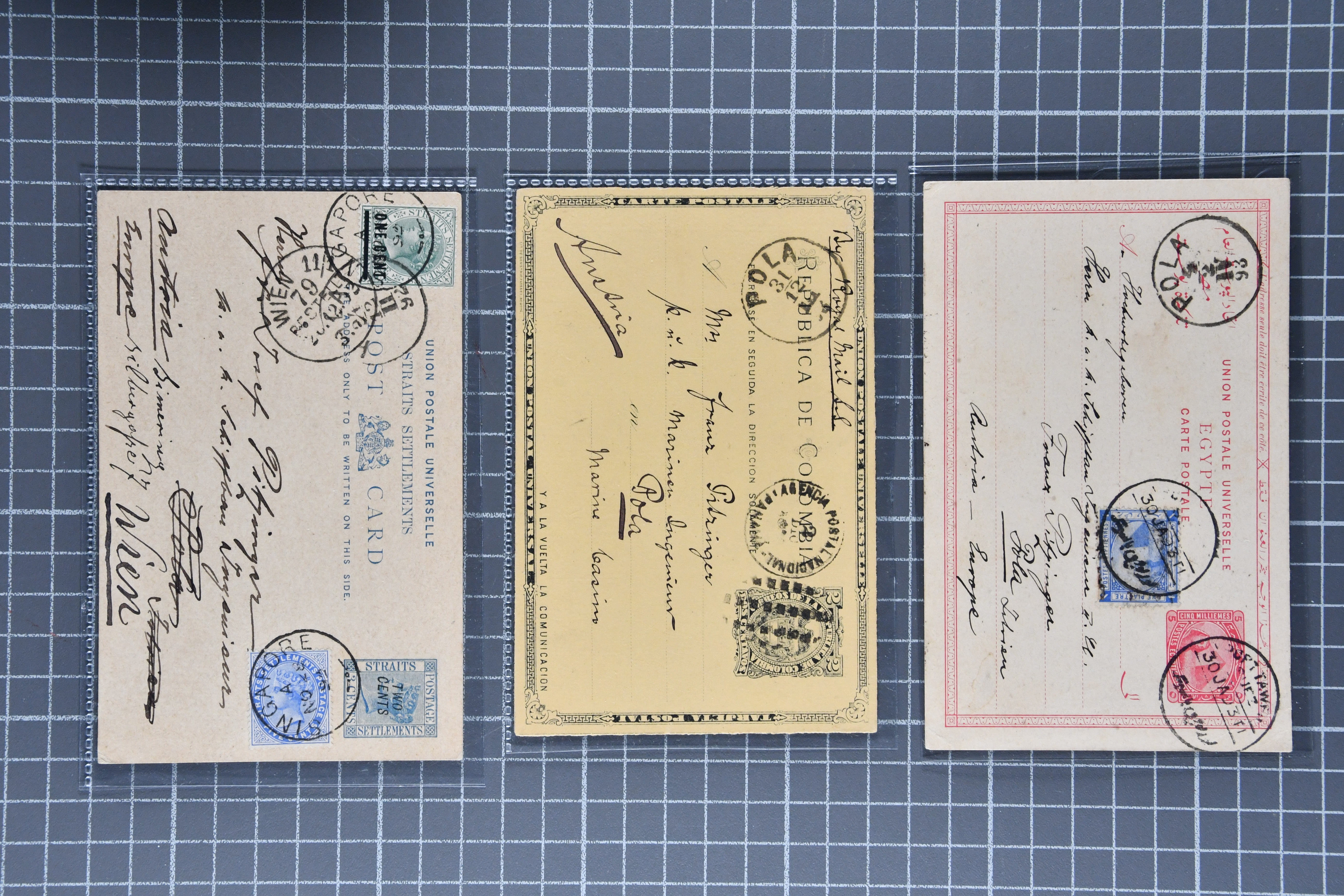 1495 cover image1896/1900: Group of three postal stationery cards sent to Pola, Austria-Hungary, comprising examples from; Straits Settlements, Costa Rica and Egypt. Three UPU postal cards, all to Franz Pibringer, k.u.k. Marine Ingenieur, Pola. Including, 1896 Straits Settlements 1 c. card uprated with 2 c. + 4 c., Singapore, redirected from Vienna to Pola. 1900 Costa Rica 5 c. brown card, San José to Pola. 1896 Egypt 5 m. red card uprated 5 m. blue, Port Said to Pola. Scarce trio of exotic origins to the Austro-Hungarian naval base at Pola (Image 1) (Image 2)
