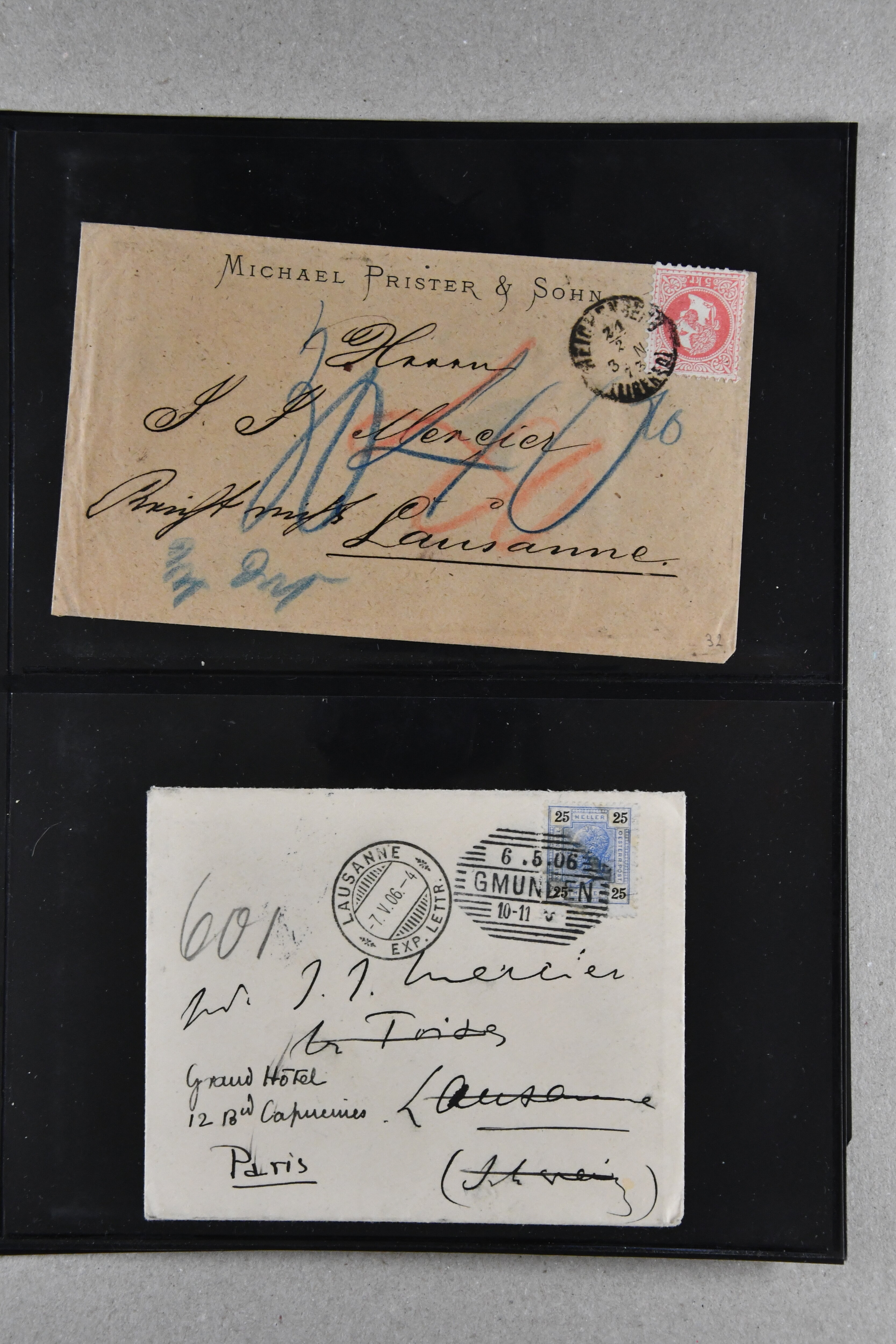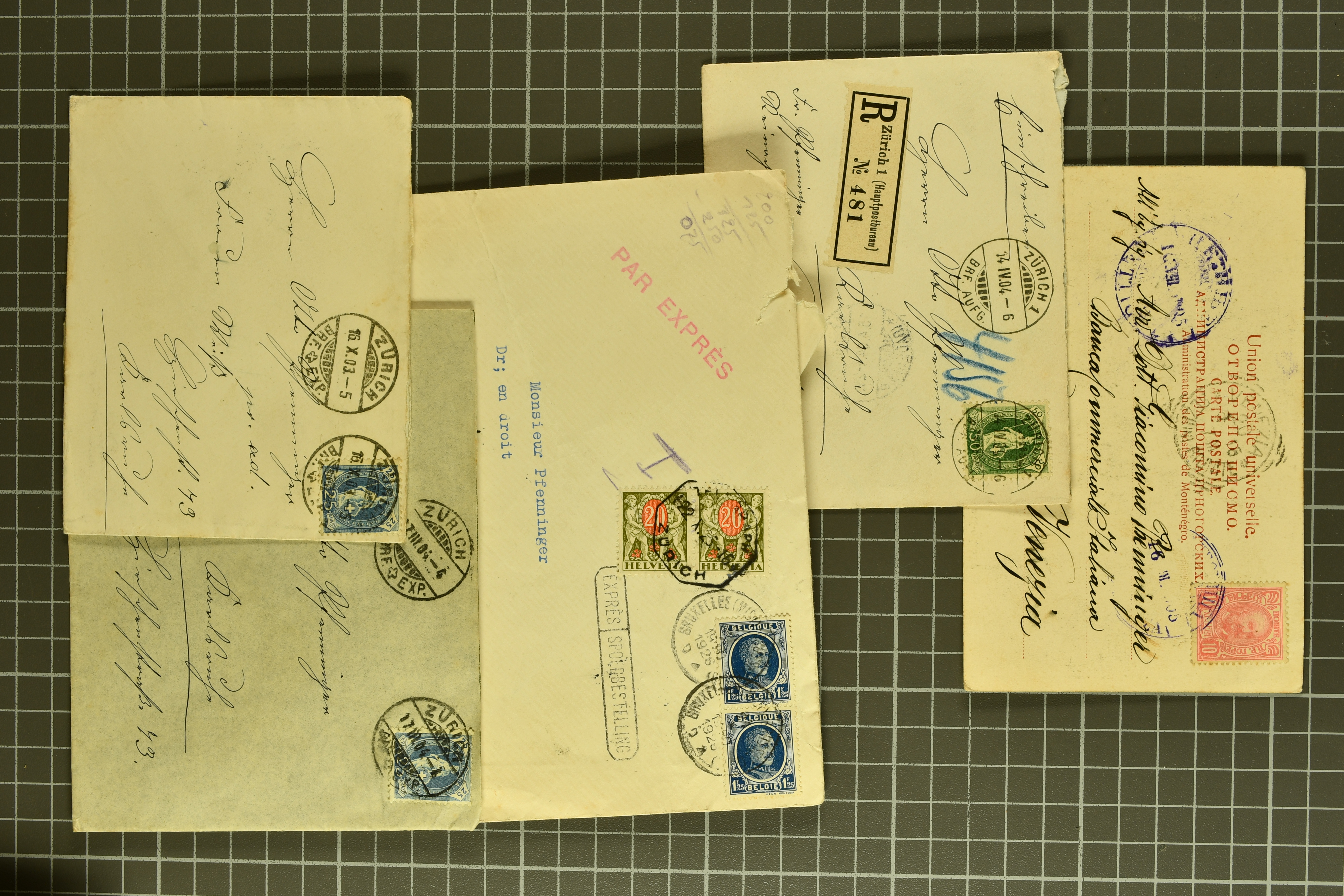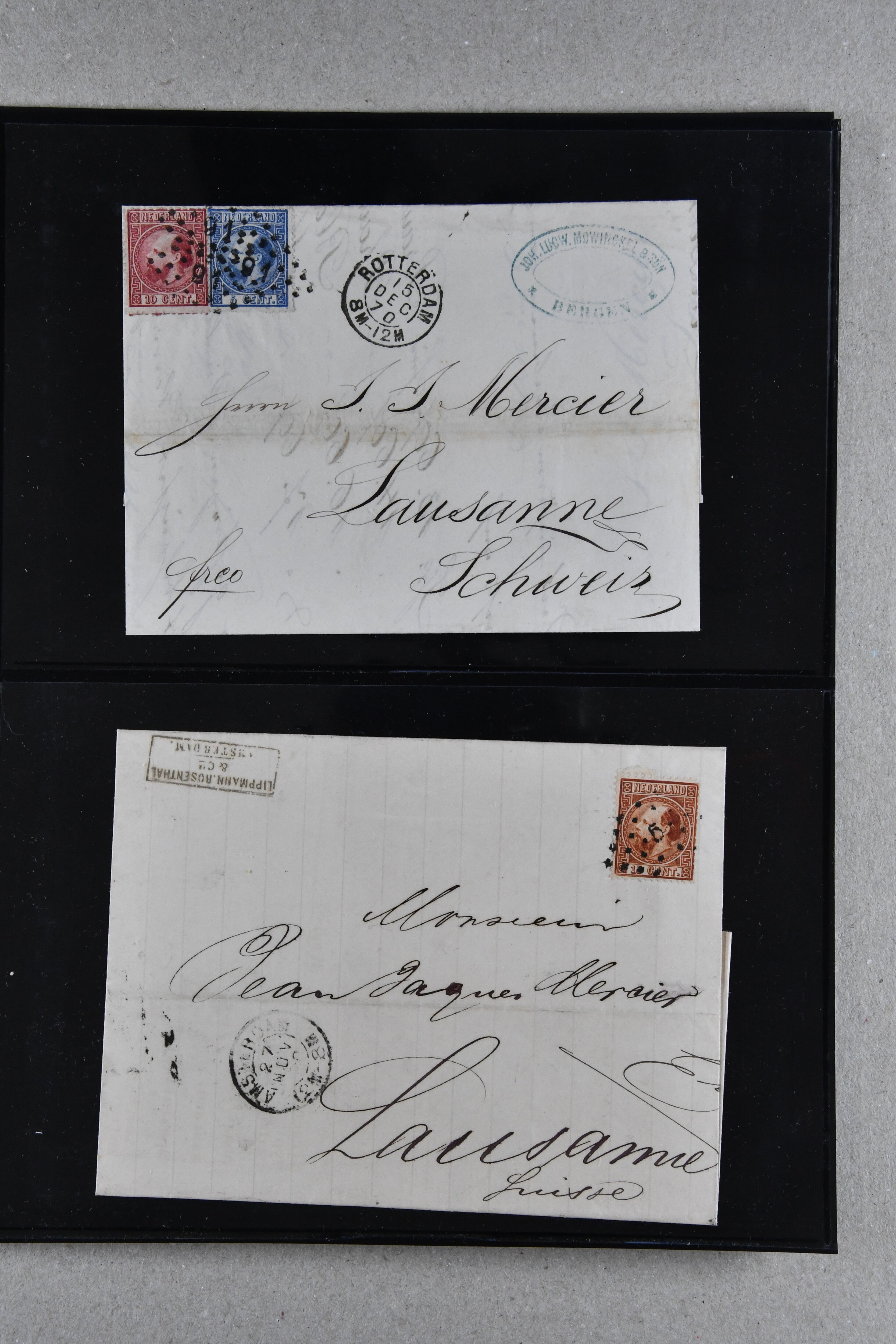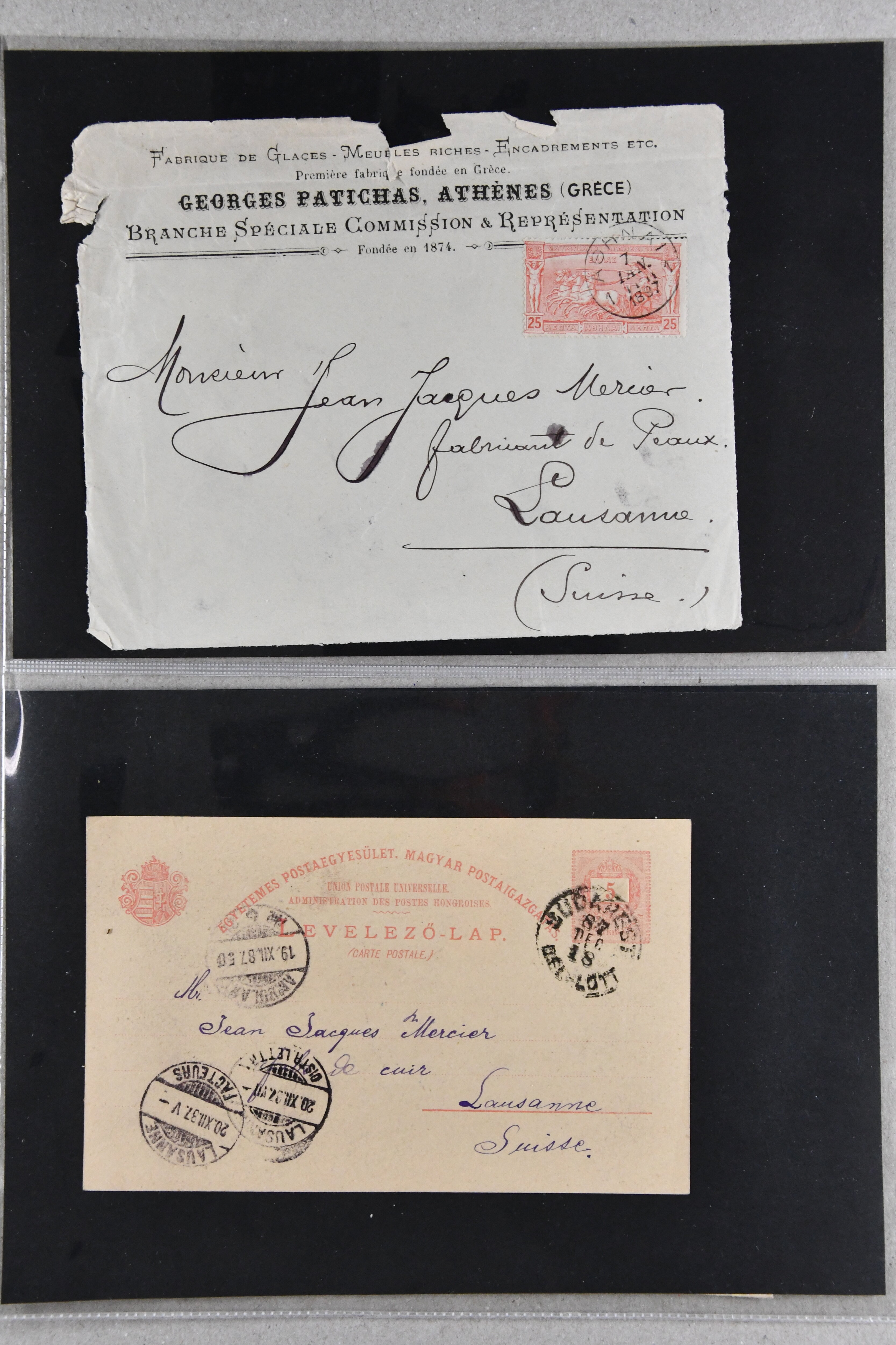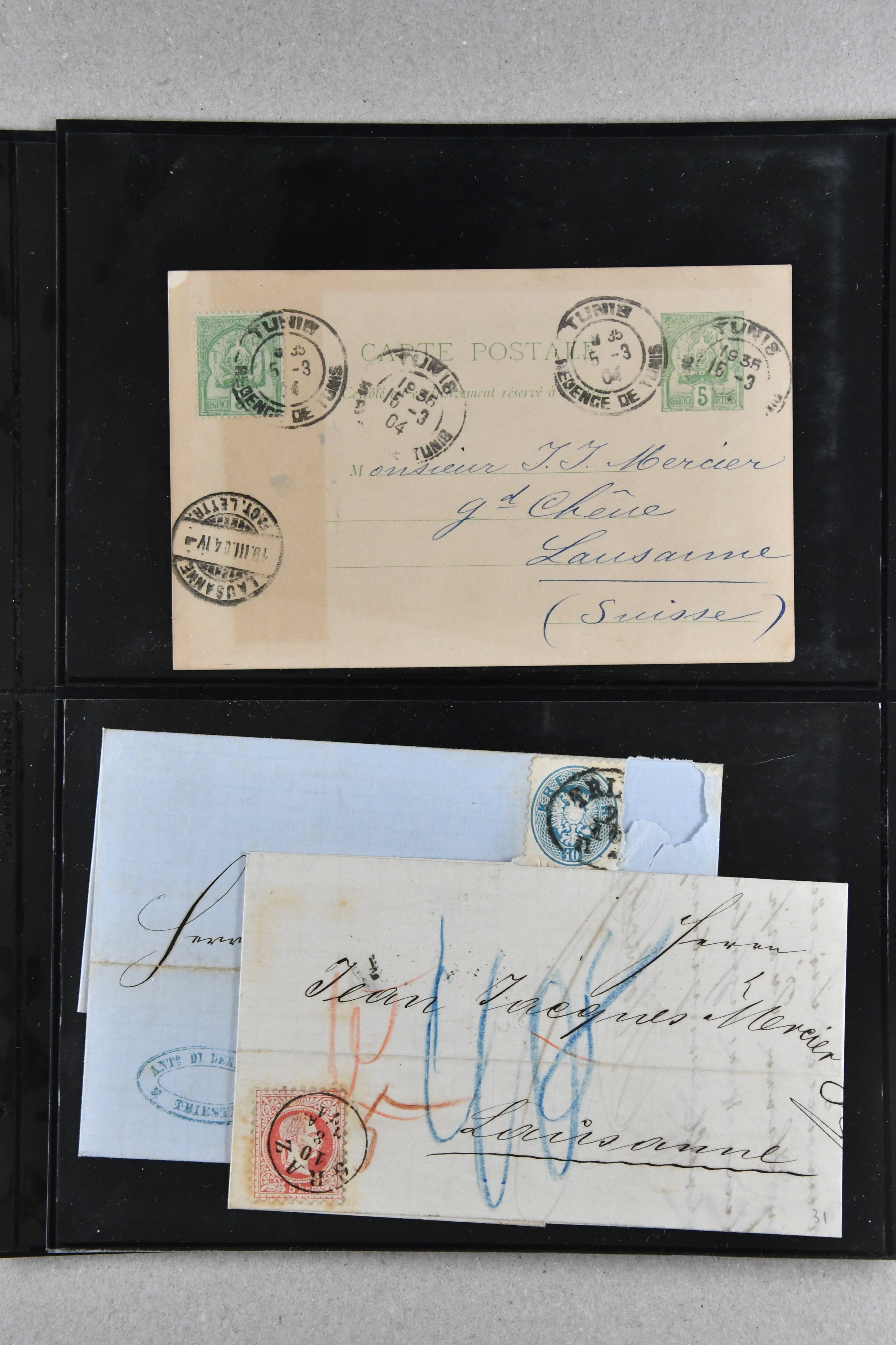 1497 cover image1860/1909c.: Lot 25 covers, all directed to Lausanne, Switzerland incl. nine from the USA, seven stationeries among them, also 1860 cover from New York bearing 5 c. brown & 10 c. green tied by clear grill obliterator in red, sent with Prussian Closed Mail, struck by "Fr: Grenze" handstamp, reverse with German and Swiss transit datestamps of Hamburg and Basel, German TPO's and Lausanne arrival, further material from Tunis, Austria, Monaco, Belgium, the Netherlands, an Bulgarian part parcel card, Egypt, and Greece. Also some used stamps from Belgium, glued on paper, the Netherlands and Fiji, these hinged (Image 1) (Image 2) (Image 3) (Image 4) (Image 5) (Image 6) (Image 7) (Image 8) (Image 9) (Image 10) (Image 11) (Image 12) (Image 13) (Image 14) (Image 15) (Image 16) (Image 17) (Image 18)