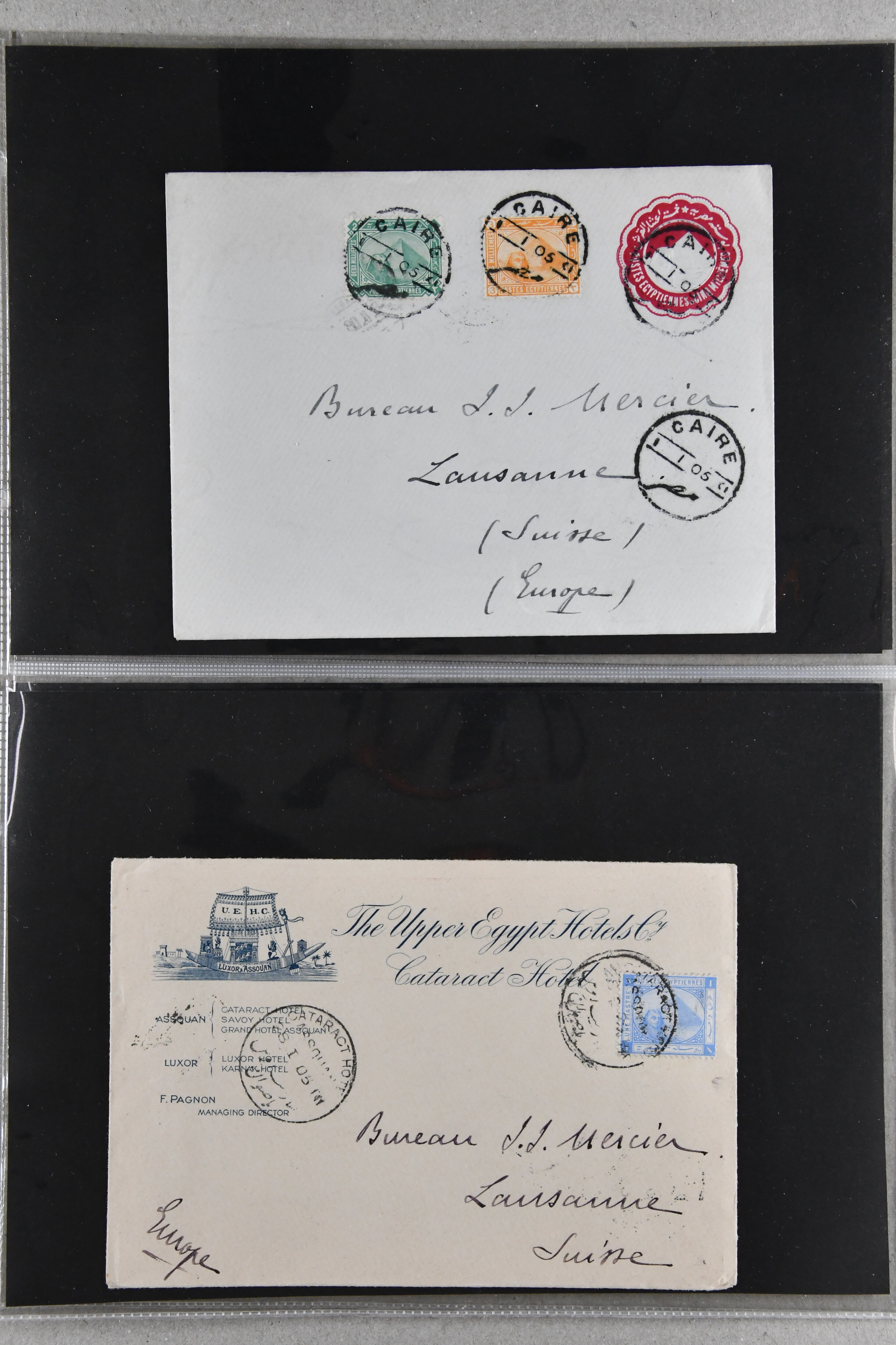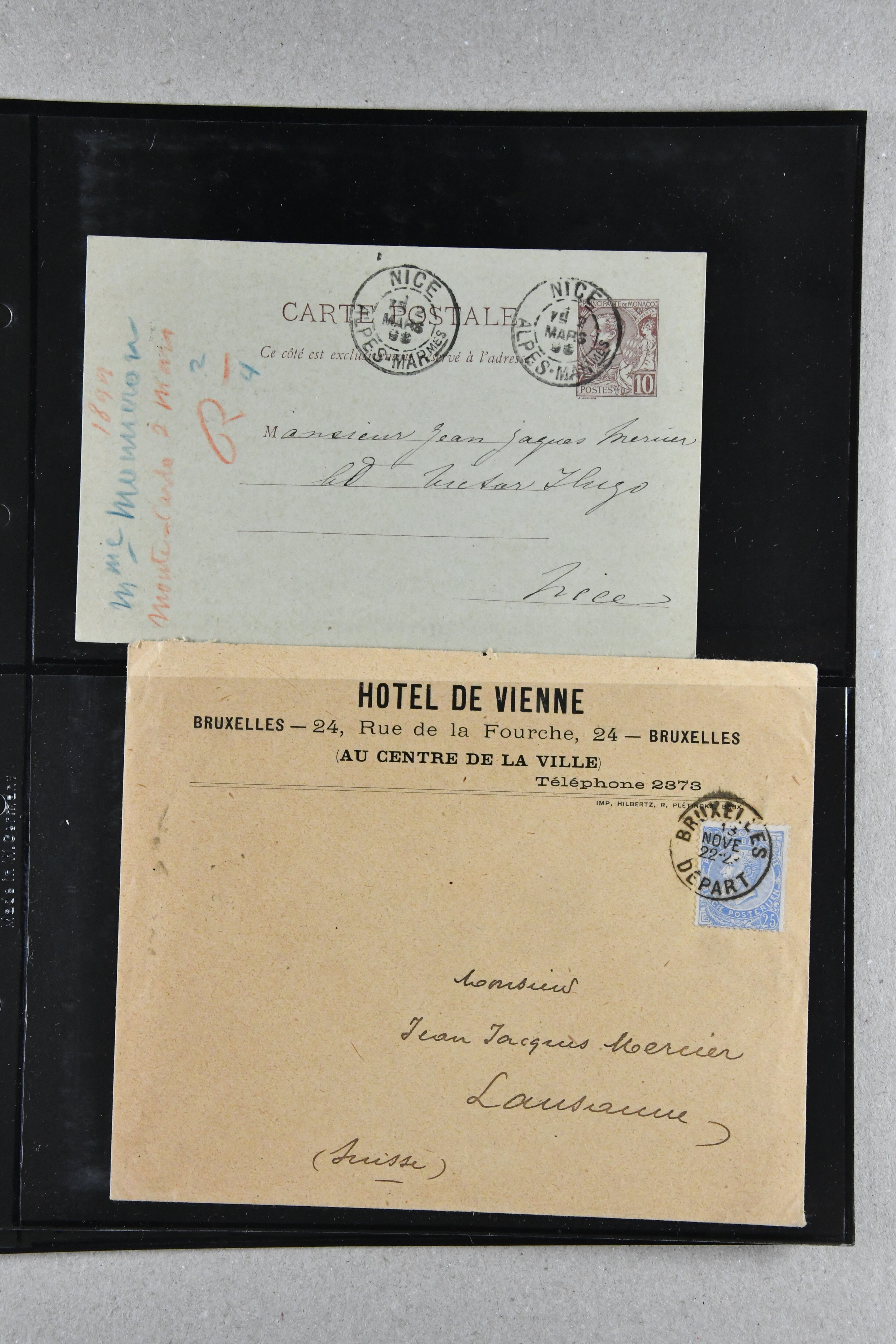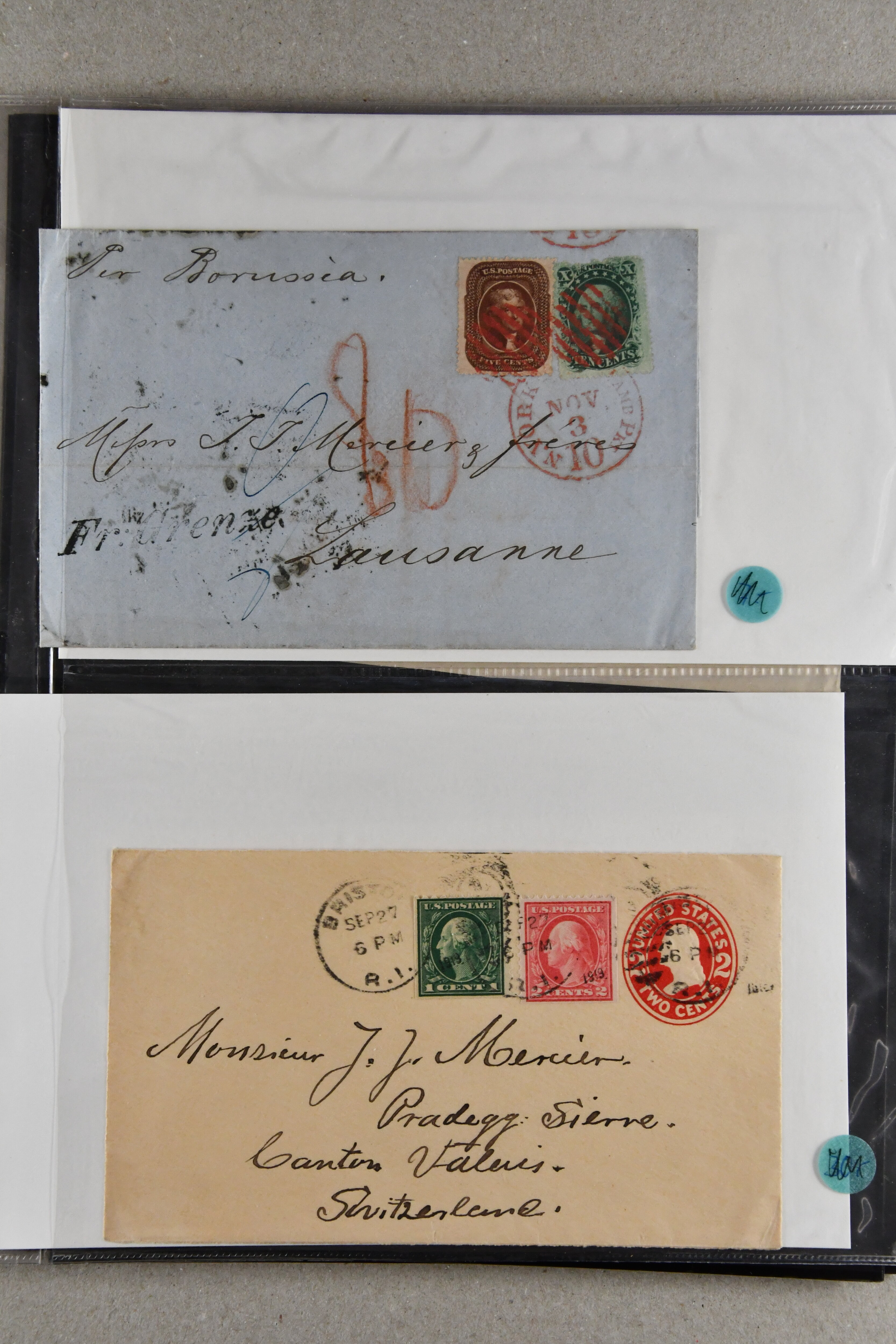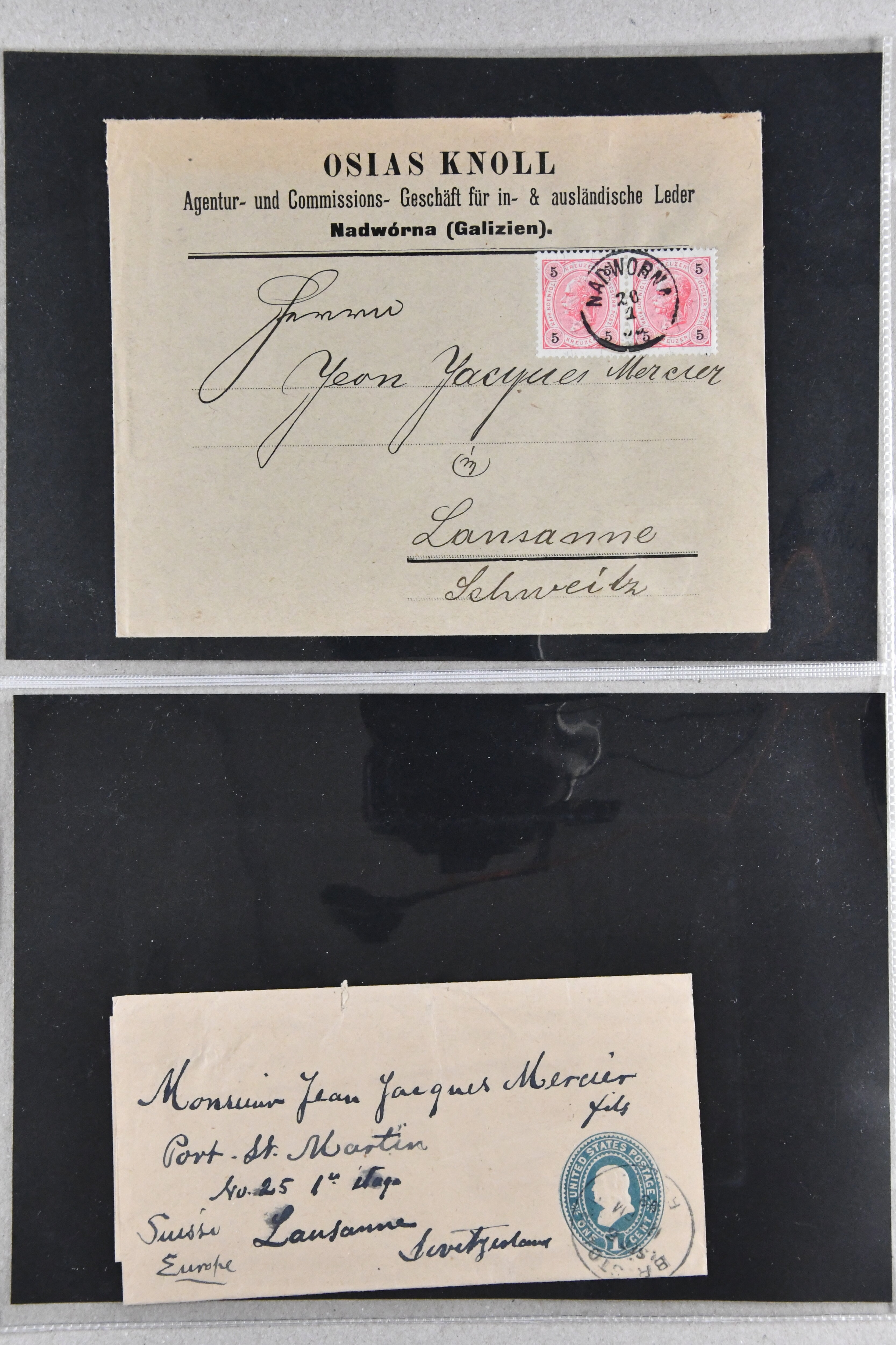 1497 cover image1860/1909c.: Lot 25 covers, all directed to Lausanne, Switzerland incl. nine from the USA, seven stationeries among them, also 1860 cover from New York bearing 5 c. brown & 10 c. green tied by clear grill obliterator in red, sent with Prussian Closed Mail, struck by "Fr: Grenze" handstamp, reverse with German and Swiss transit datestamps of Hamburg and Basel, German TPO's and Lausanne arrival, further material from Tunis, Austria, Monaco, Belgium, the Netherlands, an Bulgarian part parcel card, Egypt, and Greece. Also some used stamps from Belgium, glued on paper, the Netherlands and Fiji, these hinged (Image 1) (Image 2) (Image 3) (Image 4) (Image 5) (Image 6) (Image 7) (Image 8) (Image 9) (Image 10) (Image 11) (Image 12) (Image 13) (Image 14) (Image 15) (Image 16) (Image 17) (Image 18)