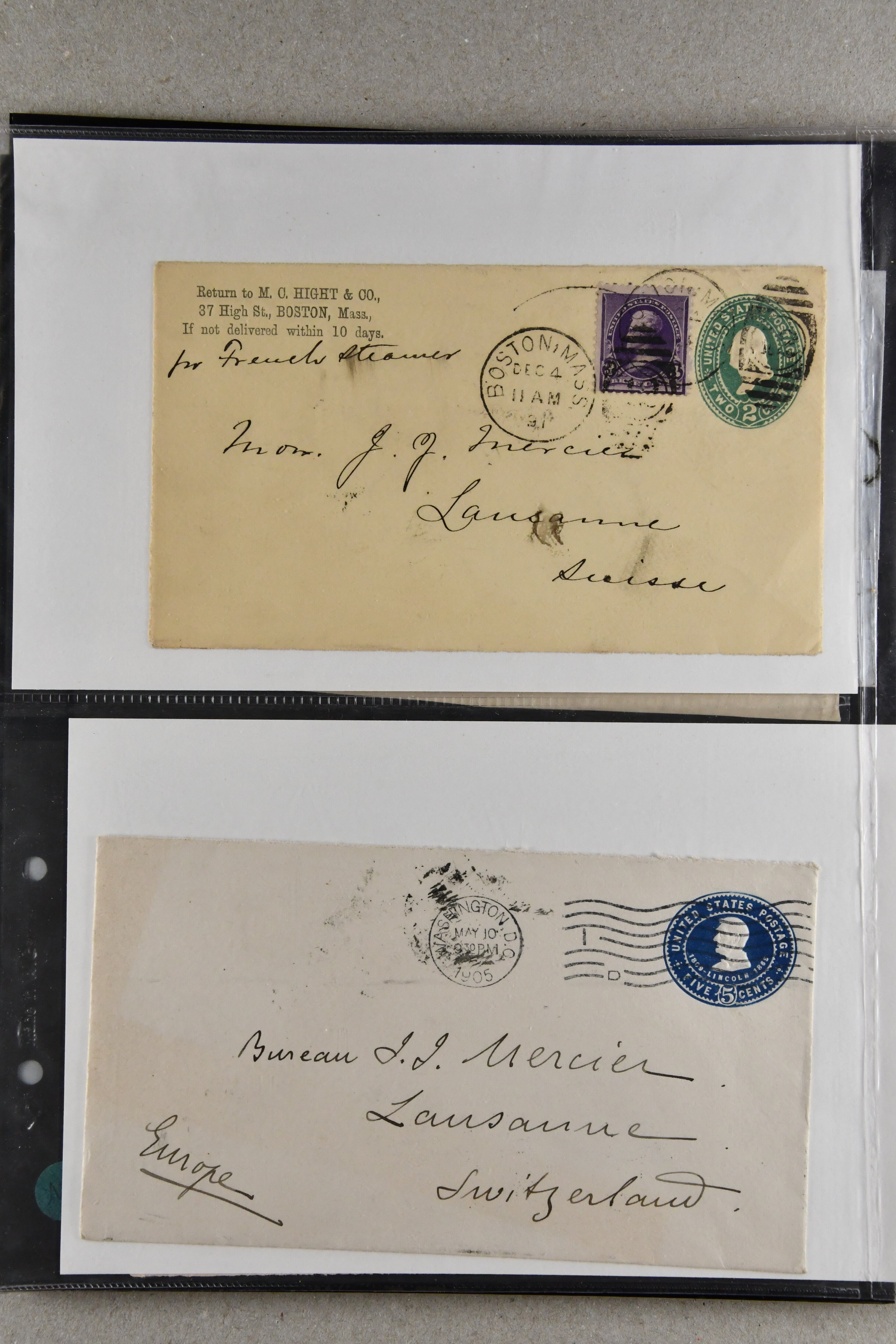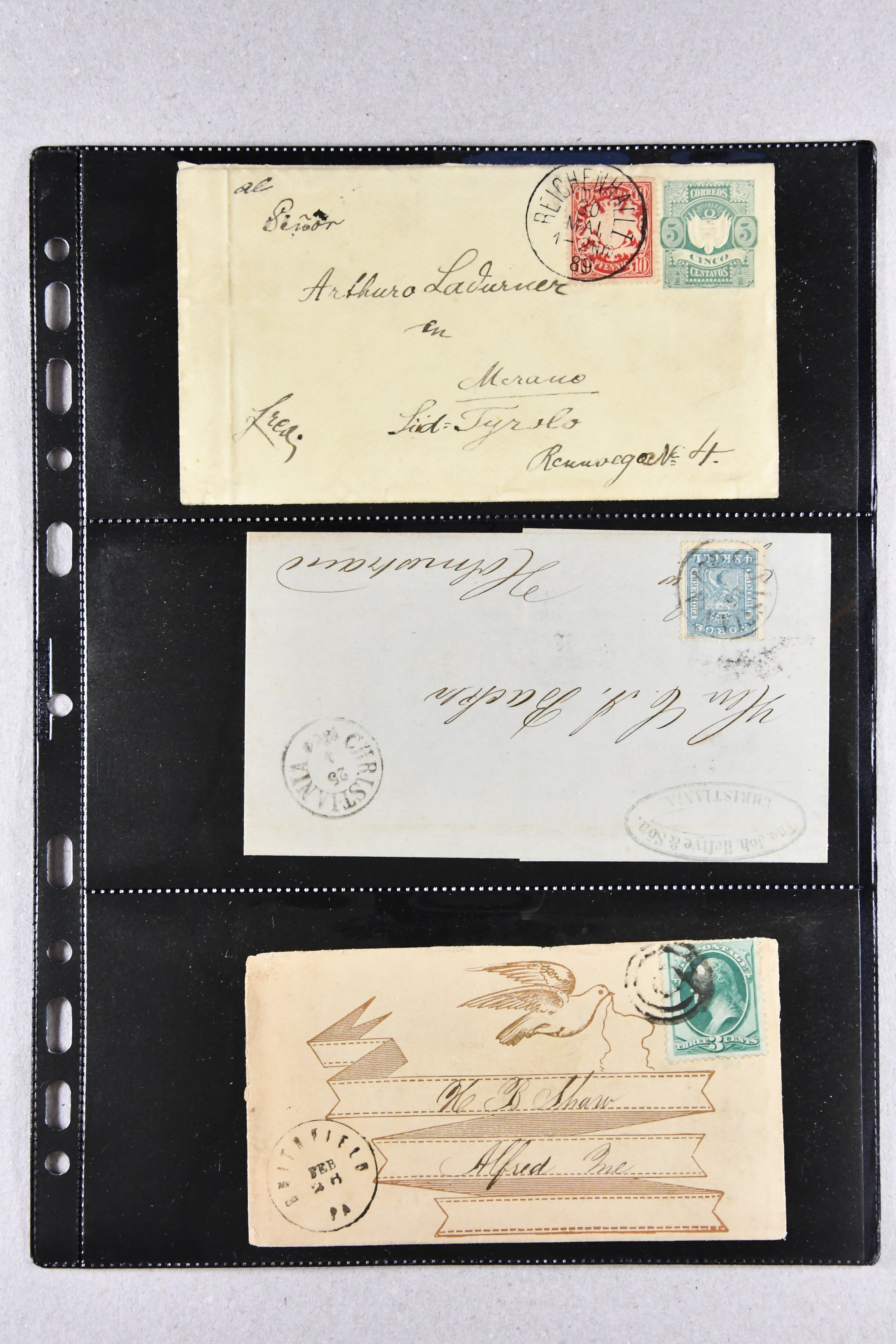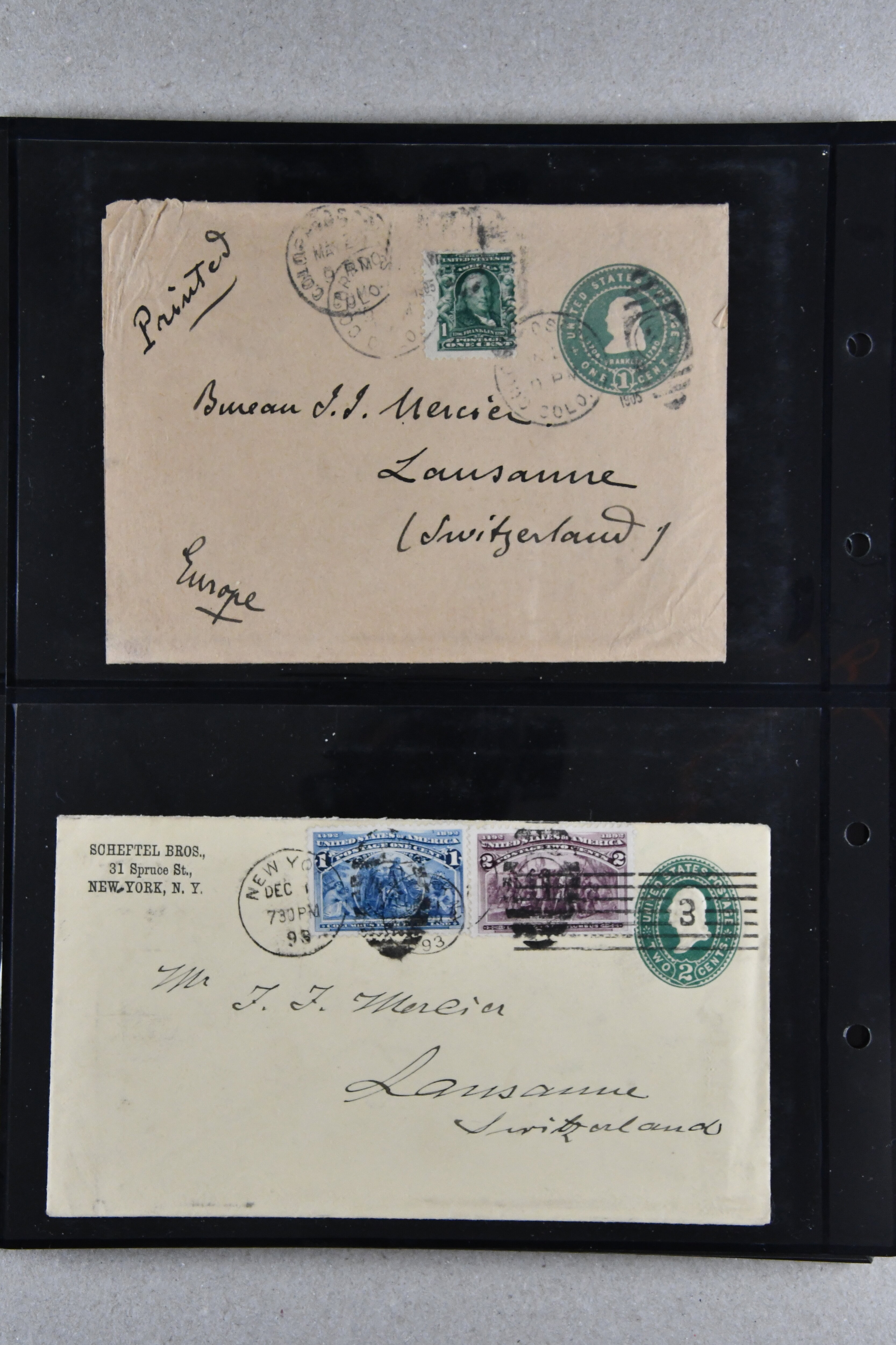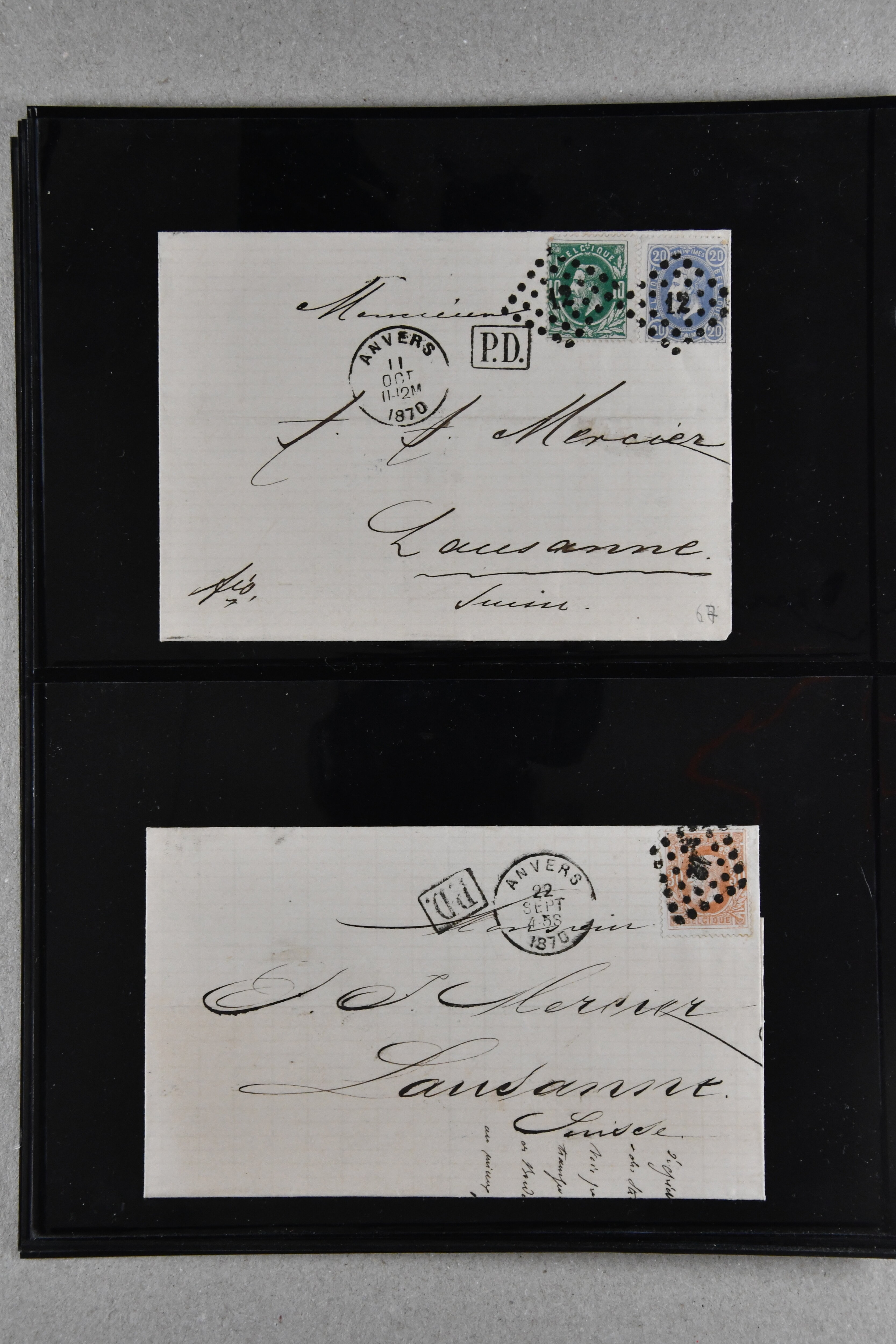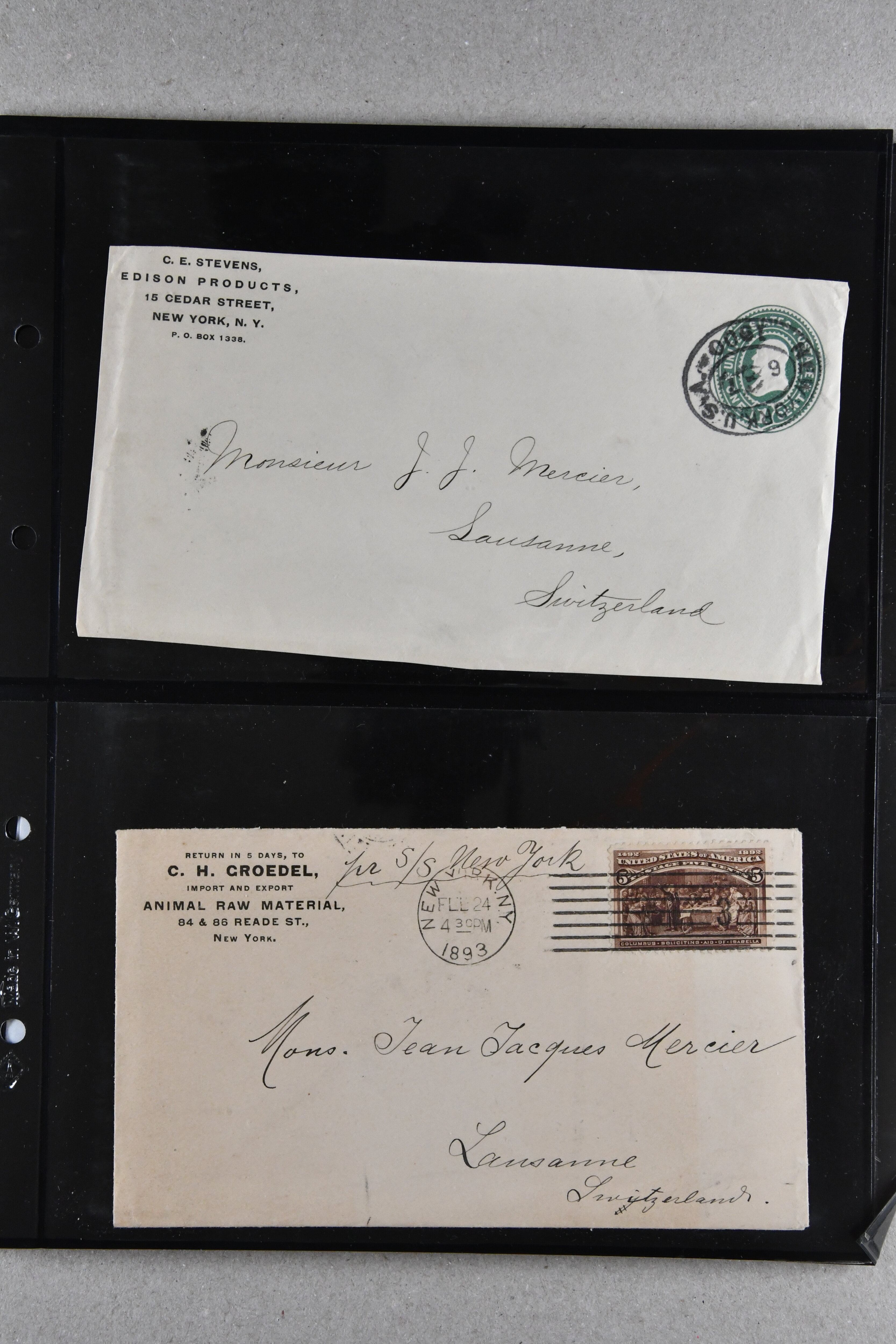 1497 cover image1860/1909c.: Lot 25 covers, all directed to Lausanne, Switzerland incl. nine from the USA, seven stationeries among them, also 1860 cover from New York bearing 5 c. brown & 10 c. green tied by clear grill obliterator in red, sent with Prussian Closed Mail, struck by "Fr: Grenze" handstamp, reverse with German and Swiss transit datestamps of Hamburg and Basel, German TPO's and Lausanne arrival, further material from Tunis, Austria, Monaco, Belgium, the Netherlands, an Bulgarian part parcel card, Egypt, and Greece. Also some used stamps from Belgium, glued on paper, the Netherlands and Fiji, these hinged (Image 1) (Image 2) (Image 3) (Image 4) (Image 5) (Image 6) (Image 7) (Image 8) (Image 9) (Image 10) (Image 11) (Image 12) (Image 13) (Image 14) (Image 15) (Image 16) (Image 17) (Image 18)