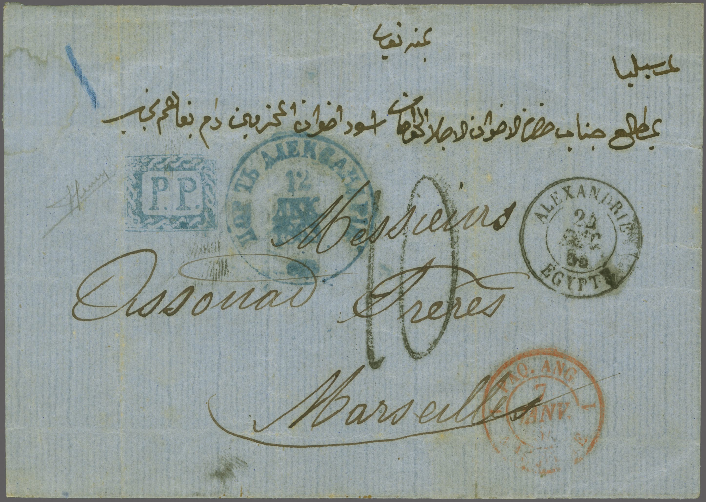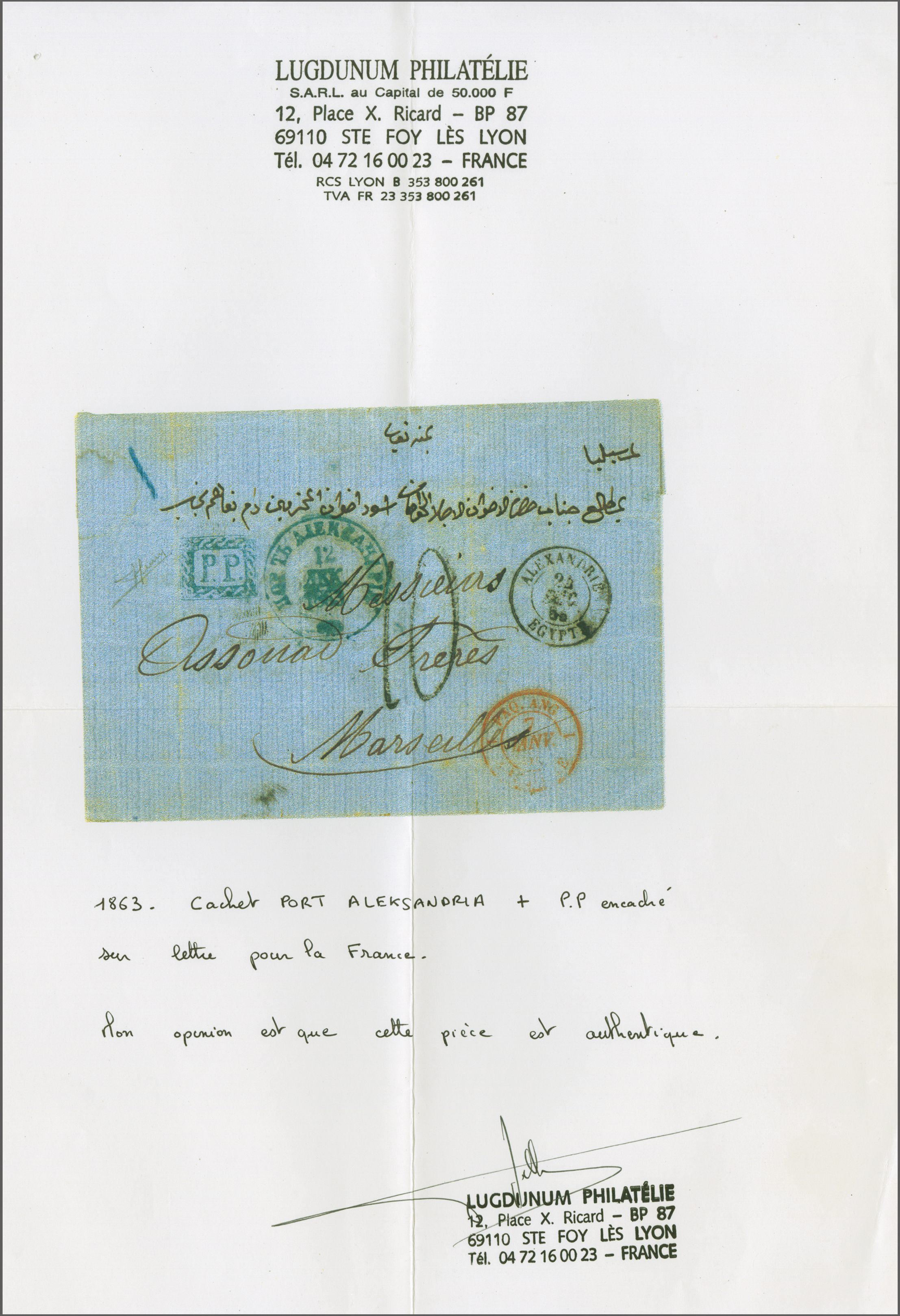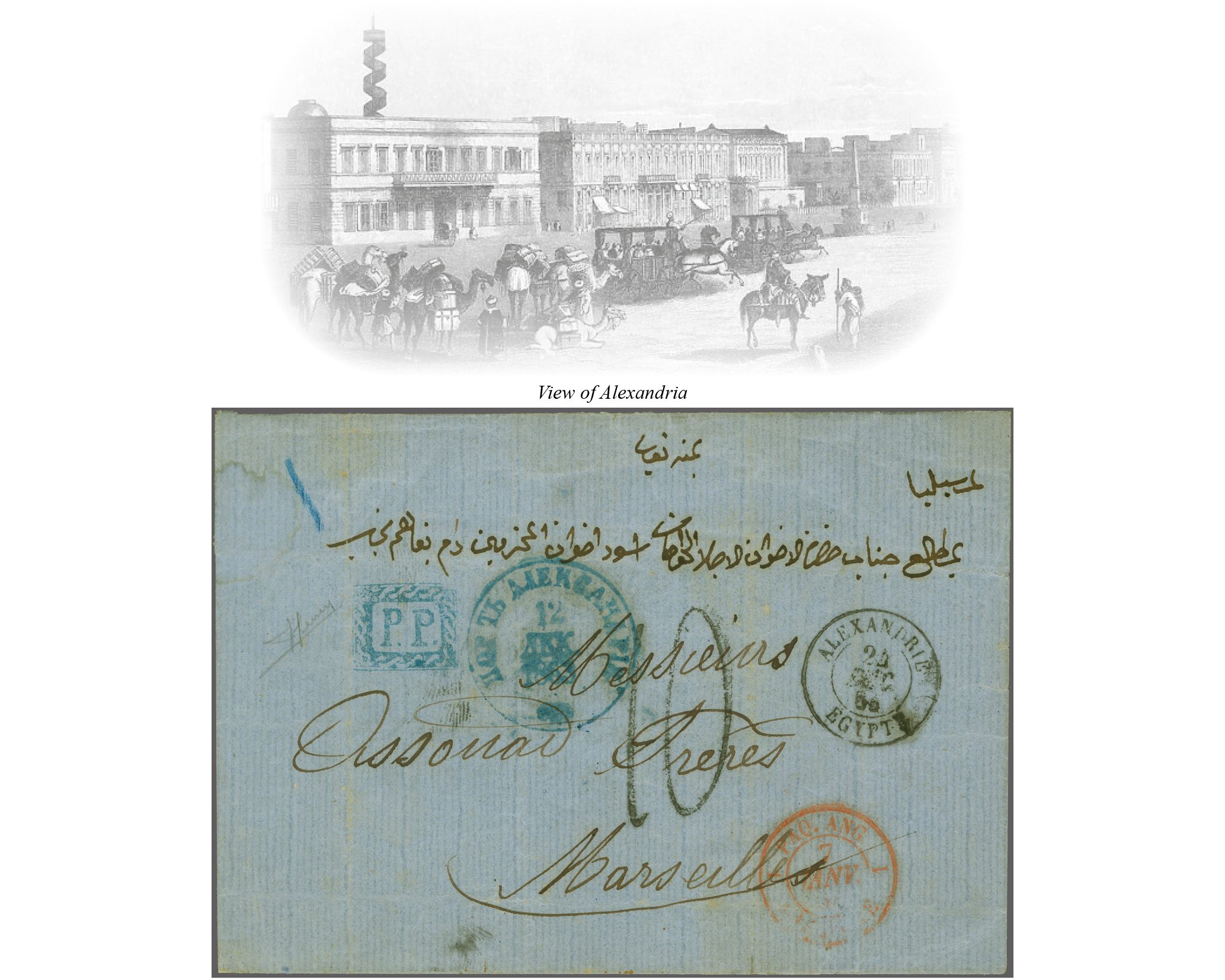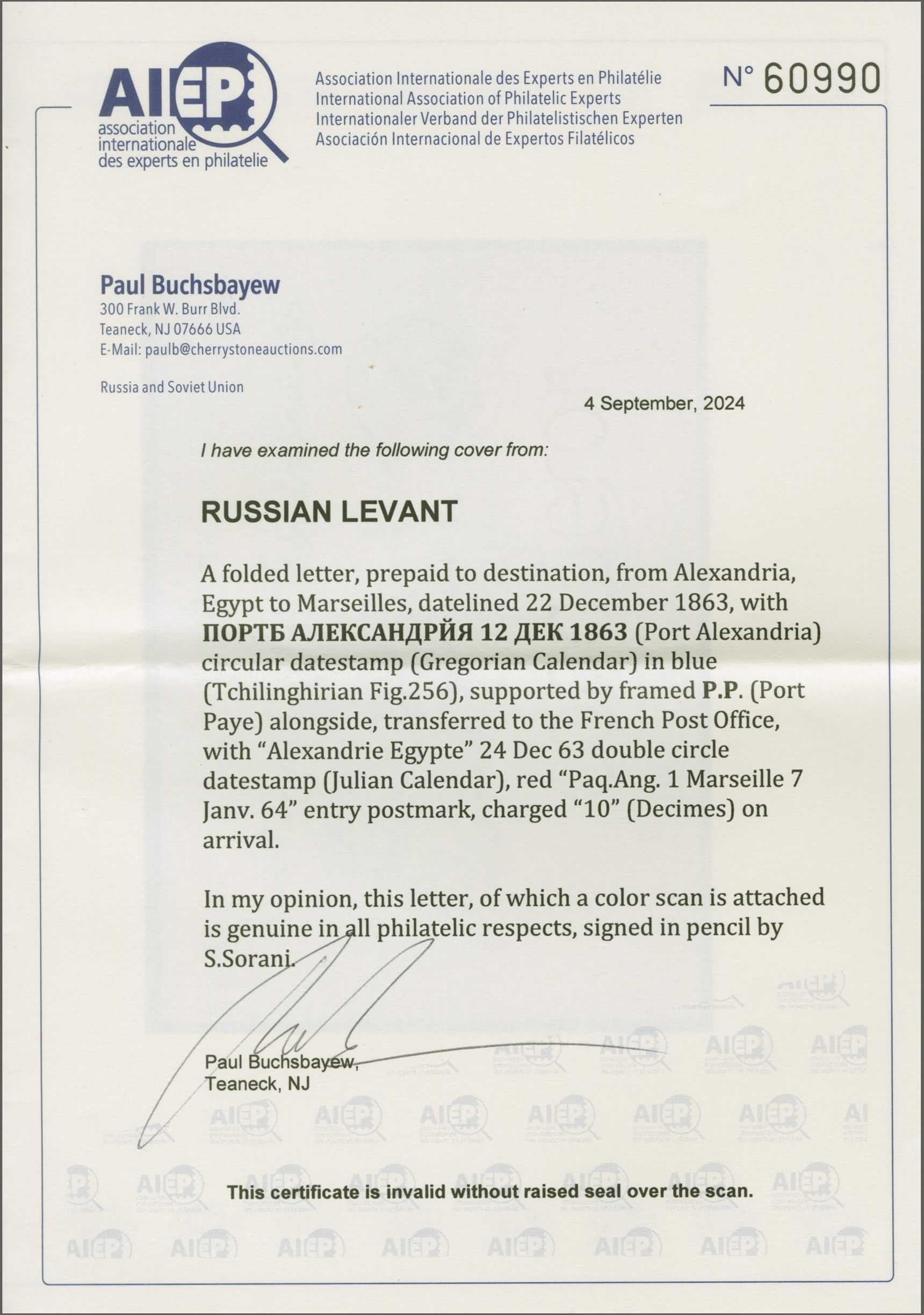 7091 cover imageRussian P.O. in Alexandria 1863 (Dec 12): Entire letter from Aleppo via Alexandria to Marseille, struck in transit by “PORT ALEKSANDRIA” cds in blue (Tchilinghirian fig 256) with ornamental framed „P.P.“ of Alexandretta (Tchilinghirian unrecorded) in blue alongside. The entire was transferred to the French P.O. in Alexandria, there struck by “ALEXANDRIE EGYPTE” cds in black (Dec 24) and reached Marseille with a British vessel, part strike of “PAQ. ANG MARSEILLE” cds in red (Jan 7, 64). The Russian pre-payment was not accepted, and the letter charged with ‘10’ décimes. An exceptional combination cover from Syria using for its journey Russian and British Shipmail services mediated by the French P.O. in Alexandria. Most interesting, fine and attractive, signed Sorani, cert. Buchsbayew (2024). Provenance: Pavlovsk collection, Corinphila sale 92 (March 1996), lot 4923 (Image 1) (Image 2) (Image 3) (Image 4) (Image 5)
