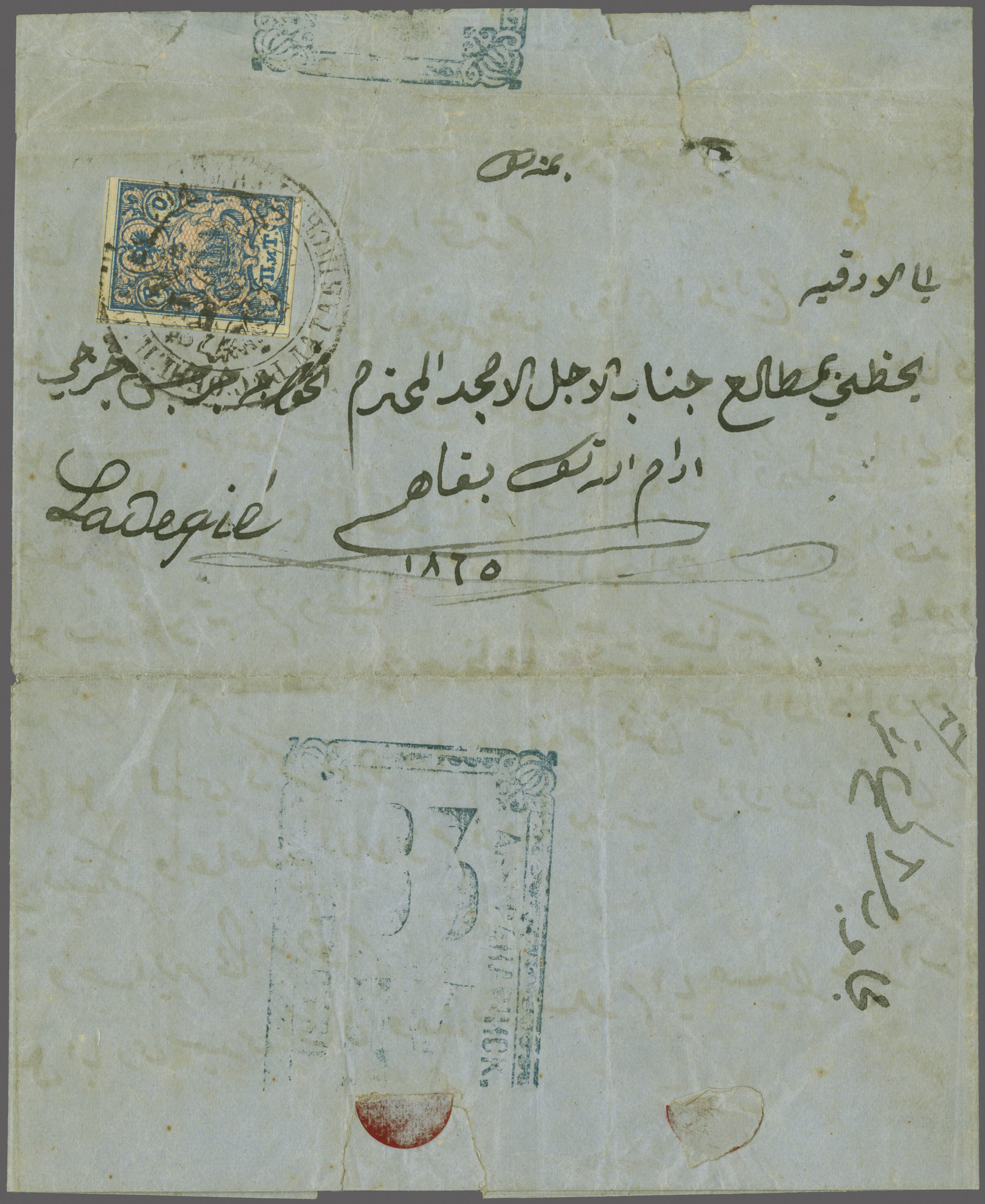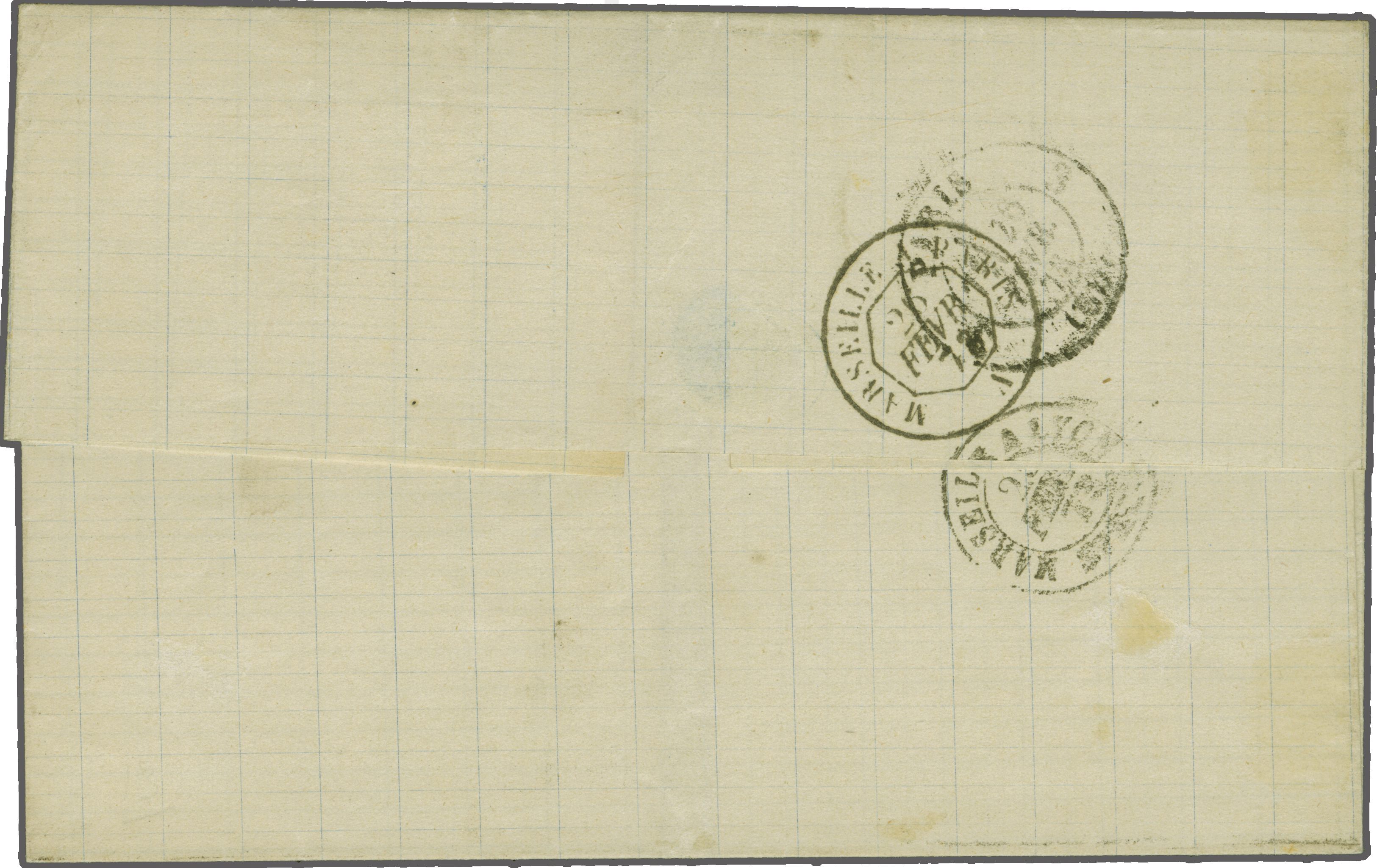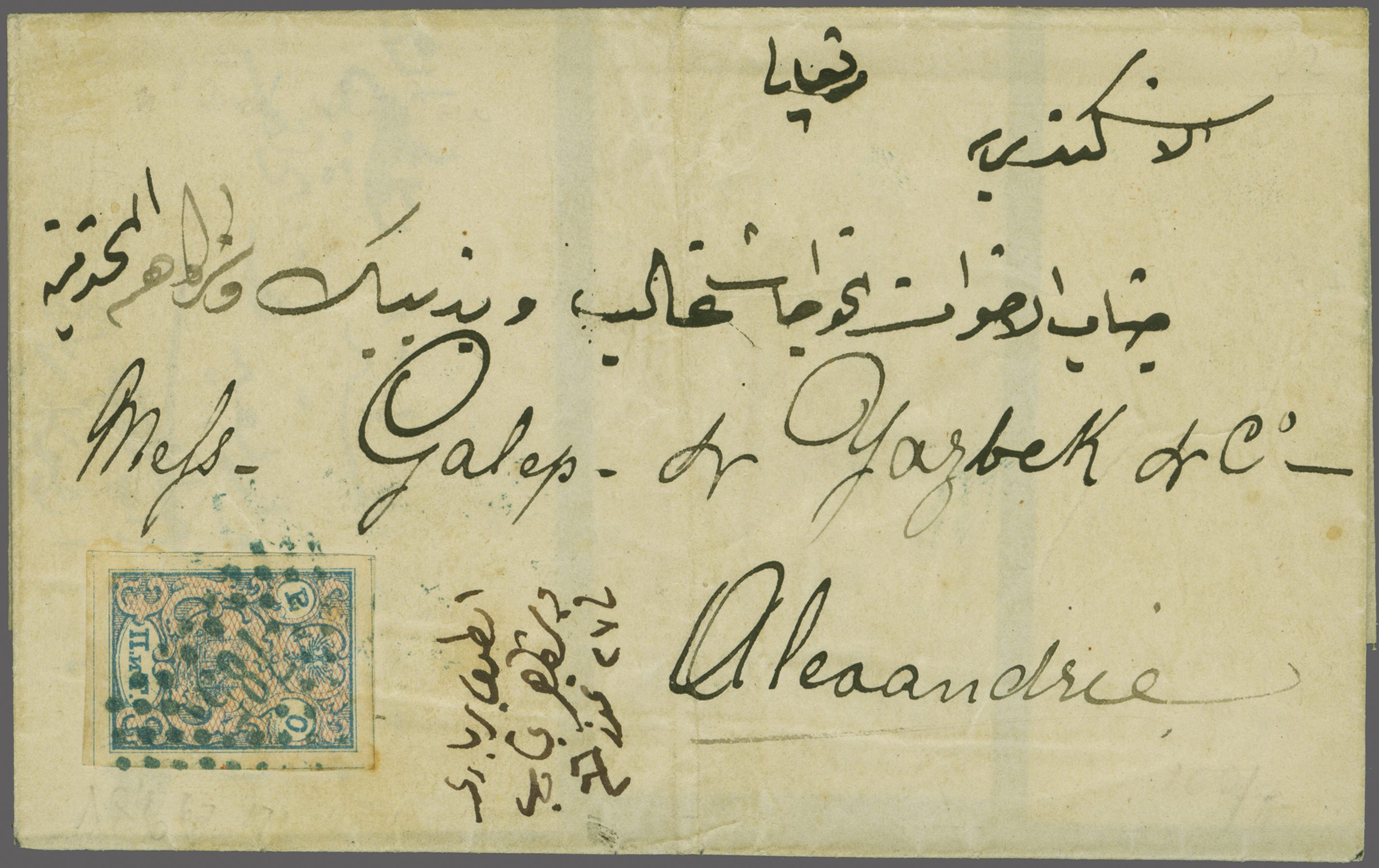 7091 cover imageRussian P.O. in Alexandria 1863 (Dec 12): Entire letter from Aleppo via Alexandria to Marseille, struck in transit by “PORT ALEKSANDRIA” cds in blue (Tchilinghirian fig 256) with ornamental framed „P.P.“ of Alexandretta (Tchilinghirian unrecorded) in blue alongside. The entire was transferred to the French P.O. in Alexandria, there struck by “ALEXANDRIE EGYPTE” cds in black (Dec 24) and reached Marseille with a British vessel, part strike of “PAQ. ANG MARSEILLE” cds in red (Jan 7, 64). The Russian pre-payment was not accepted, and the letter charged with ‘10’ décimes. An exceptional combination cover from Syria using for its journey Russian and British Shipmail services mediated by the French P.O. in Alexandria. Most interesting, fine and attractive, signed Sorani, cert. Buchsbayew (2024). Provenance: Pavlovsk collection, Corinphila sale 92 (March 1996), lot 4923 (Image 1) (Image 2) (Image 3) (Image 4) (Image 5)
