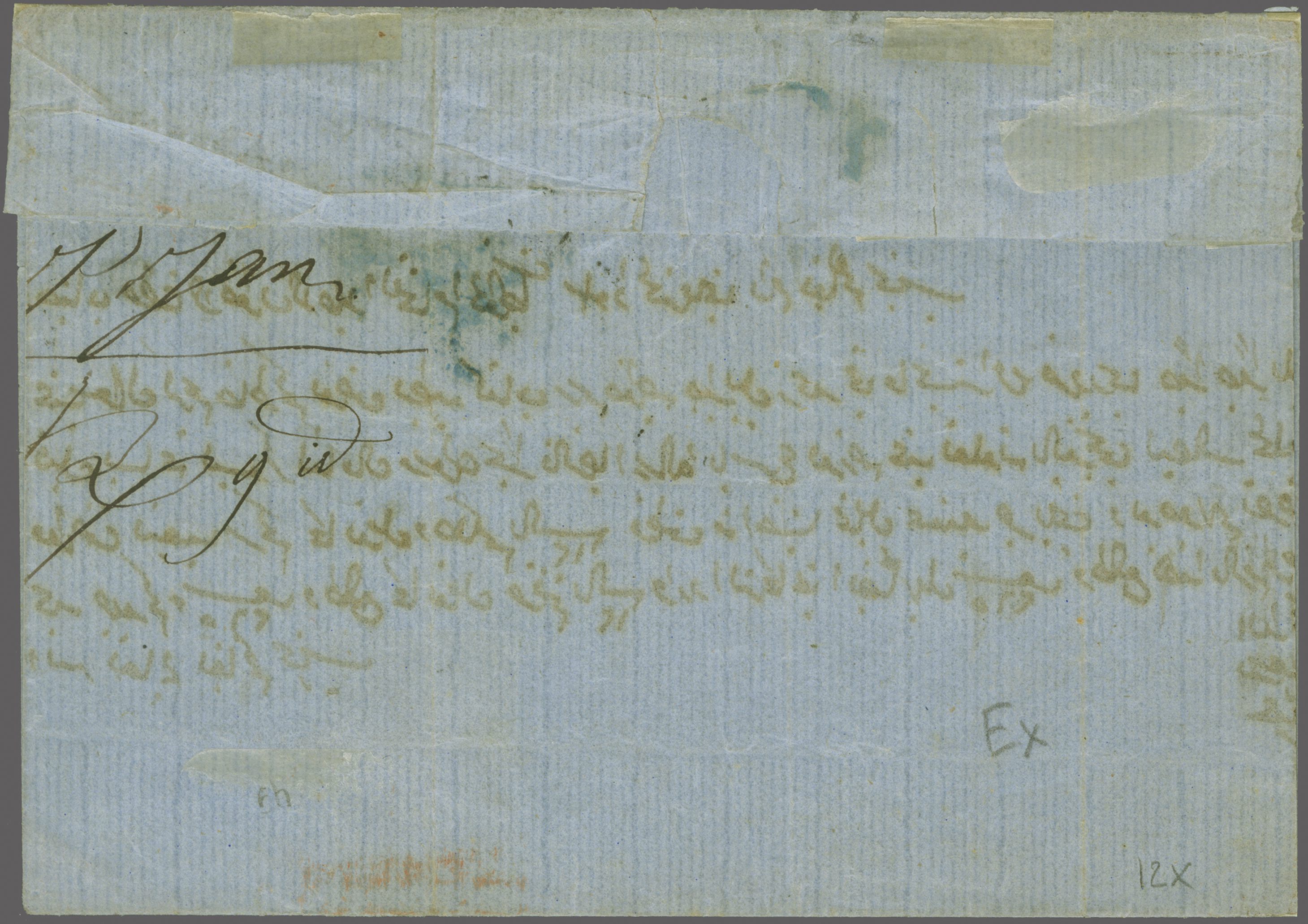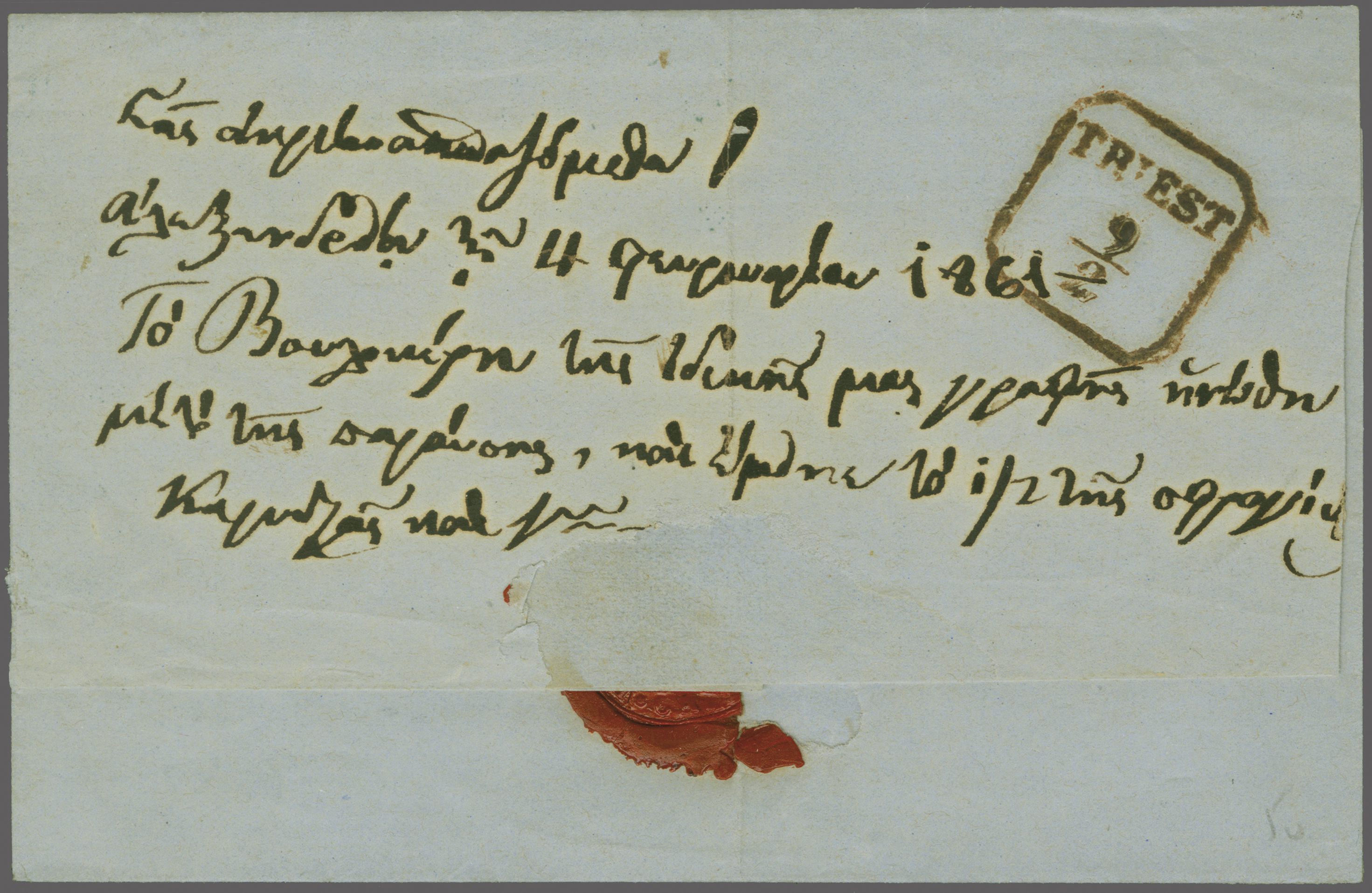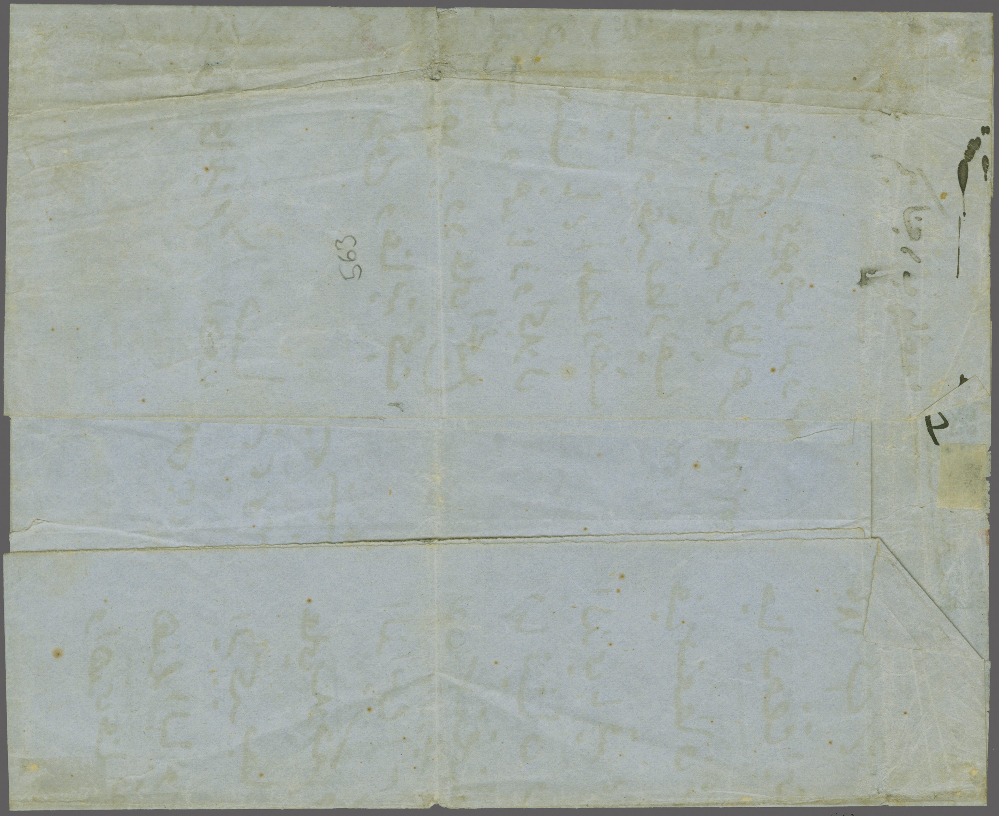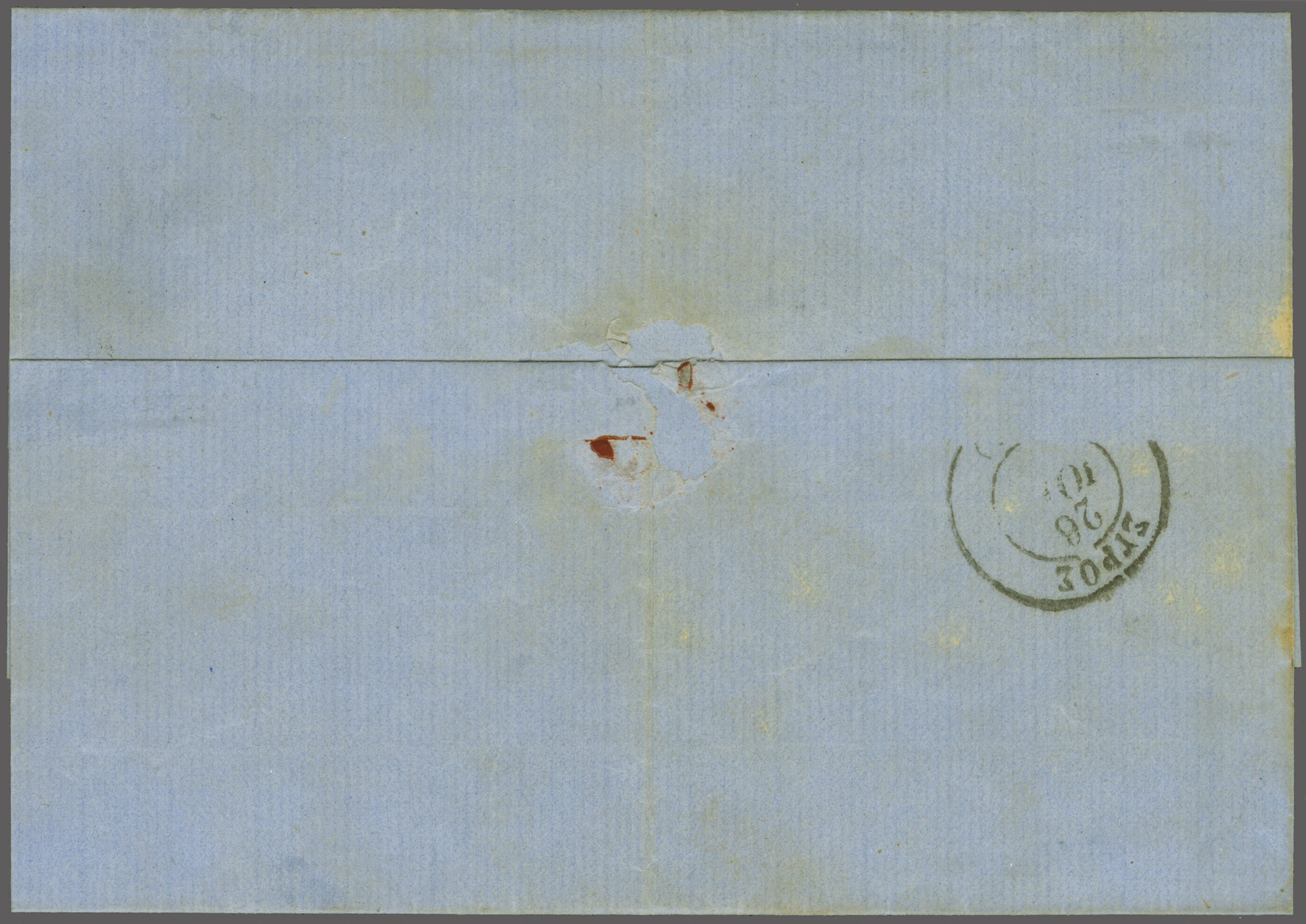 7091 cover imageRussian P.O. in Alexandria 1863 (Dec 12): Entire letter from Aleppo via Alexandria to Marseille, struck in transit by “PORT ALEKSANDRIA” cds in blue (Tchilinghirian fig 256) with ornamental framed „P.P.“ of Alexandretta (Tchilinghirian unrecorded) in blue alongside. The entire was transferred to the French P.O. in Alexandria, there struck by “ALEXANDRIE EGYPTE” cds in black (Dec 24) and reached Marseille with a British vessel, part strike of “PAQ. ANG MARSEILLE” cds in red (Jan 7, 64). The Russian pre-payment was not accepted, and the letter charged with ‘10’ décimes. An exceptional combination cover from Syria using for its journey Russian and British Shipmail services mediated by the French P.O. in Alexandria. Most interesting, fine and attractive, signed Sorani, cert. Buchsbayew (2024). Provenance: Pavlovsk collection, Corinphila sale 92 (March 1996), lot 4923 (Image 1) (Image 2) (Image 3) (Image 4) (Image 5)
