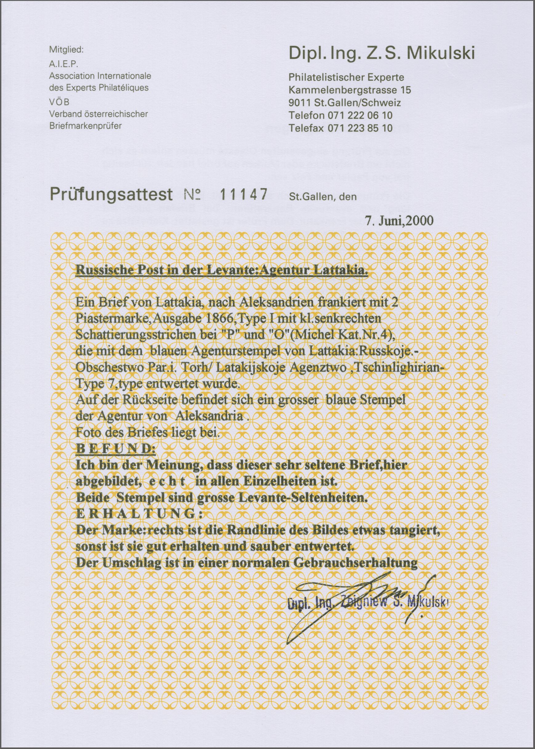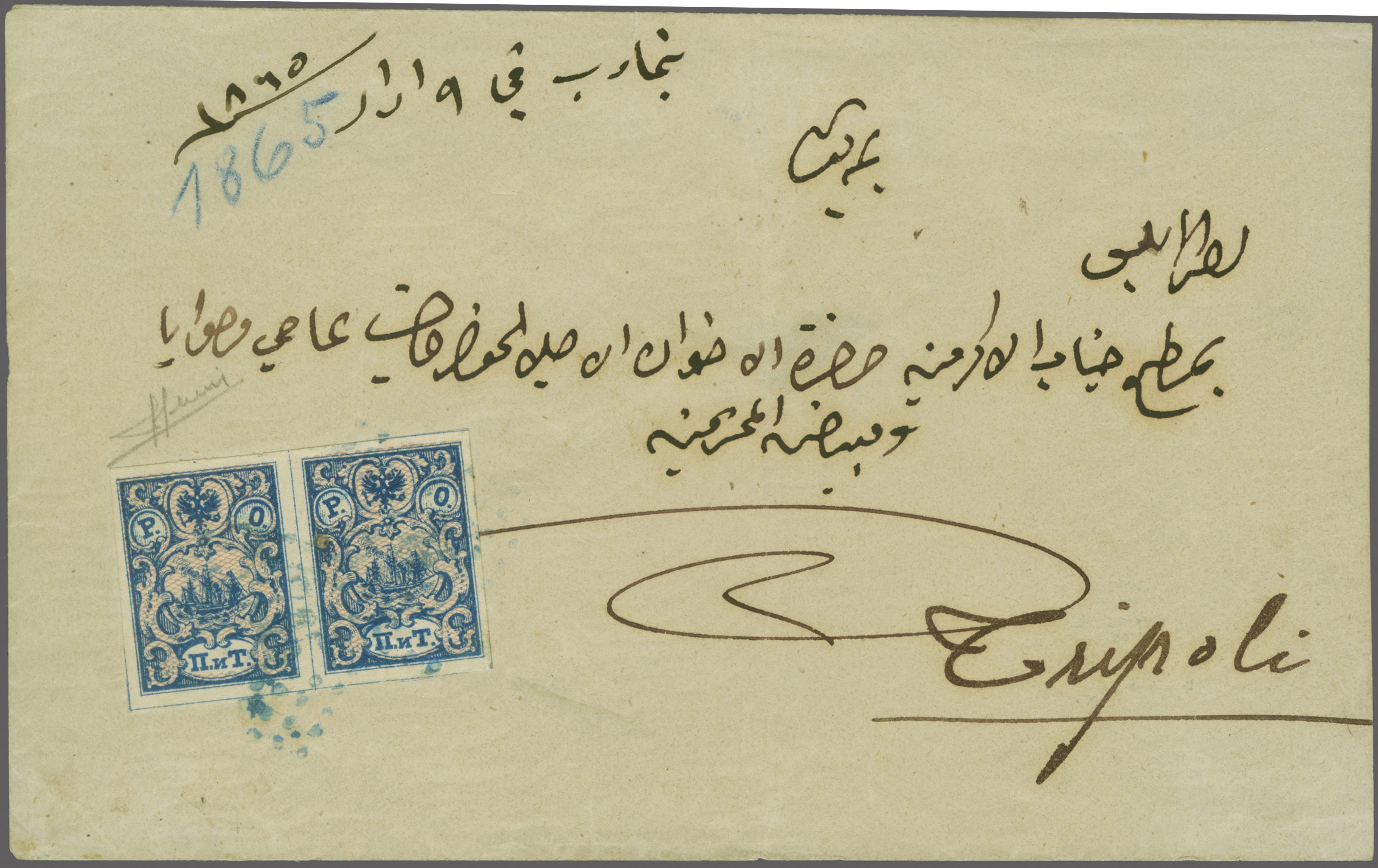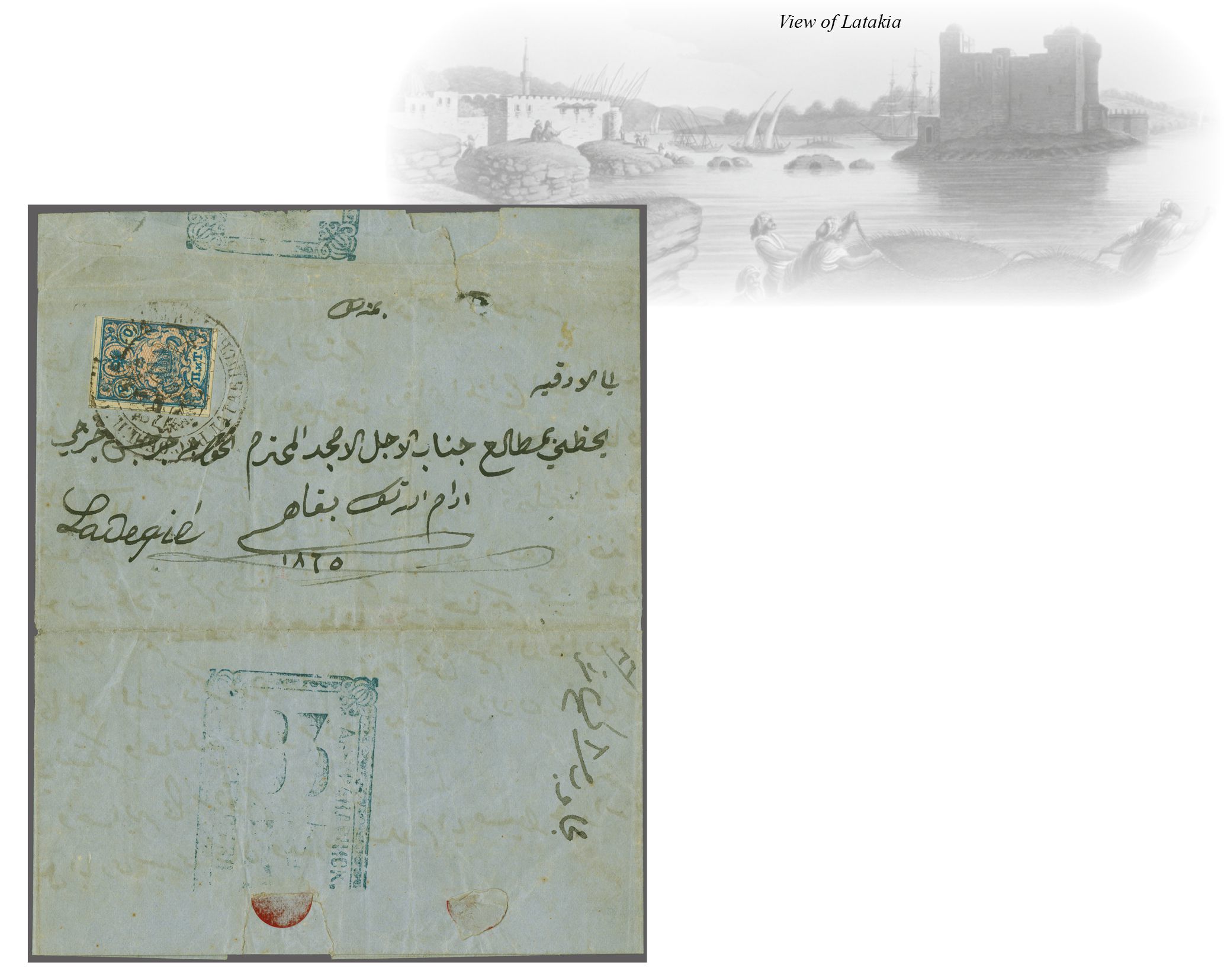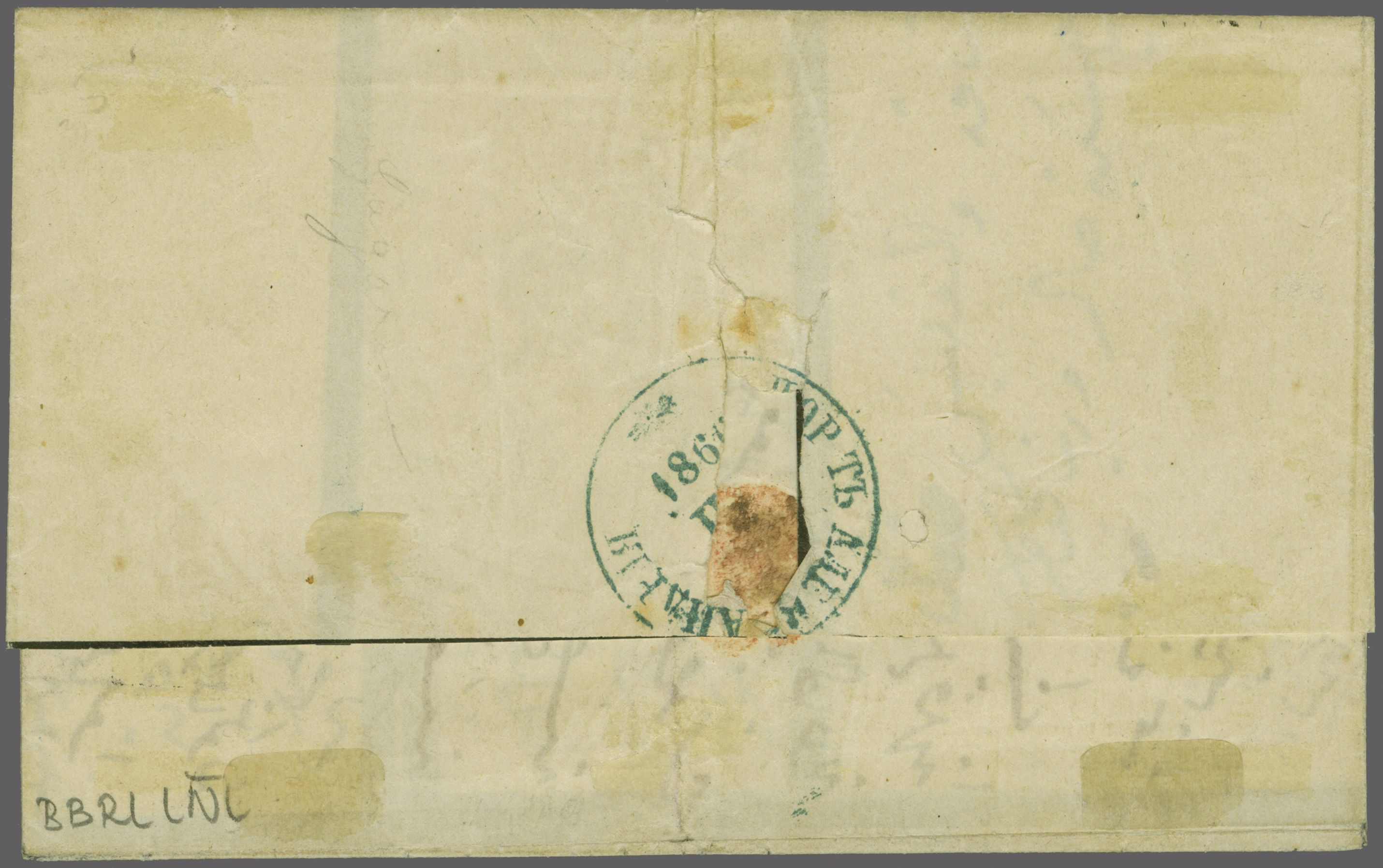 7092 cover imageRussian P.O. in Alexandria, Ingoing 1865 (Nov 3): Entire letter from Lattakia to Alexandria, opened out for display, bearing 2 pi. blue and rose with shaved to huge margins, tied by fair "RUS. OBSHCH. PAR i TOR. / LATAKIICK. AGENTSTVO" agency seal handstamp (Tchilinghirian fig. 805) in black, very rare ornamental rectangular "ALEKSANDRIISK AGENSTVO 20 / XI" arrival datestamp in blue (Tchilinghirian unrecorded) on reverse. A spectacular combination of these two rarities of the Russian Levant, one of only two recorded covers with this Alexandria datestamp, unrecorded by Tchilinghirian but mentioned in Peter Smith’s treatise on Egypt, pp. 117-18. Cert. Mikulski (2000). Note: Interestingly, the ornamental datestamp of Alexandria has the sideways date with the month at right and the day at left, while the corresponding ornamental of Alexandretta is oriented vice versa. Provenance: Collection Liphschutz; collection Cihangir, Corinphila sale 131 (May 2000), lot 563 (Image 1) (Image 2) (Image 3) (Image 4)