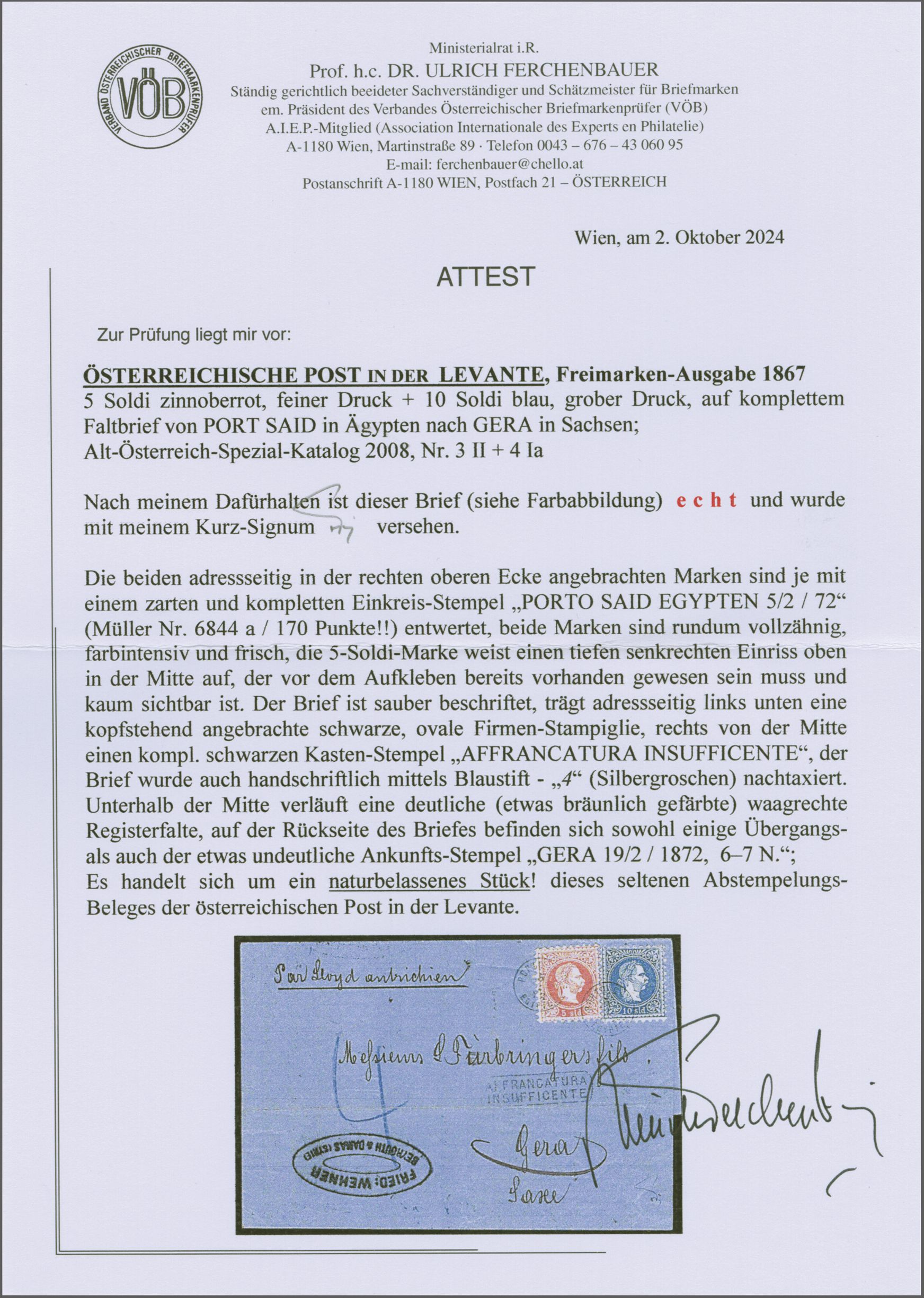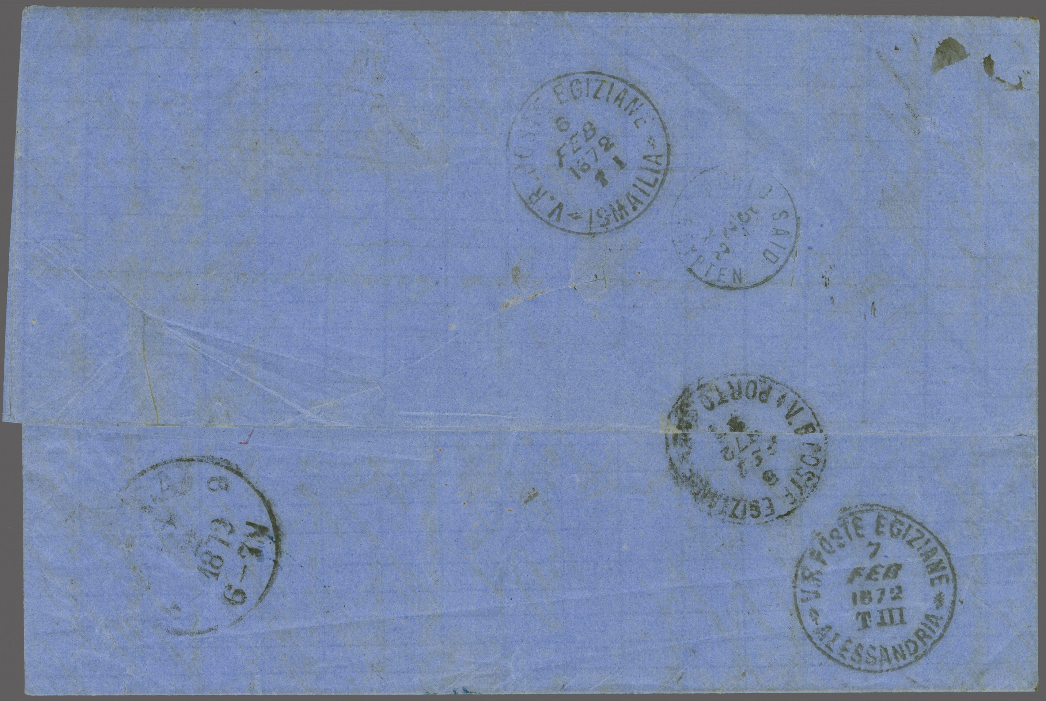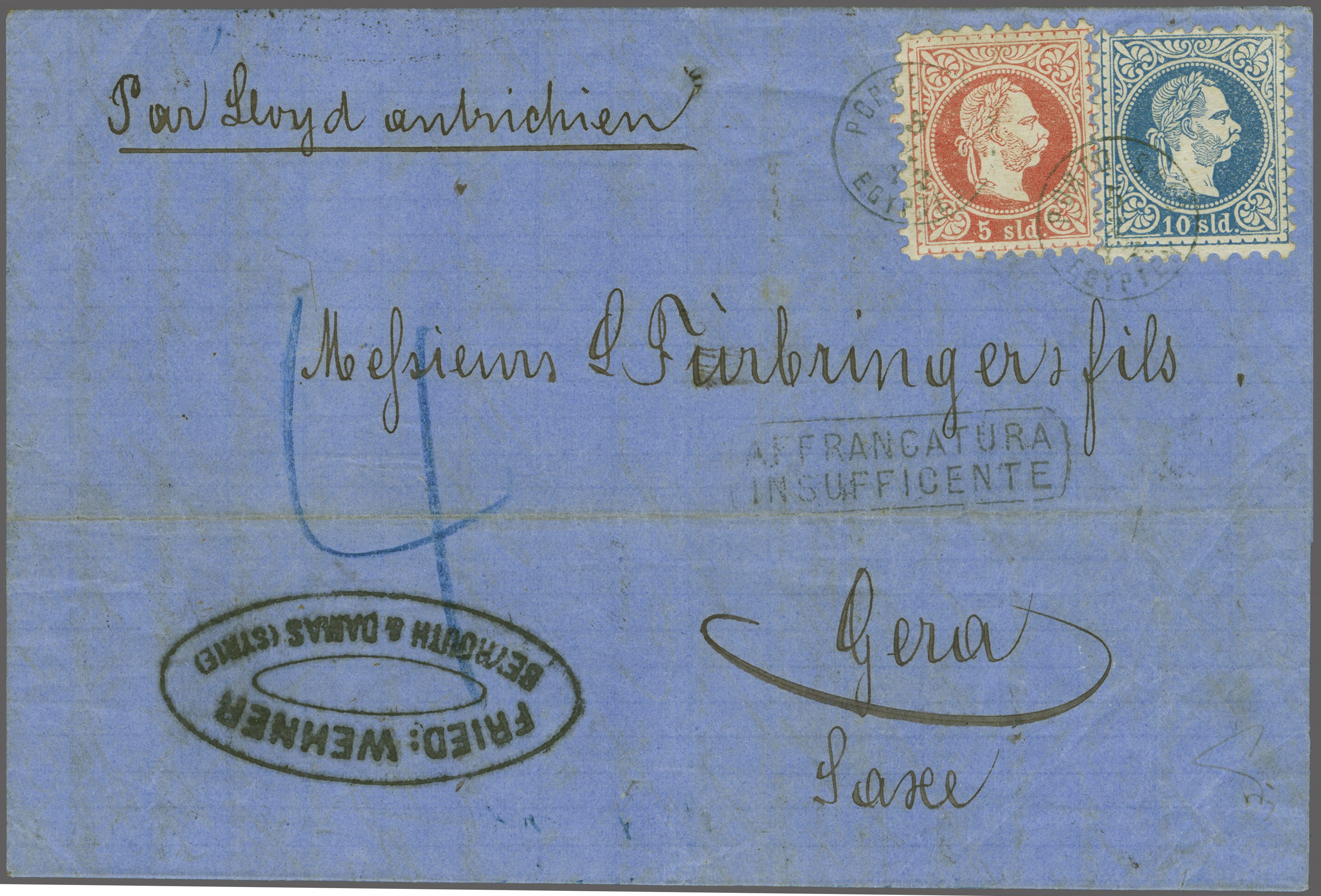 7029 cover imageAustrian Consular Agency in Port Said 1872 (Feb 3): Letter sheet from Port Said to Gera, Germany, endorsed “Par Lloyd autrichien”, bearing 1867 Coarse Whiskers 5 so red and 10 so blue, the 5 soldi adhesive with a pre-use tear at top, tied by clear strikes of extremely rare thimble “PORT SAID EGYPTEN 3 / 2” cds (Tranmer fig. 1) in black, all in black. Reverse with a despatch cds of the consular P.O., transit strikes of the Egyptian P.O.’s from PORTO SAID, ISMAILIA, and ALESSANDRIA with framed “AFFRANCATURA INSUFFICIENTE” on front, as well as indistinct GERA arrival cds on reverse. Charge upon arrival with ‘4’ silbergroschen in blue crayon. An attractive franking of utmost rarity as the few covers from this elusive post office are nearly all in a bad state; cert. Ferchenbauer (2024). Provenance: Collection Kurt Wolfsbauer (Image 1) (Image 2) (Image 3) (Image 4)