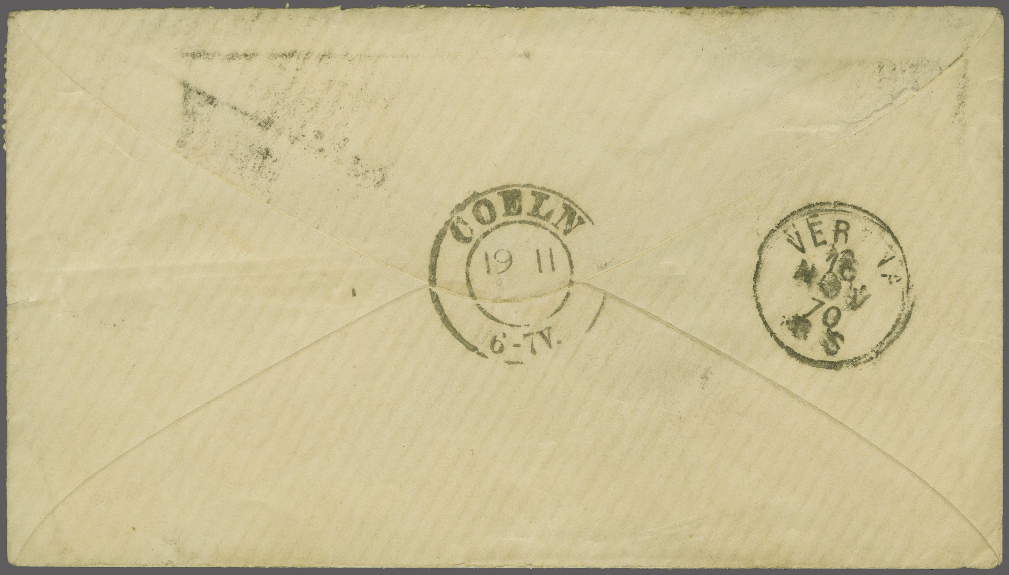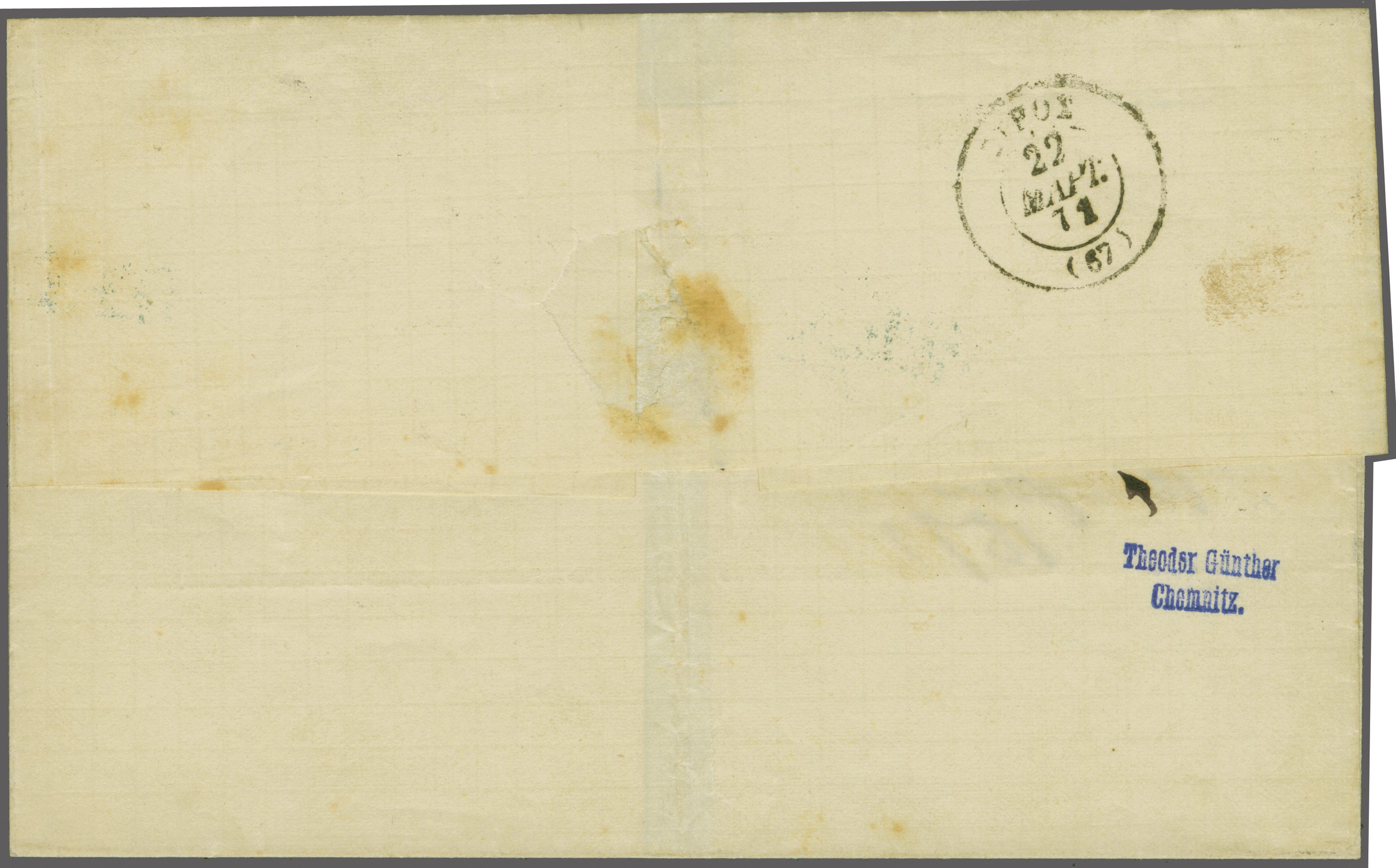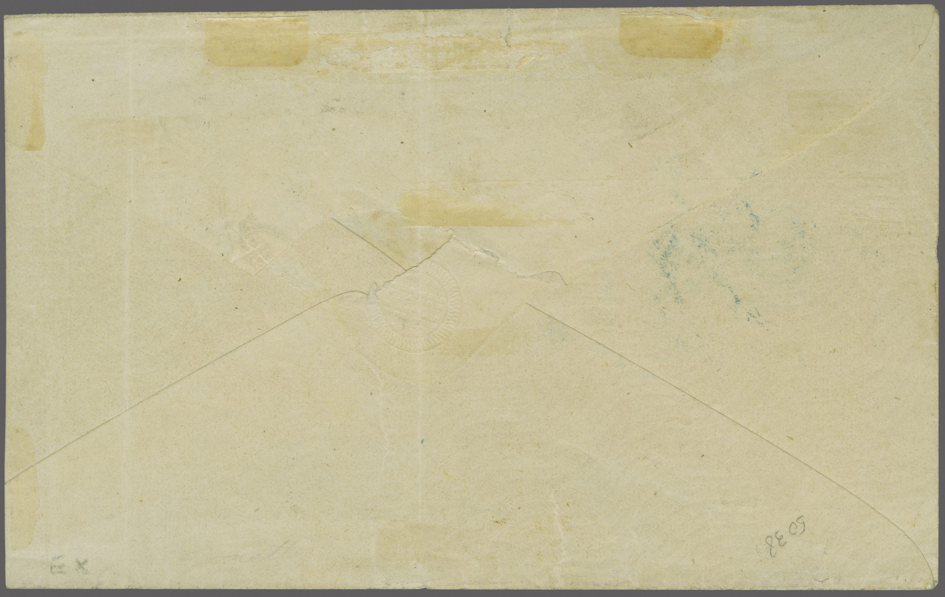 7029 cover imageAustrian Consular Agency in Port Said 1872 (Feb 3): Letter sheet from Port Said to Gera, Germany, endorsed “Par Lloyd autrichien”, bearing 1867 Coarse Whiskers 5 so red and 10 so blue, the 5 soldi adhesive with a pre-use tear at top, tied by clear strikes of extremely rare thimble “PORT SAID EGYPTEN 3 / 2” cds (Tranmer fig. 1) in black, all in black. Reverse with a despatch cds of the consular P.O., transit strikes of the Egyptian P.O.’s from PORTO SAID, ISMAILIA, and ALESSANDRIA with framed “AFFRANCATURA INSUFFICIENTE” on front, as well as indistinct GERA arrival cds on reverse. Charge upon arrival with ‘4’ silbergroschen in blue crayon. An attractive franking of utmost rarity as the few covers from this elusive post office are nearly all in a bad state; cert. Ferchenbauer (2024). Provenance: Collection Kurt Wolfsbauer (Image 1) (Image 2) (Image 3) (Image 4)