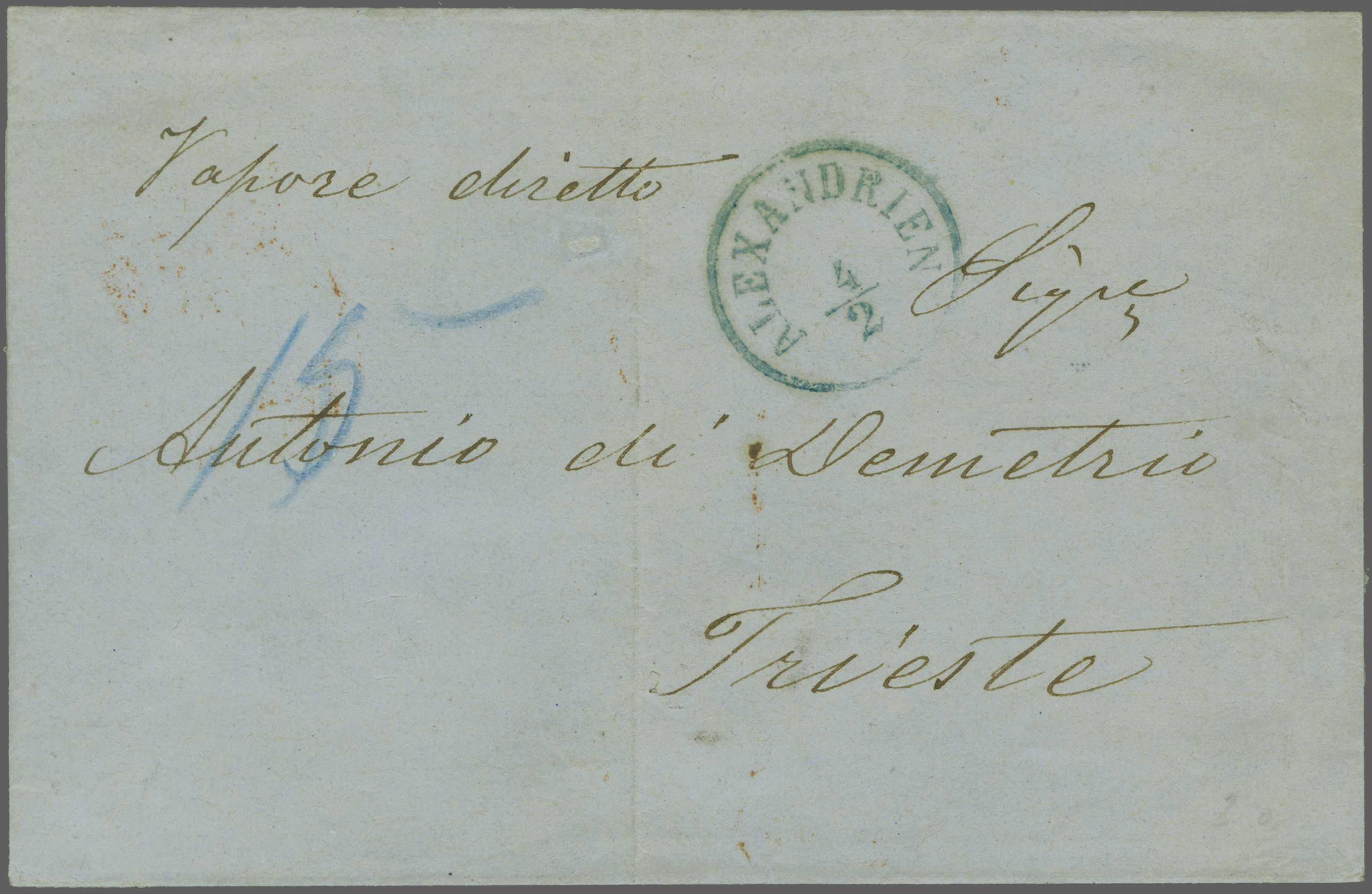 7028 cover imageAustrian Post Office in Alexandria 1861 (Feb 4): Letter sheet to Trieste, endorsed "Vapore diretto", struck on obverse by clear ALEXANDRIEN despatch cds in blue (Tranmer fig. 5). Reverse with boxed TRIEST arrival datestamp (Feb 9). The '15' soldi due in blue crayon is not clear to the describer, it should have been 20 soldi before 1866 (Image 1) (Image 2)