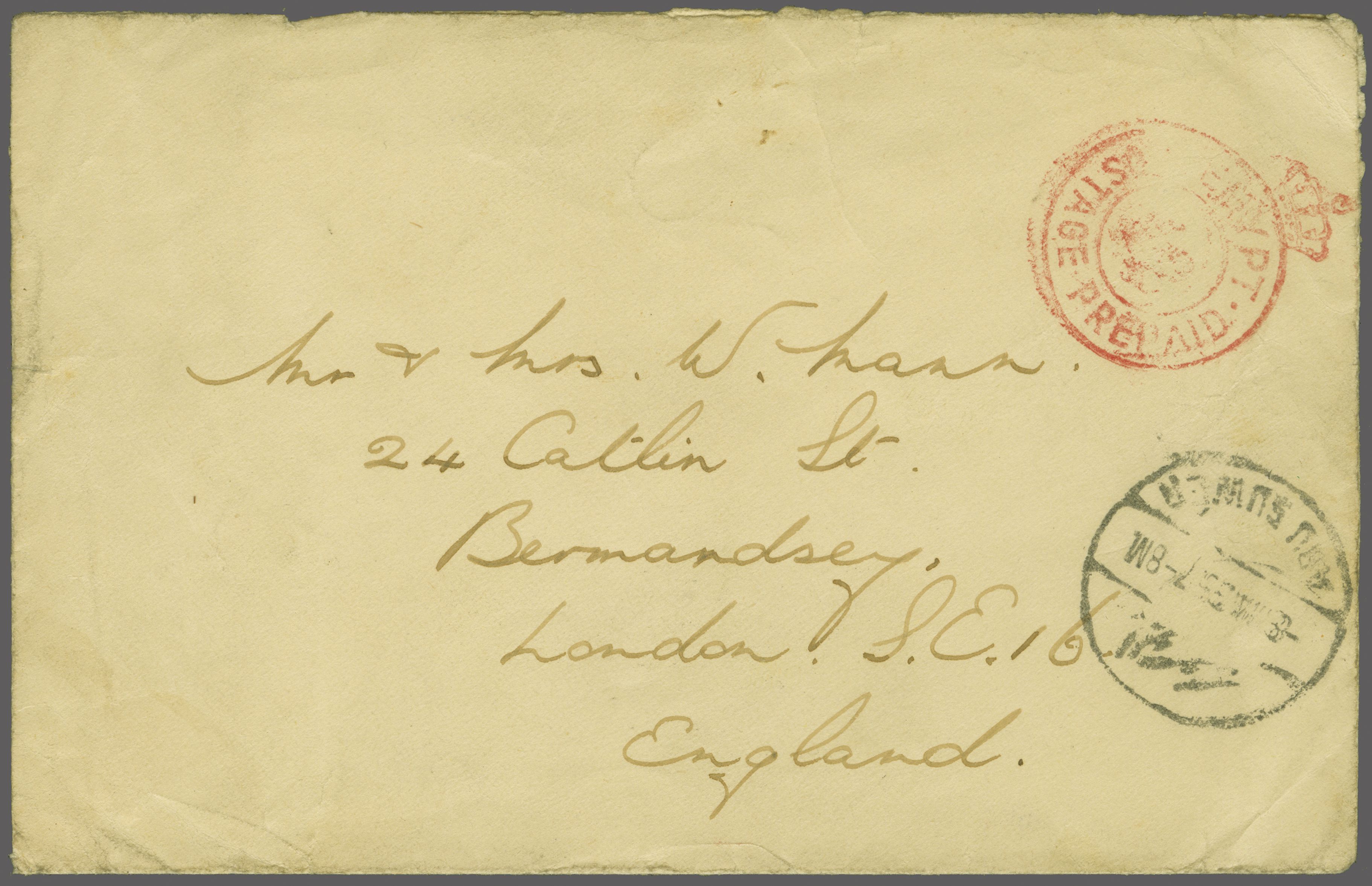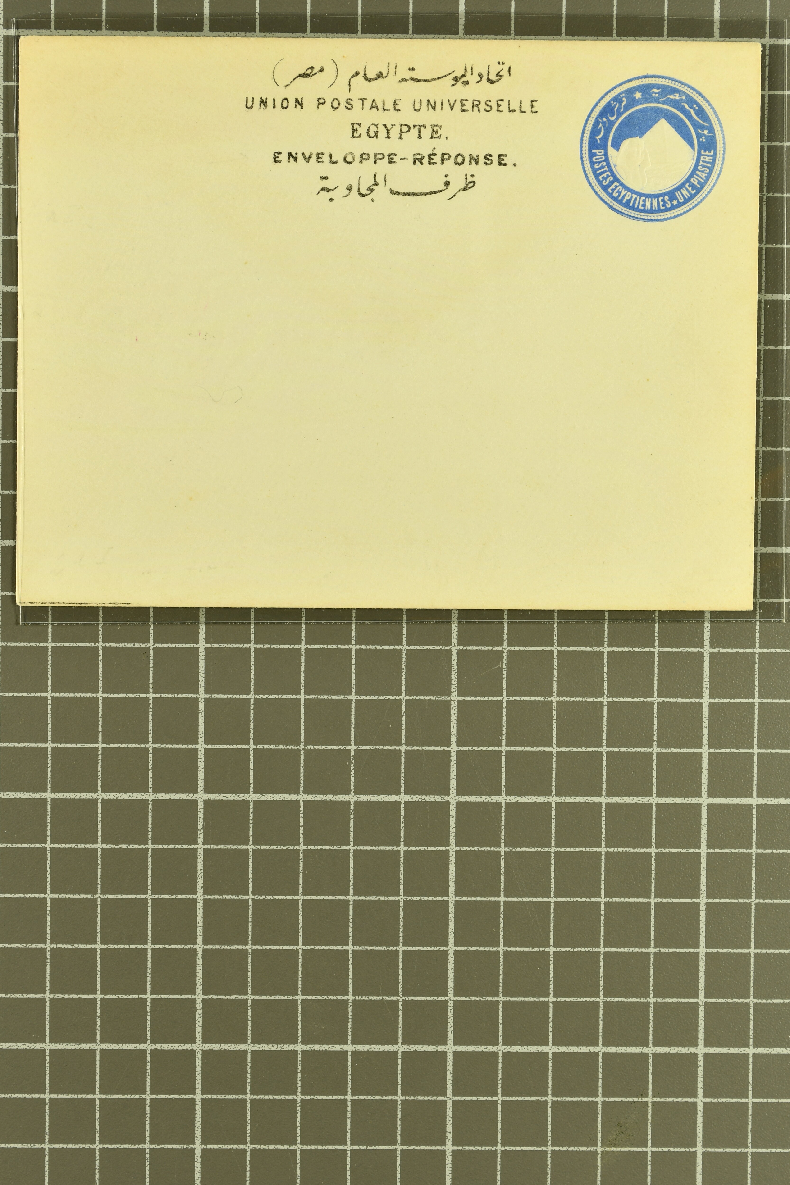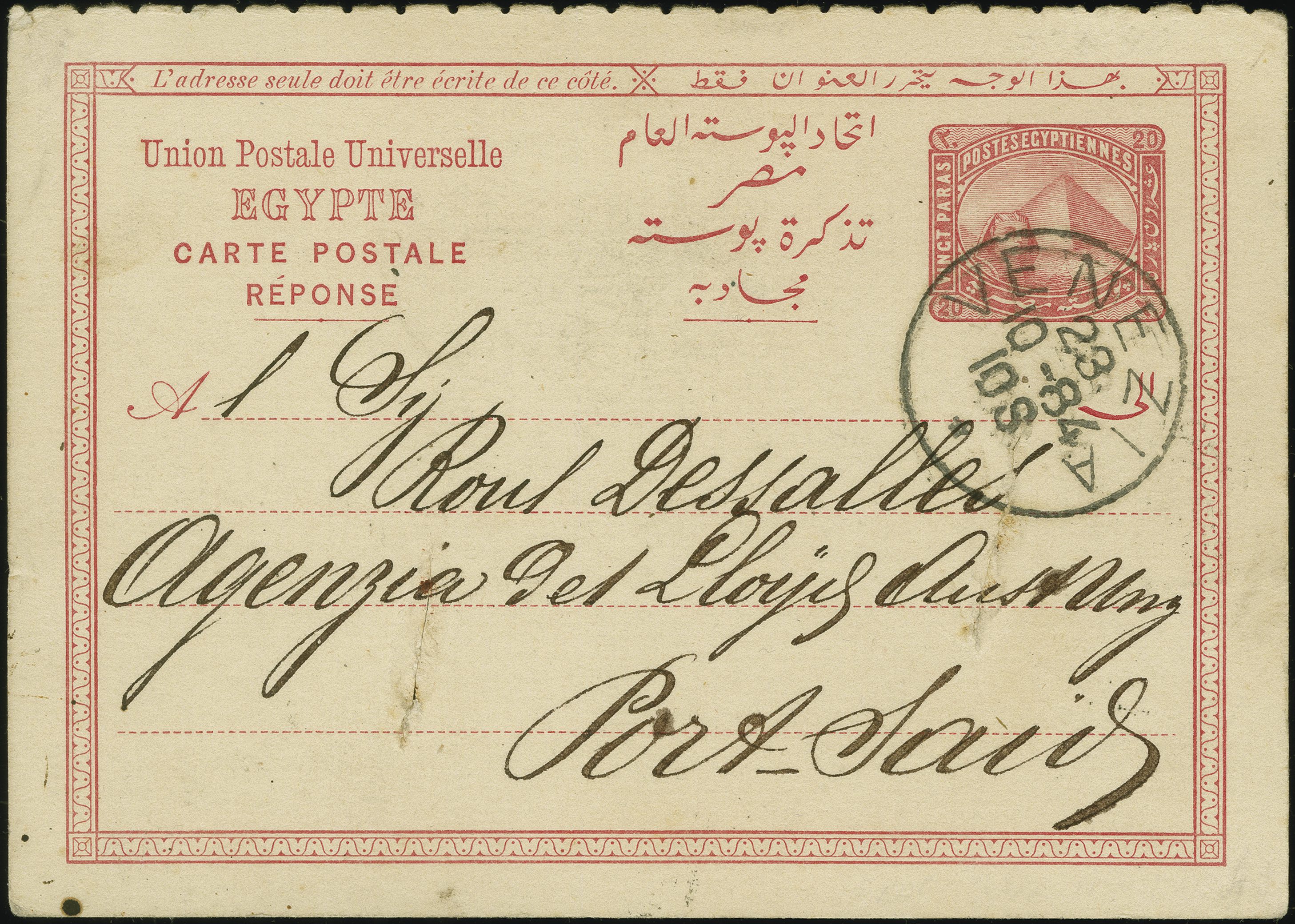 90284 cover image1884: Stationery postal reply card 20 paras carmine, used with cds “VENEZIA 23 10 84” sent to Port Said, Egypt with two fumigation slits. Reverse, transit cds “ALEXANDRIE ARRIVEE 30 OC 84” and arrival cds “PORT SAID ARRIVEE 31 OC 84”. Scarce early reply card returning from Venice (Nile Post SPC2). Additionally, comes with a stationery card used from Suez to Germany, with reply part unused and three covers, one which is franked with 1875 20 para and 1 piastre sent to Italy (D25/26). Useful group (45). (H&G 2)Note: The two fumigation slits were due to a cholera outbreak in the Mediterranean and Europe at this time. This epidemic caused the postponement of the UPU congress scheduled for Lisbon into early 1885. Reference: The Postal History of the Universal Postal Union: The Postal Card, Worldwide 1869-1975, Volume 1, illustrated pg. 526 (reply card from Venice) (Image 1)